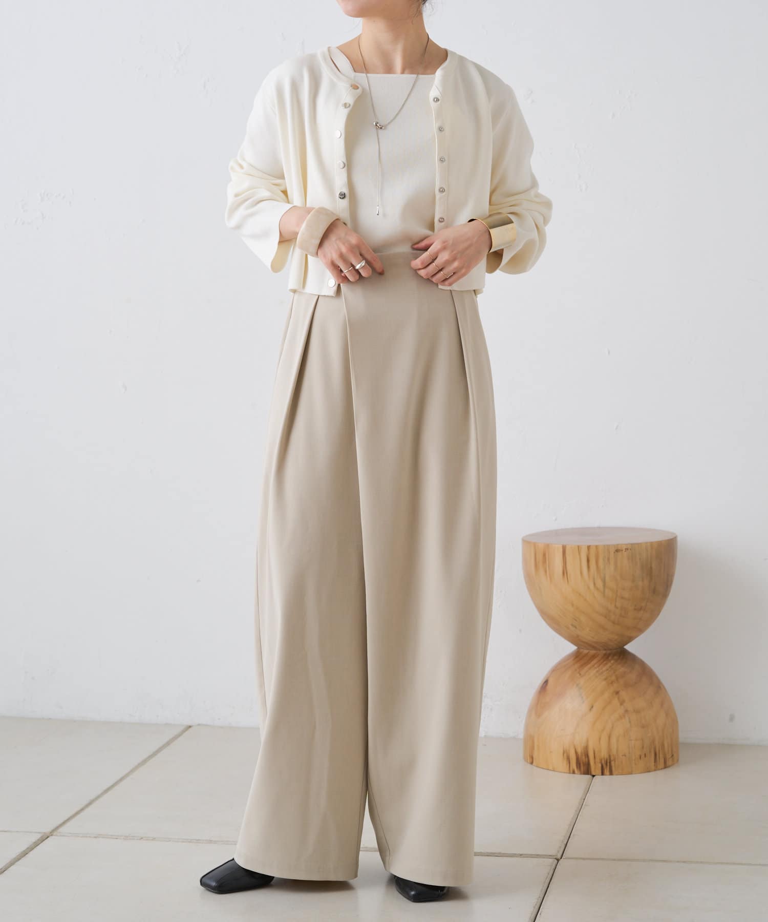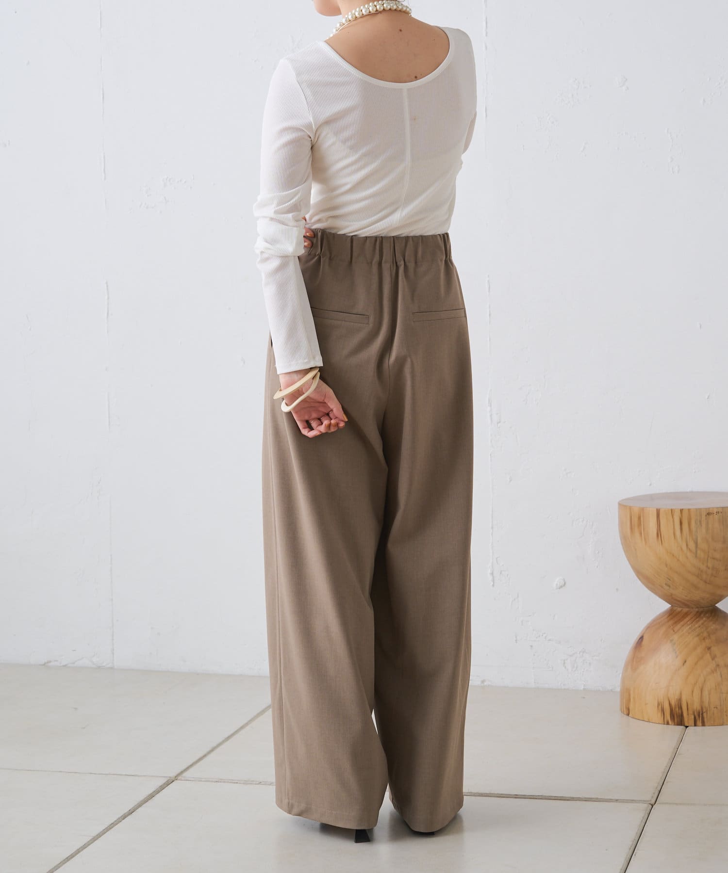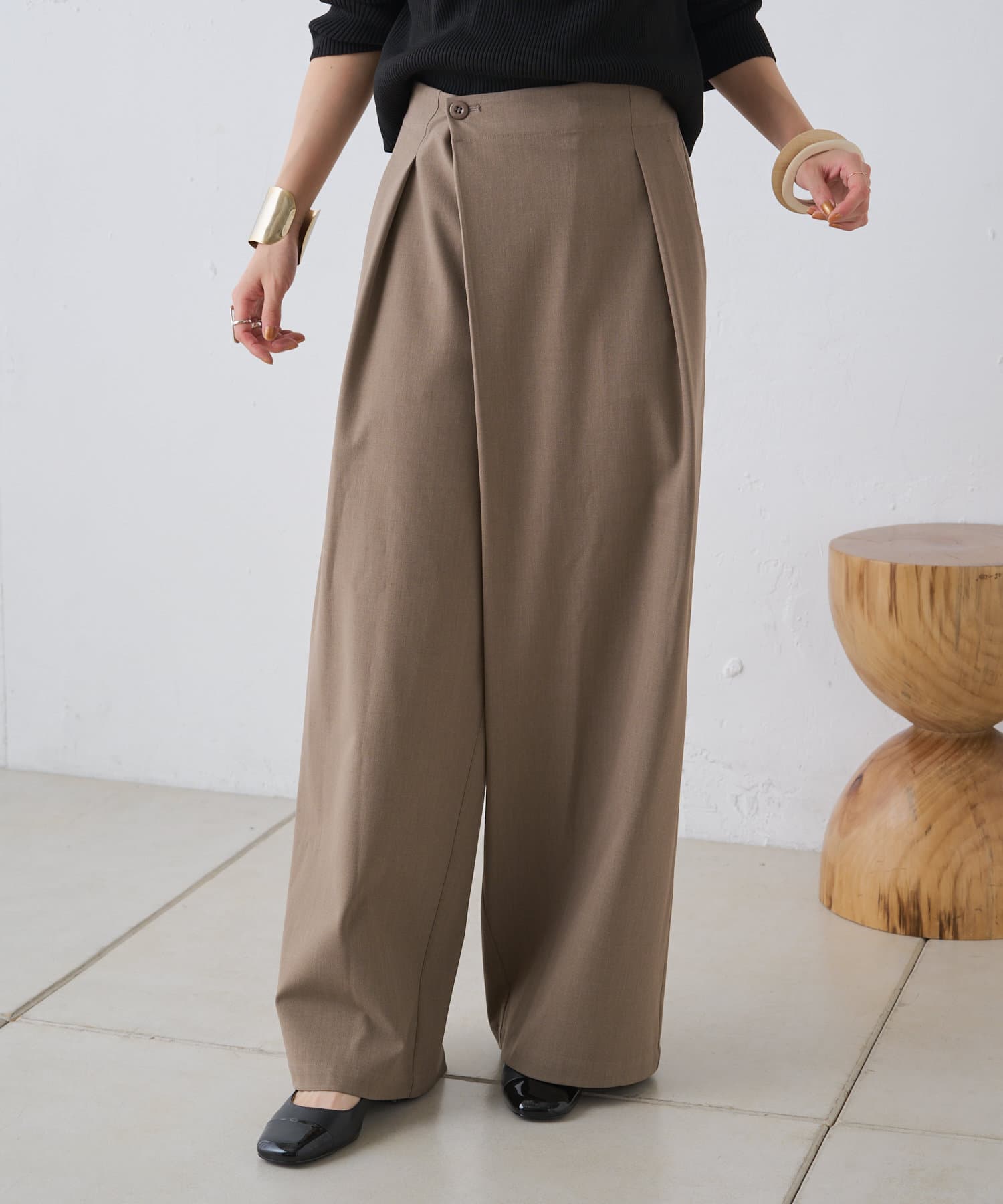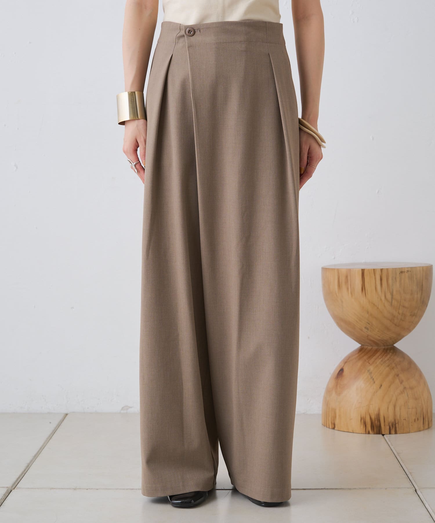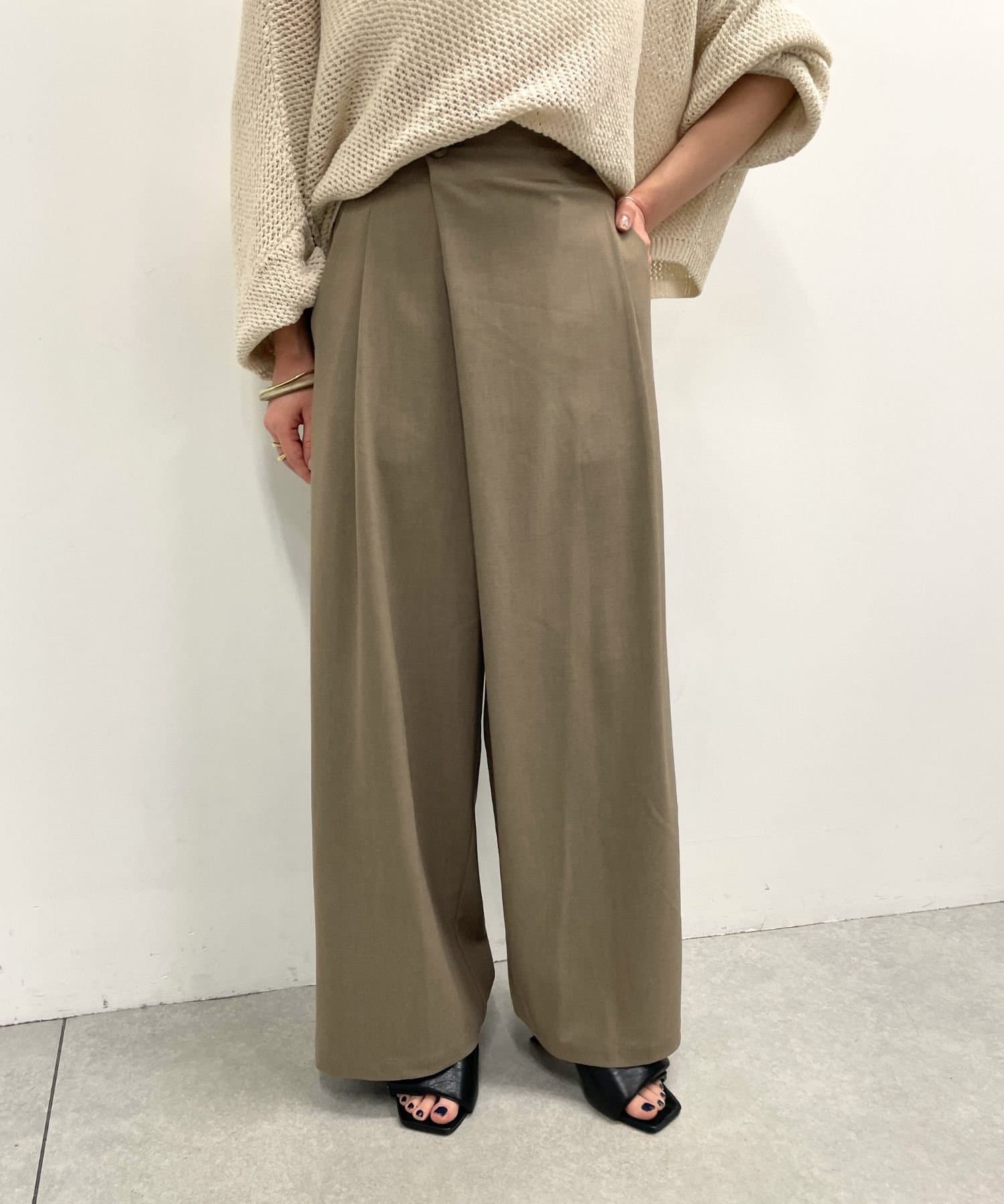 すとんと落ちるシルエットとタックの入ったウエストデザインですっきり一枚で決まるパンツ