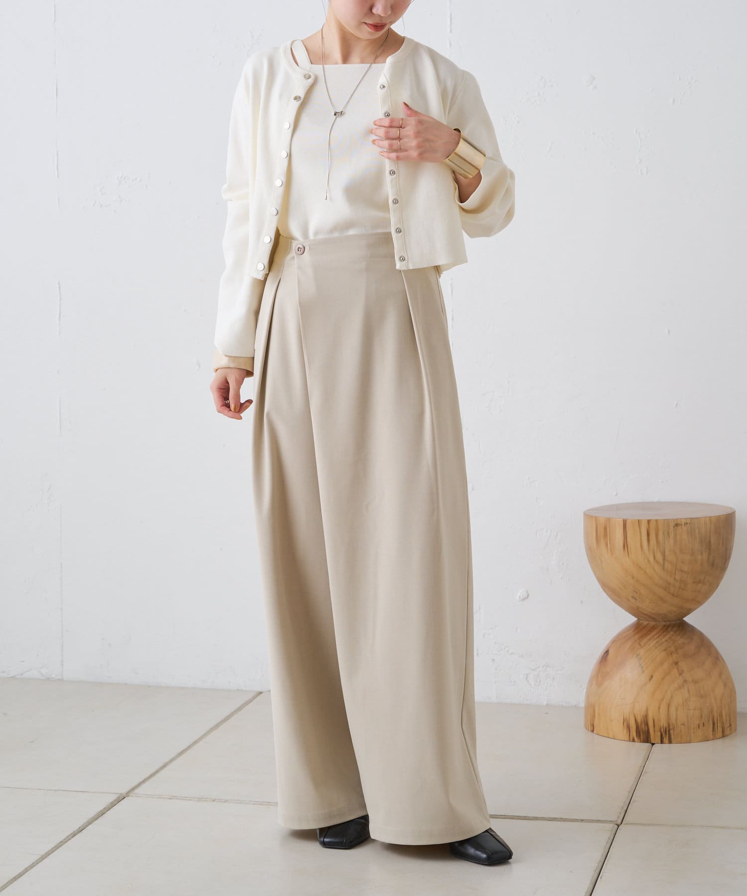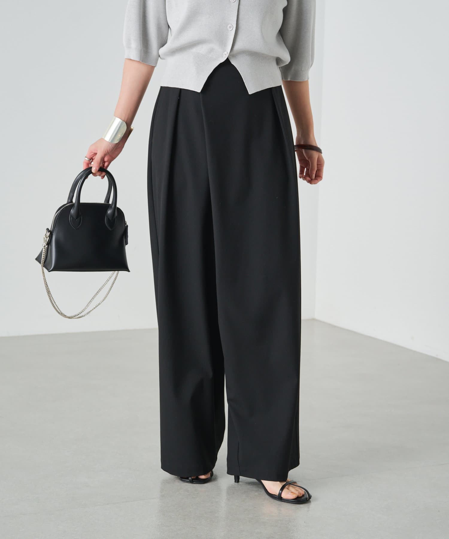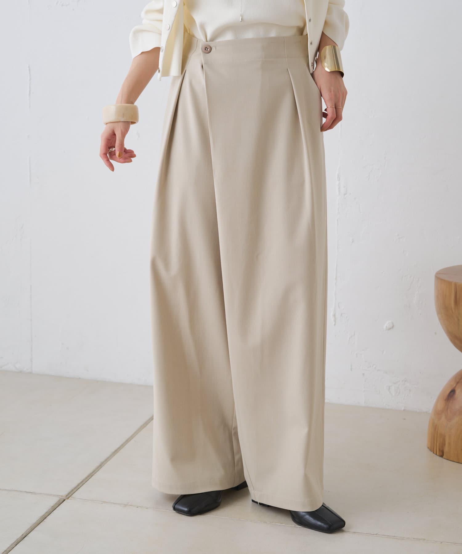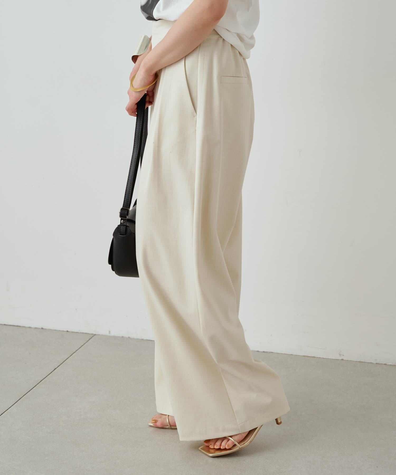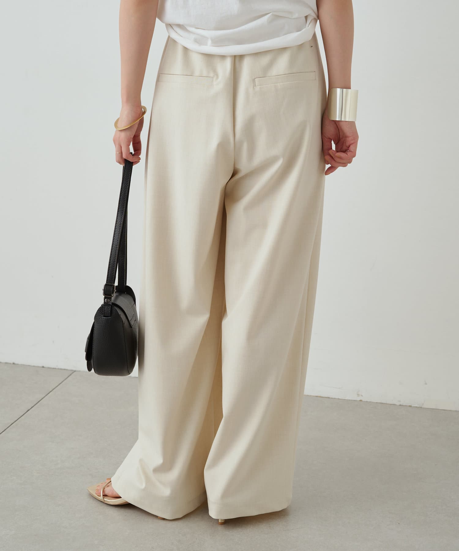 すとんと落ちるシルエットとタックの入ったウエストデザインですっきり一枚で決まるパンツ