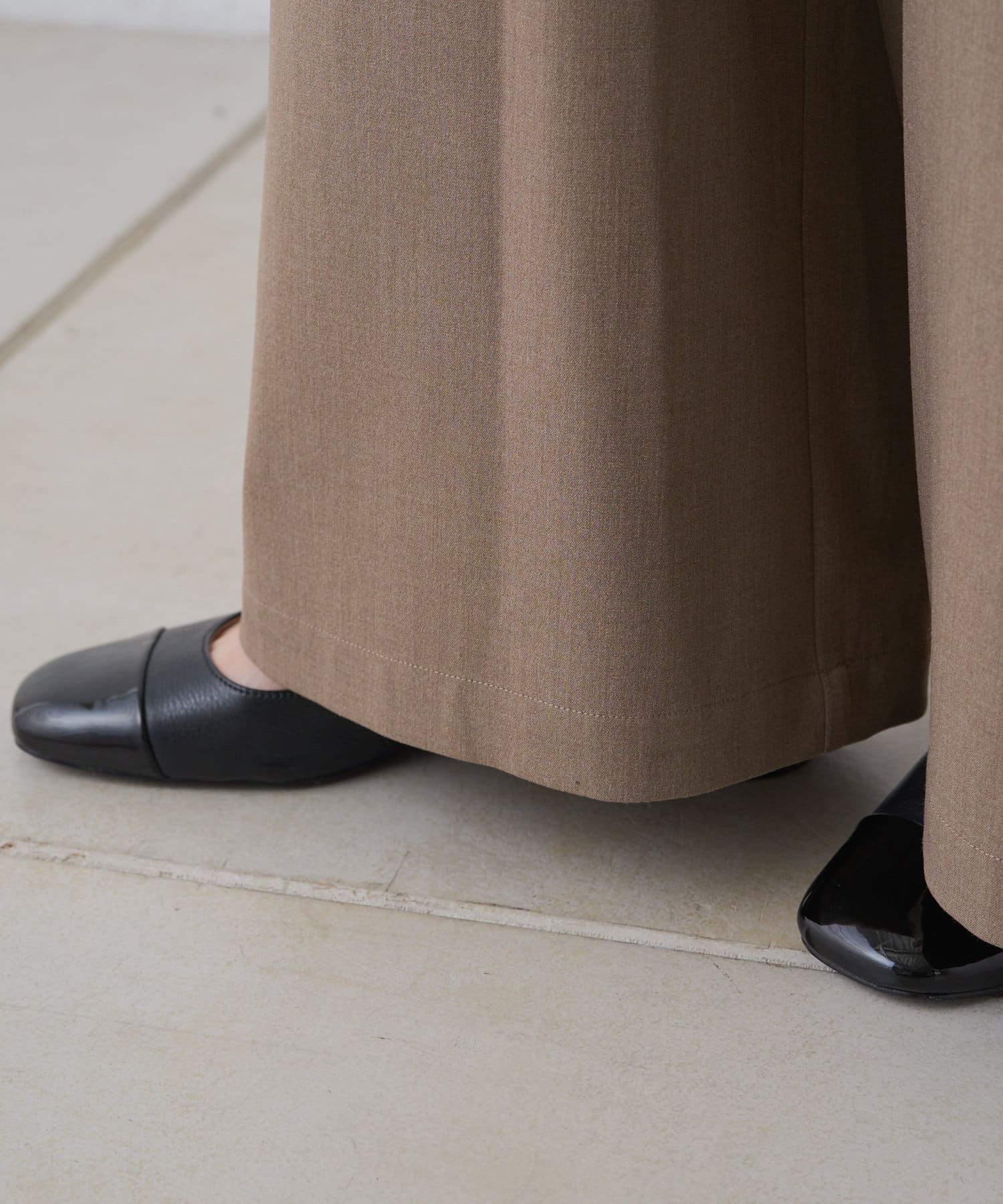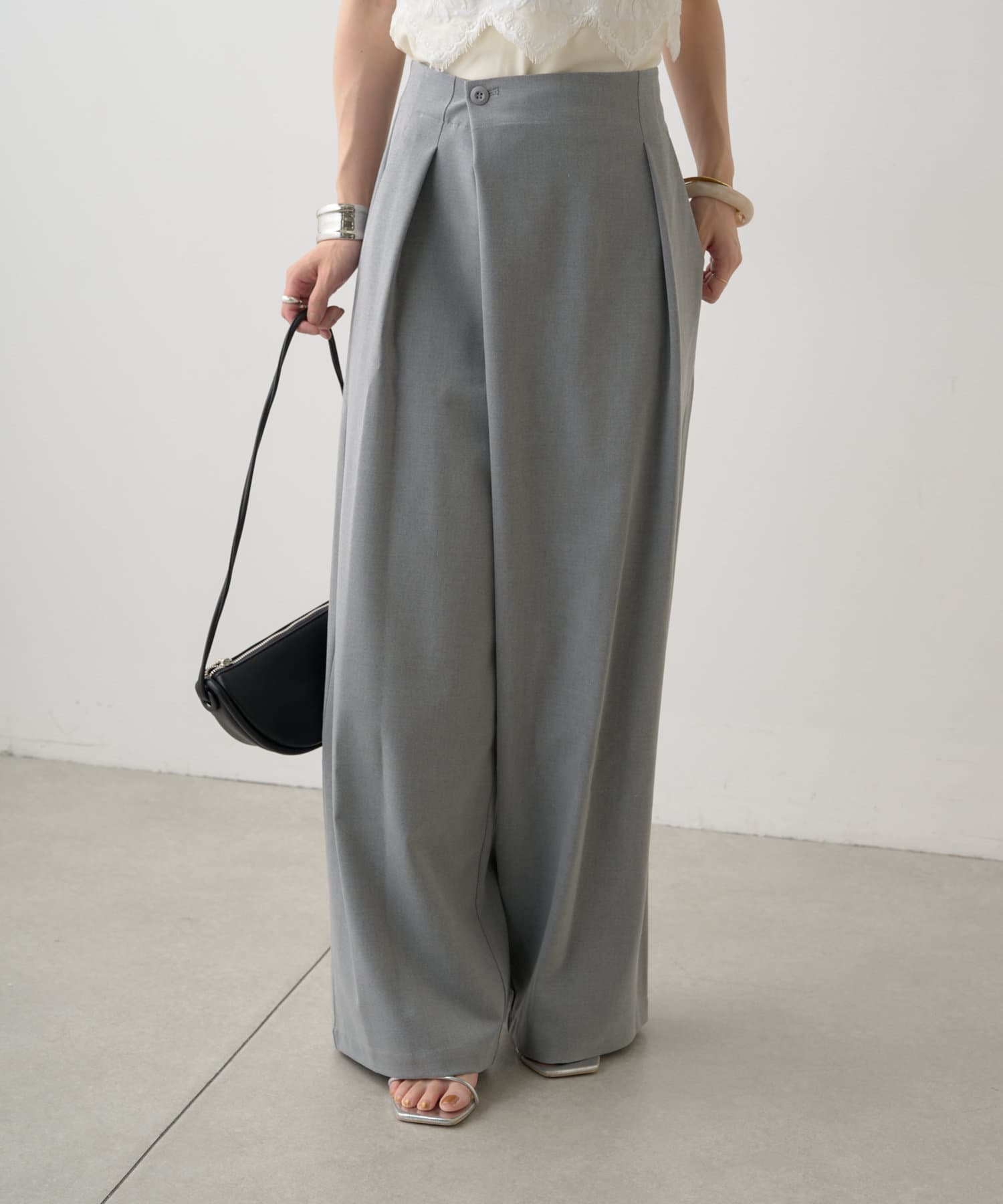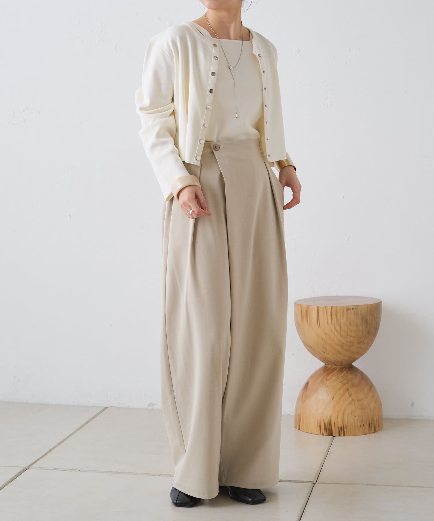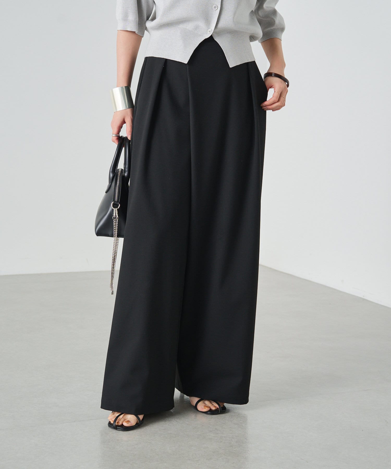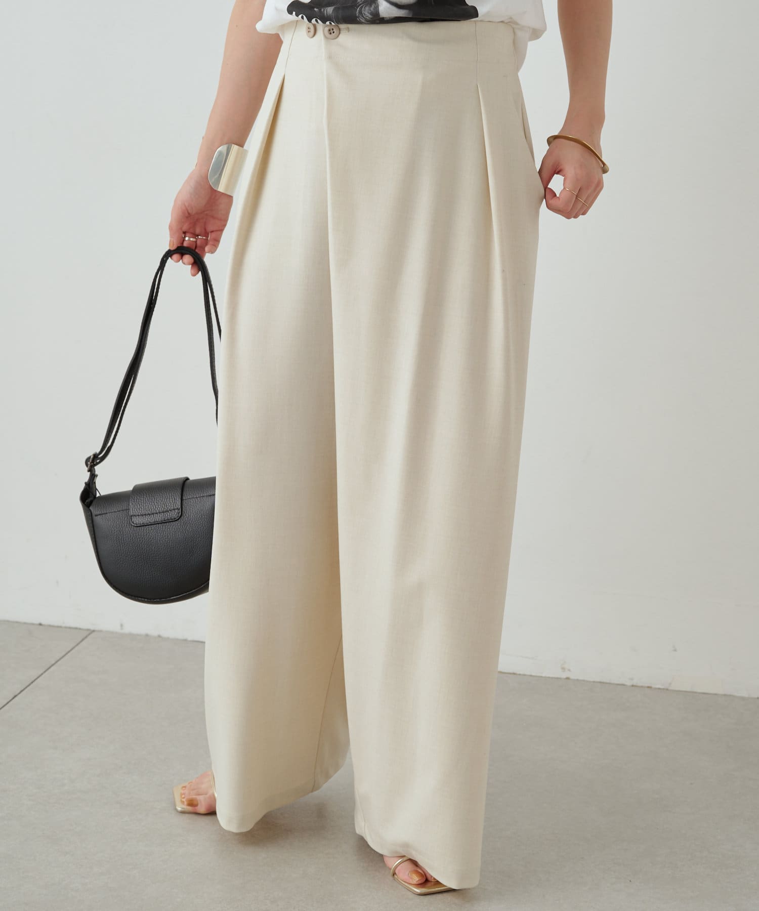 すとんと落ちるシルエットとタックの入ったウエストデザインですっきり一枚で決まるパンツ
