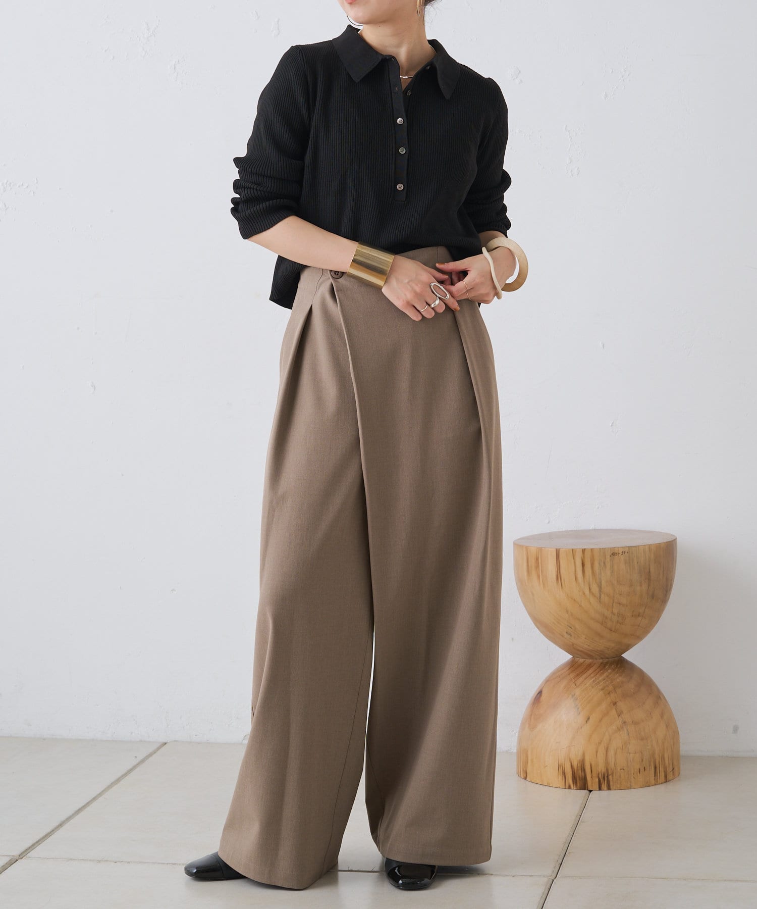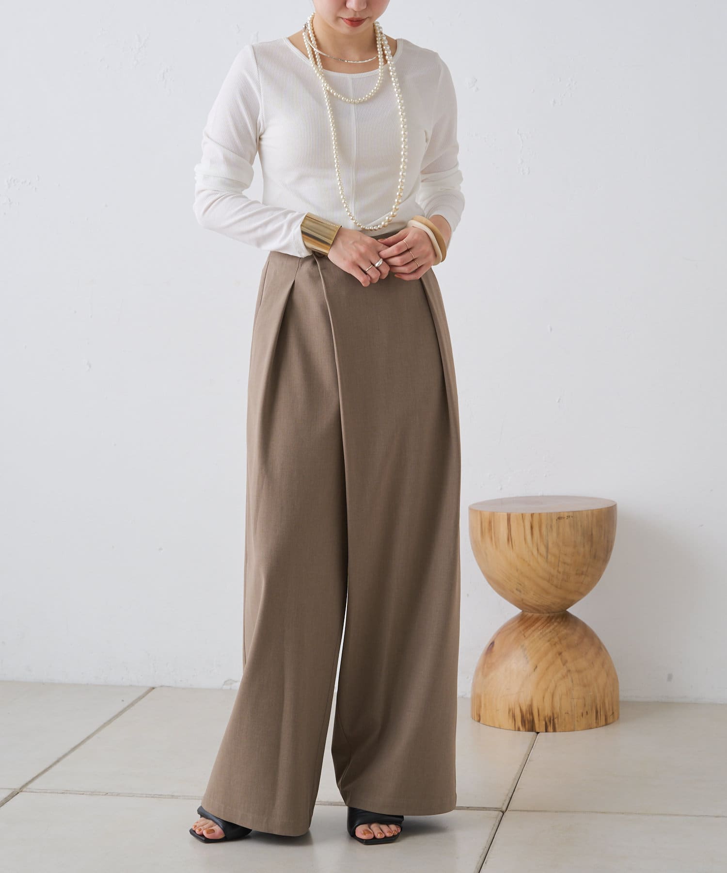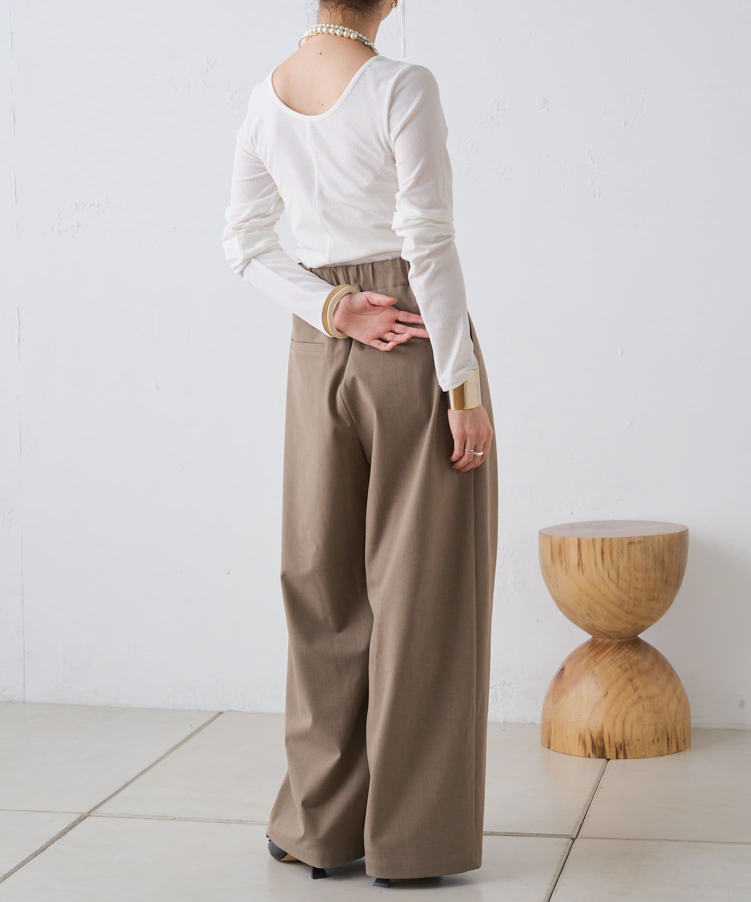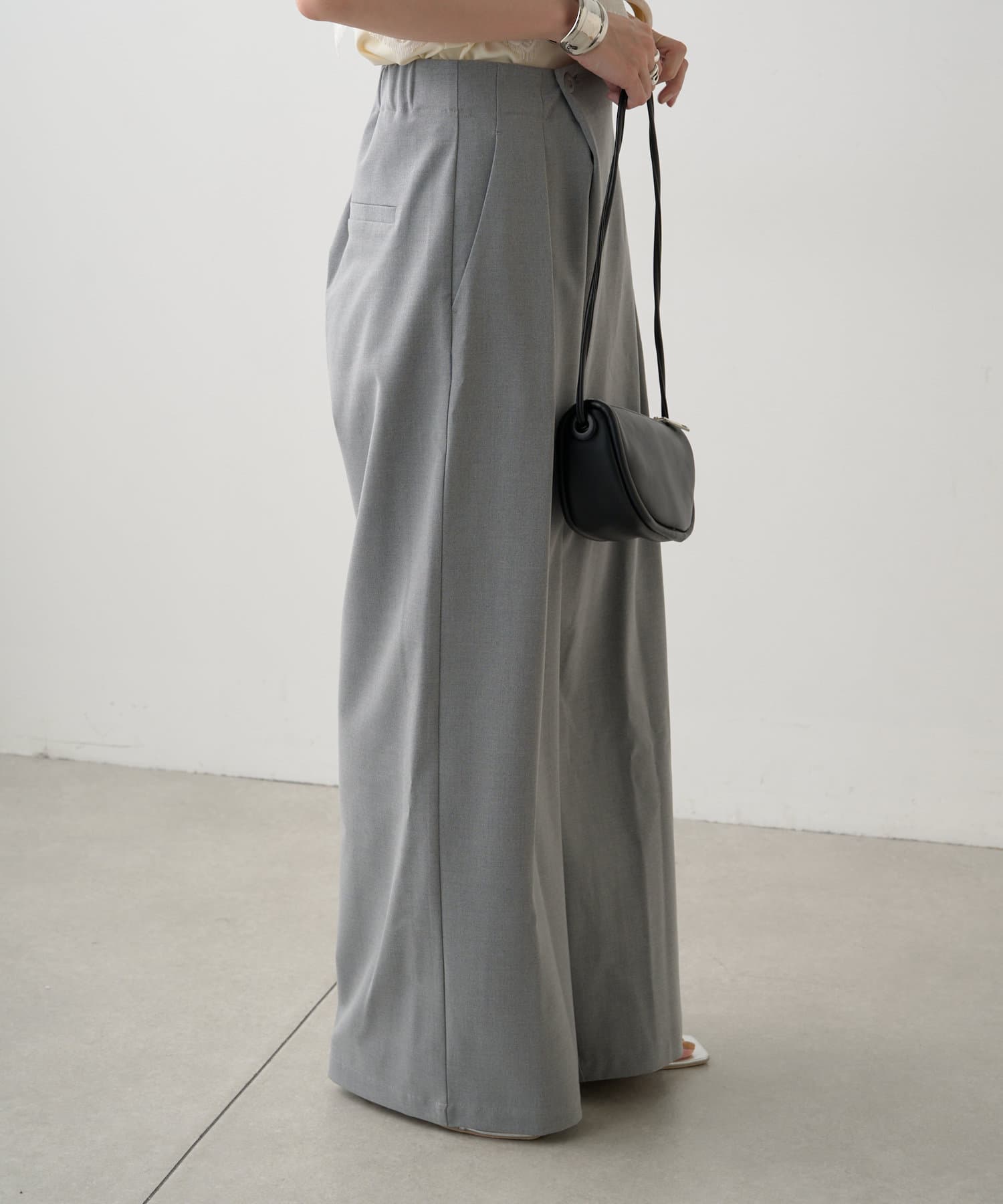 ・腰周りのタックでトップスをインしたスタイルもすっきりとした印象に