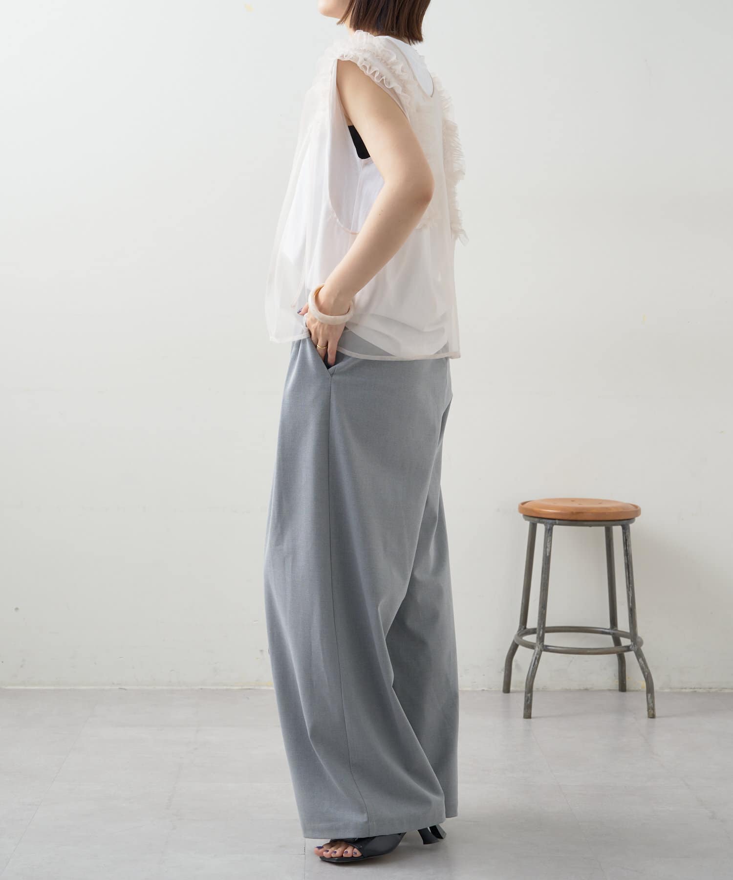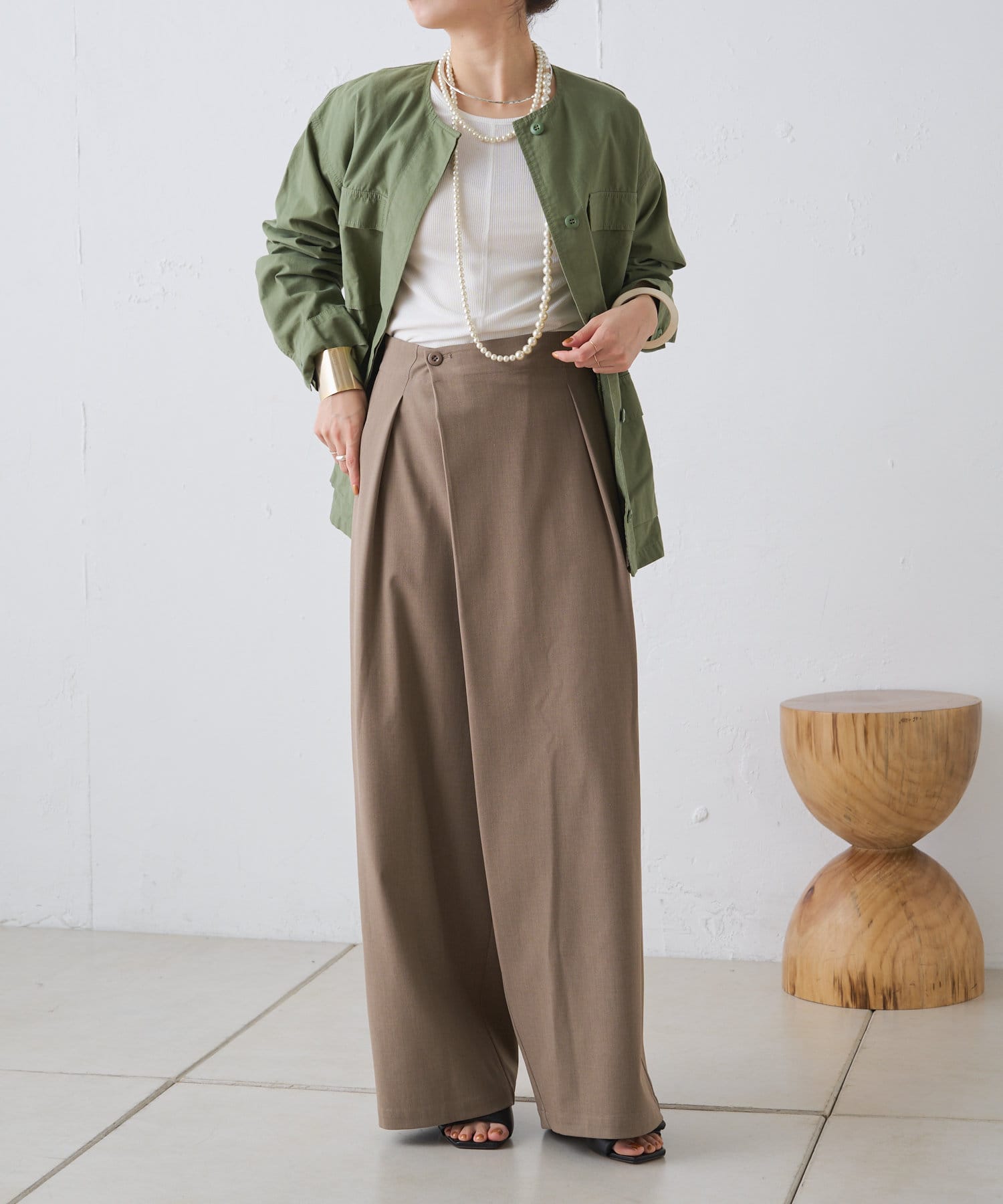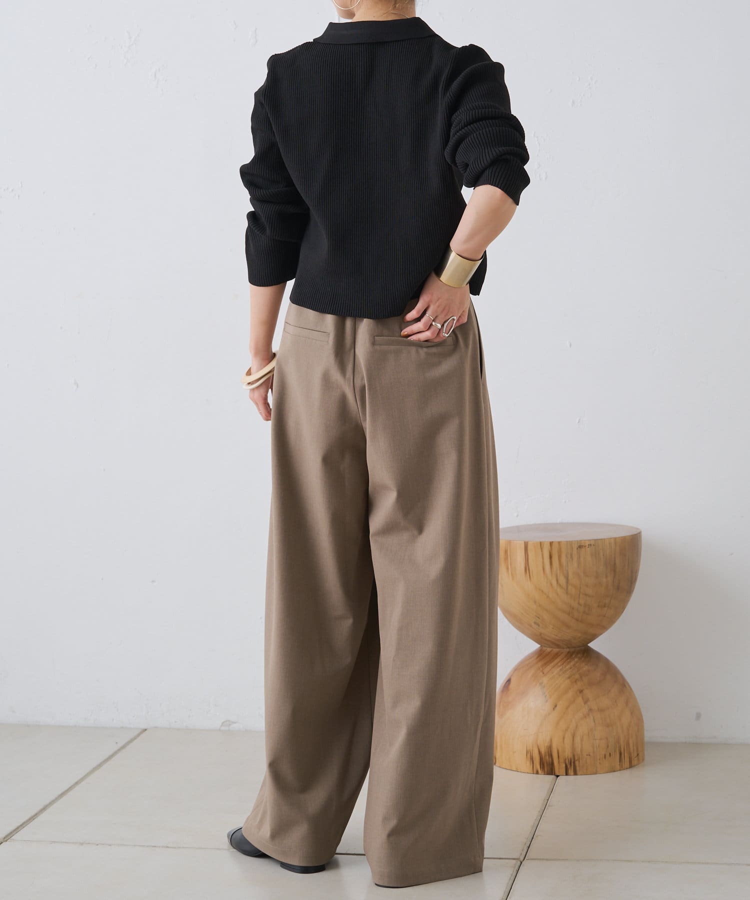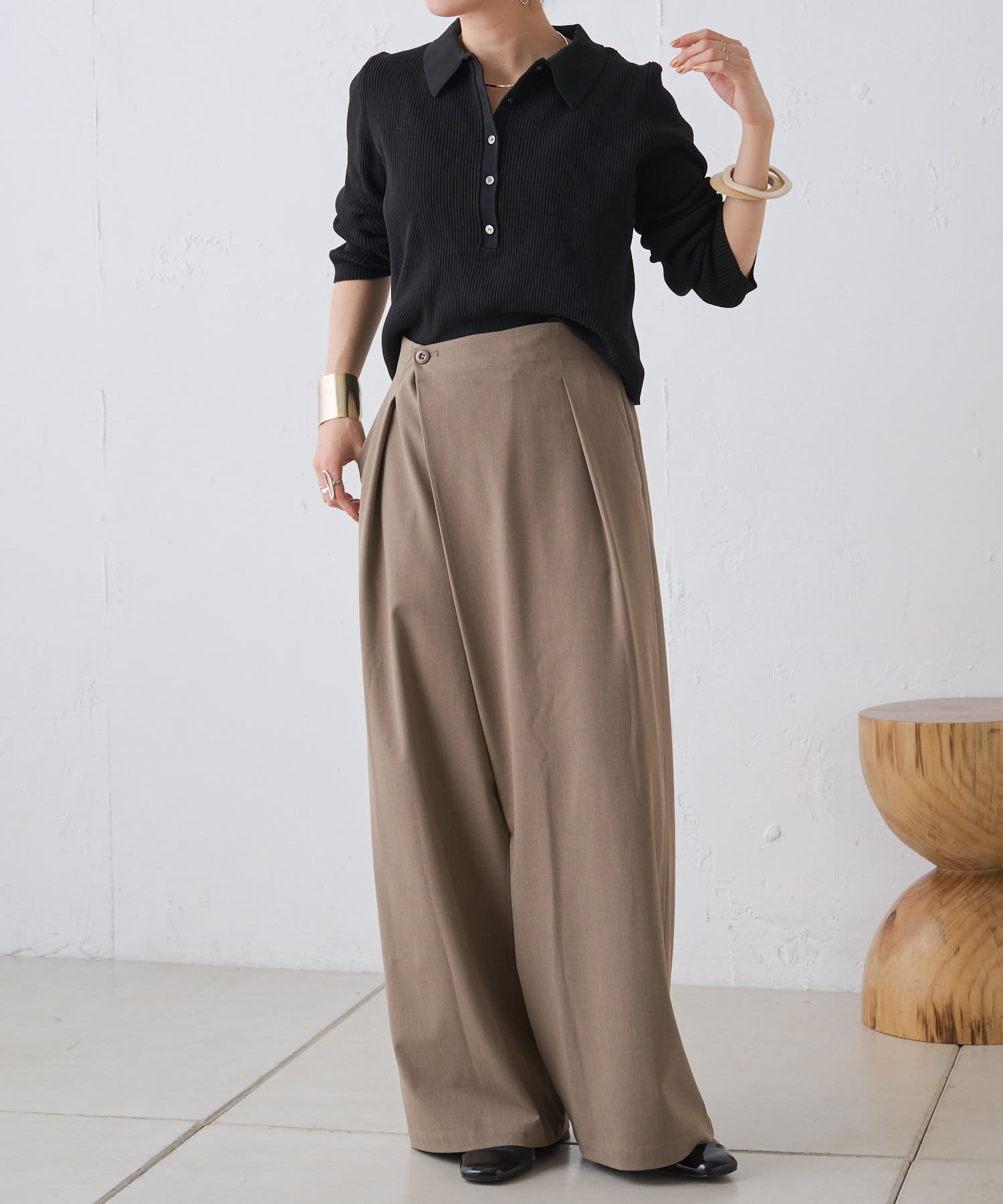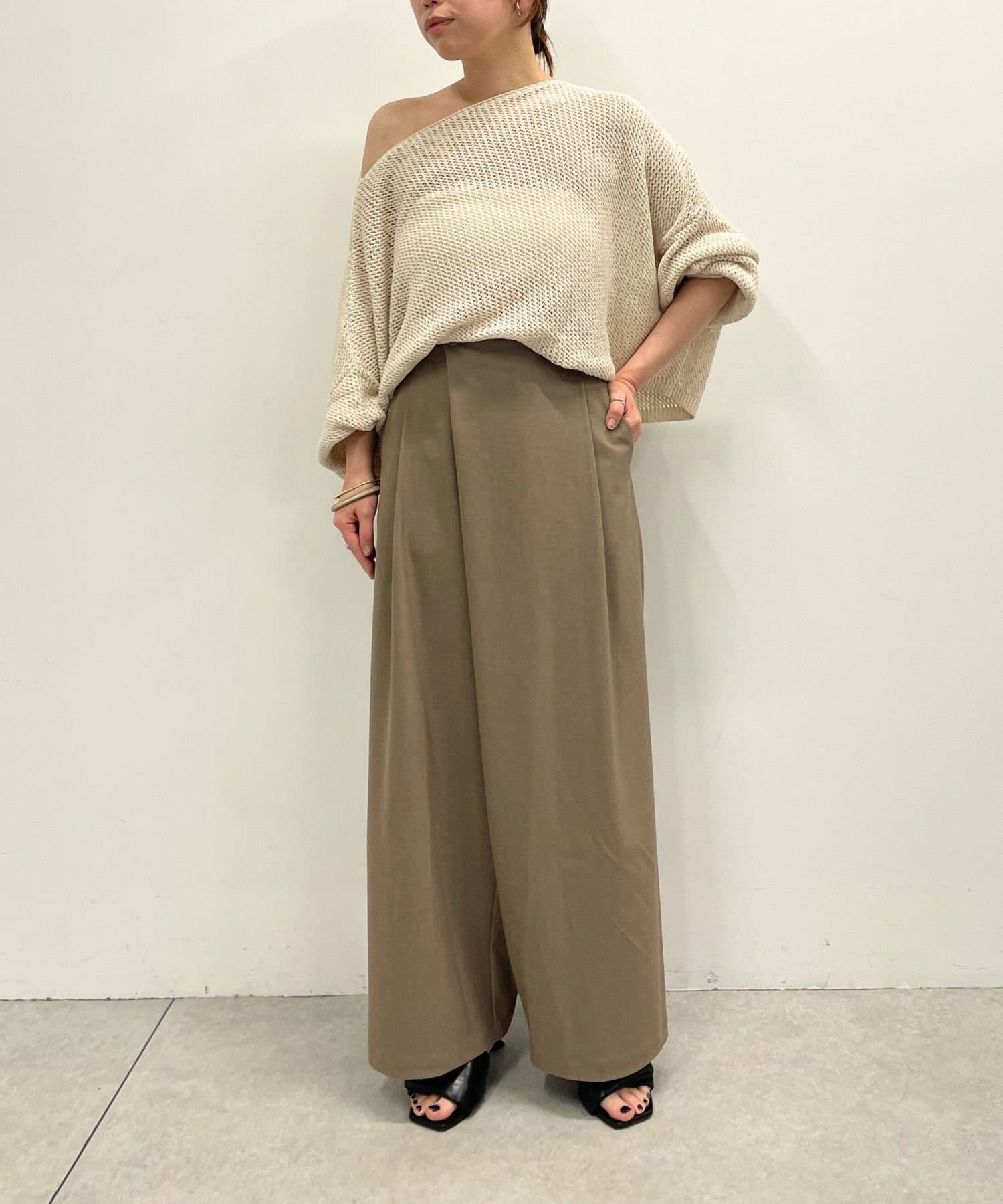 ・腰周りのタックでトップスをインしたスタイルもすっきりとした印象に