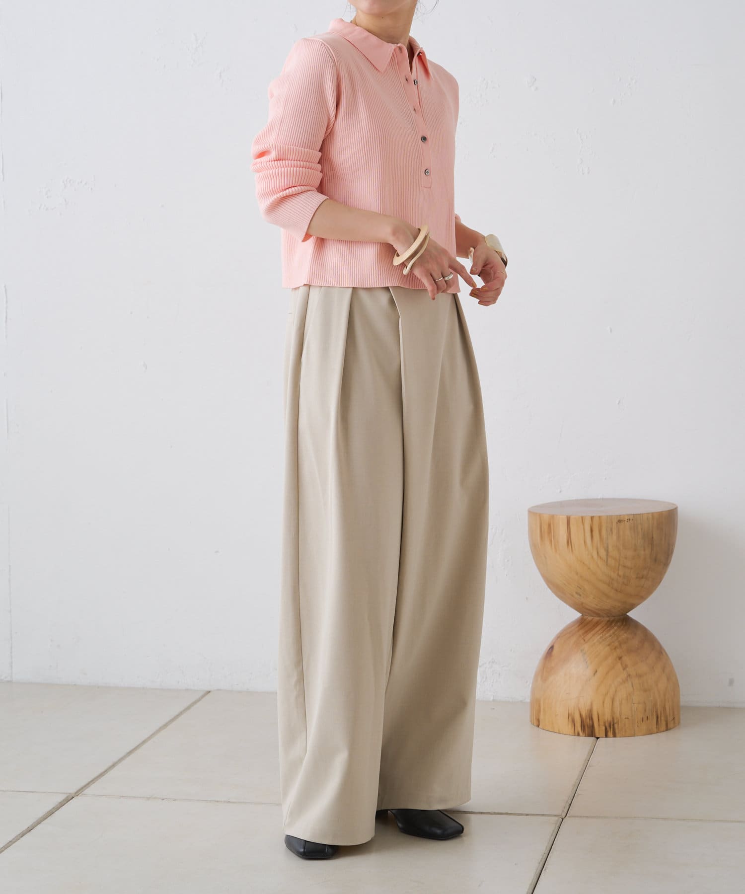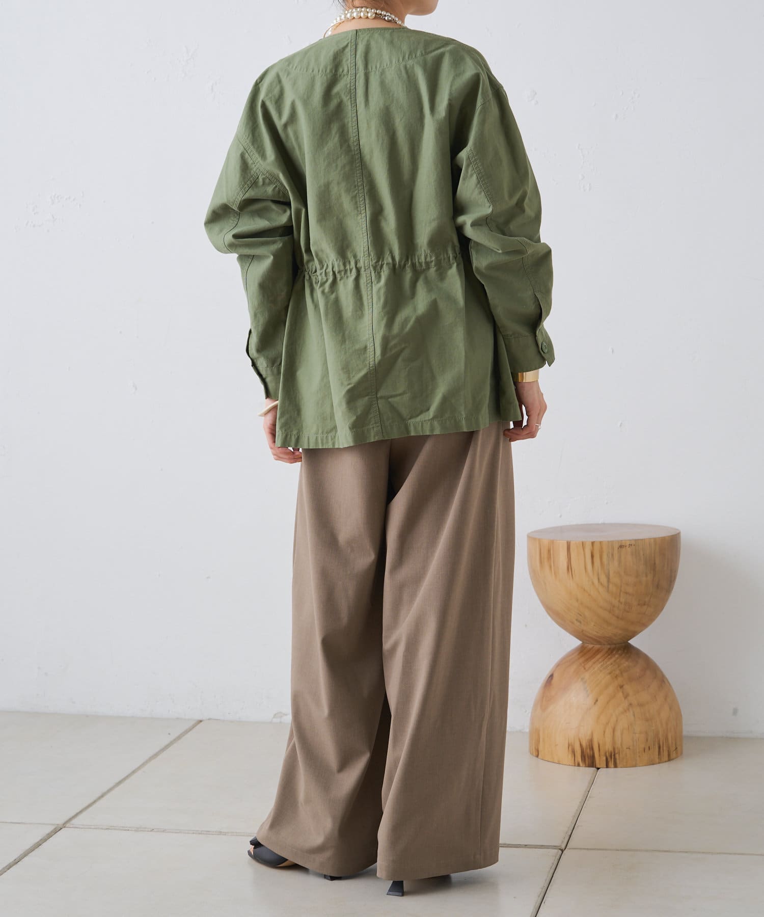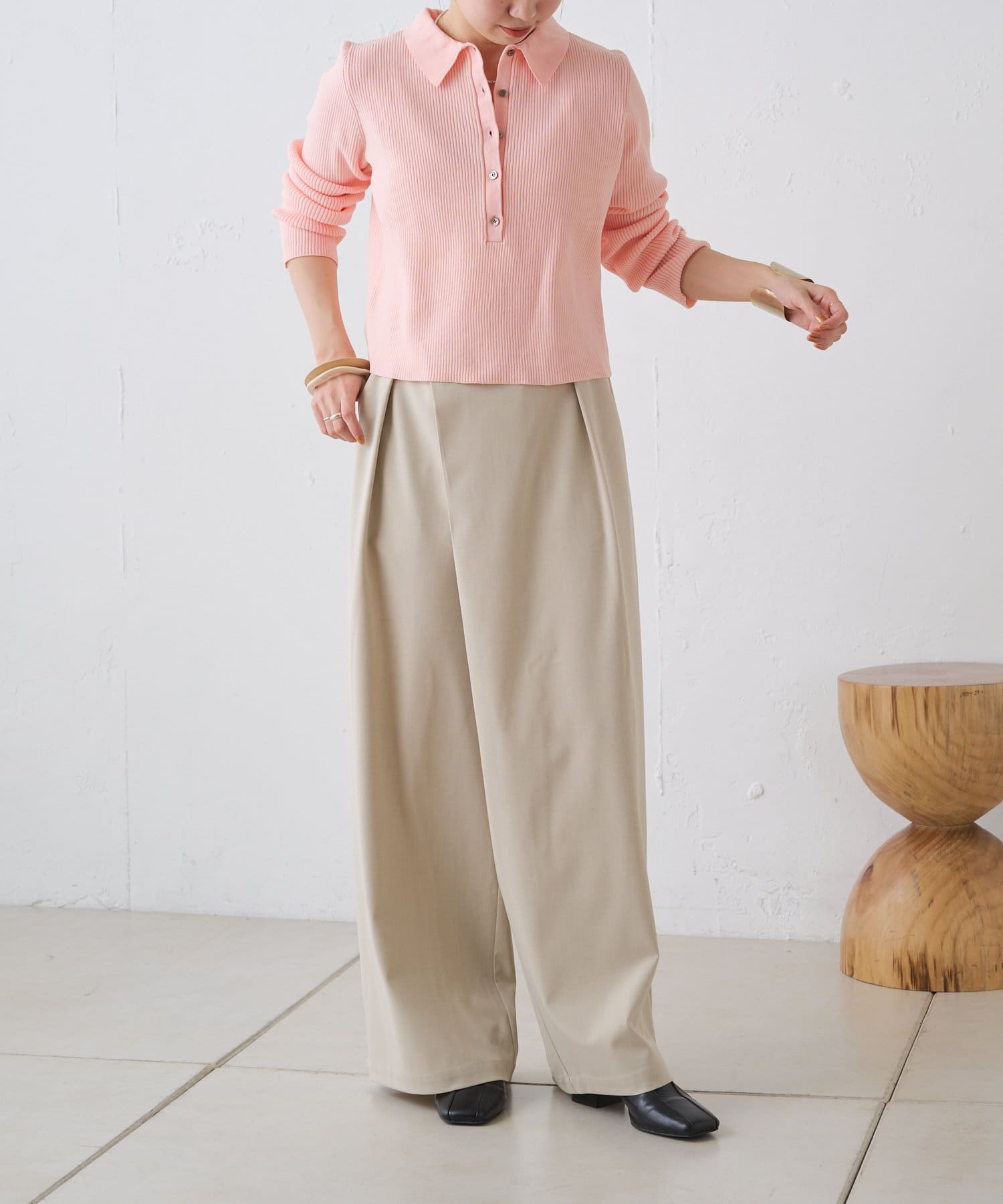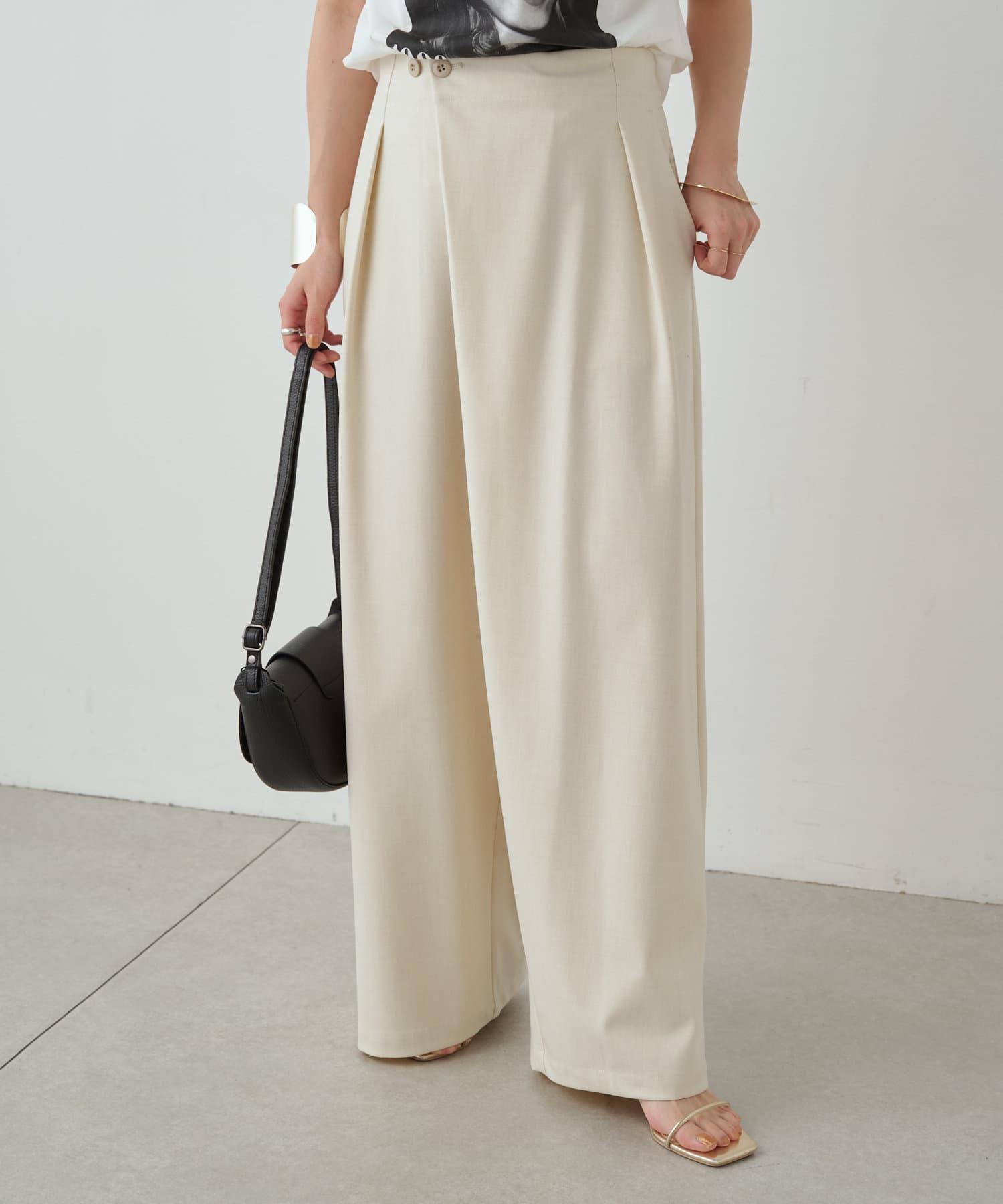 ・腰周りのタックでトップスをインしたスタイルもすっきりとした印象に