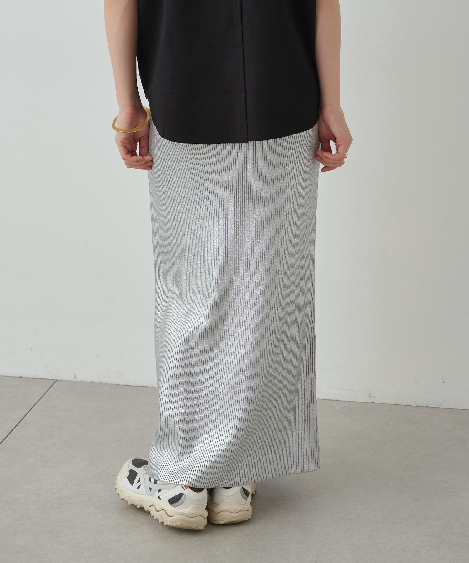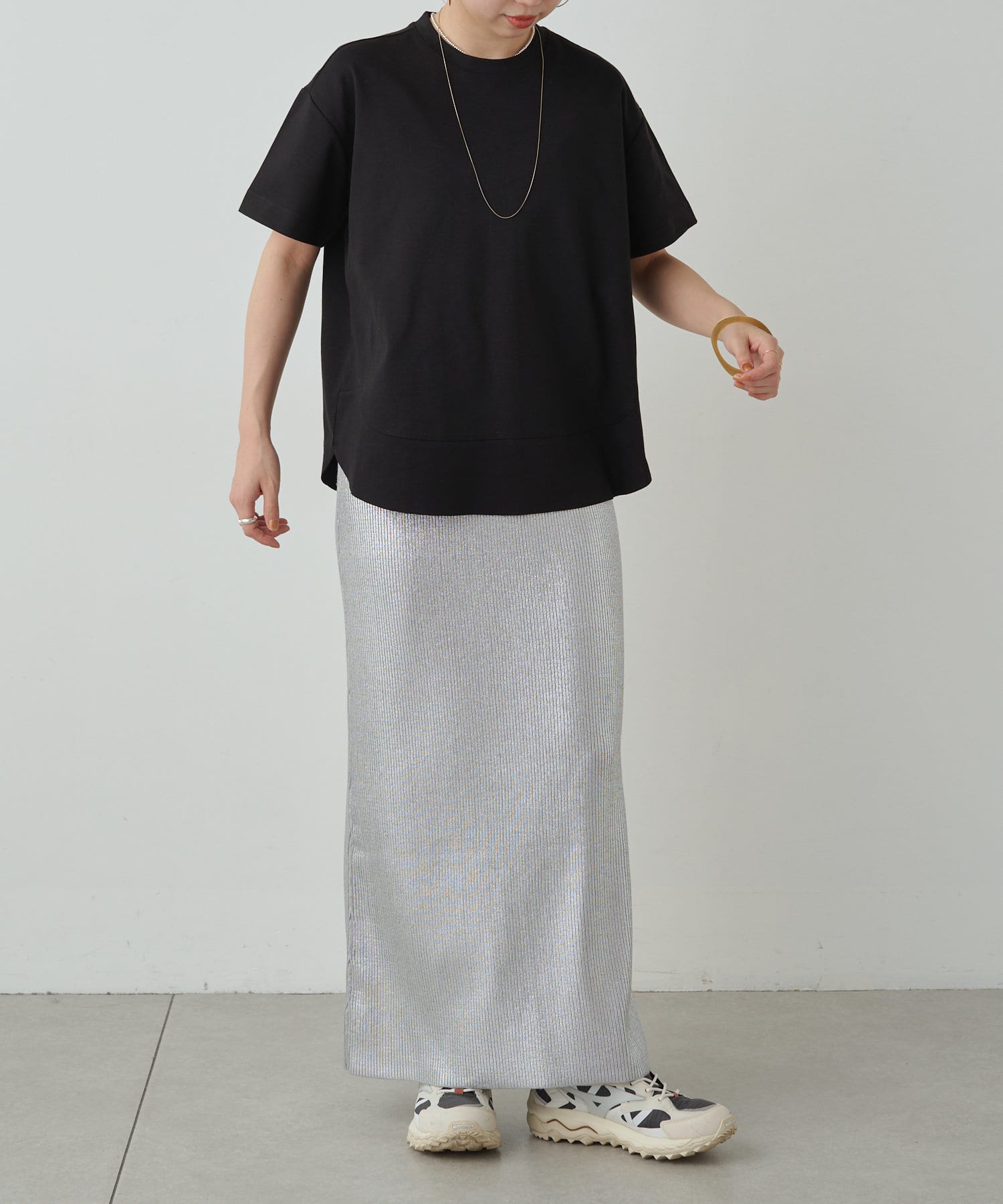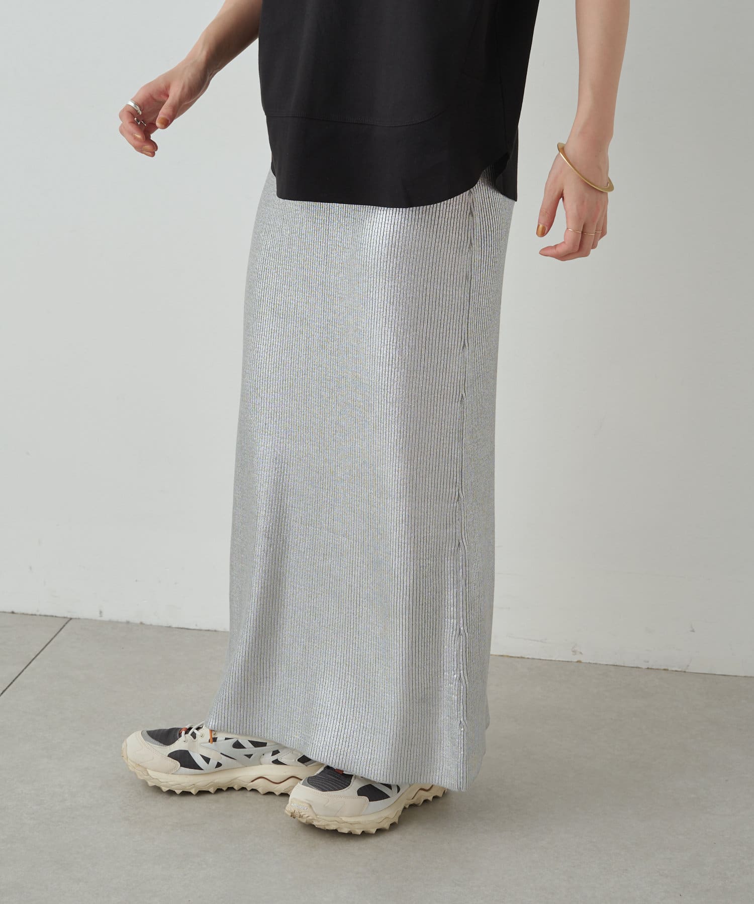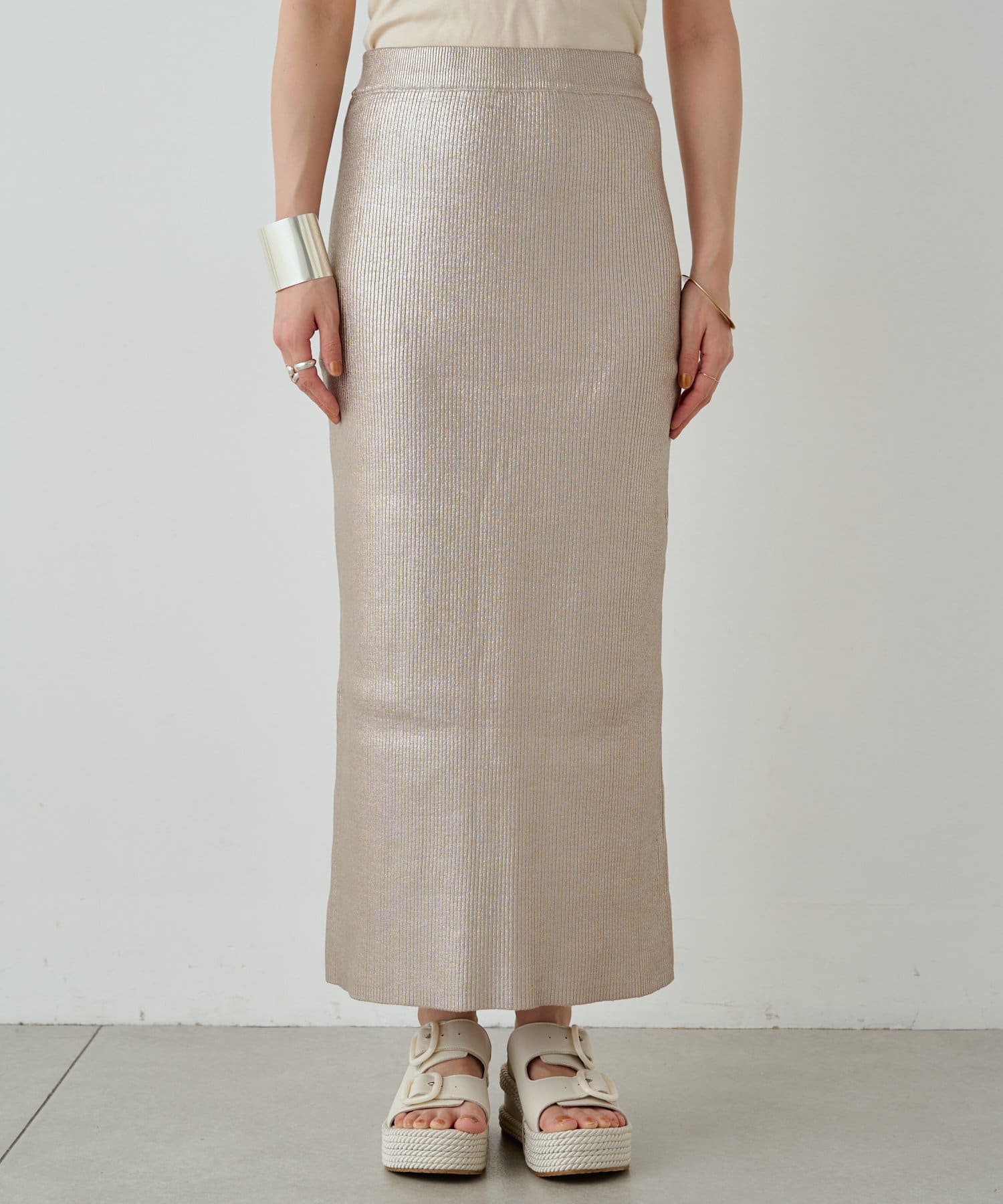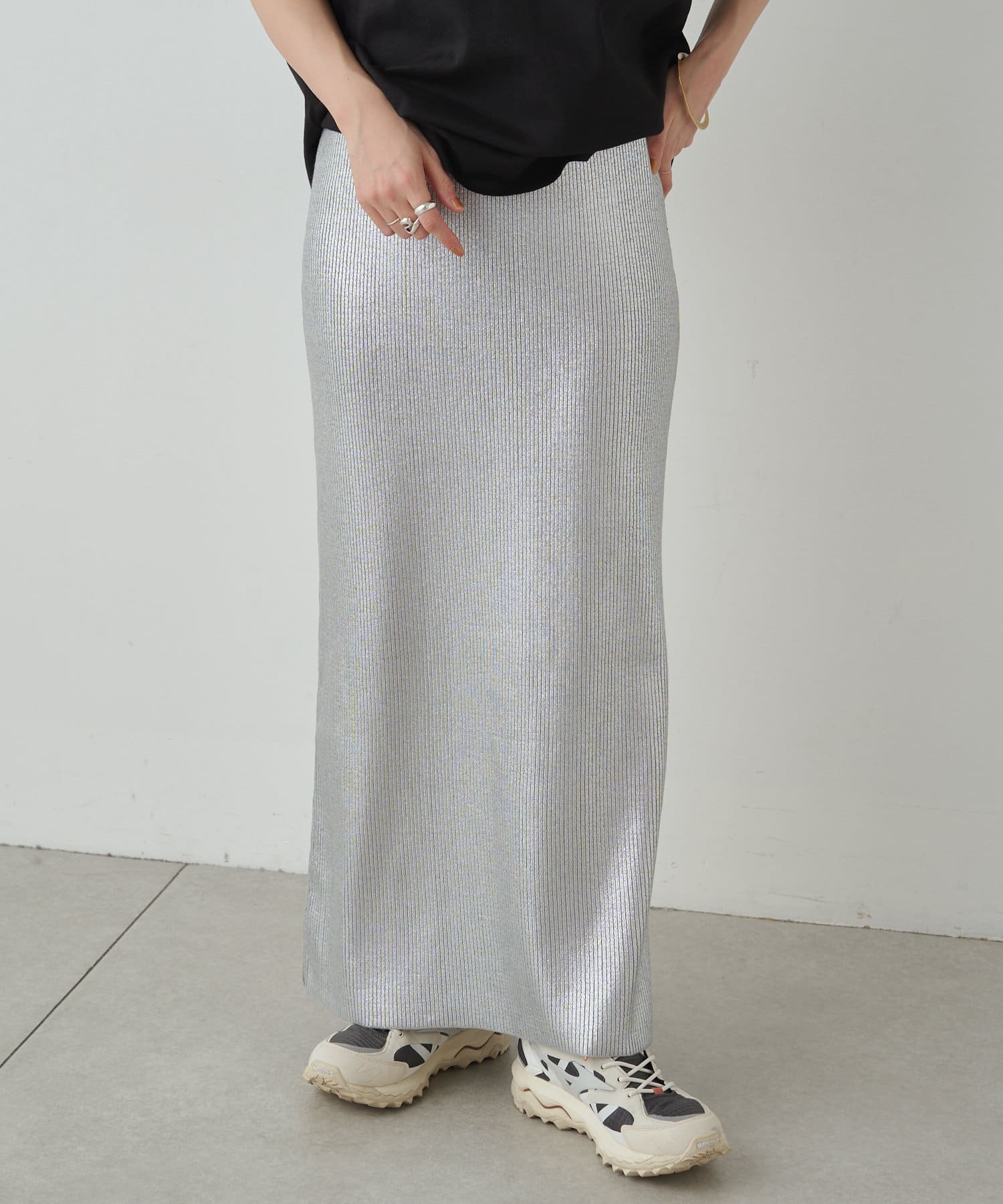 ・1枚で様になる箔の光沢感が、スタイリングのポイントになるスカート