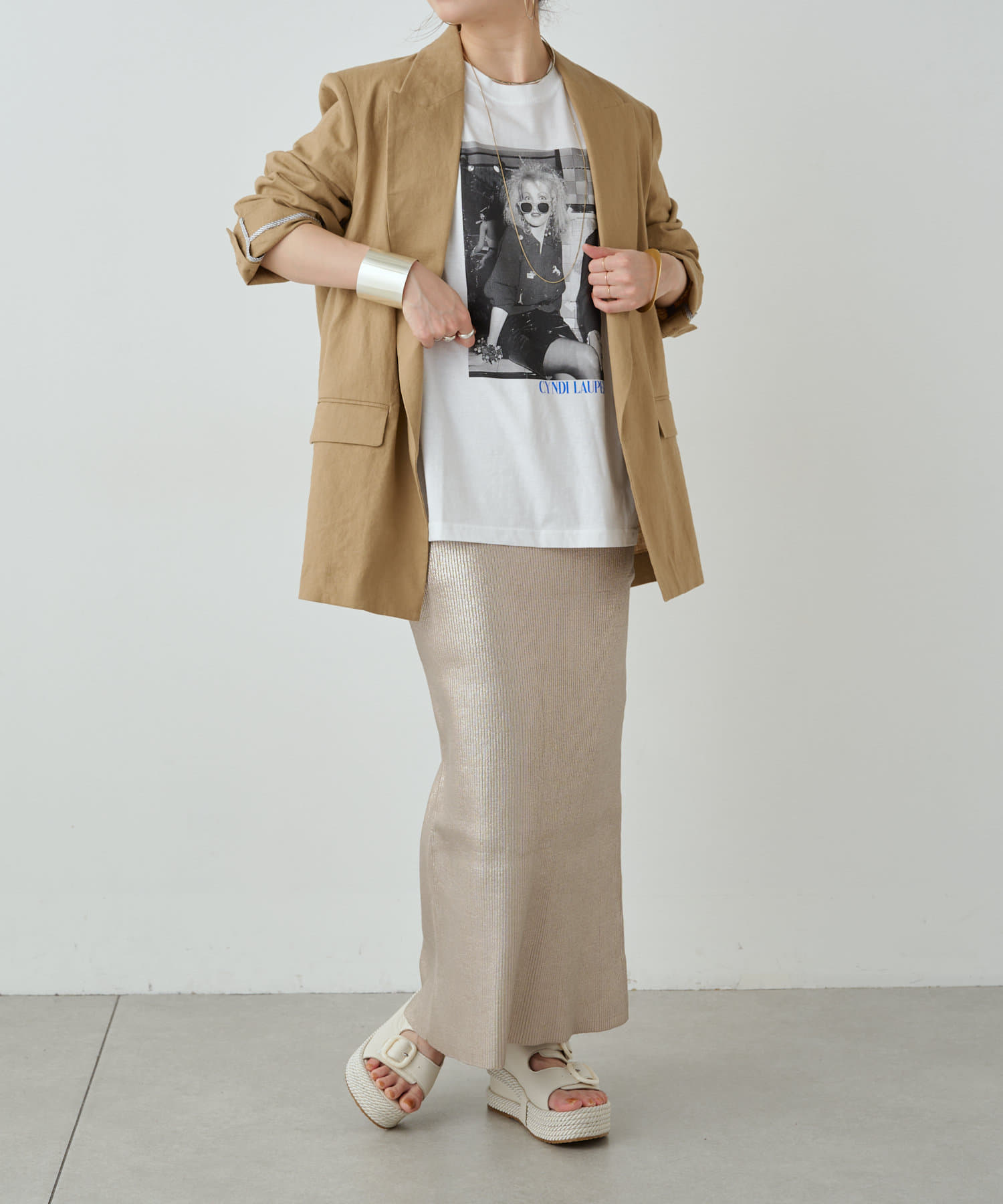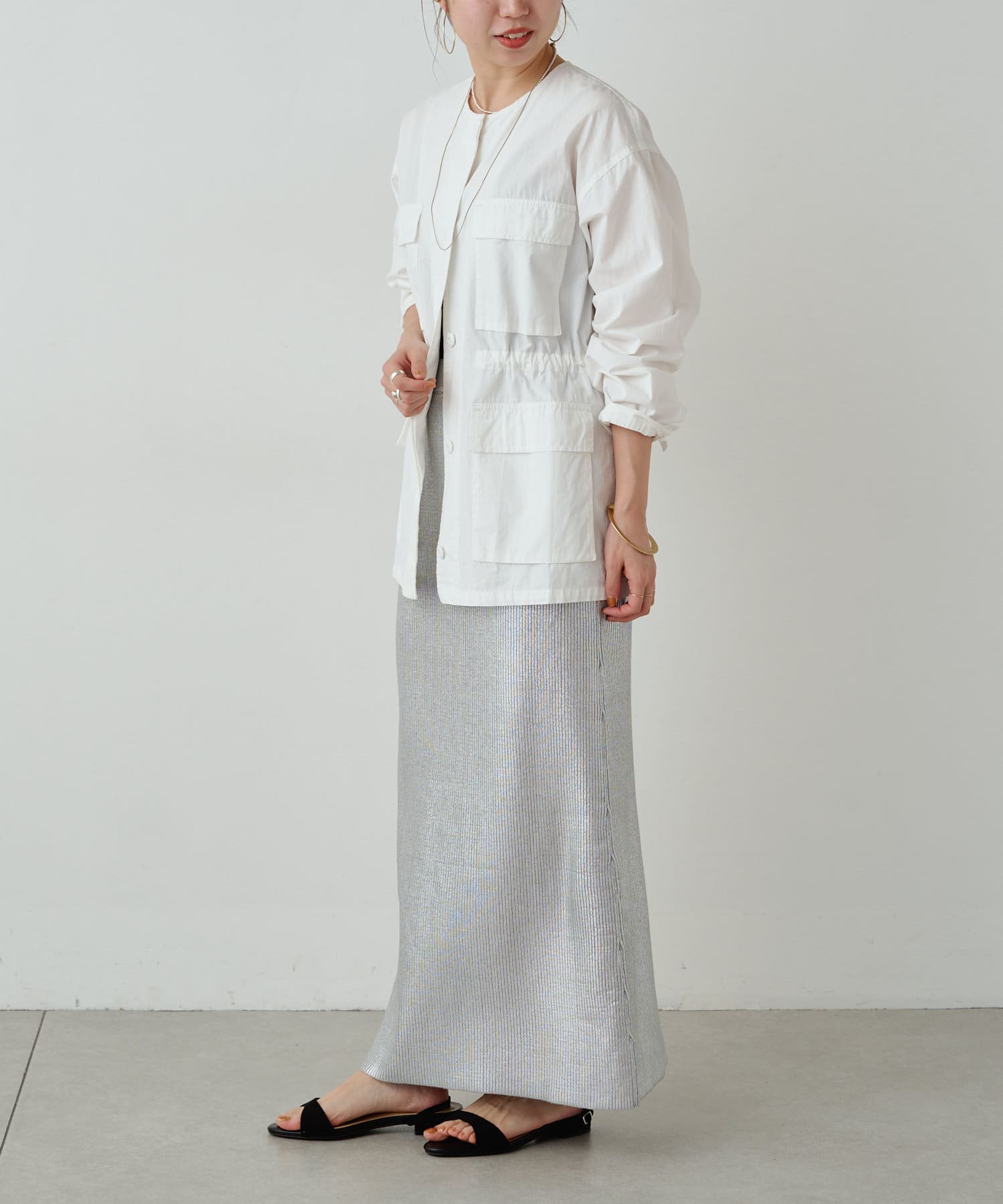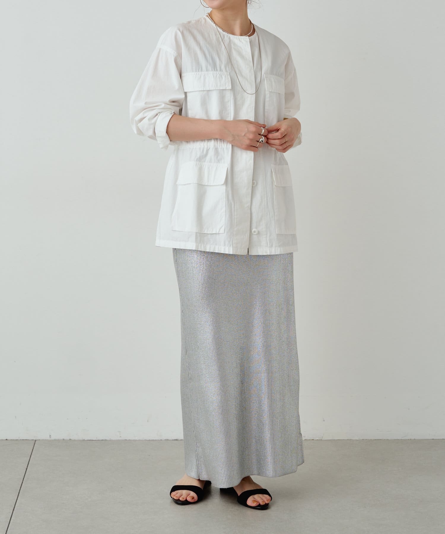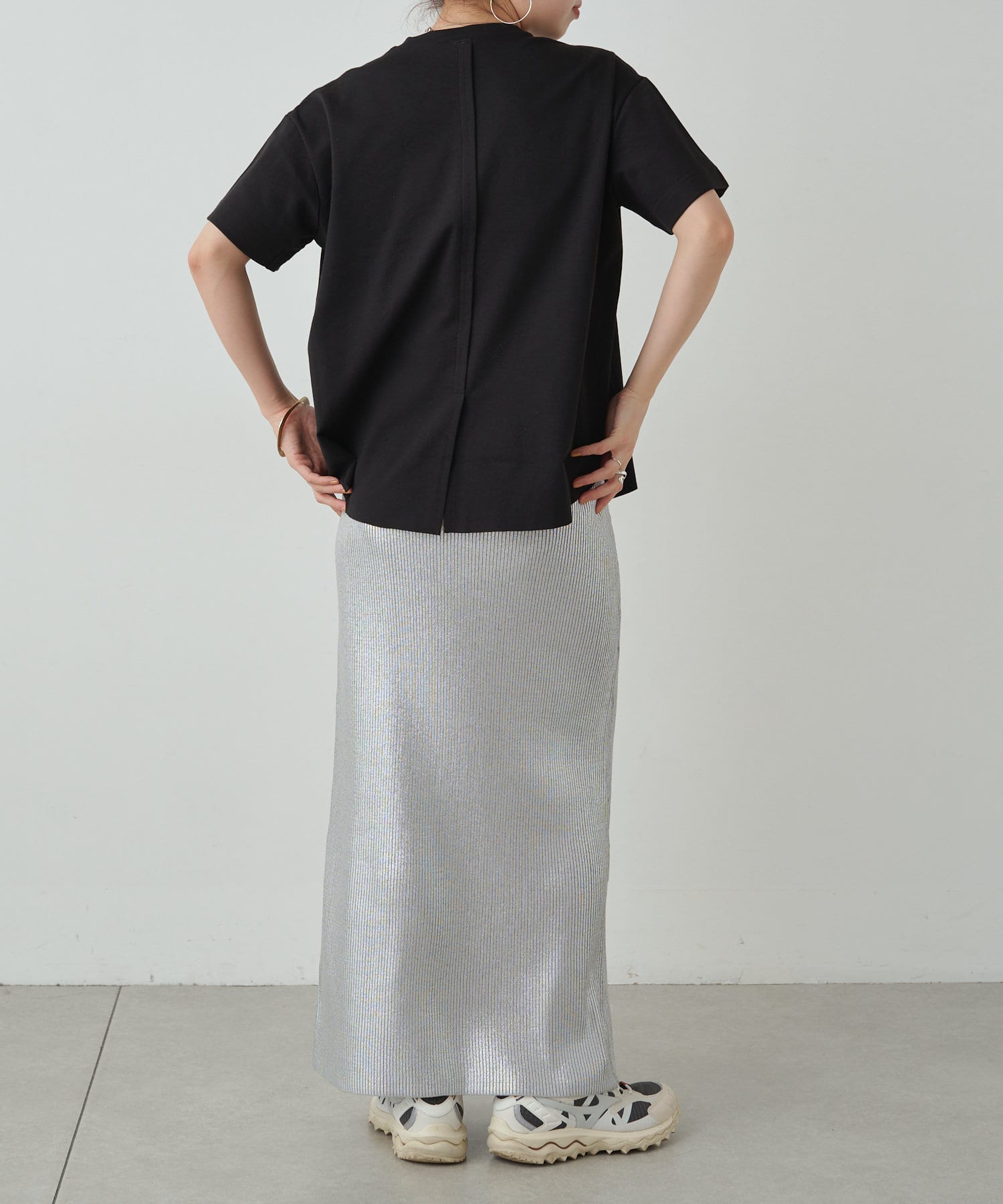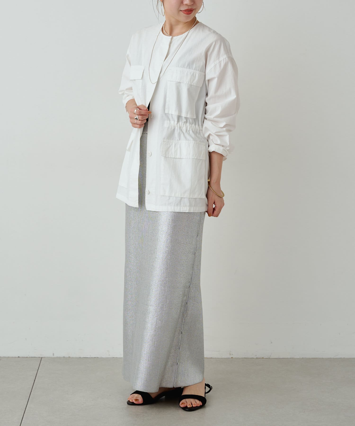 ・1枚で様になる箔の光沢感が、スタイリングのポイントになるスカート