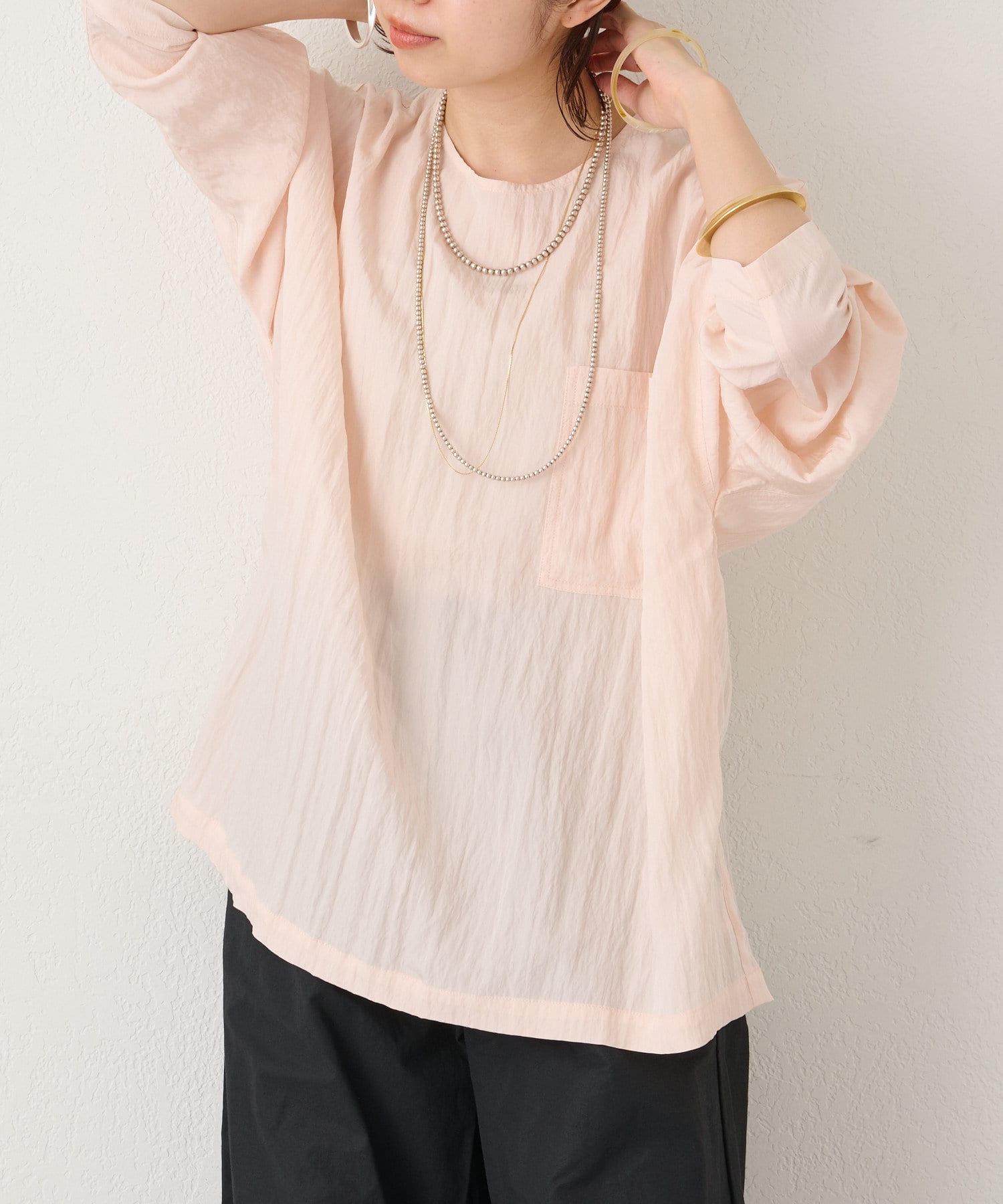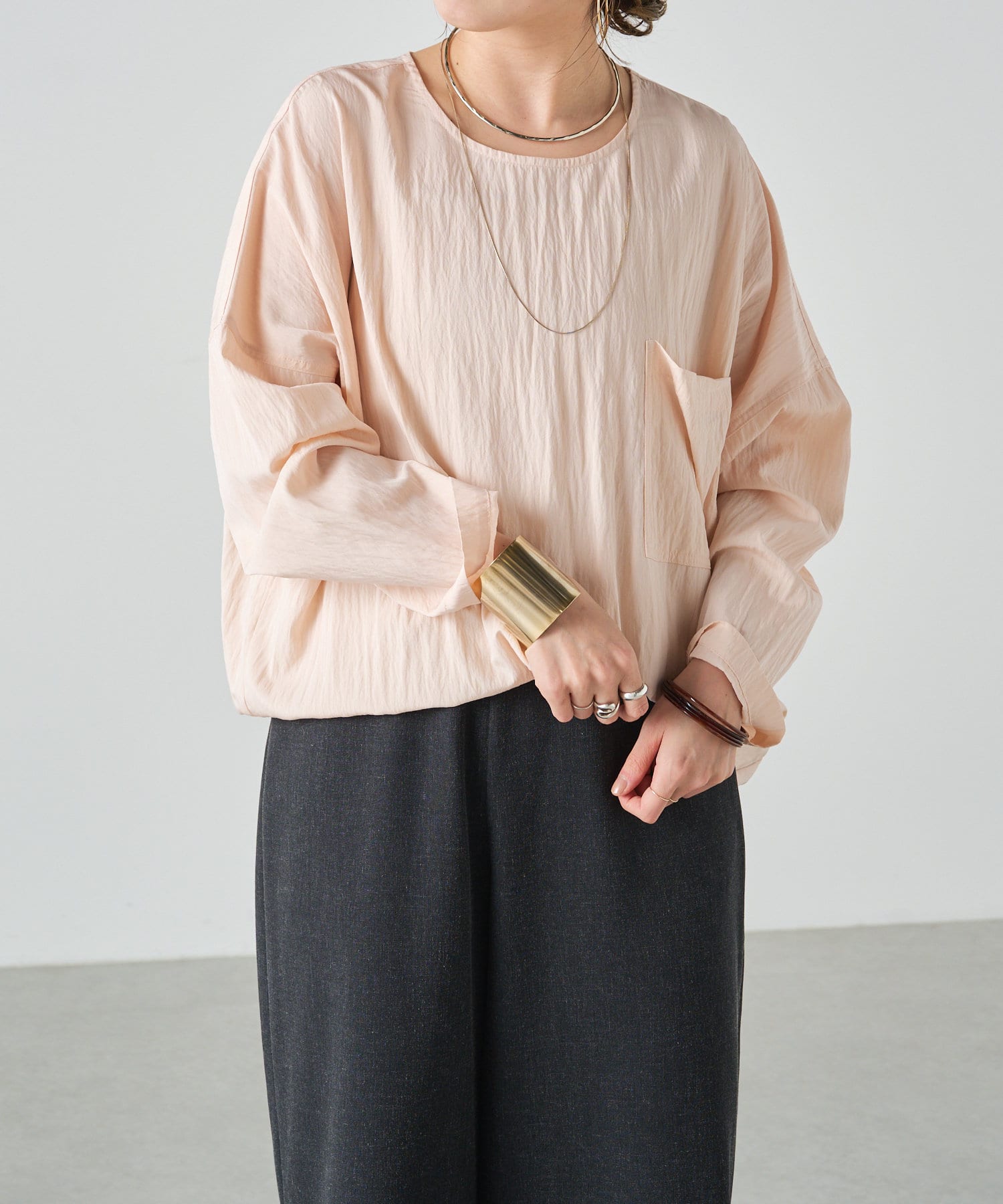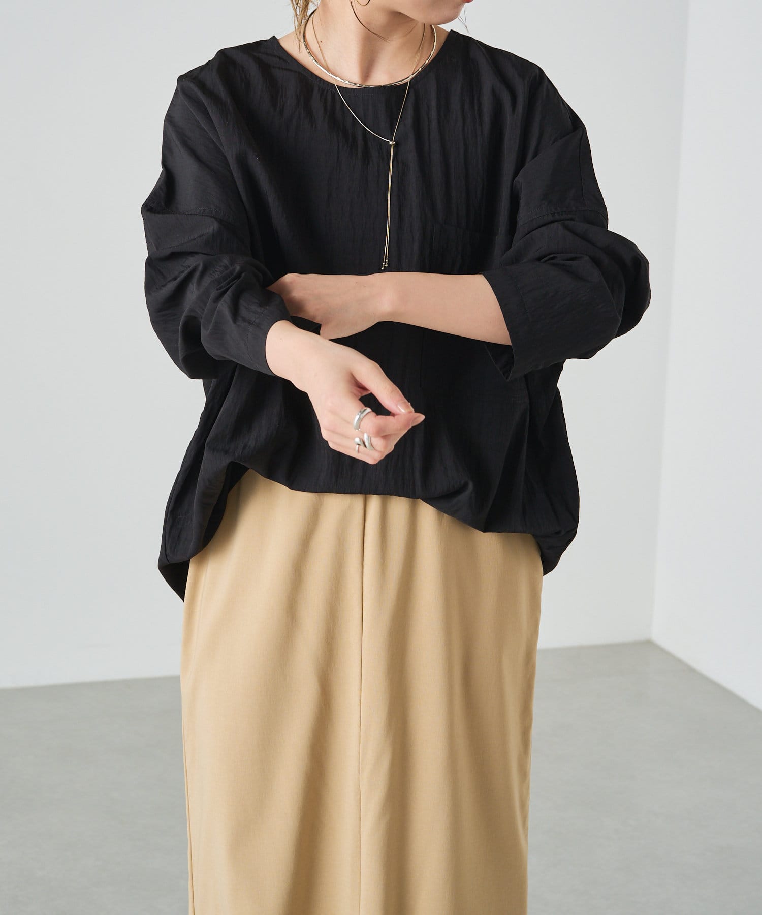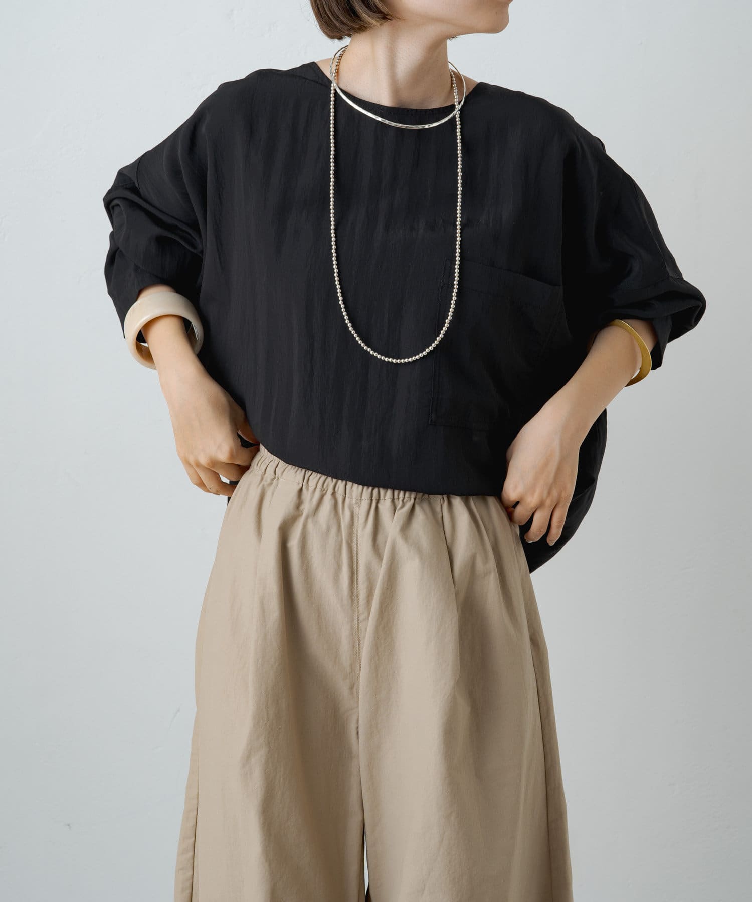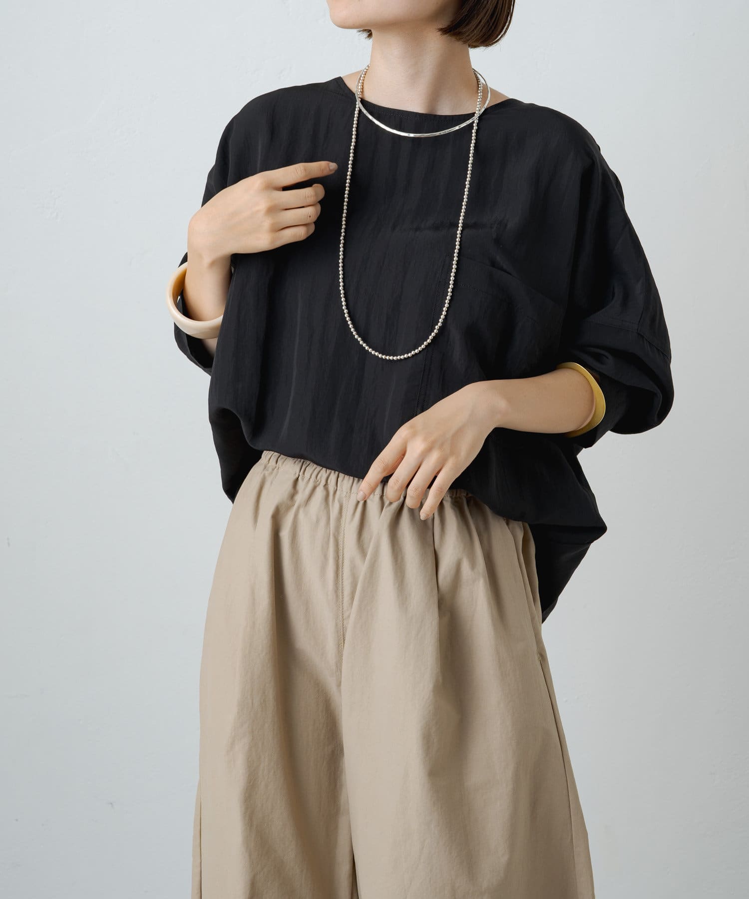 ・Tシャツのようなカジュアルなデザインですが、ややつやのある素材がきれい見えするブラウス