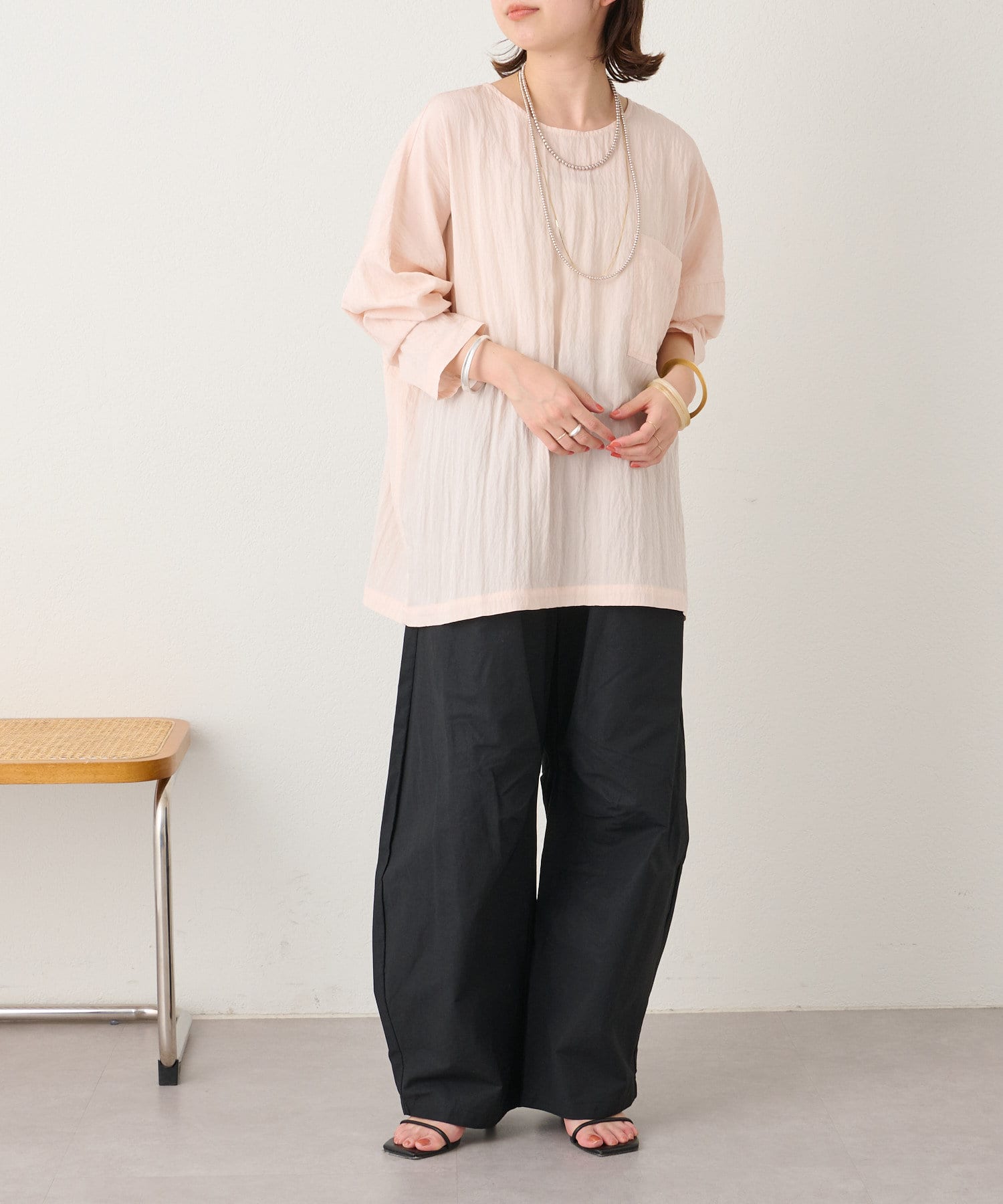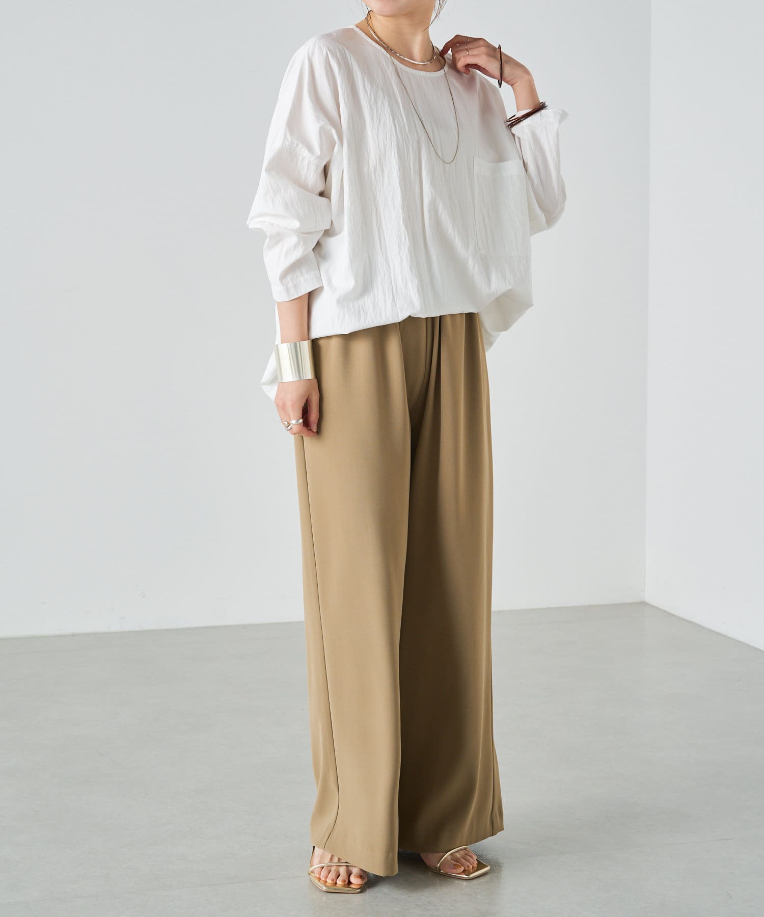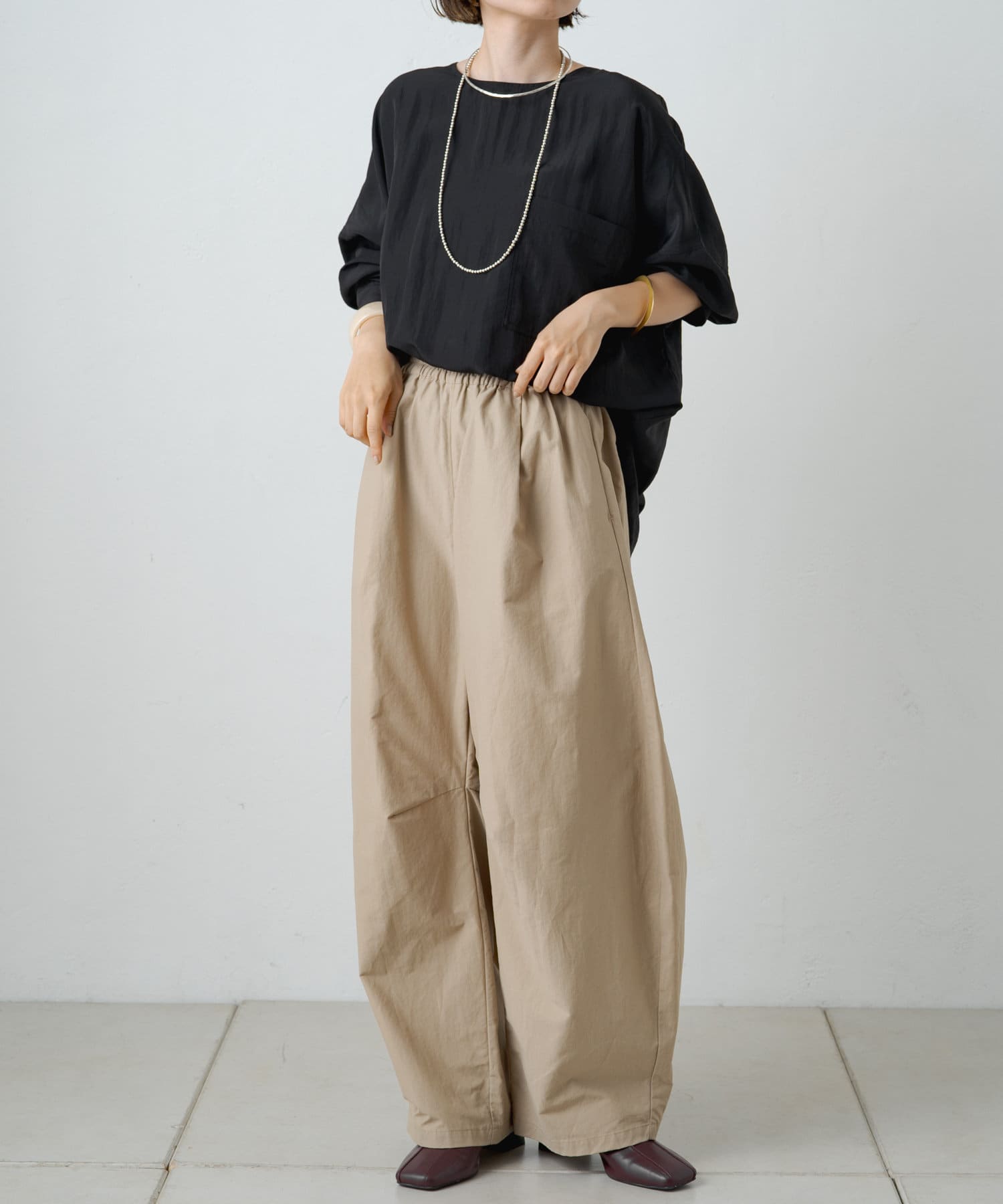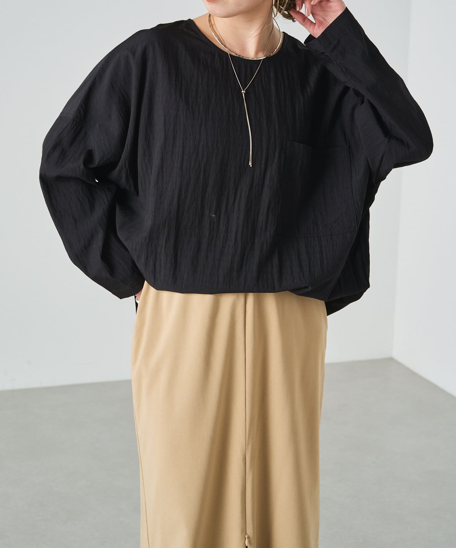 ・Tシャツのようなカジュアルなデザインですが、ややつやのある素材がきれい見えするブラウス