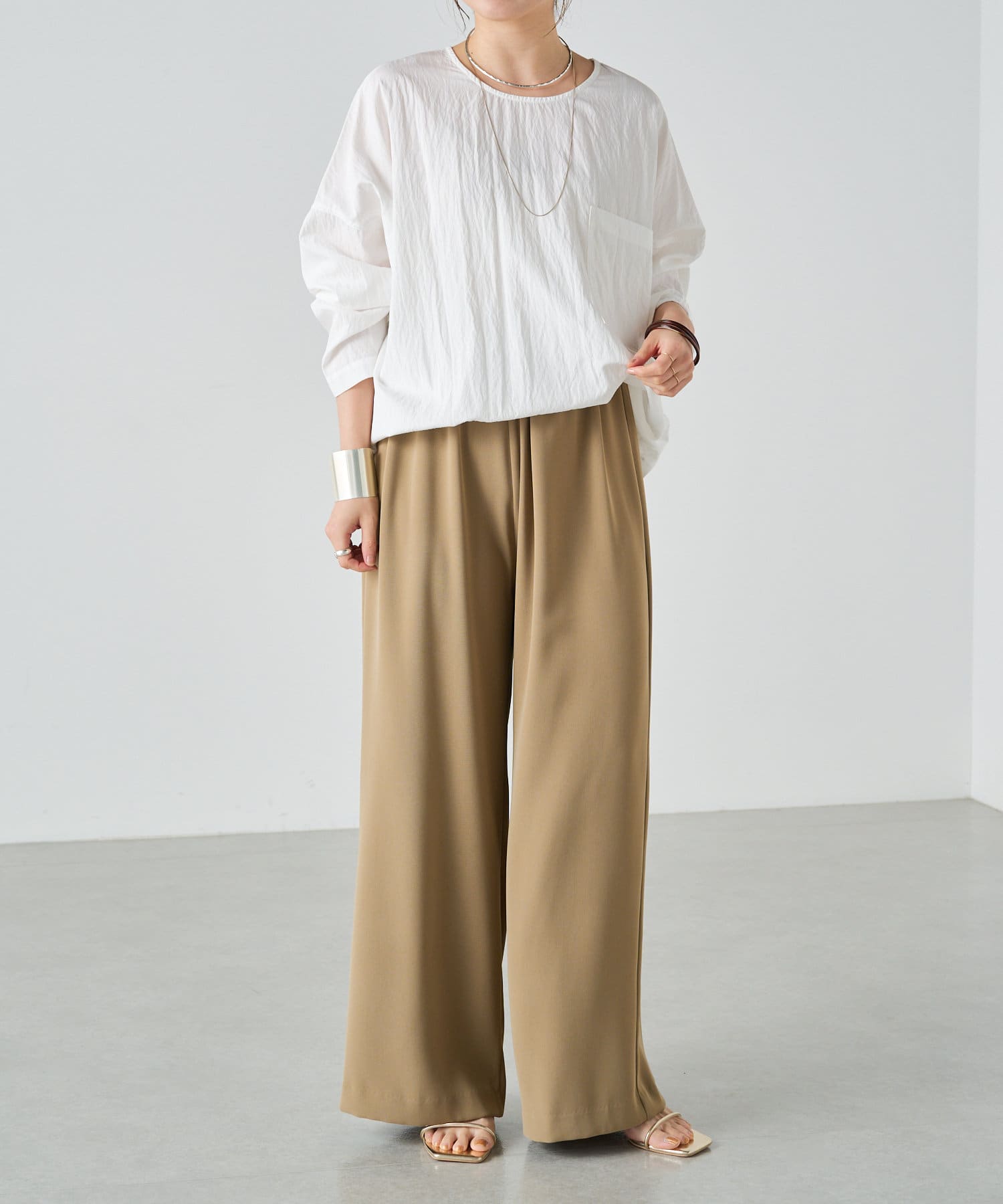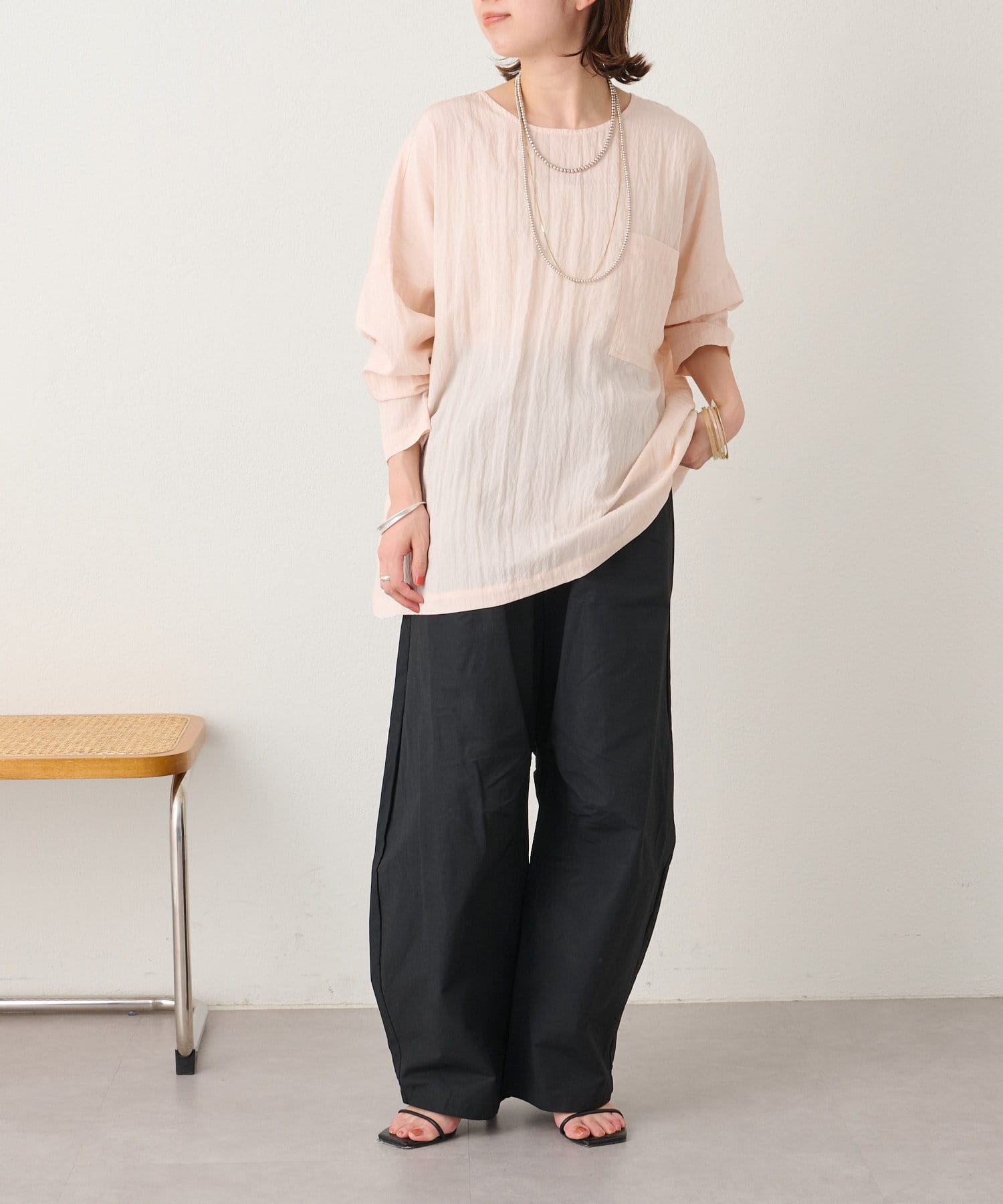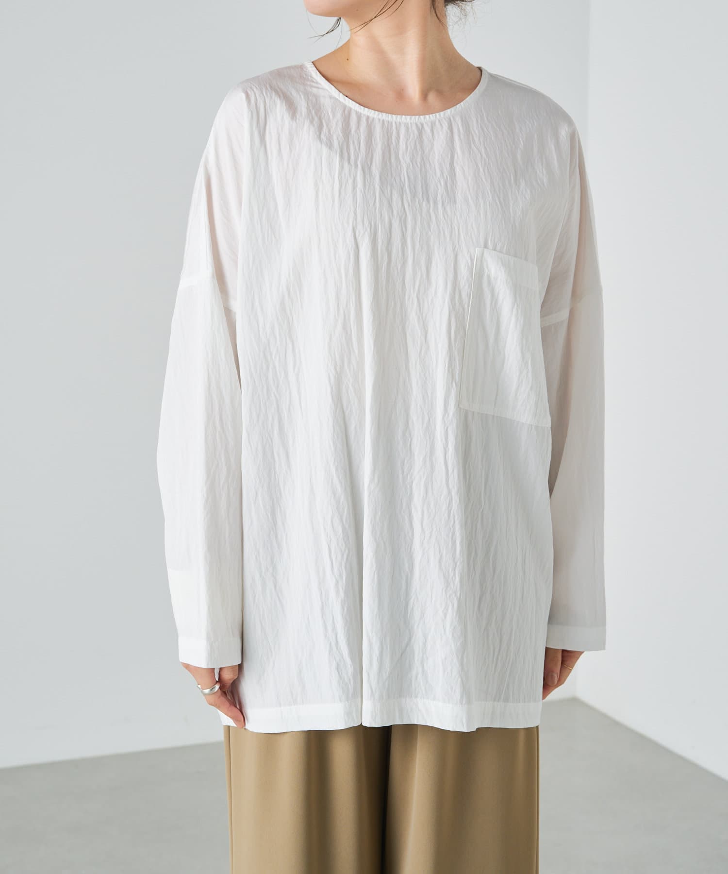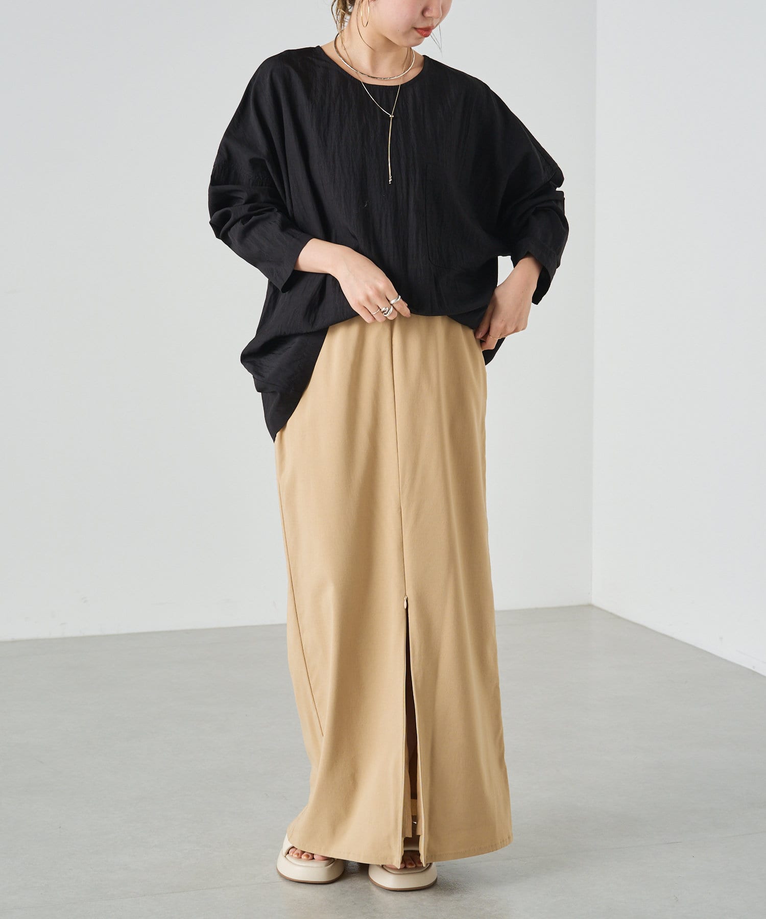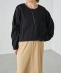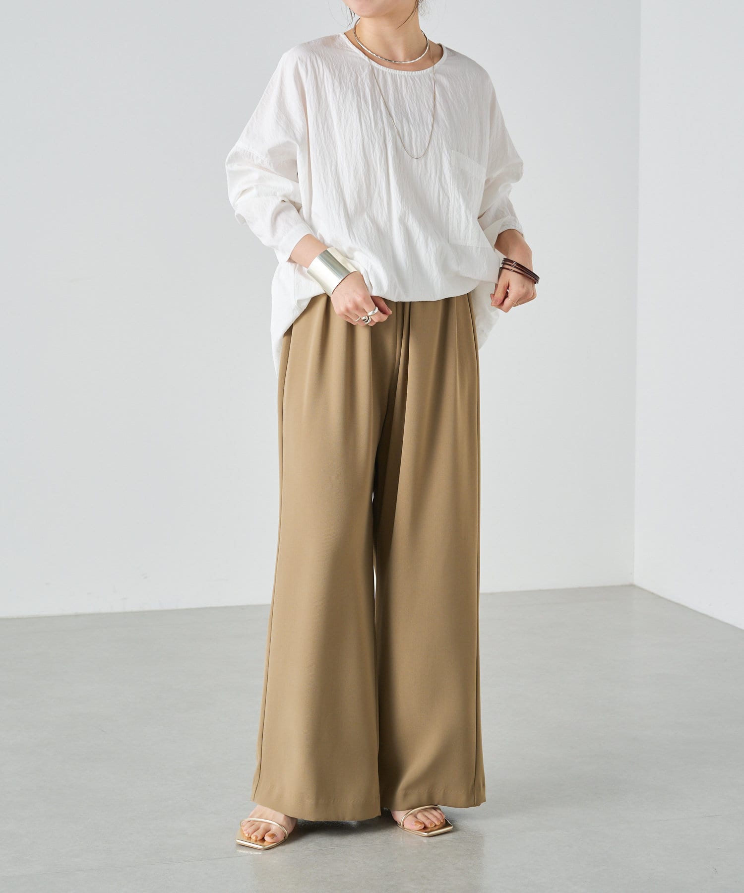 ・Tシャツのようなカジュアルなデザインですが、ややつやのある素材がきれい見えするブラウス