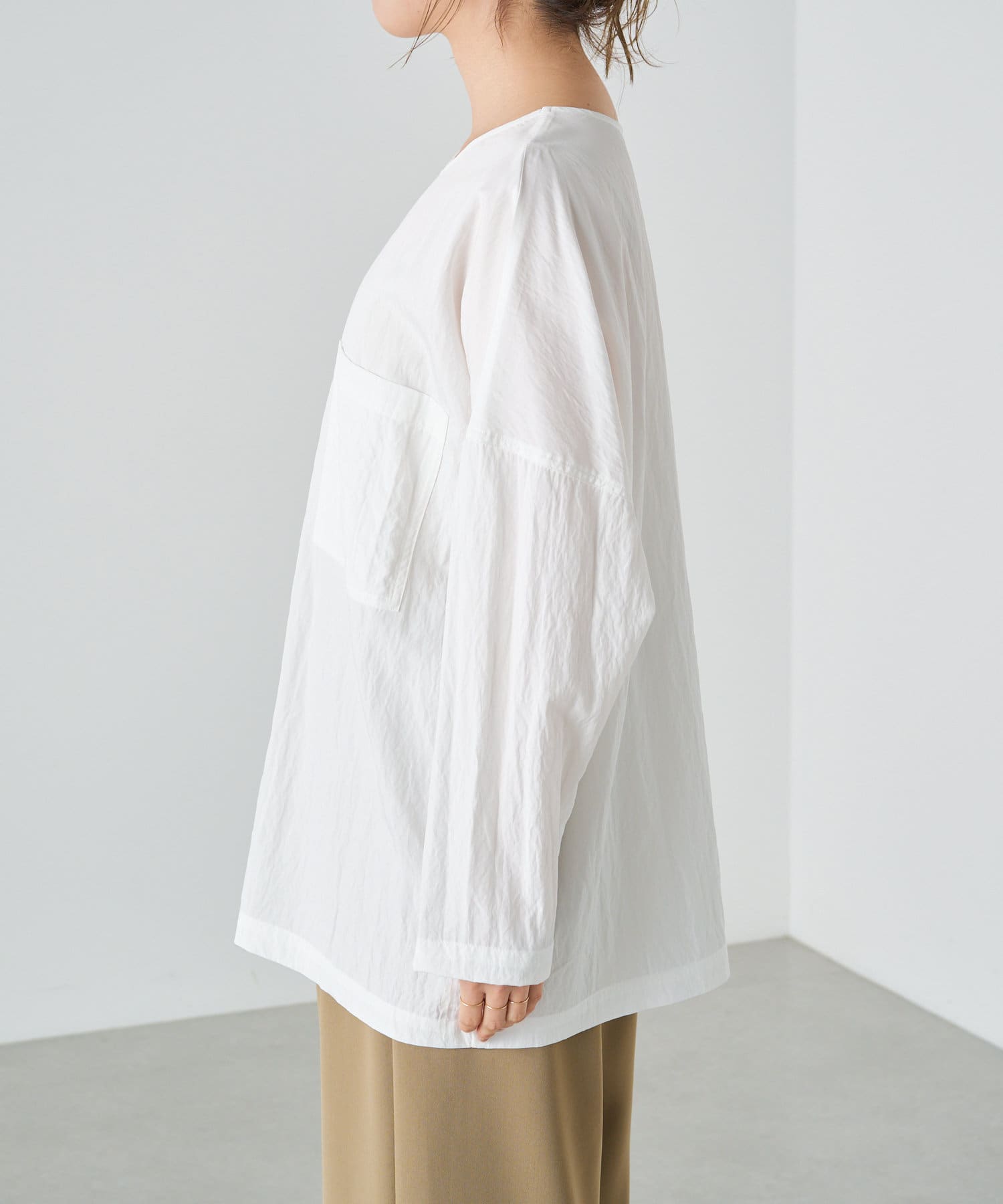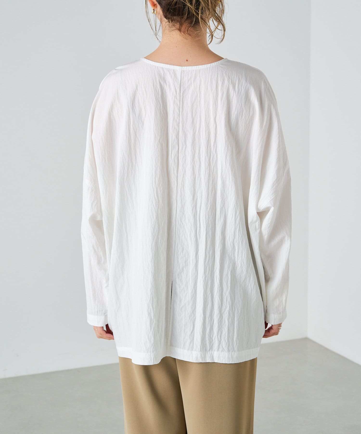 ・ノーカラーデザインが首回りをすっきりと見せてくれて、アクセサリーや小物が映える一着。