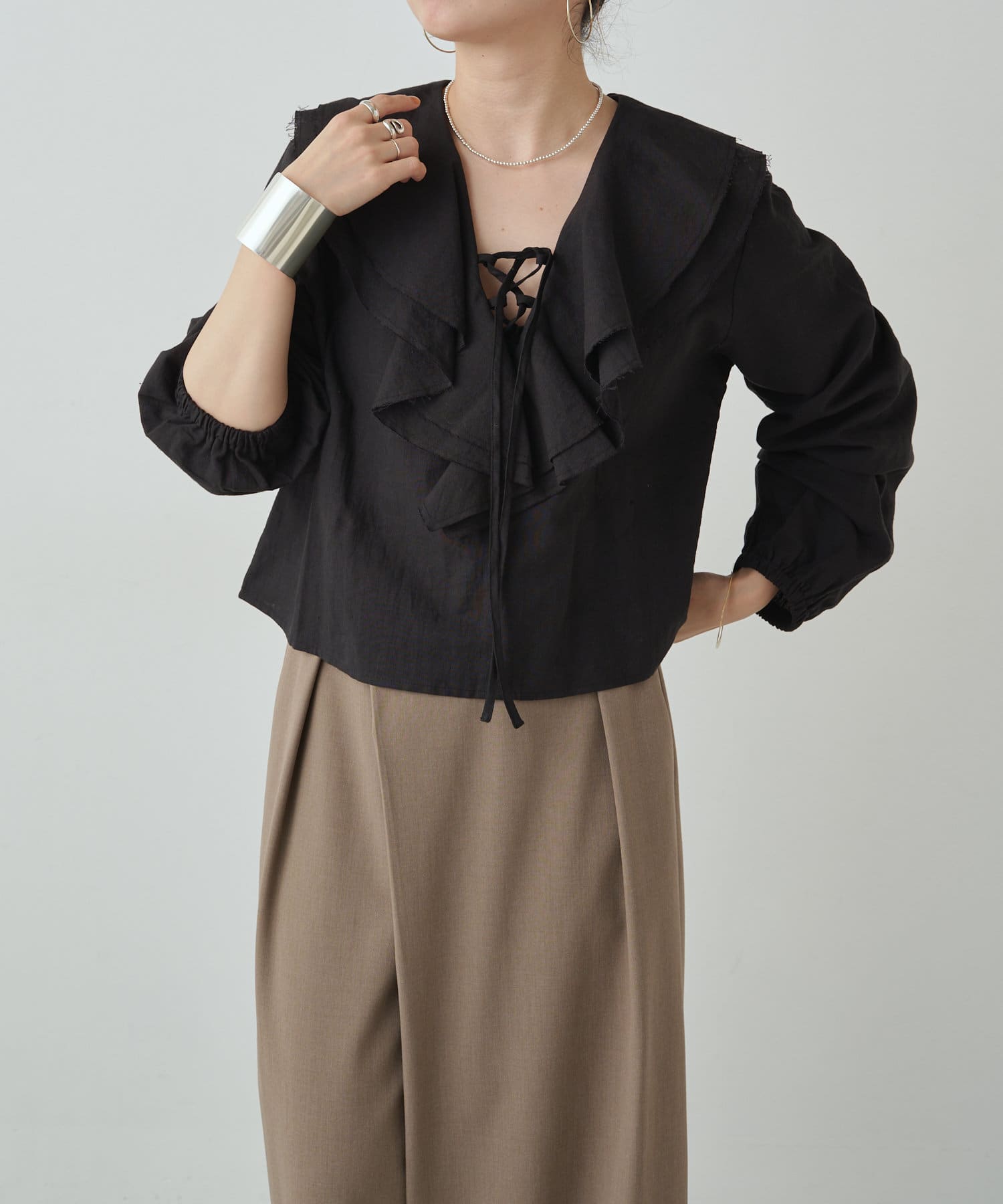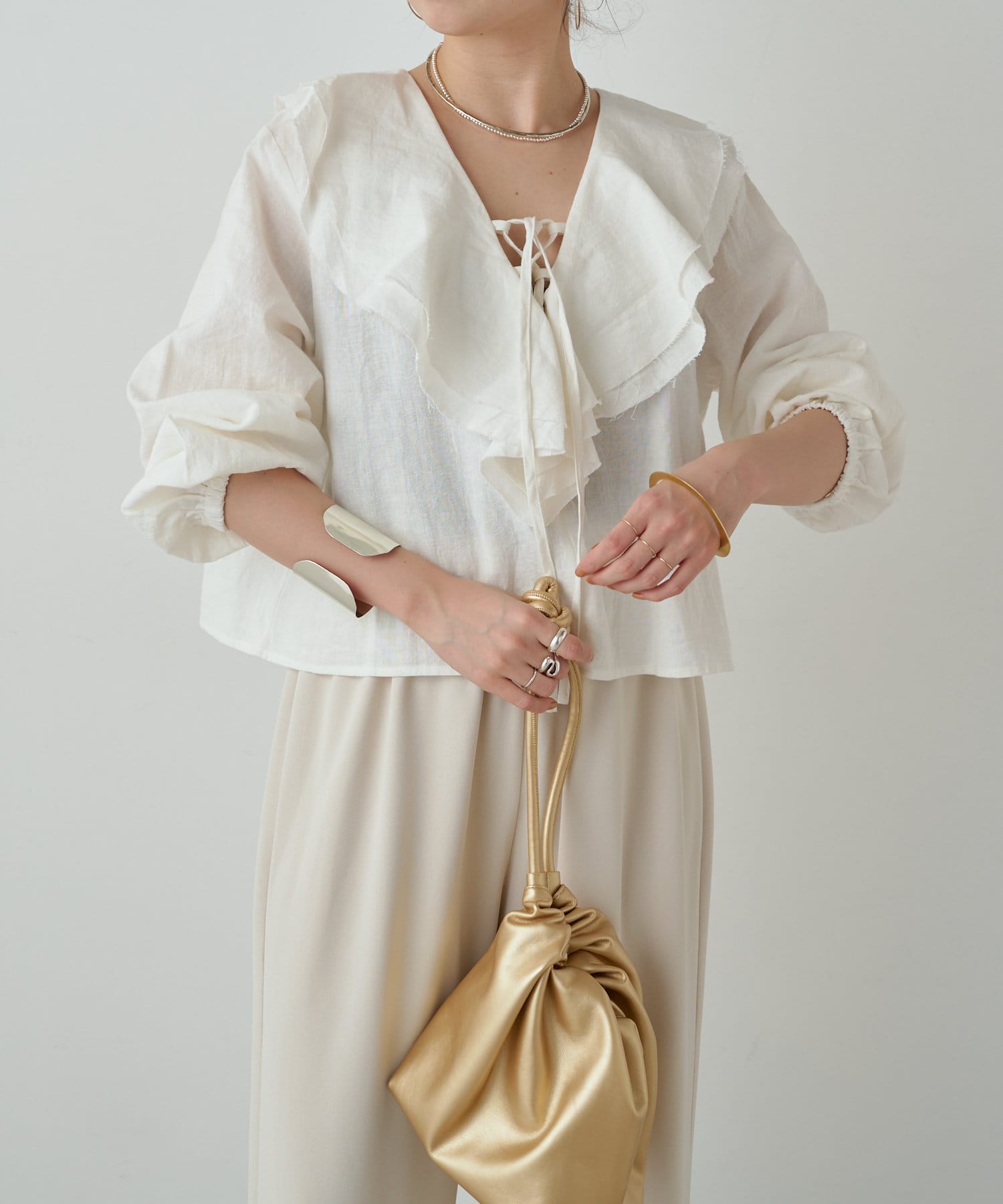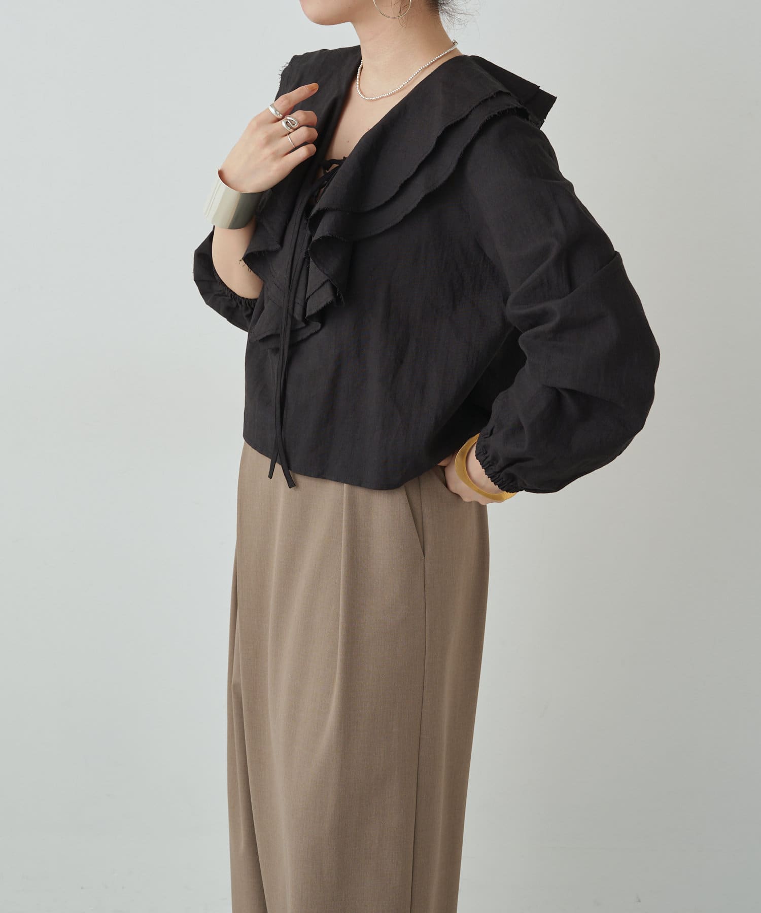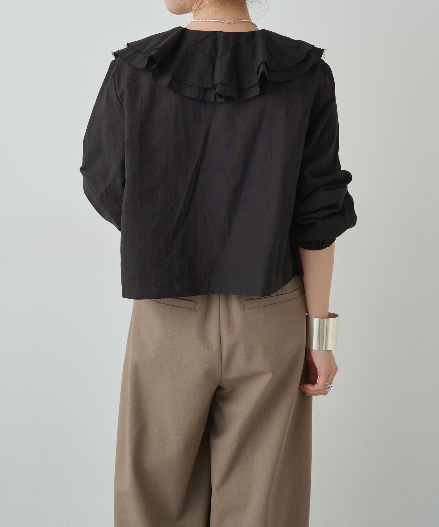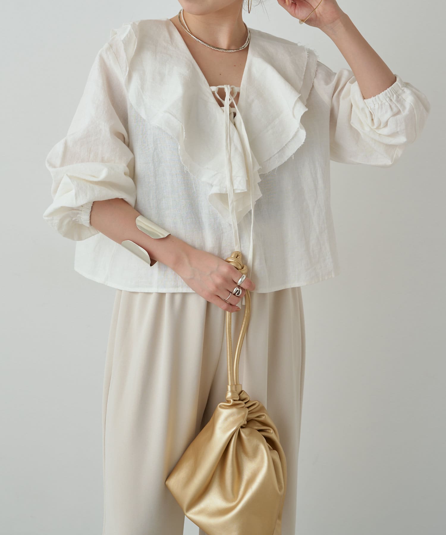・デコルテから肩にかけて広がるフリルのデザインで、一枚でコーディネートの主役になるブラウス◎