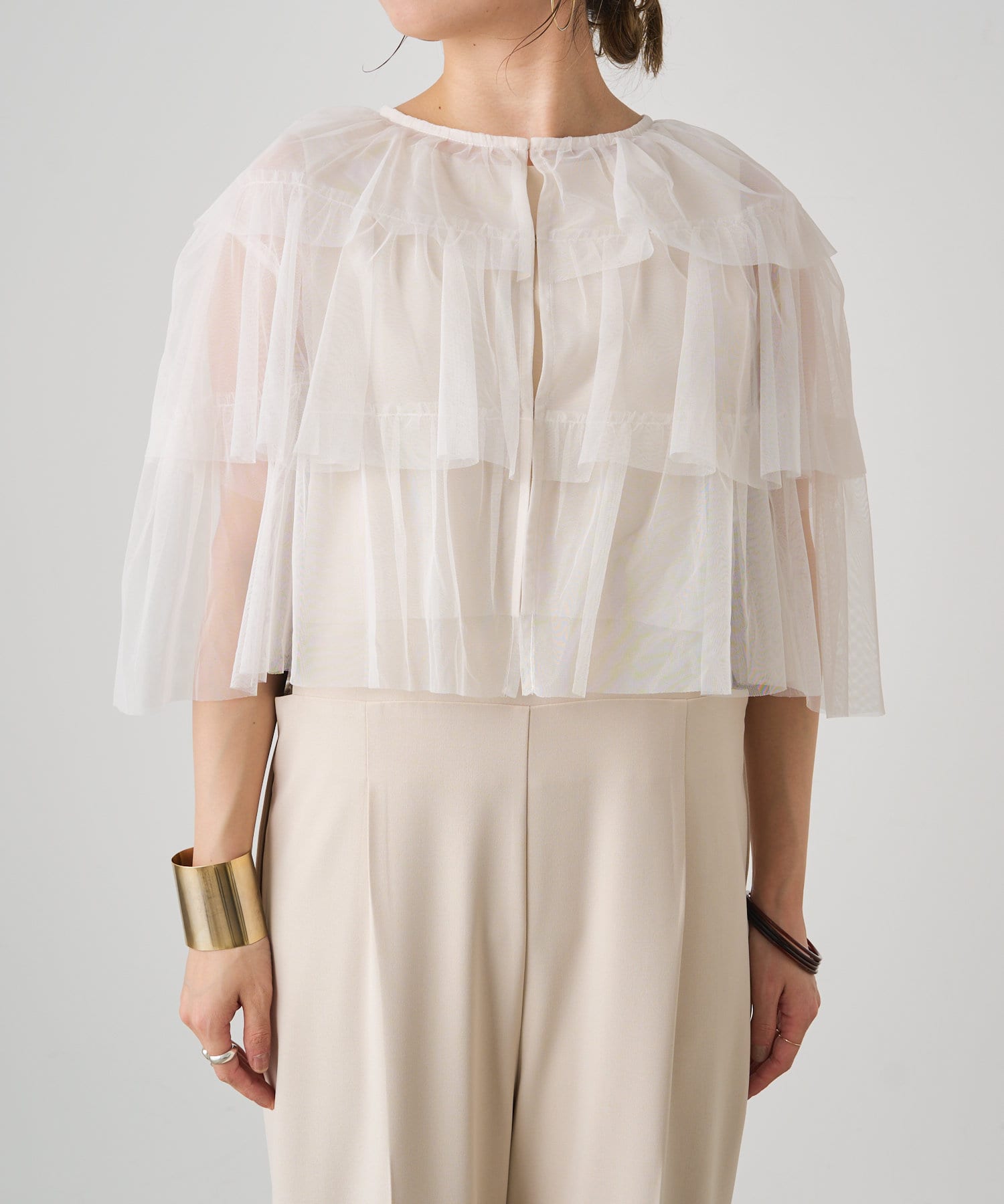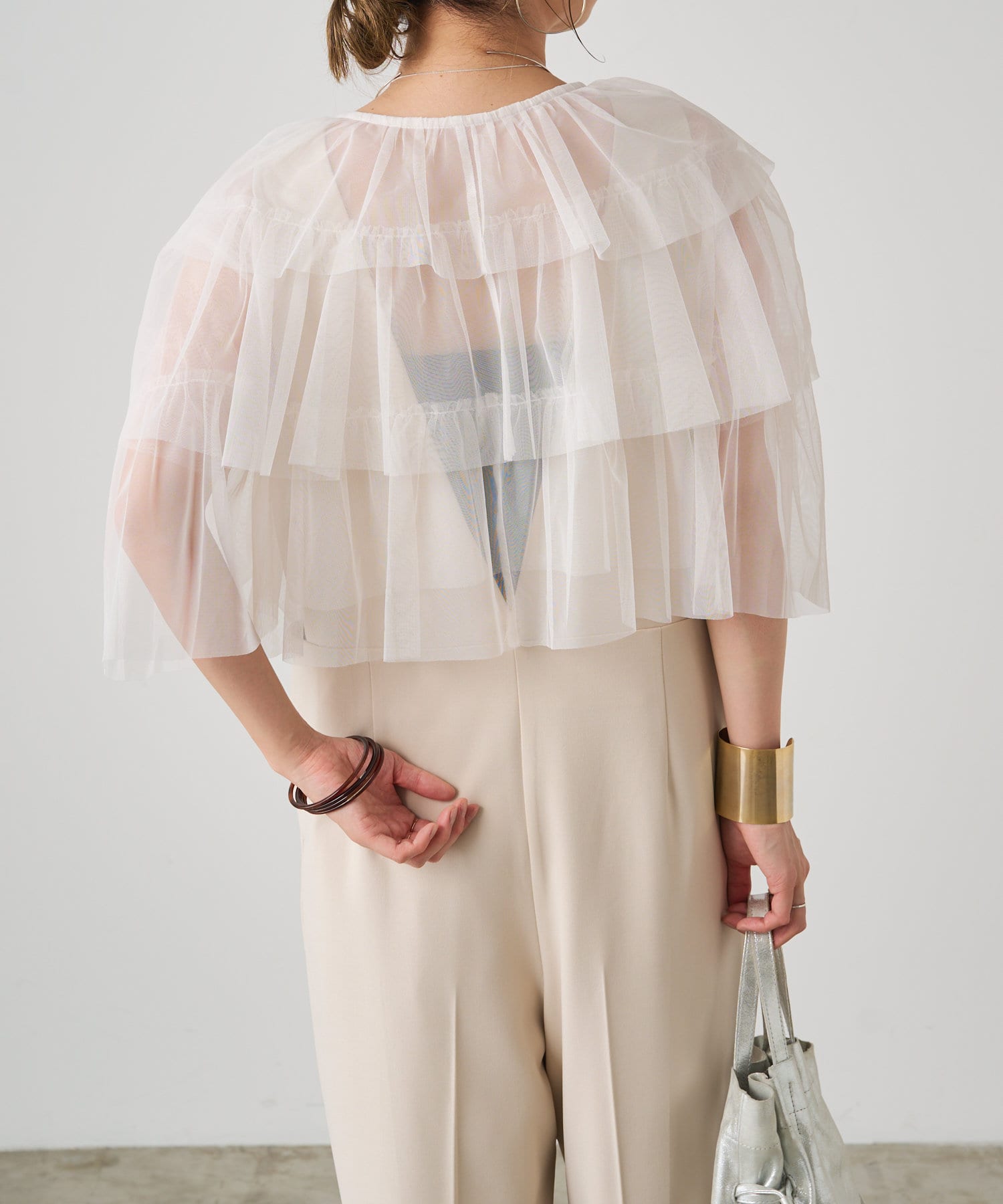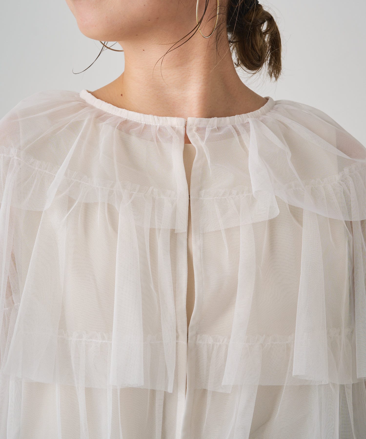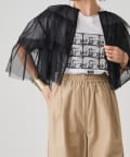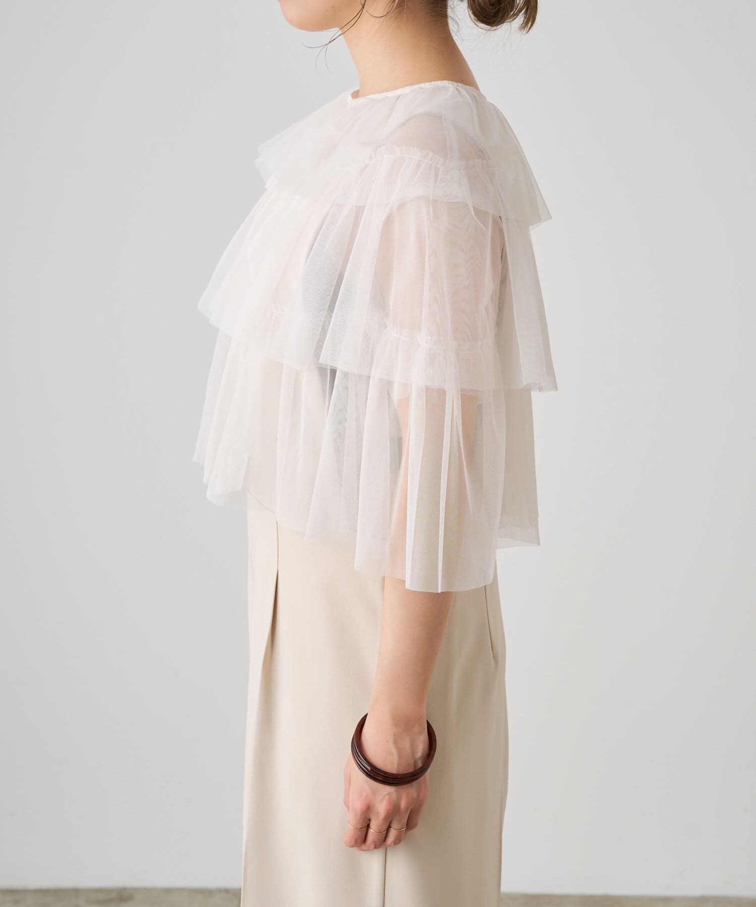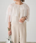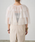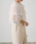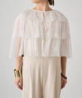・チュール素材が華やかで女性らしいティアードブラウス。着用するだけで存在感のあるアイテム。