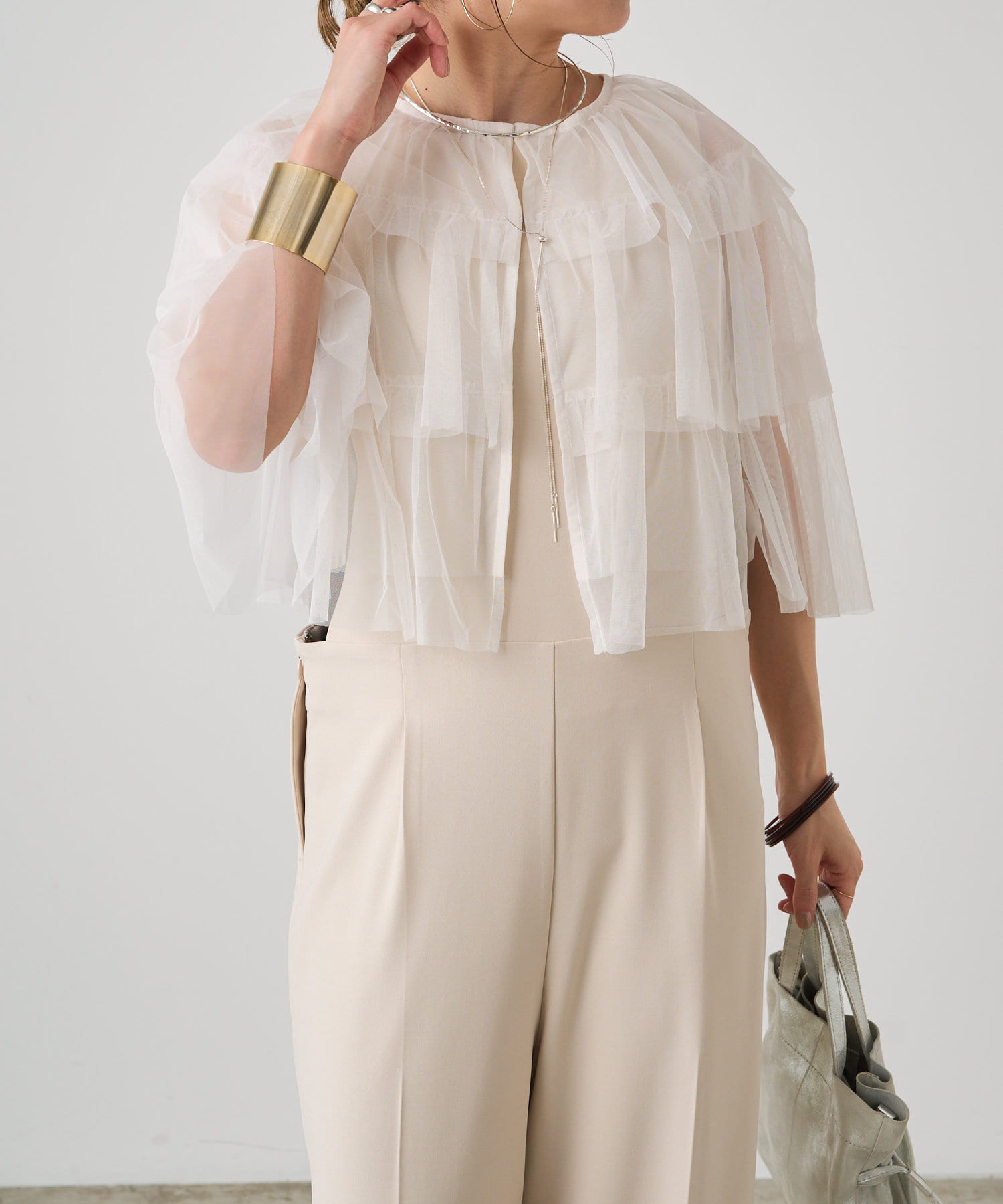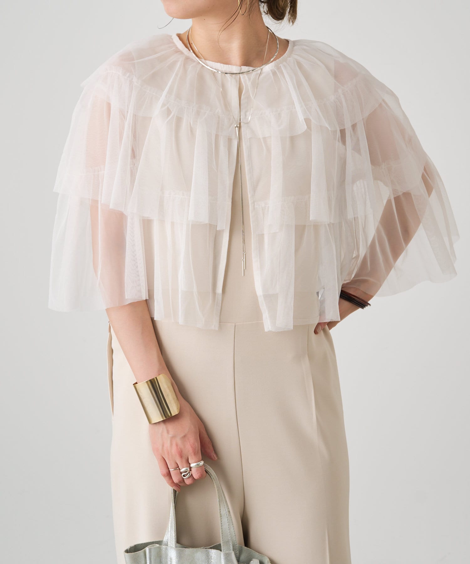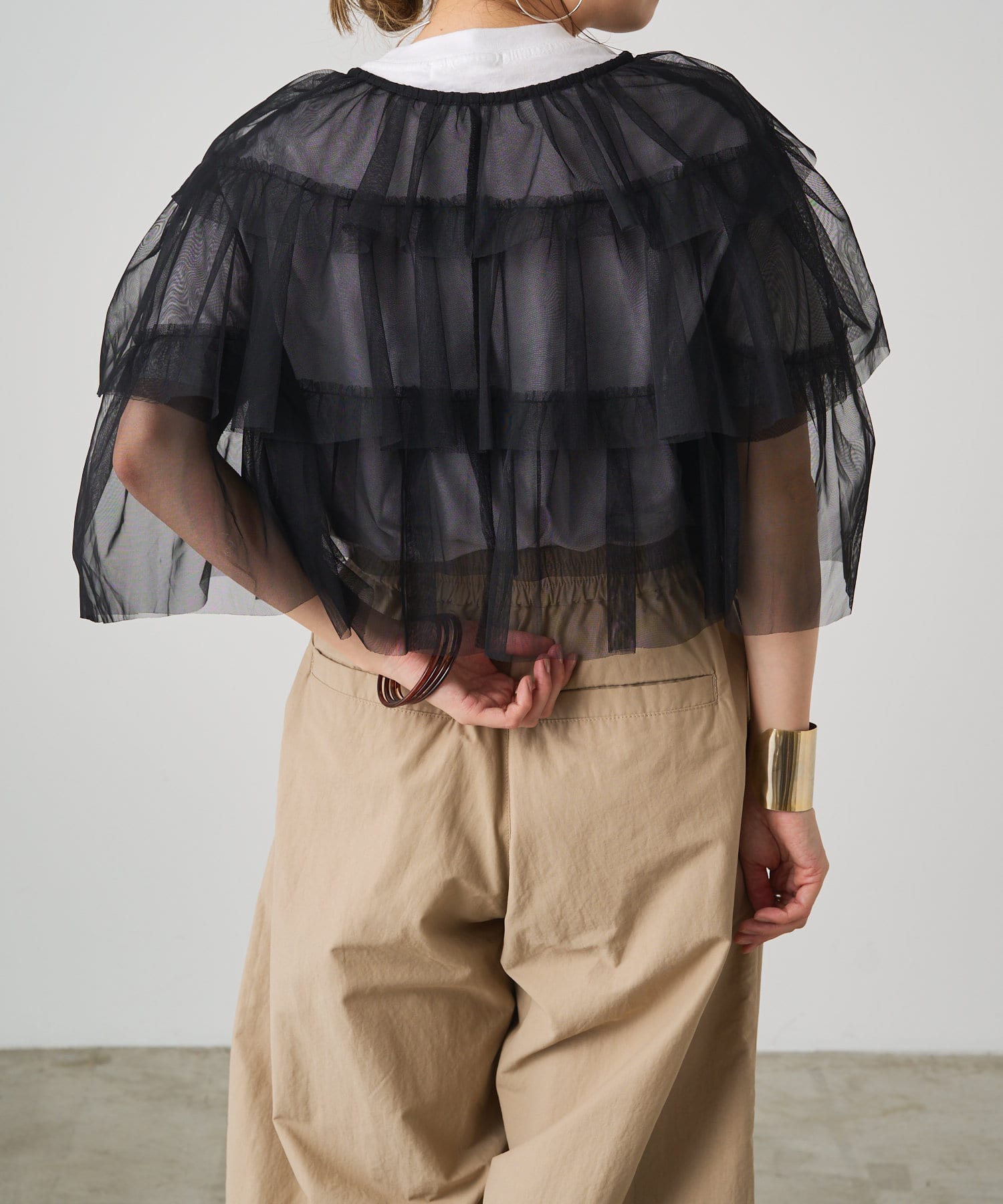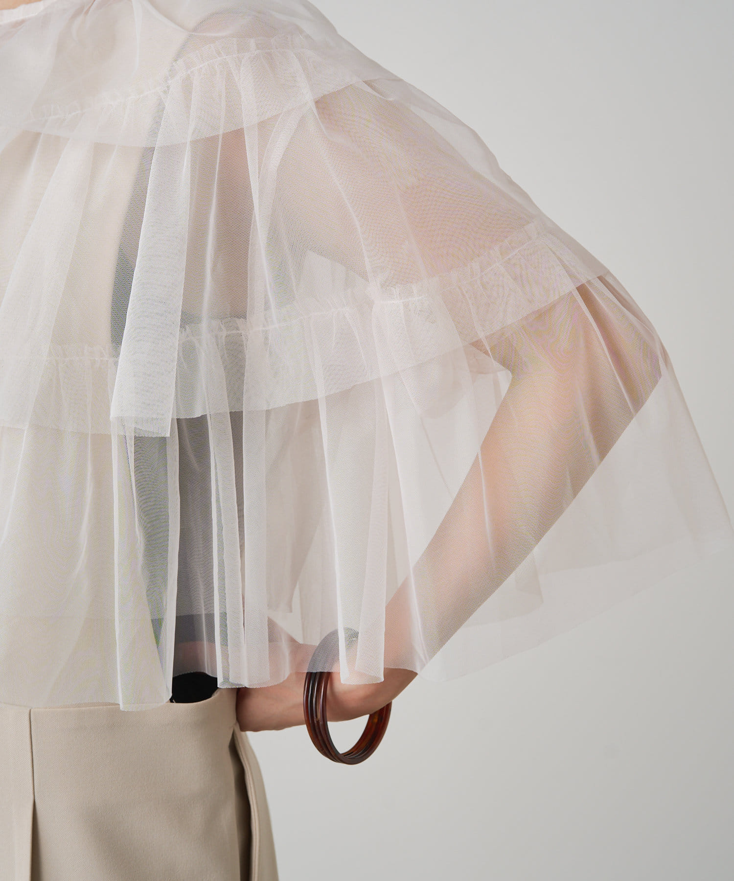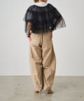・チュール素材が華やかで女性らしいティアードブラウス。着用するだけで存在感のあるアイテム。
