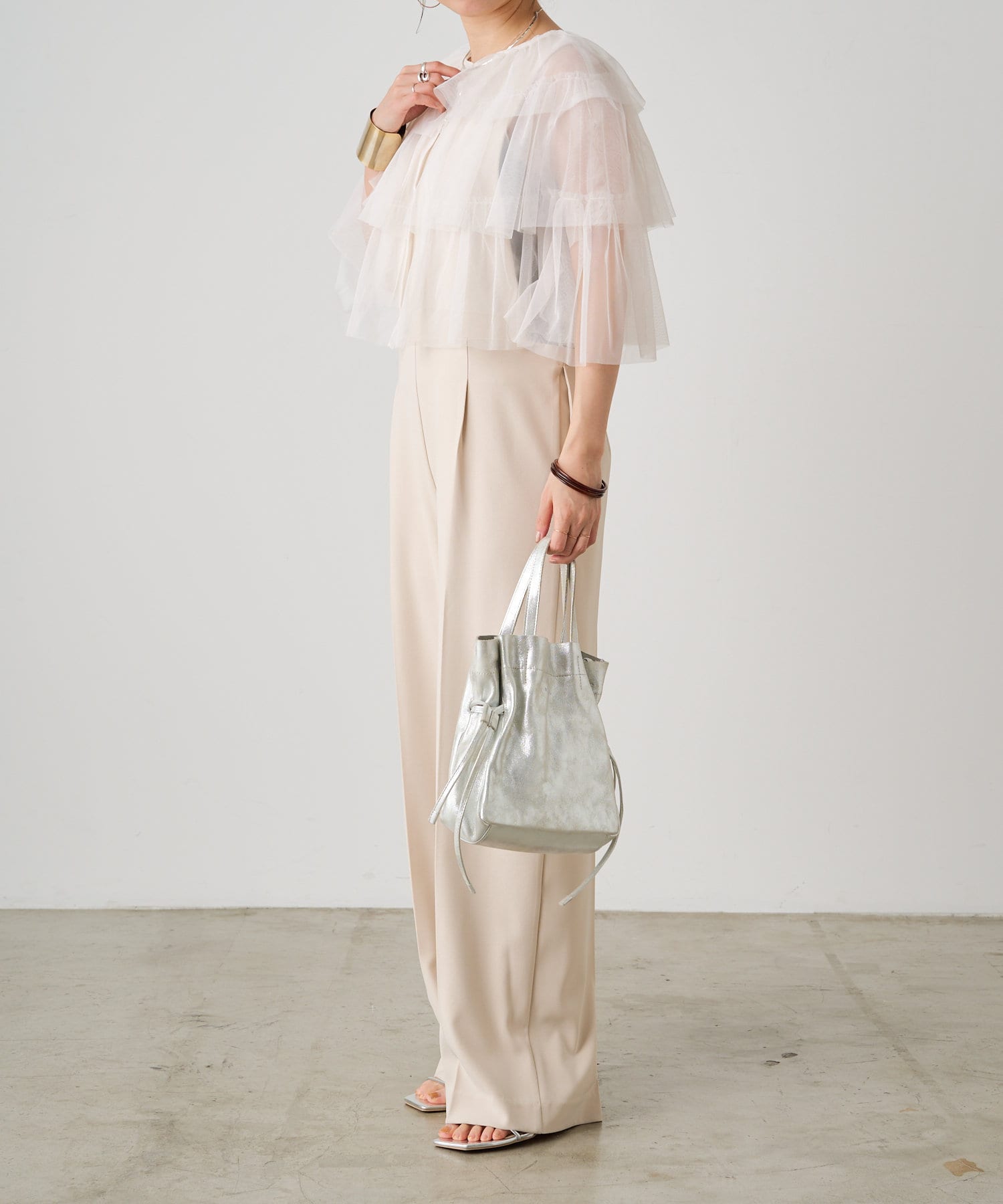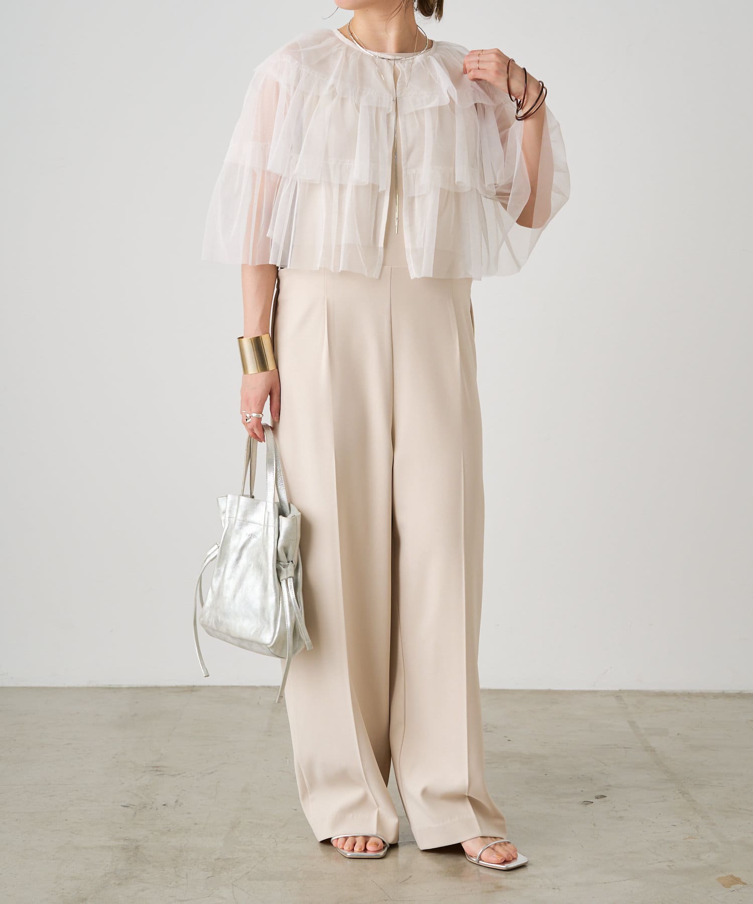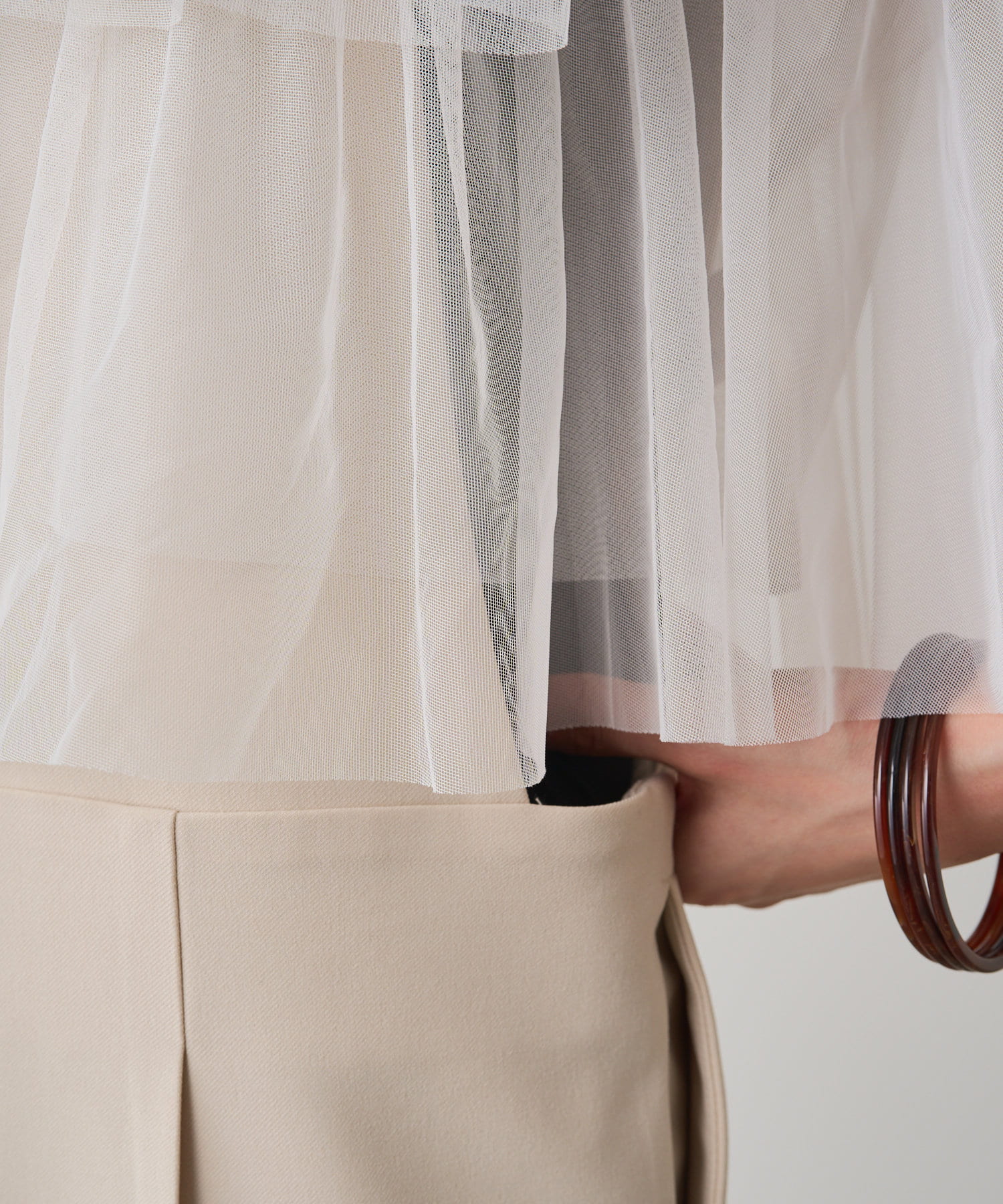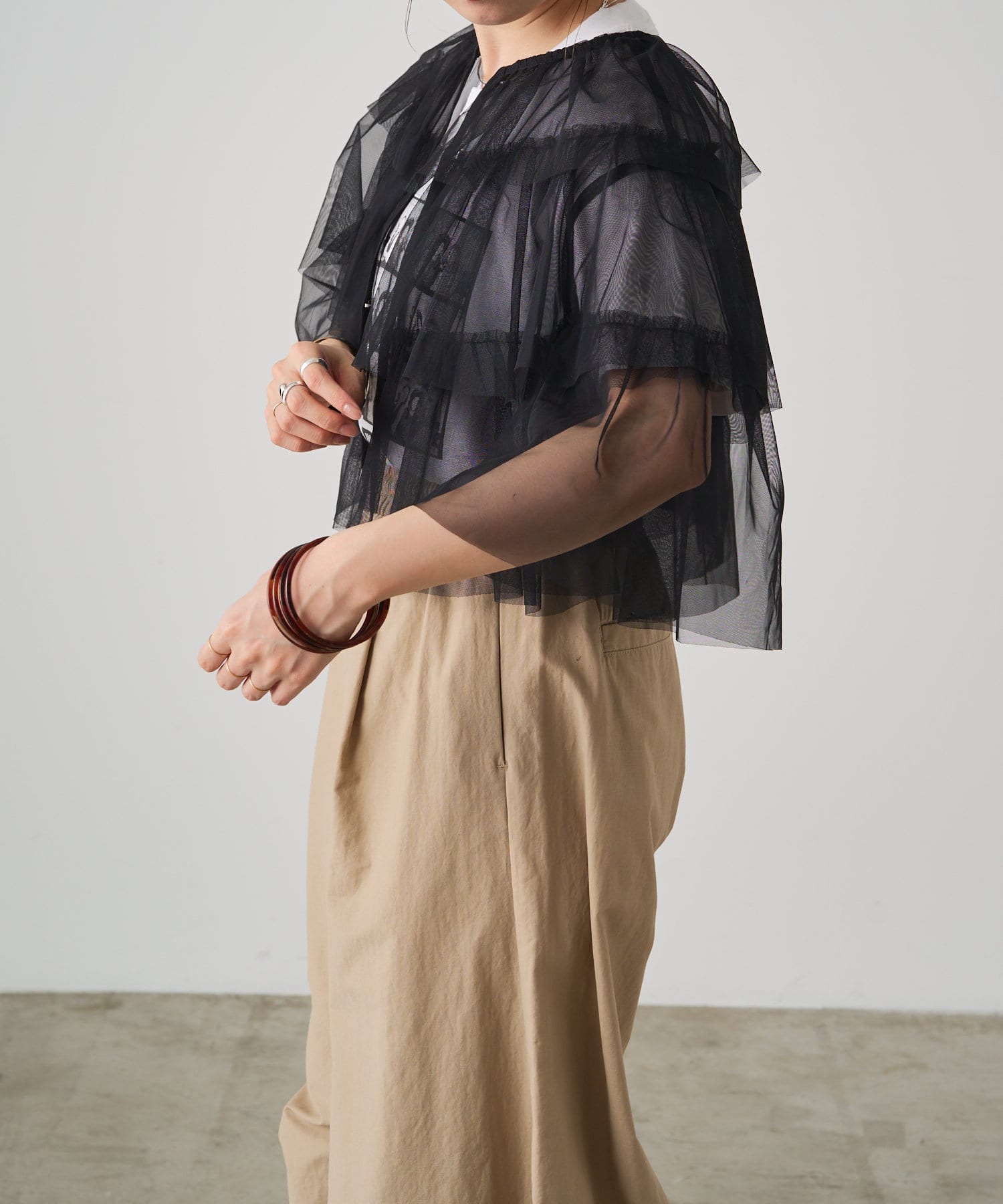 ・チュール素材が華やかで女性らしいティアードブラウス。着用するだけで存在感のあるアイテム。