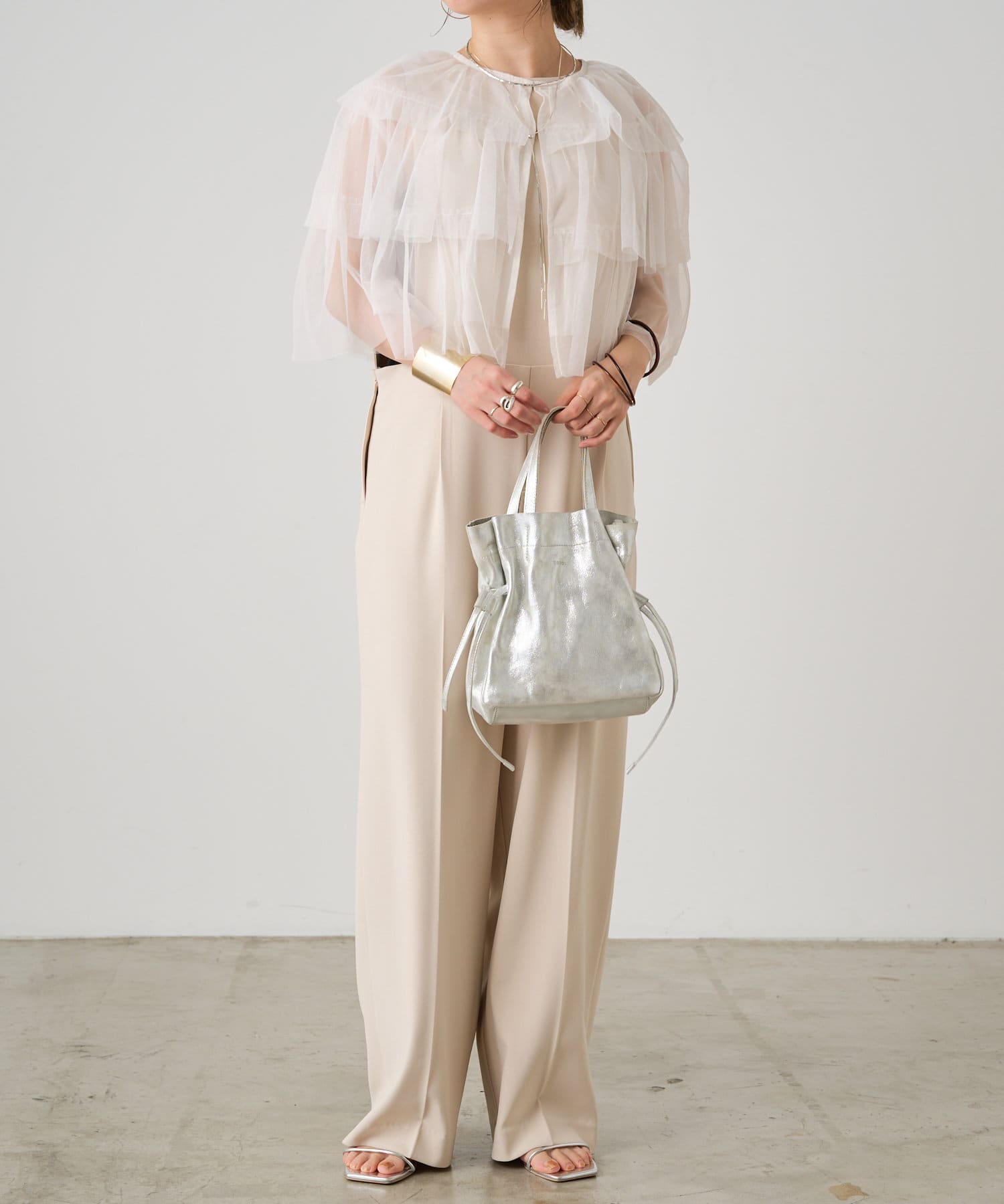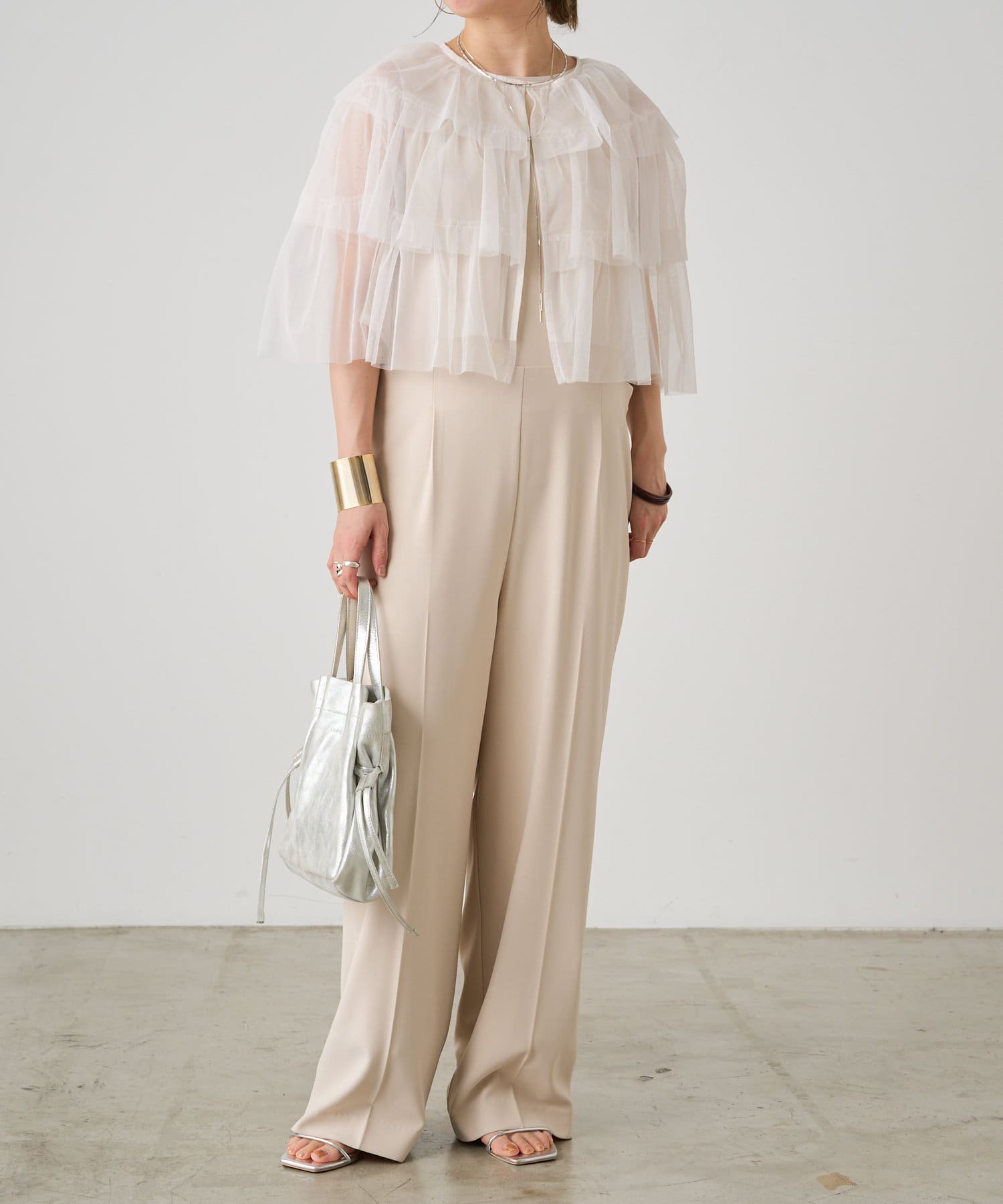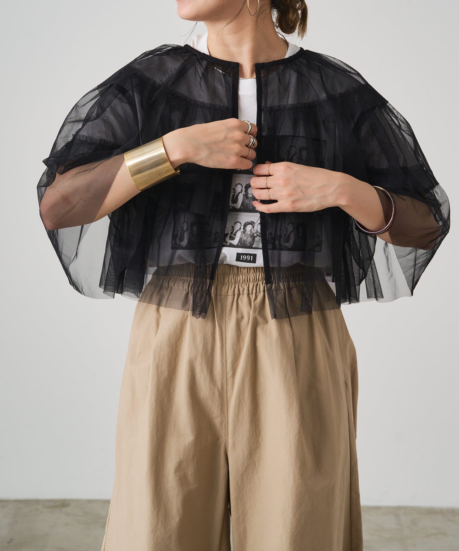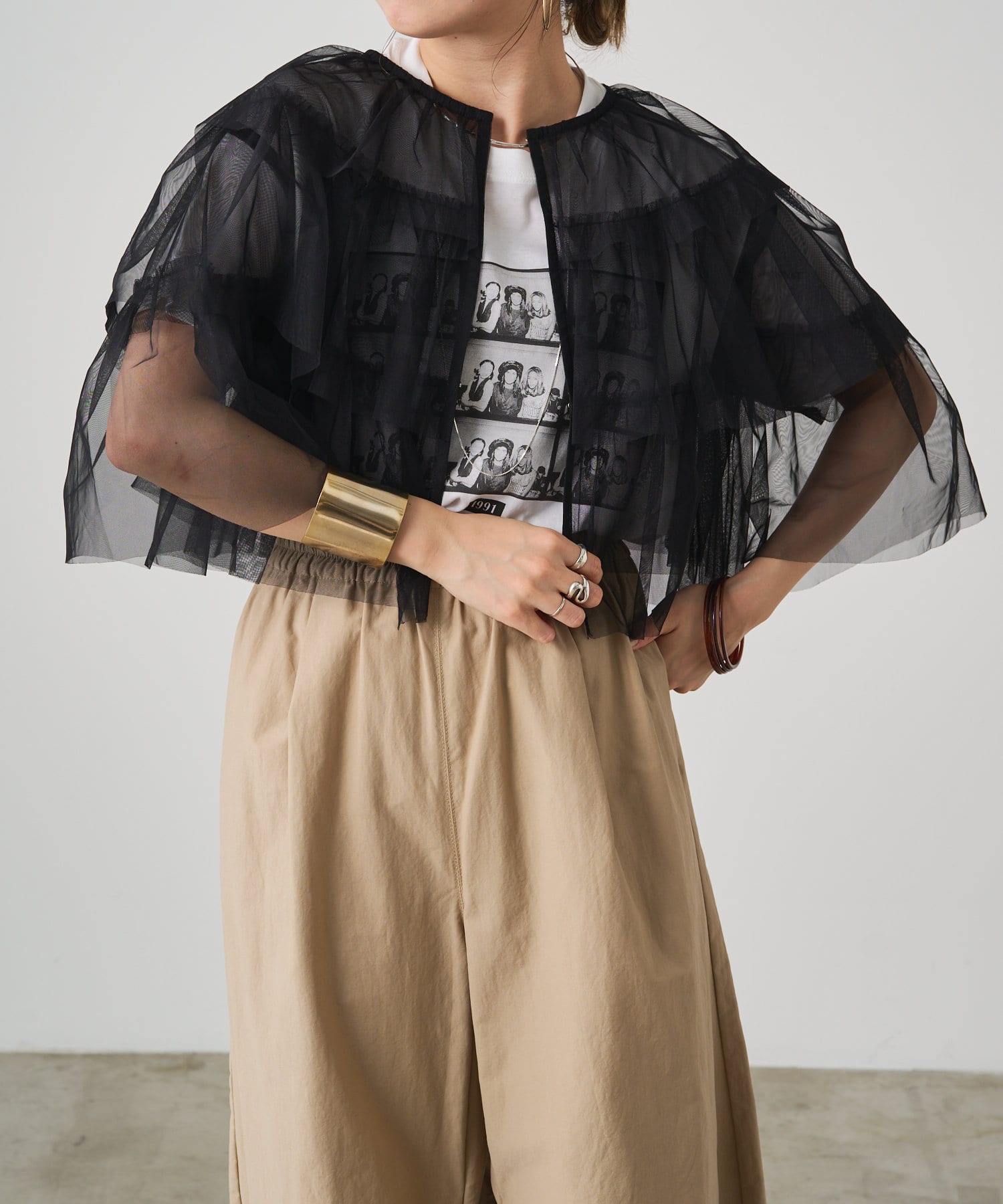 ・チュール素材が華やかで女性らしいティアードブラウス。着用するだけで存在感のあるアイテム。
