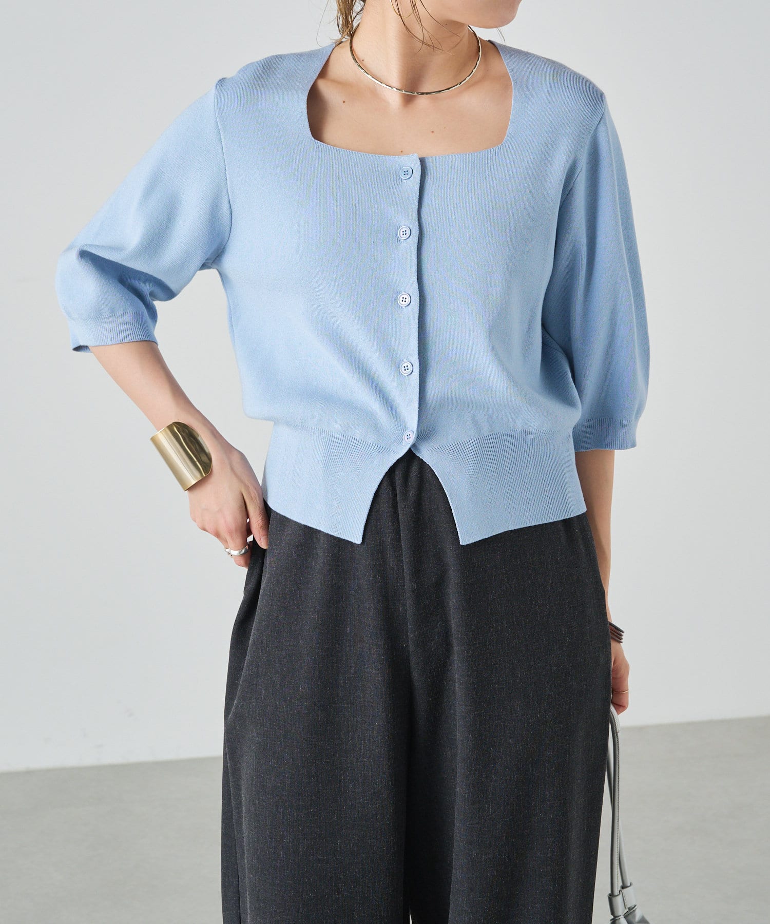 ・女性らしいスクエアネックのデザインと、フロントのボタンデザインで1枚で気映えしてくれます◎