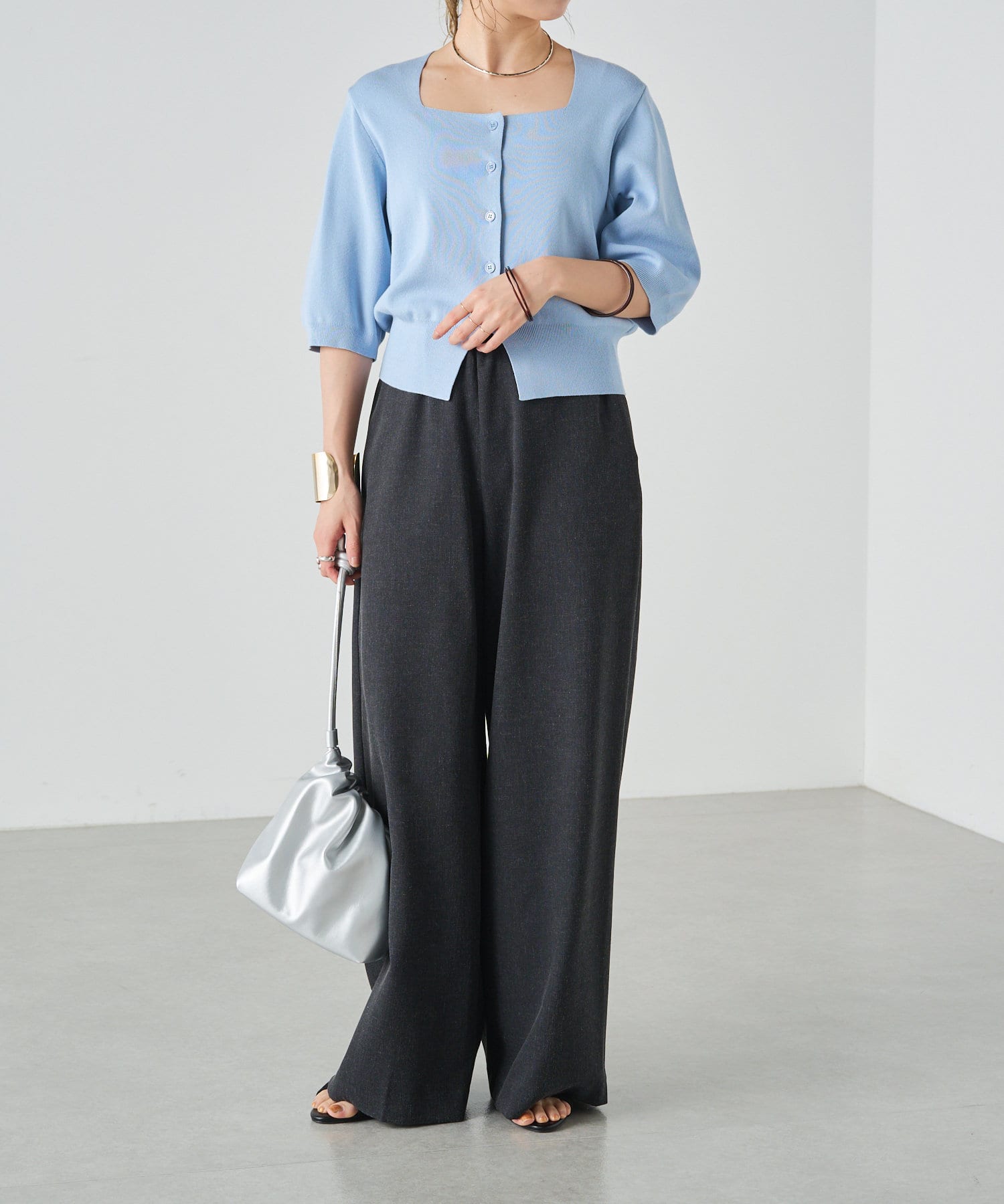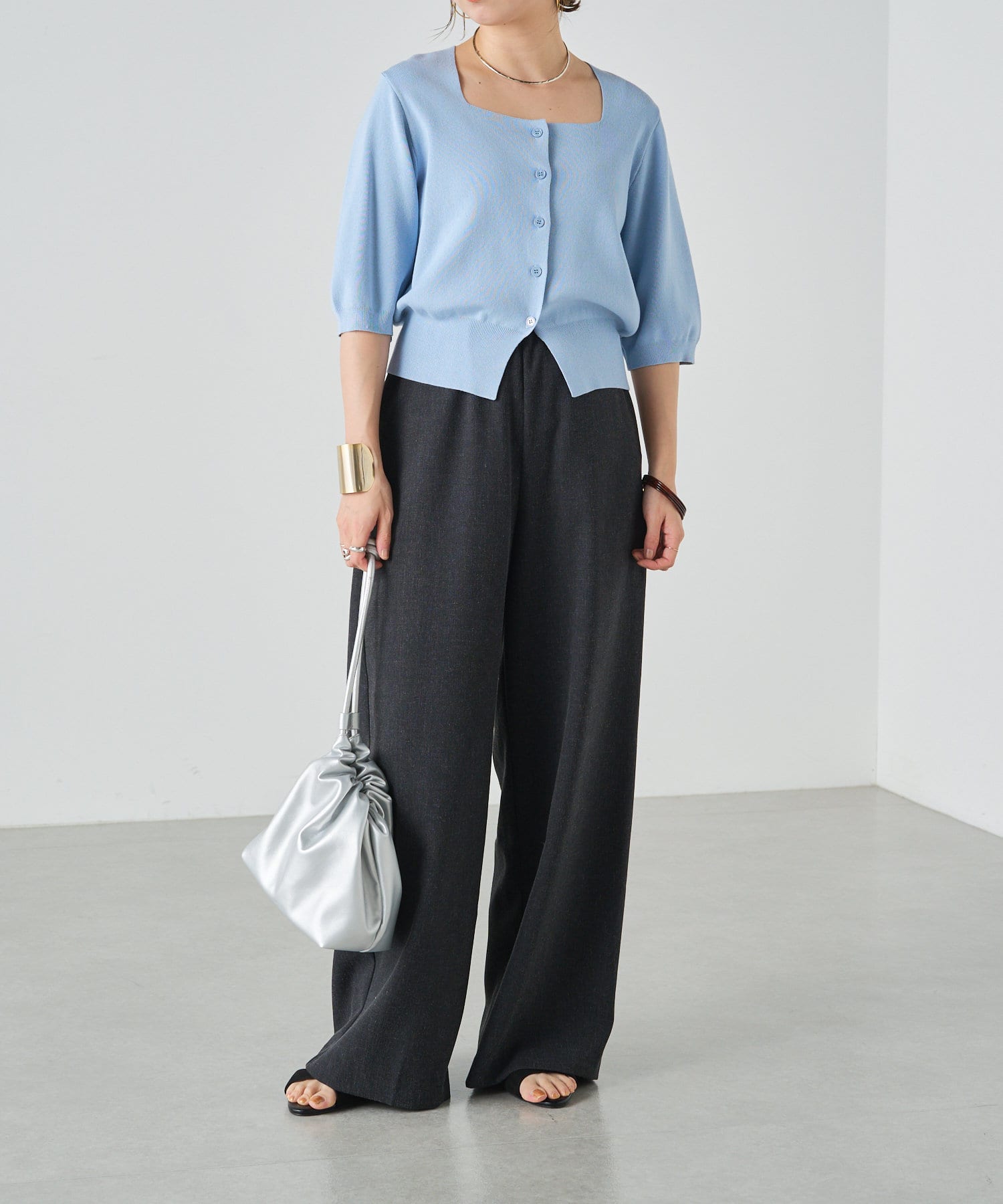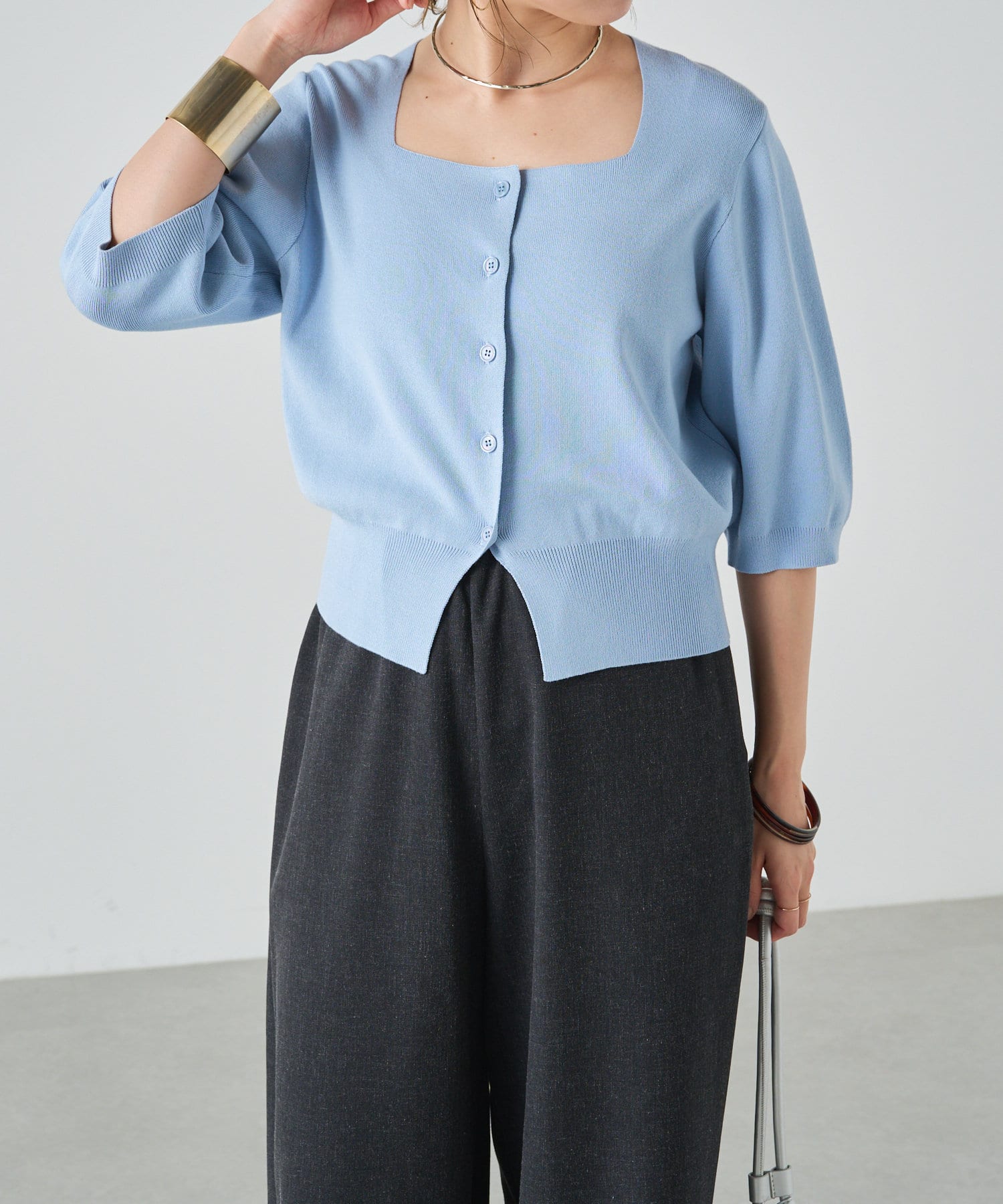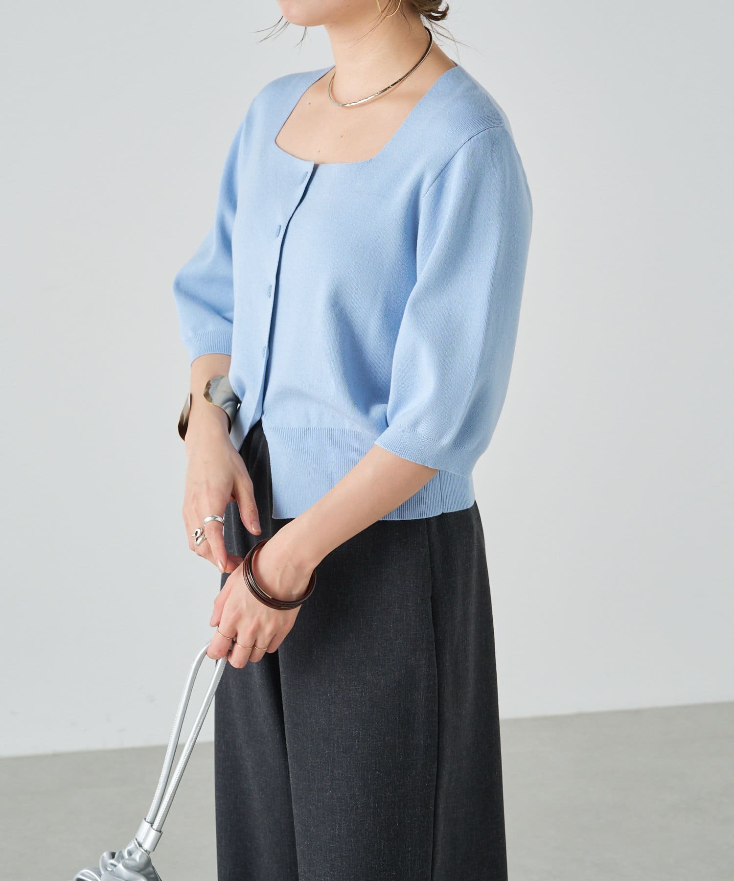 スクエアネックが女性らしい印象のカーディガン