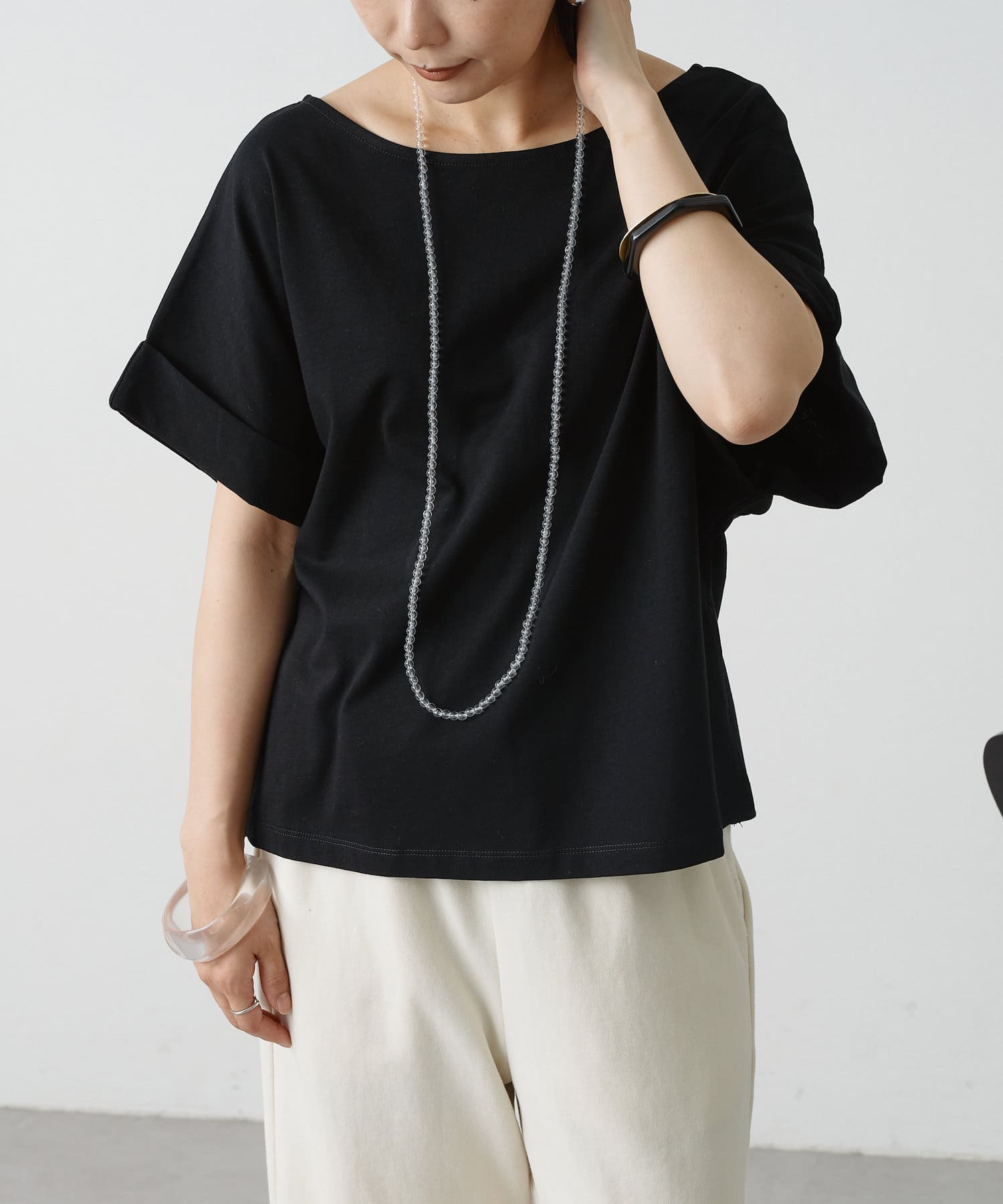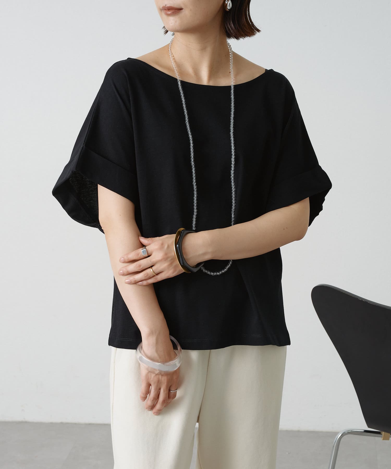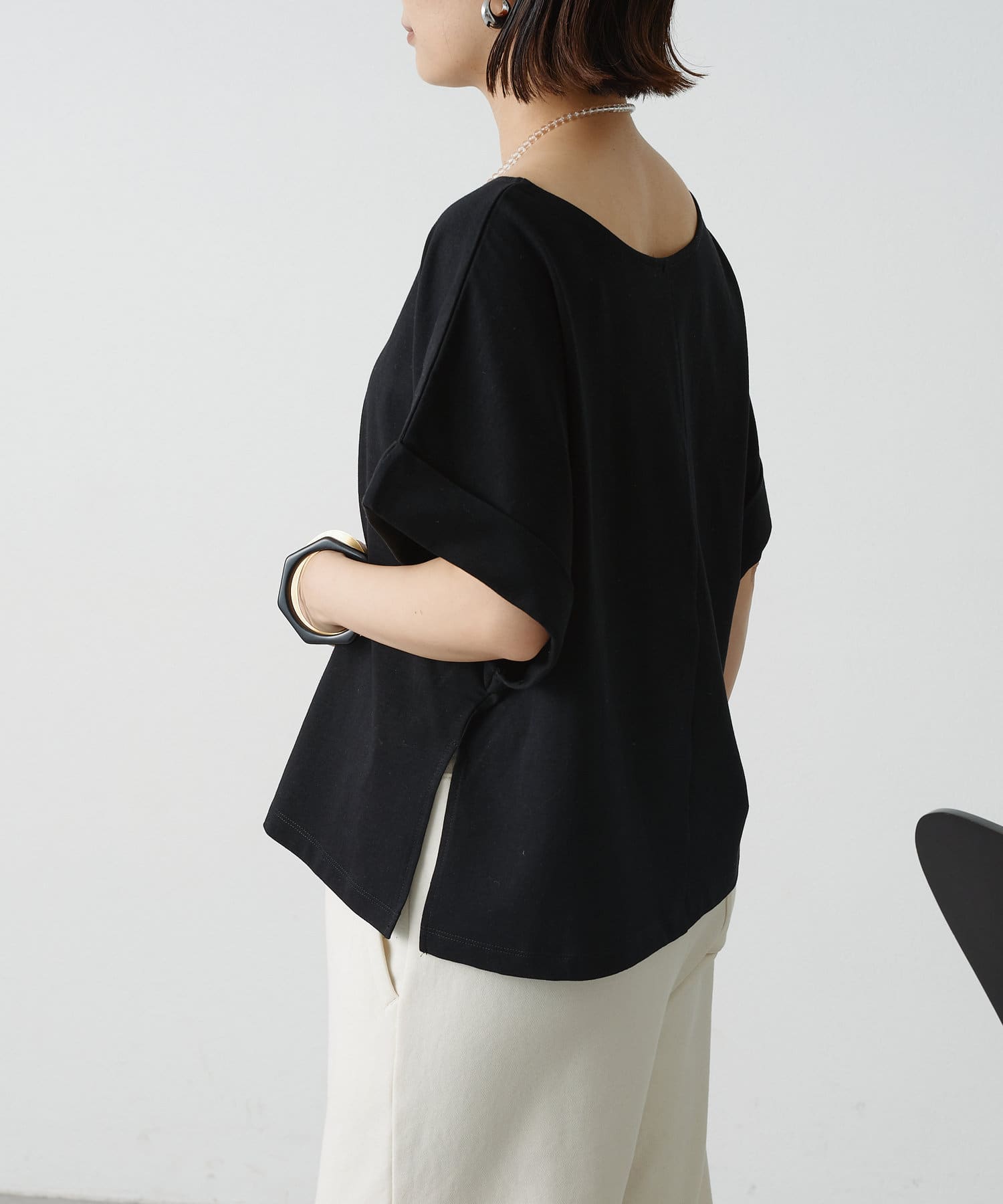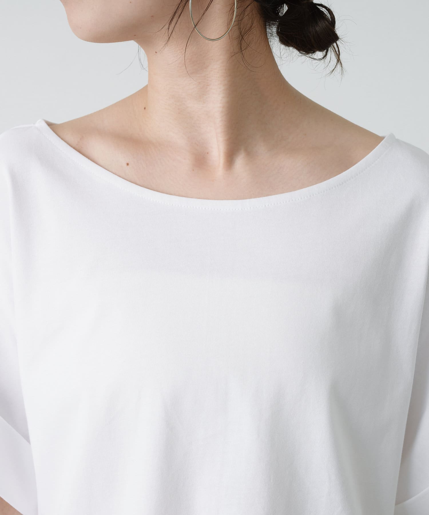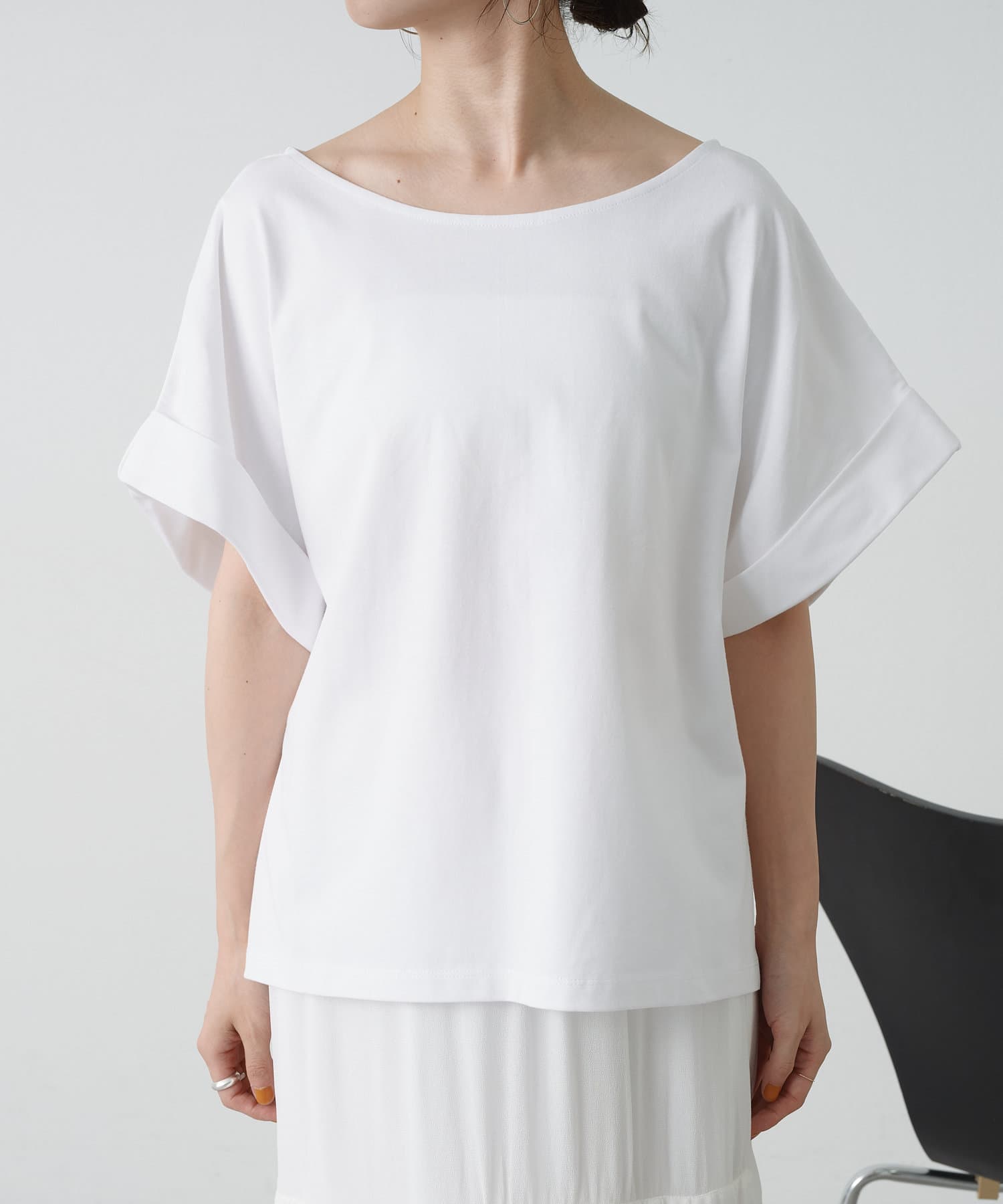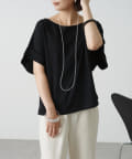 シンプルながら華奢見えの叶うドルマンカットソー