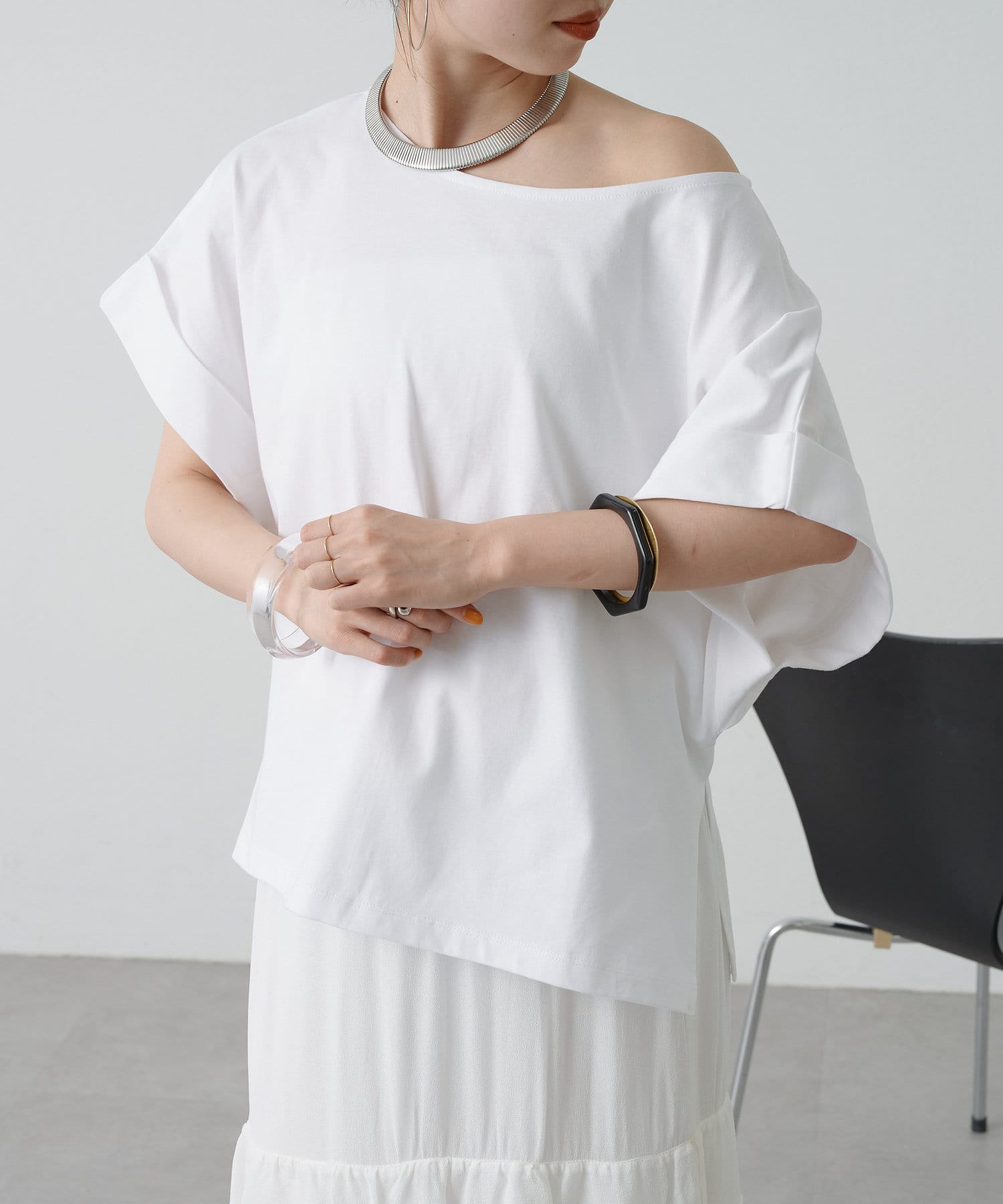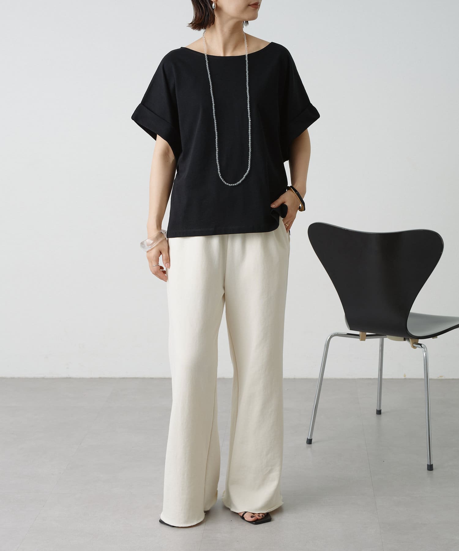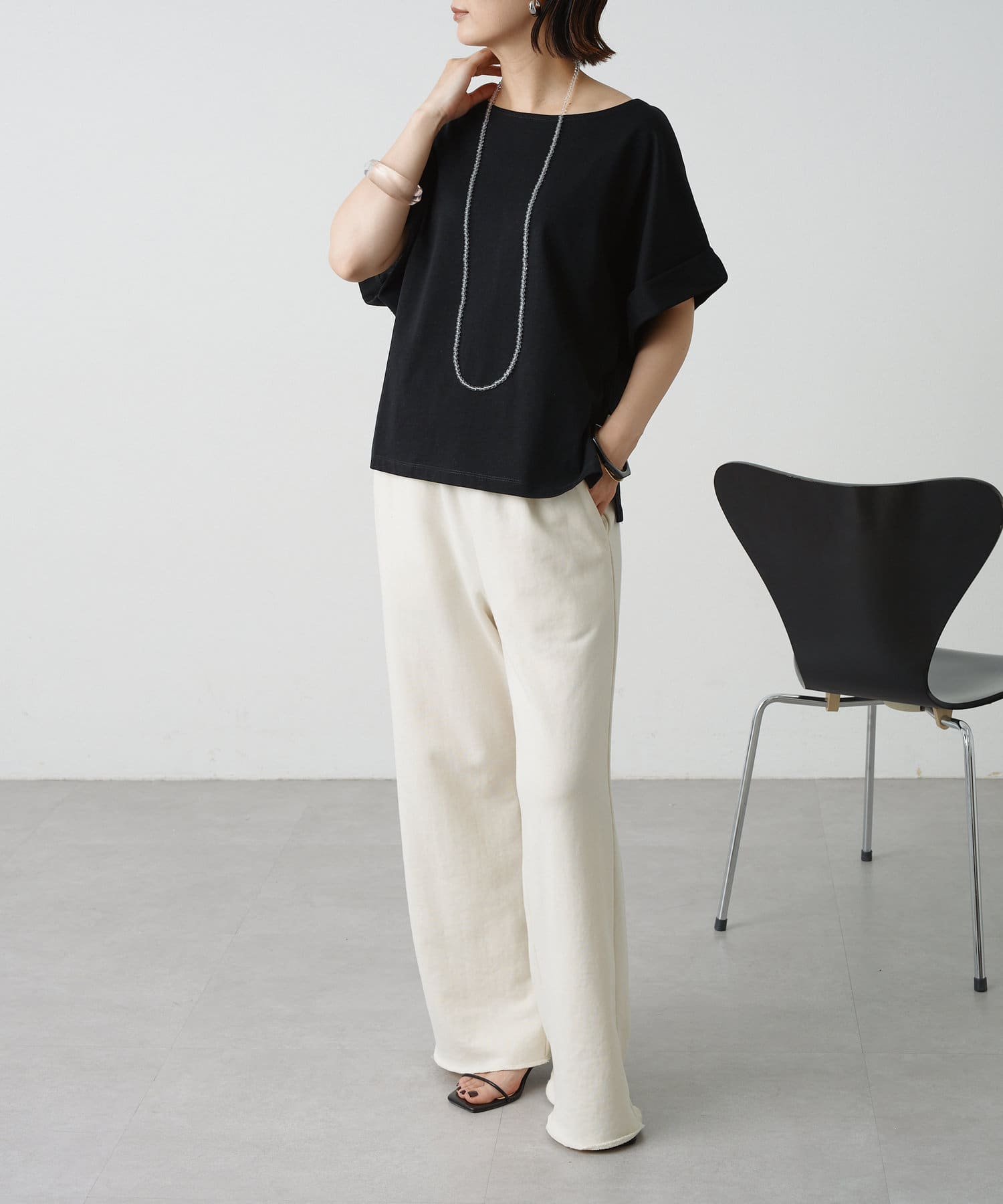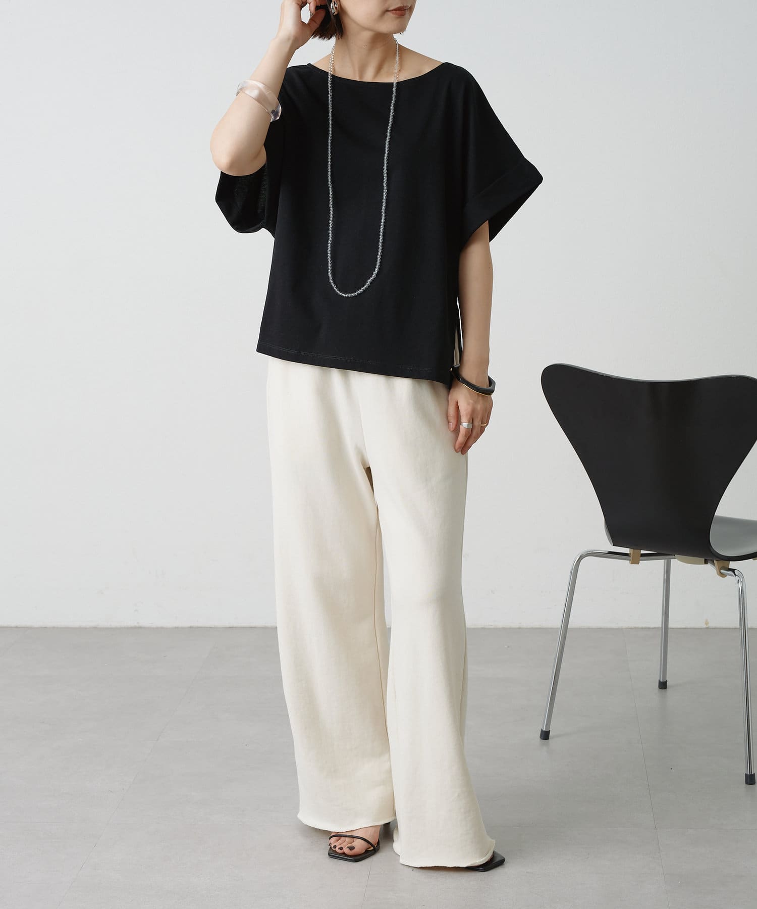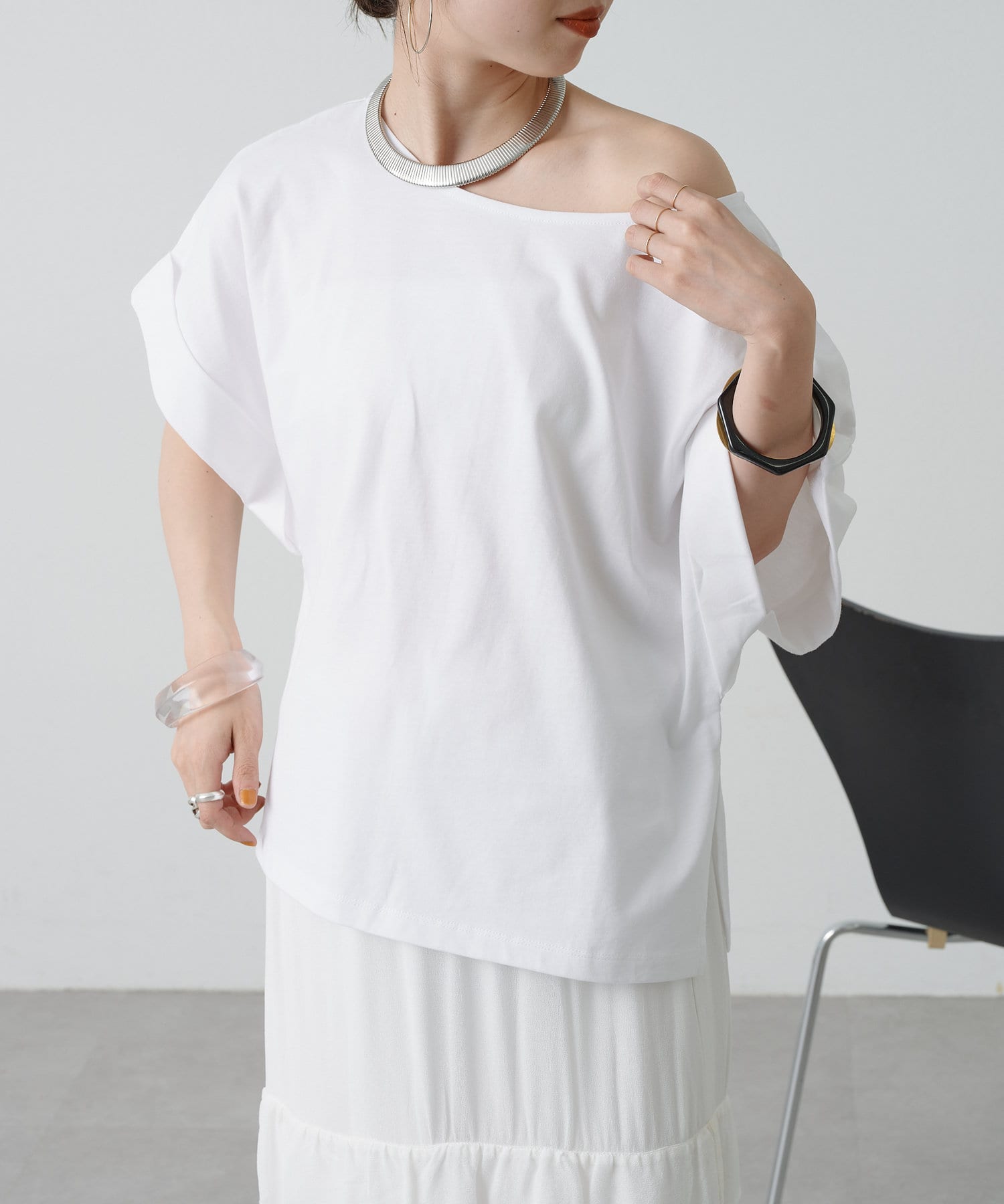 シンプルながら華奢見えの叶うドルマンカットソー