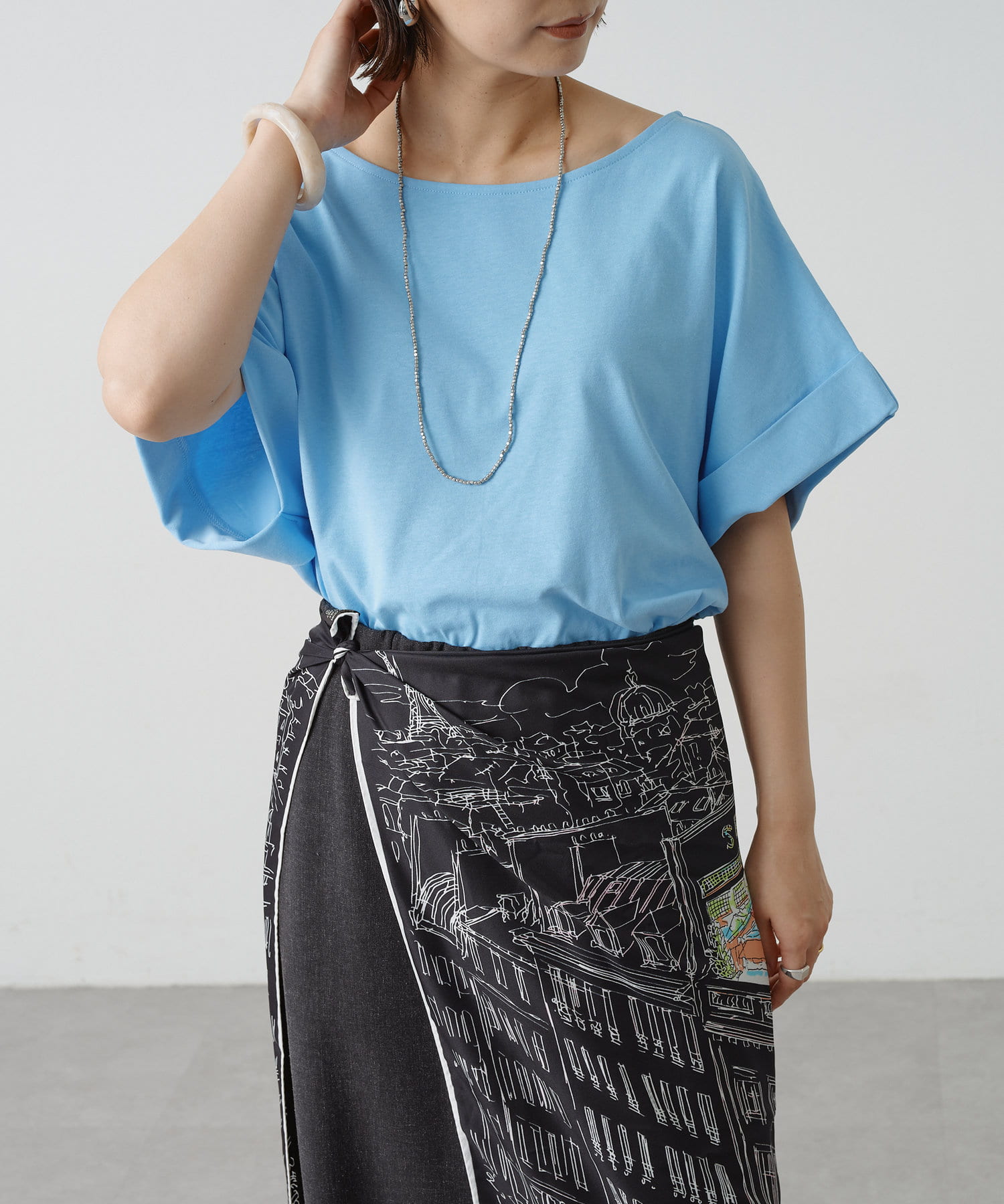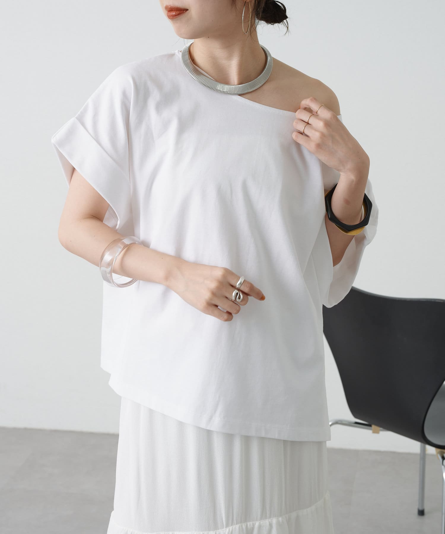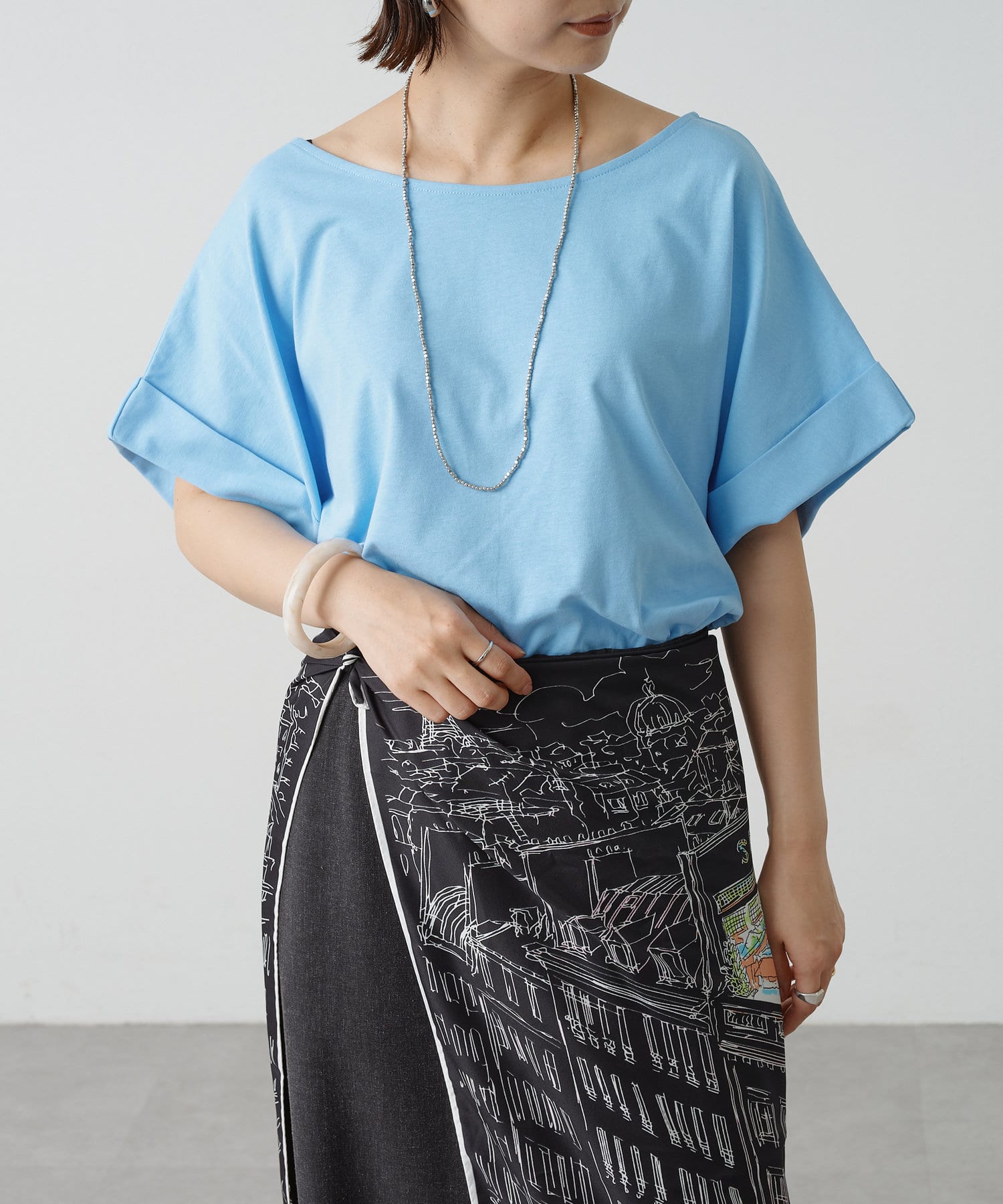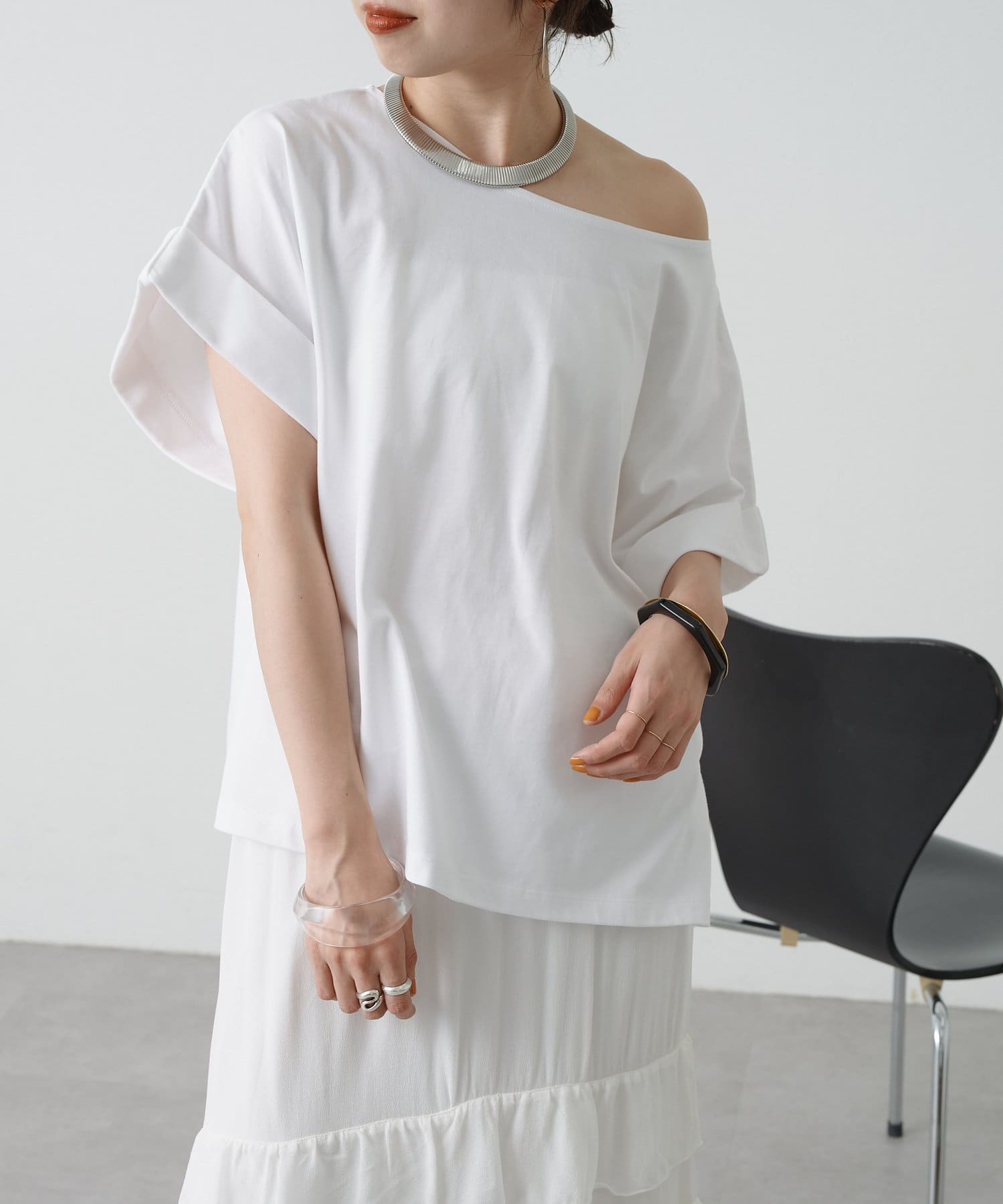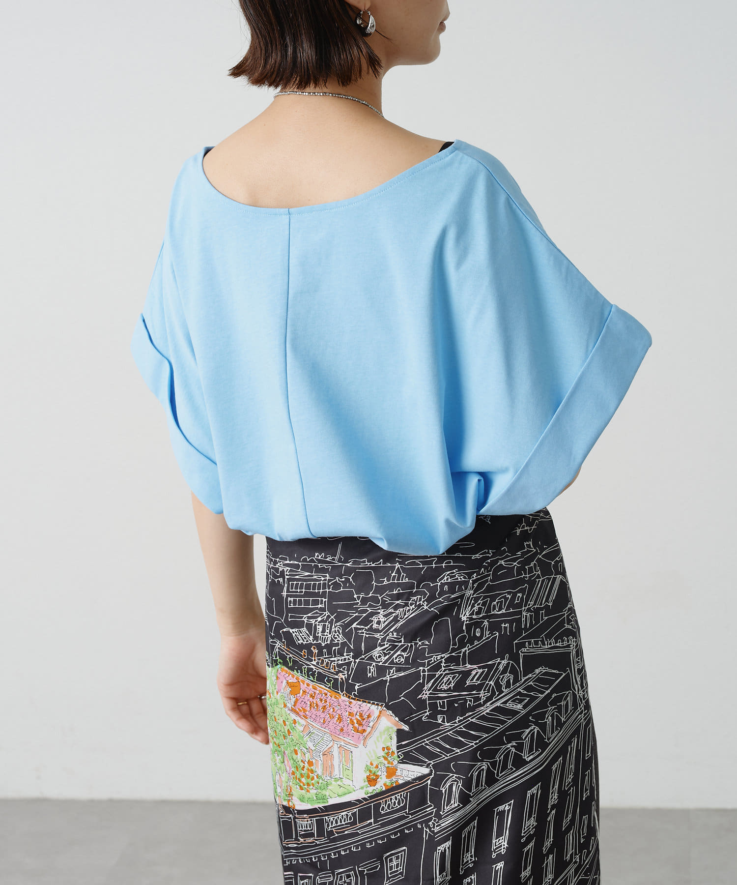 シンプルながら華奢見えの叶うドルマンカットソー