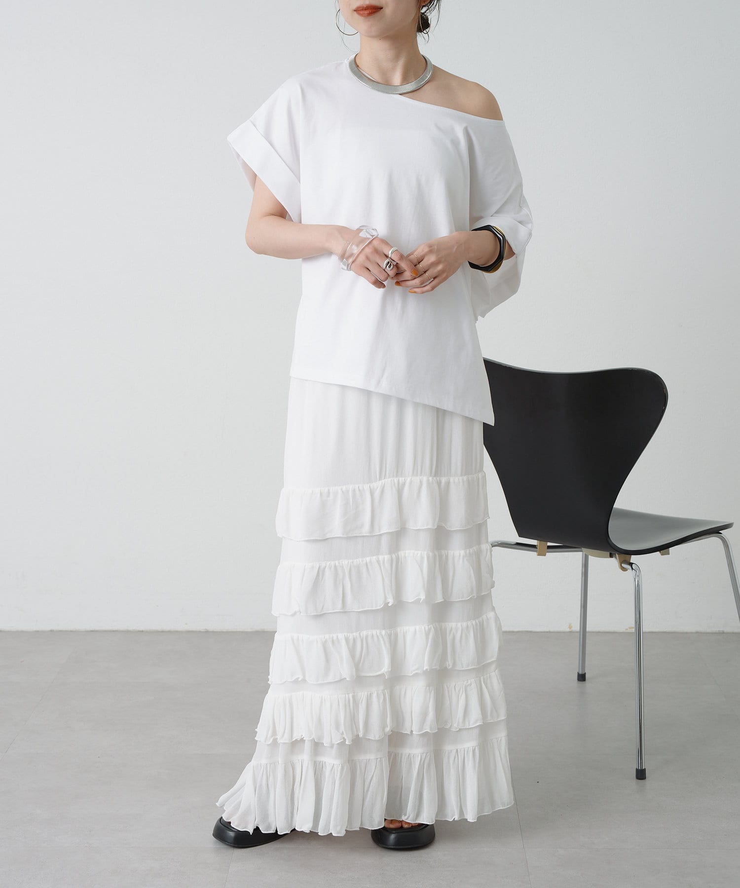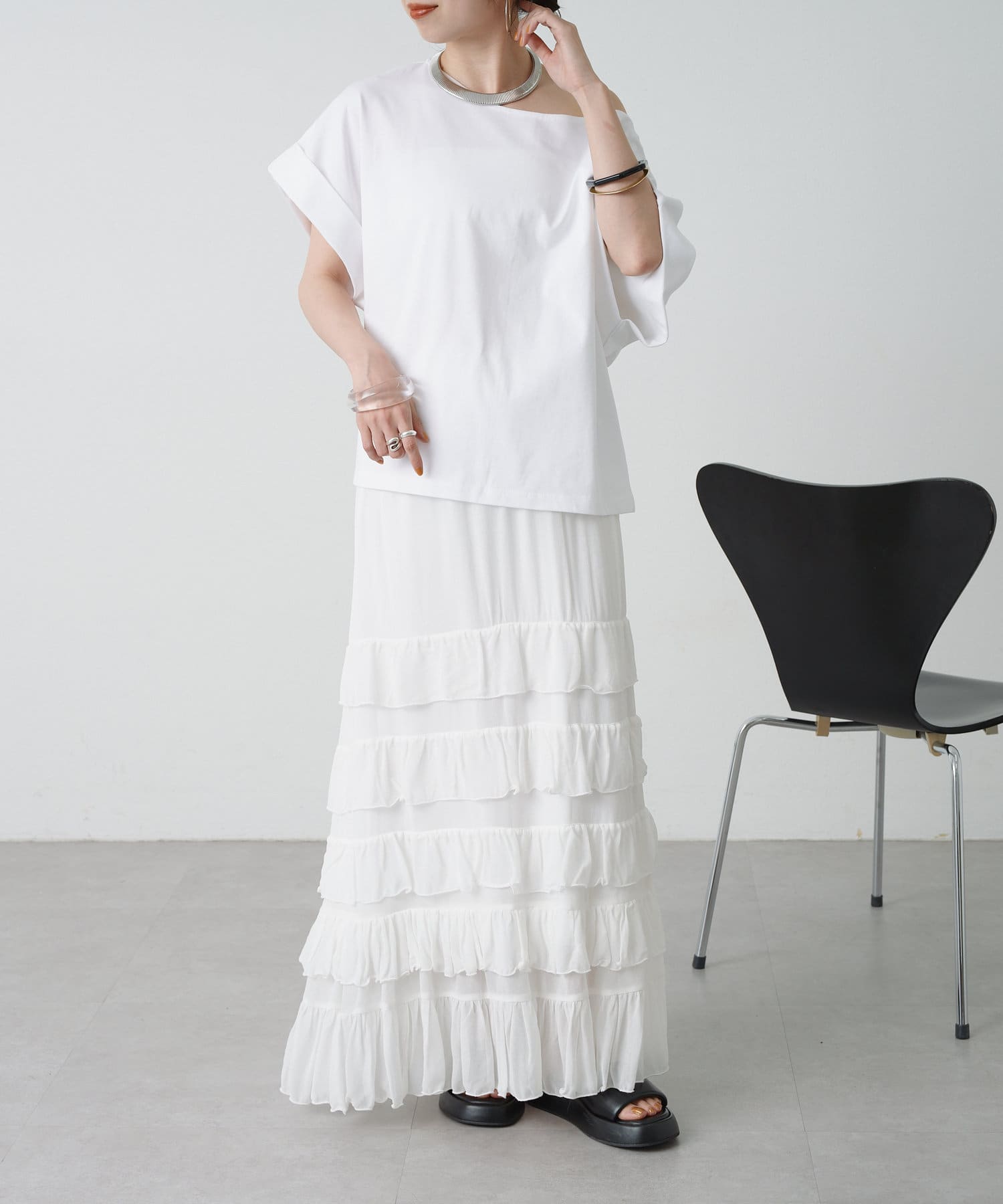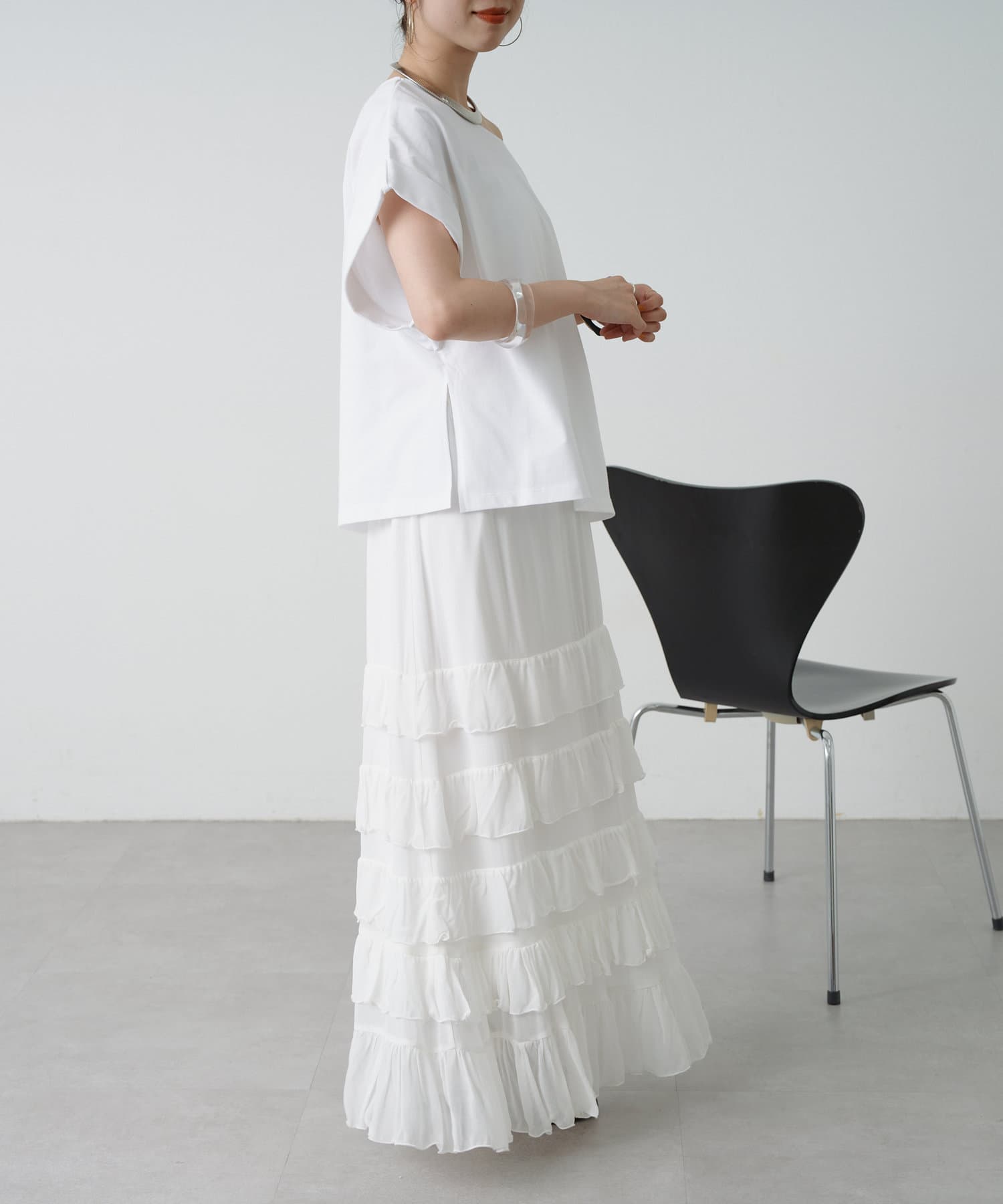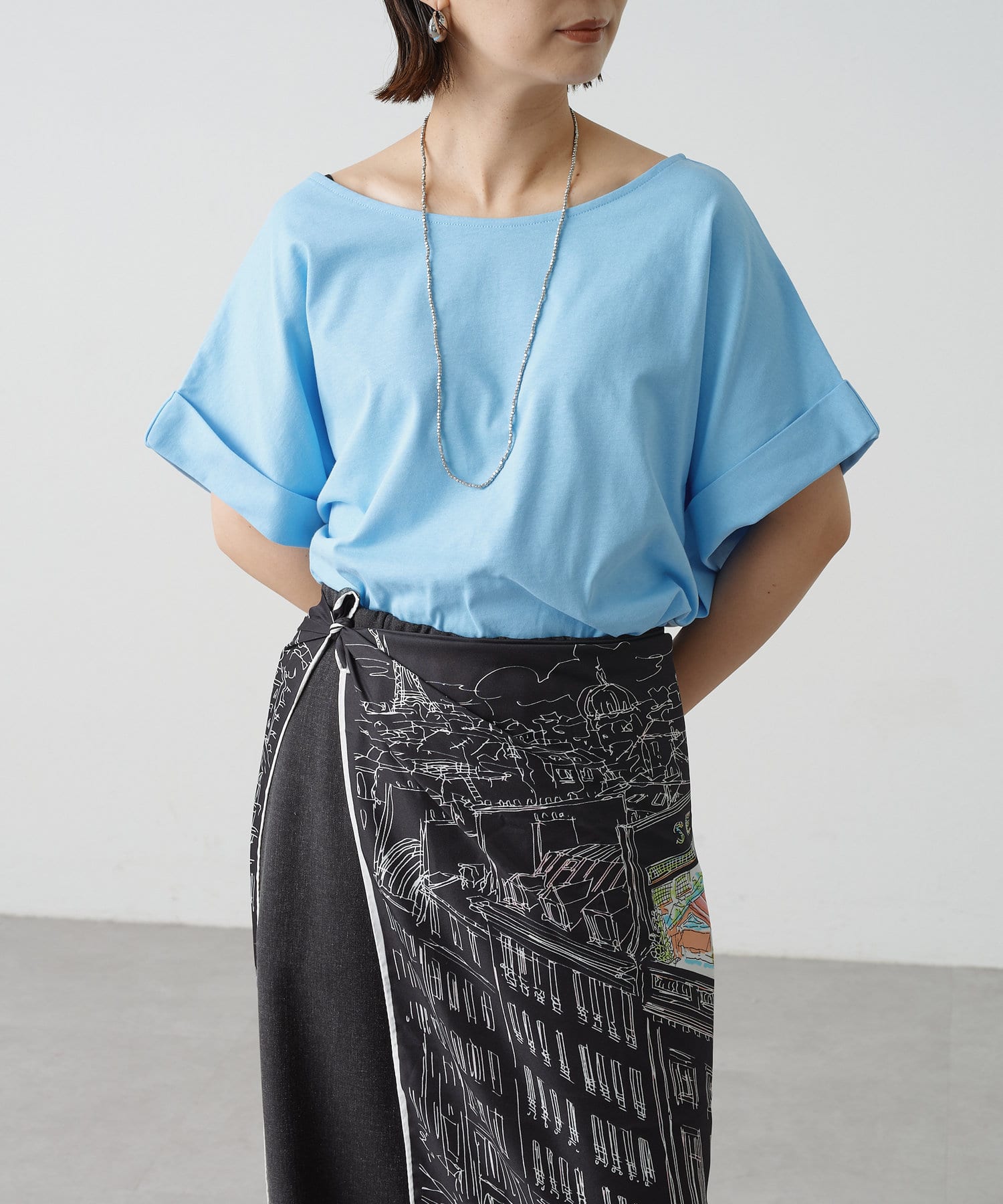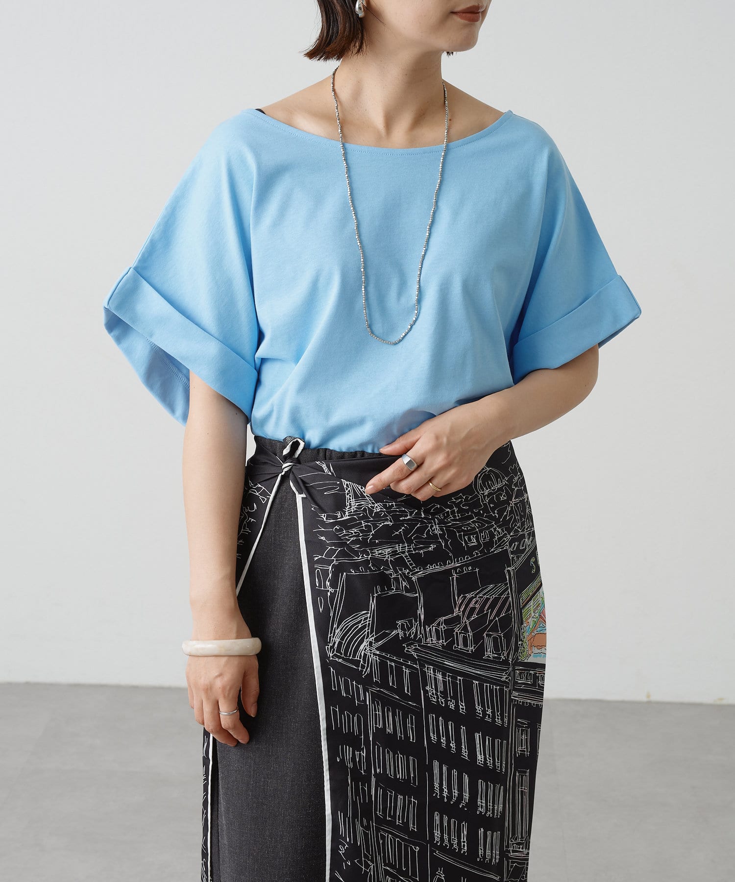 ・シンプルなのでボトムを選ばず着回しの効く一枚。