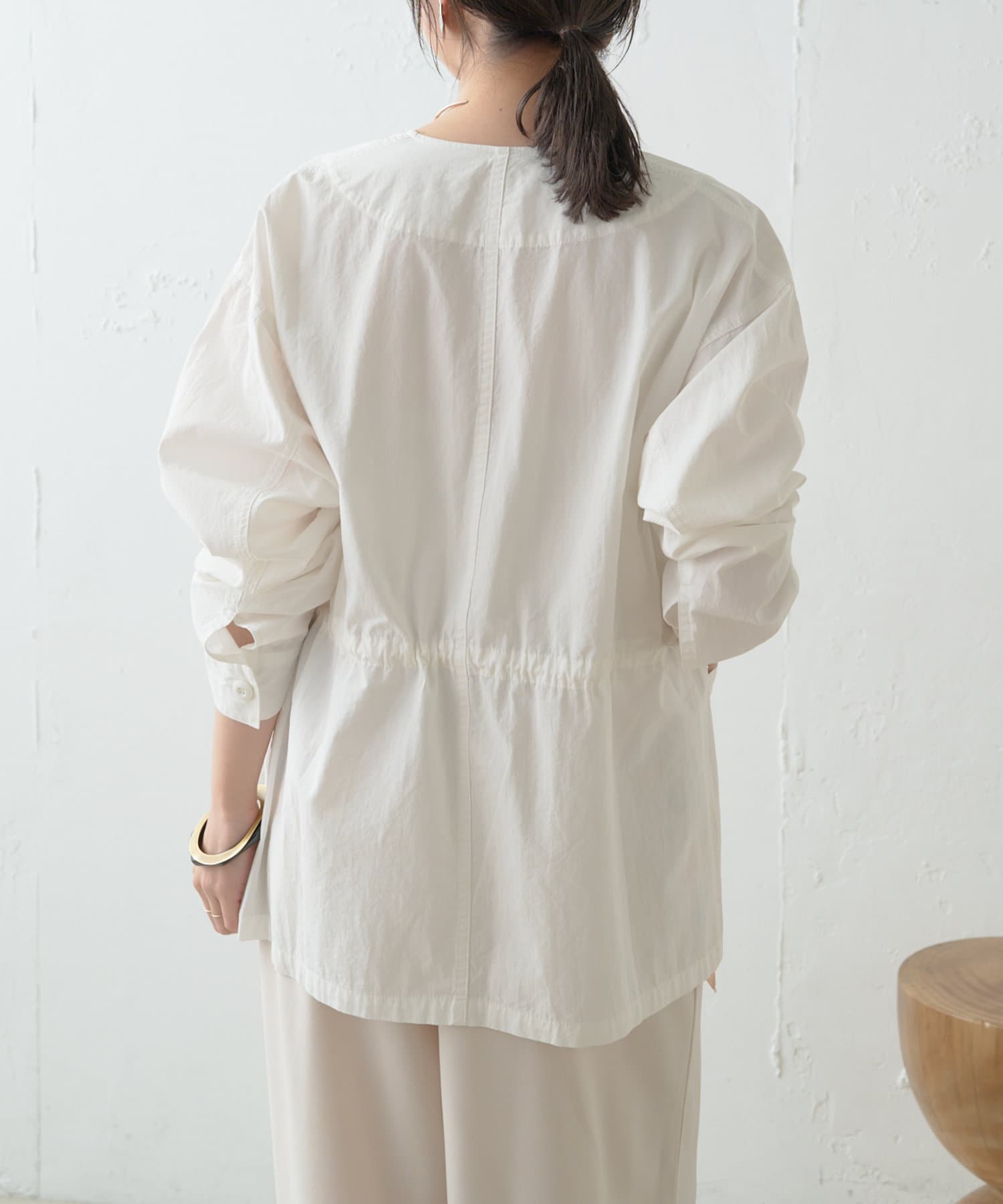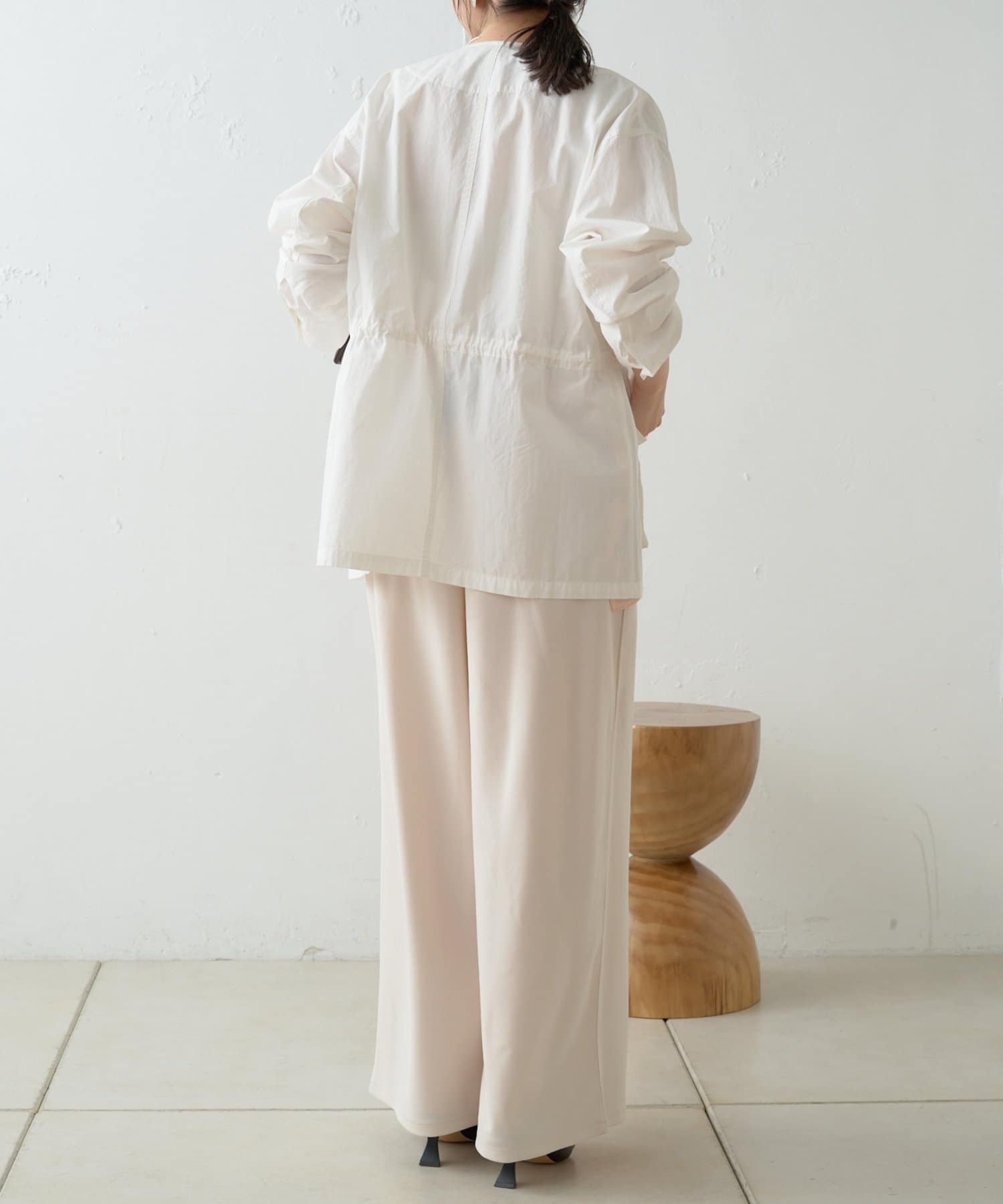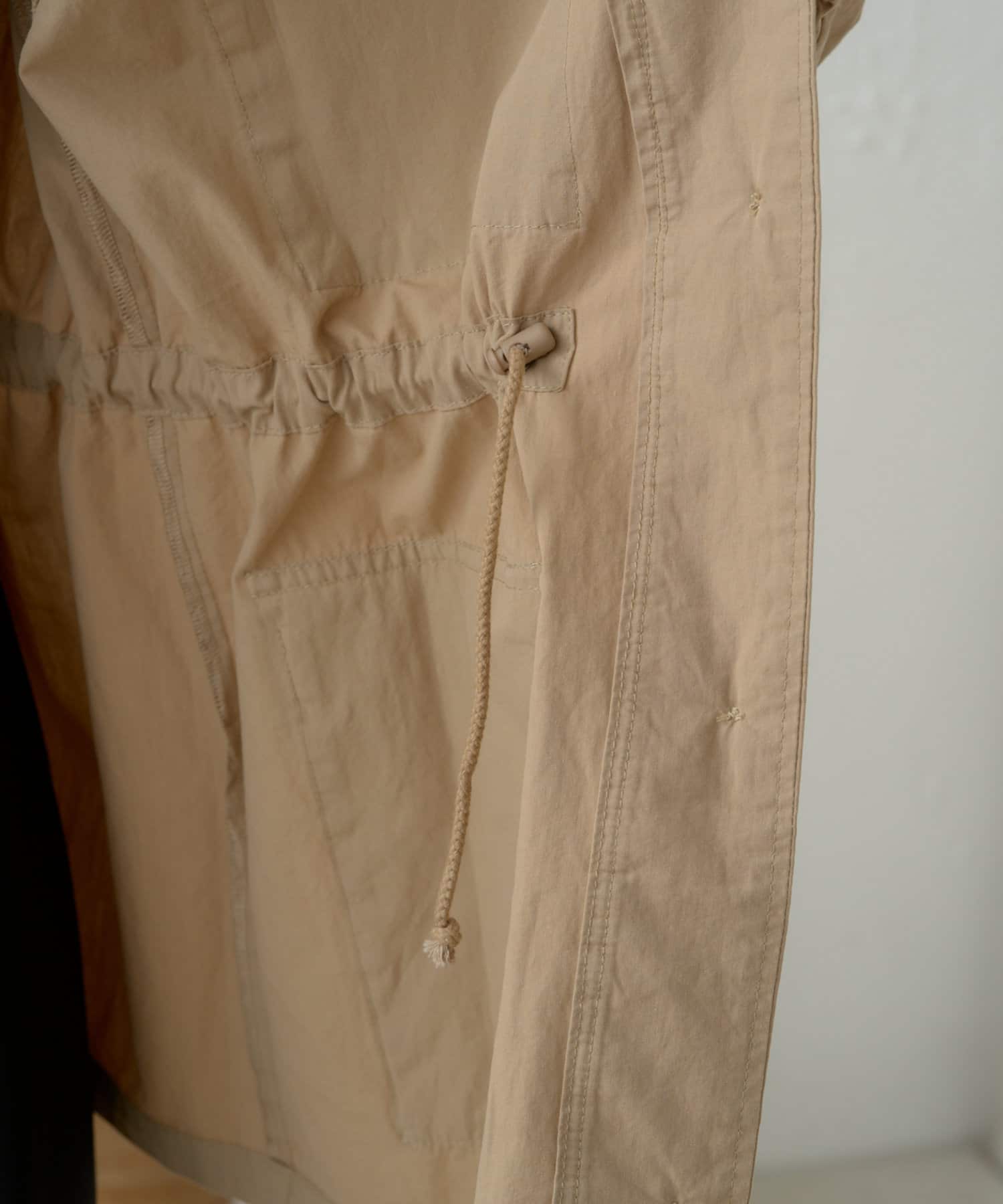 ・ウエストを絞れるよう内側に紐を通していて、着こなし次第で雰囲気を変えてお楽しみいただけます。