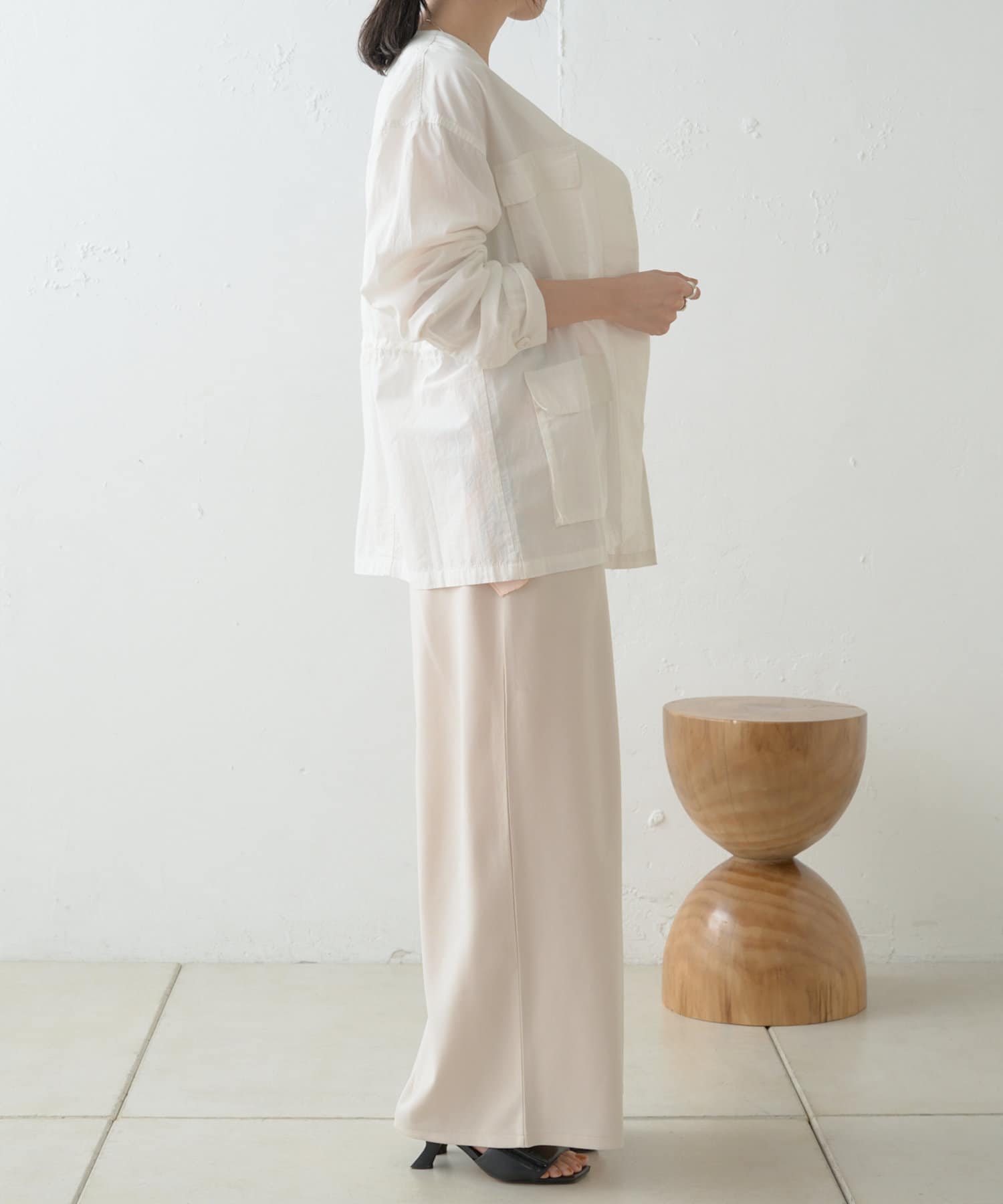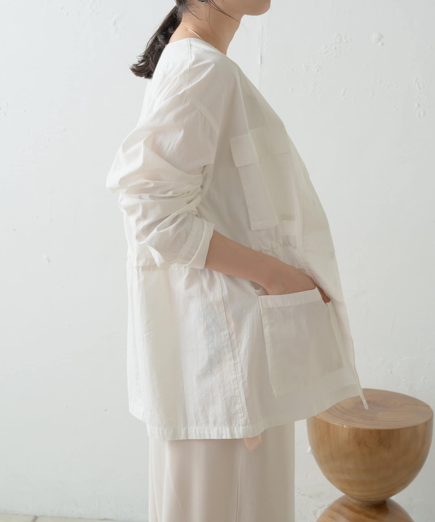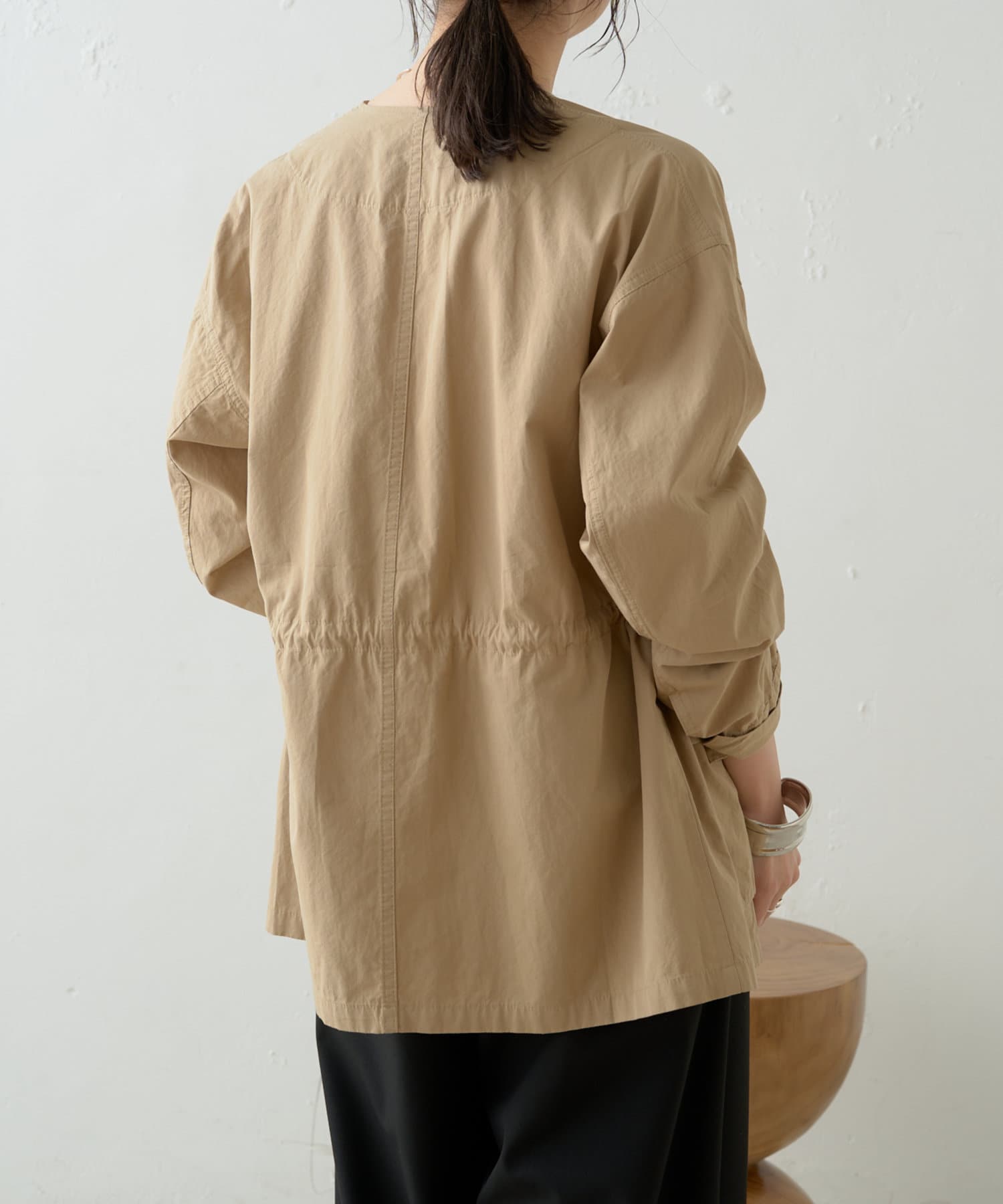・ウエストを絞れるよう内側に紐を通していて、着こなし次第で雰囲気を変えてお楽しみいただけます。
