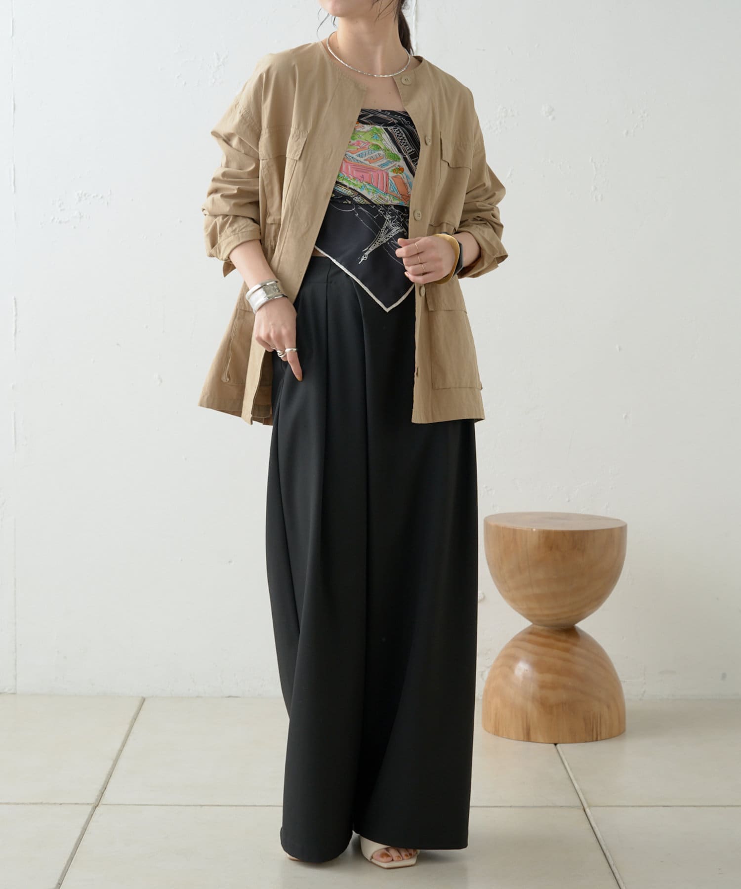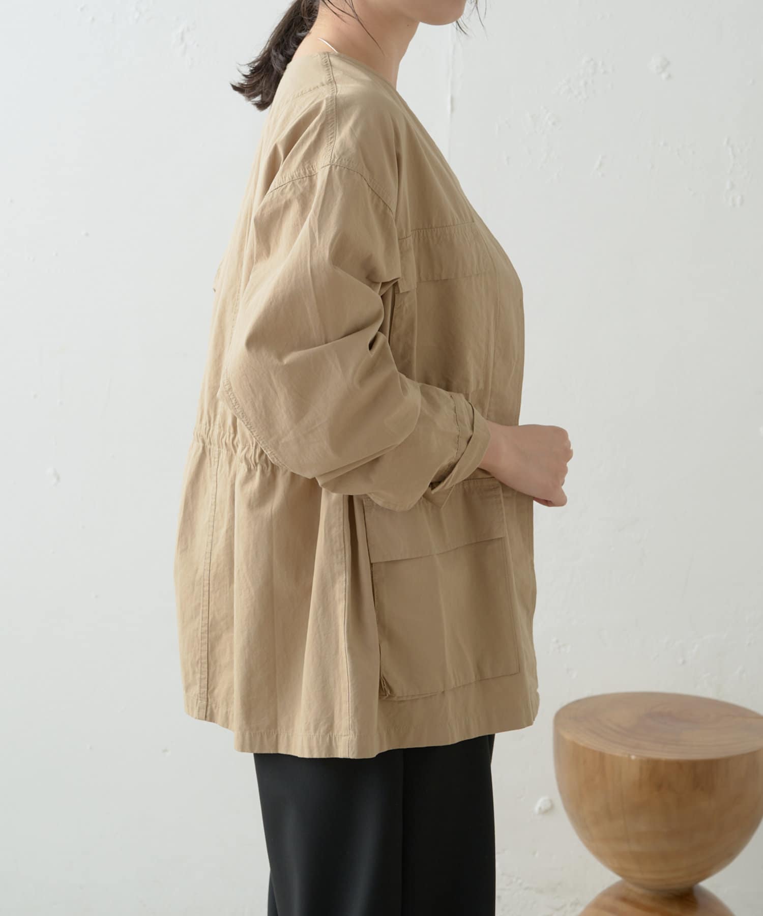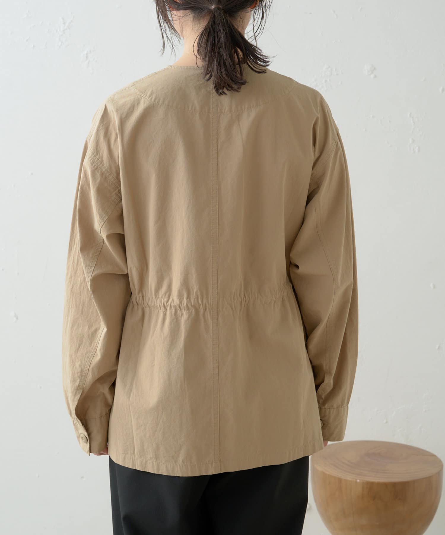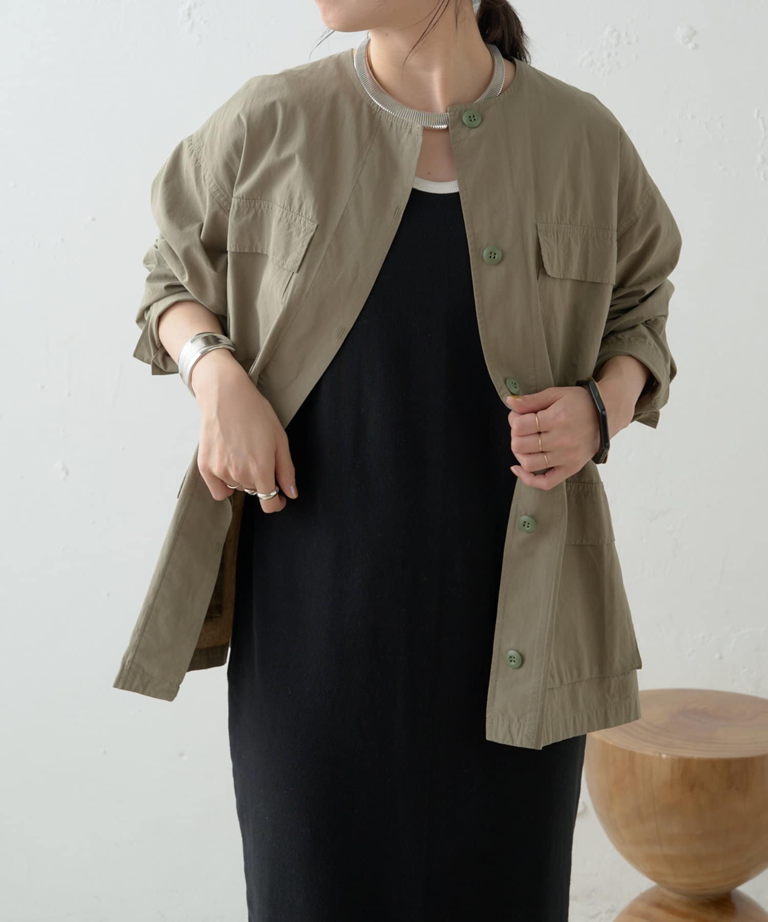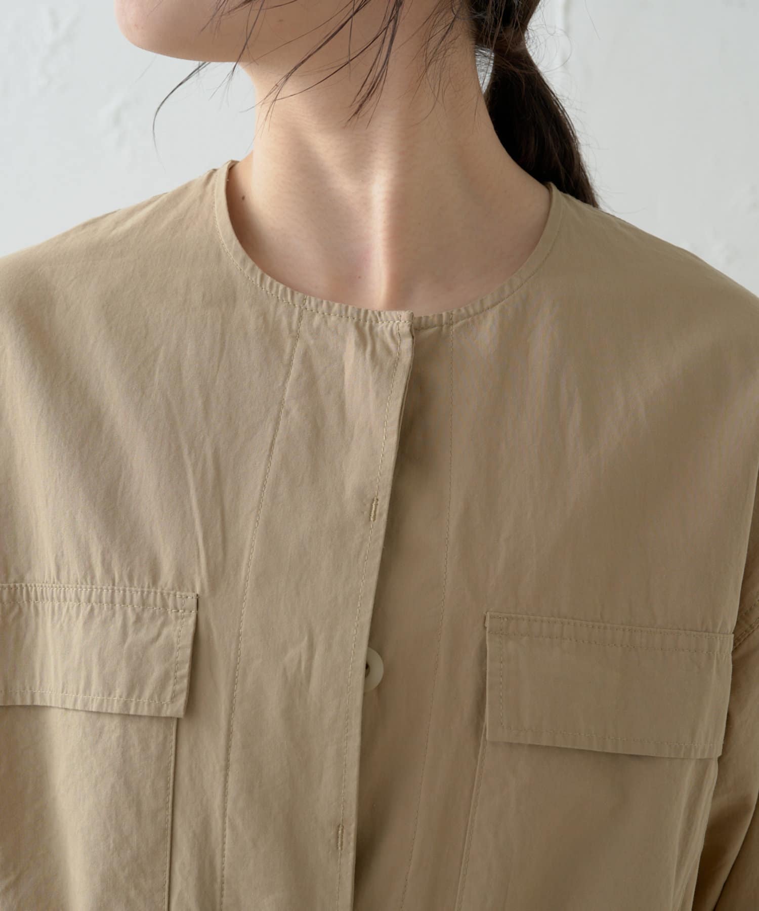 ・首周りがすっきりしていて付け襟やアクセサリーが映えるノーカラーデザイン