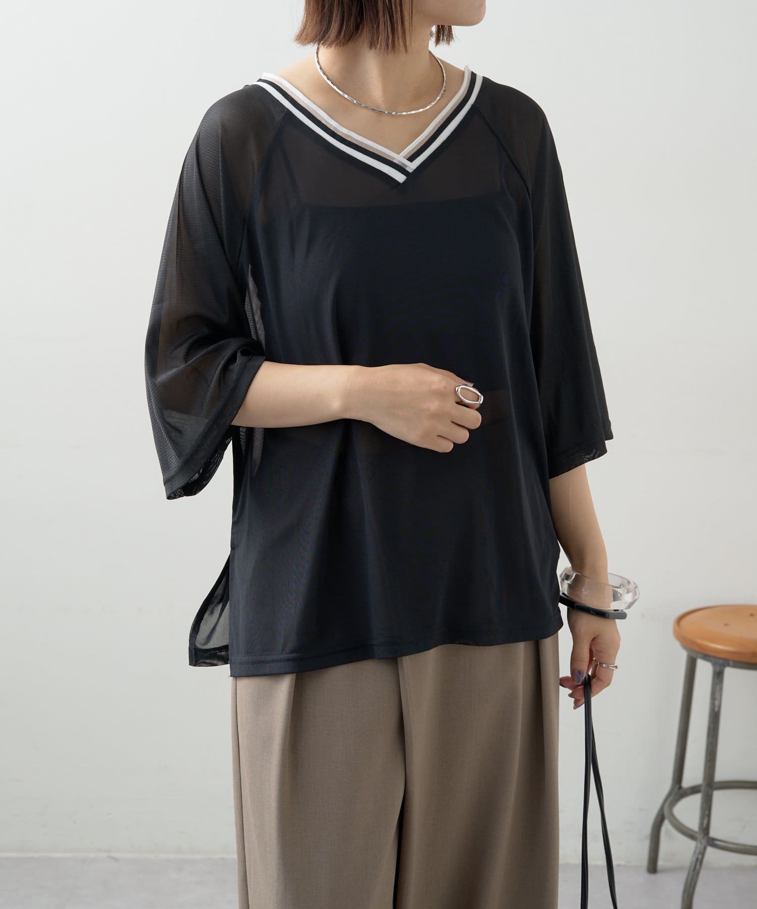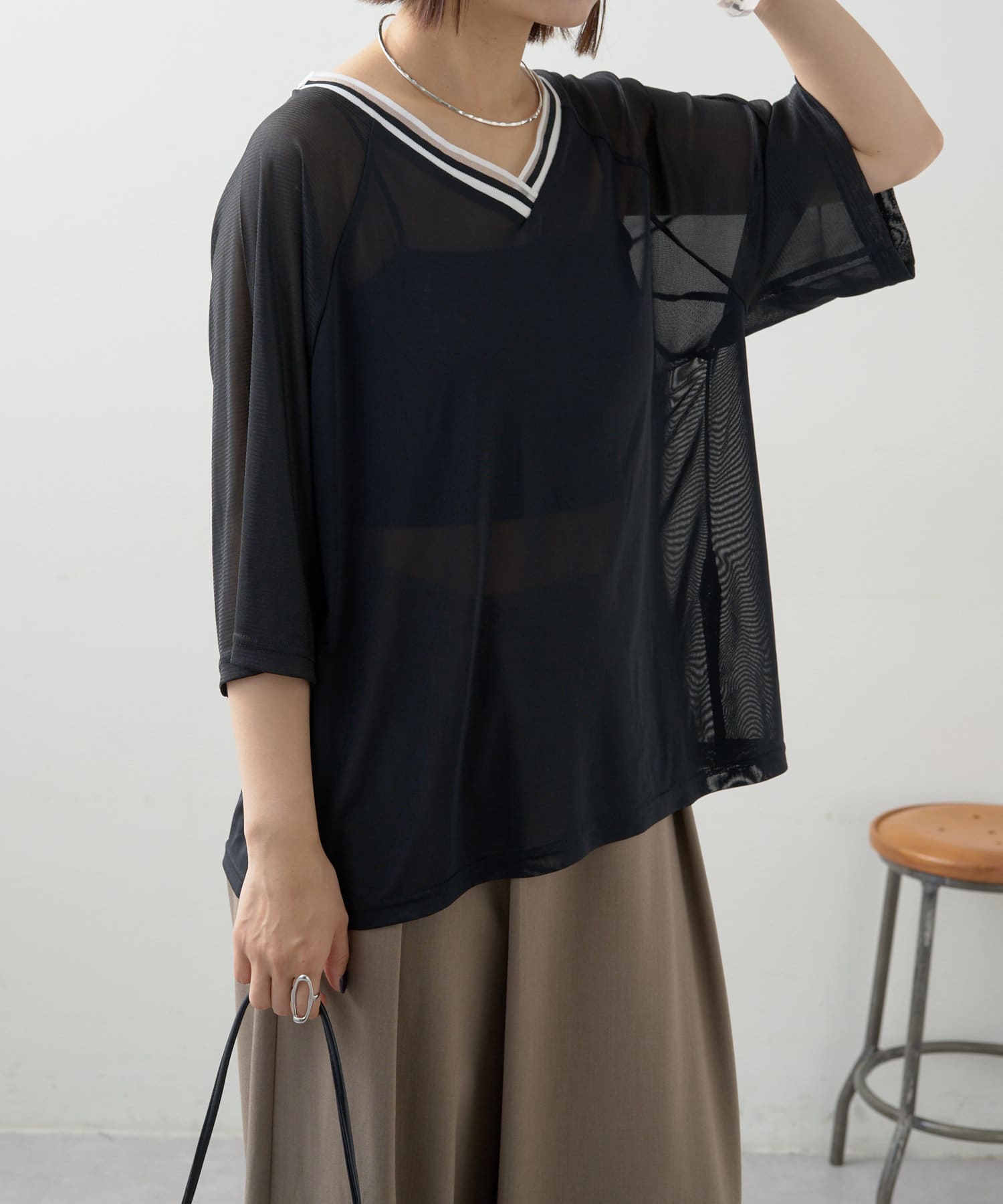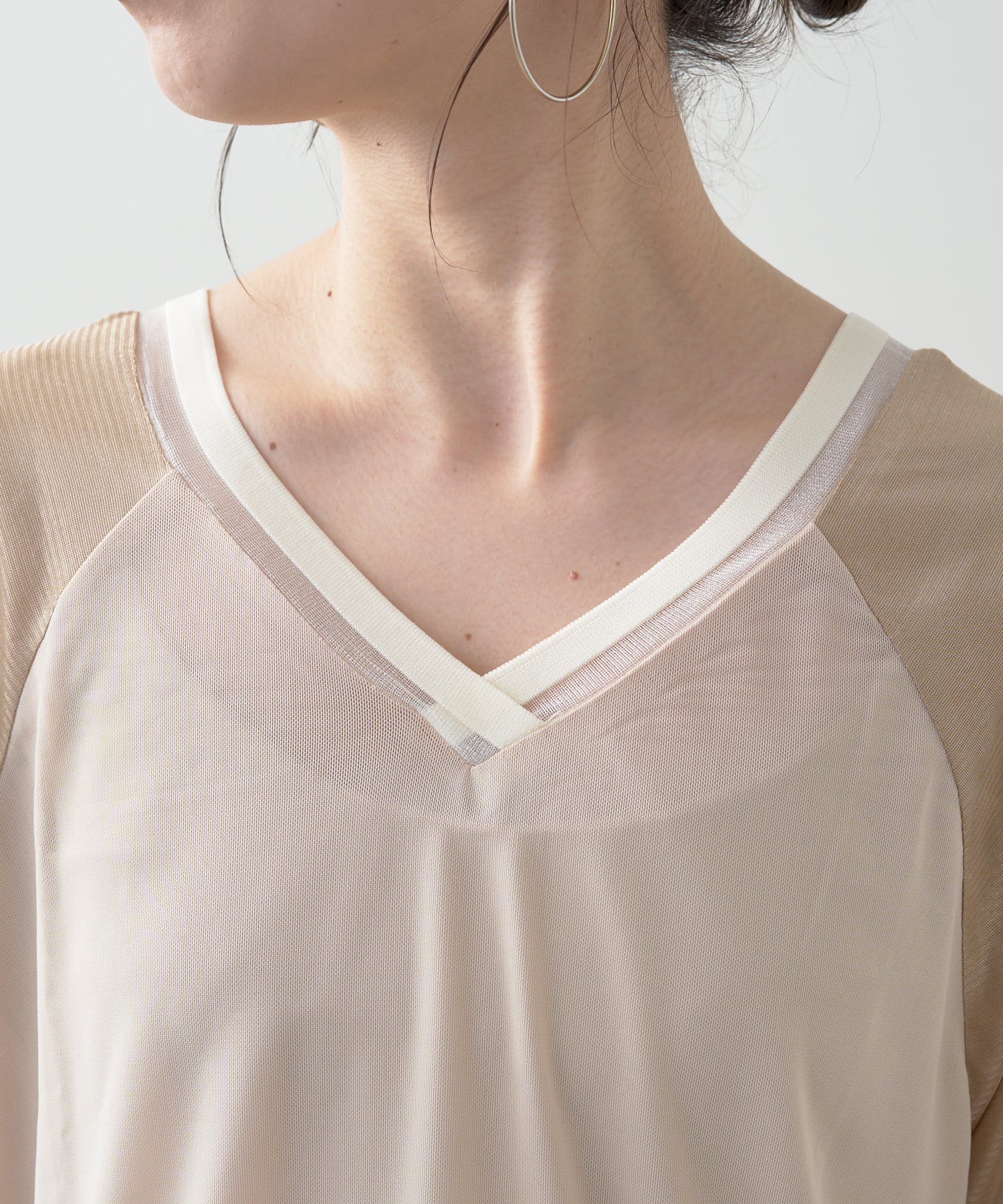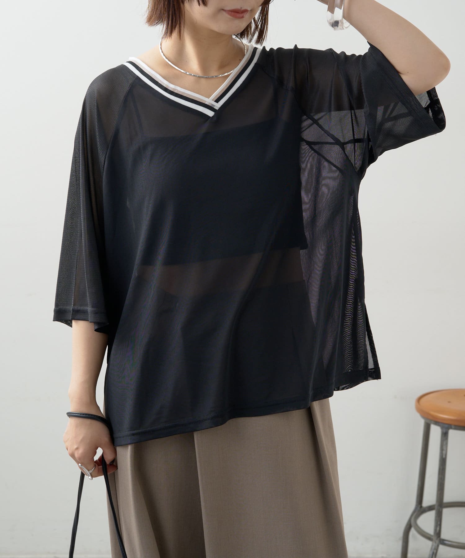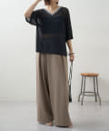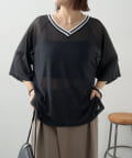 ・Vネックとシアー感が女性らしさをプラス。