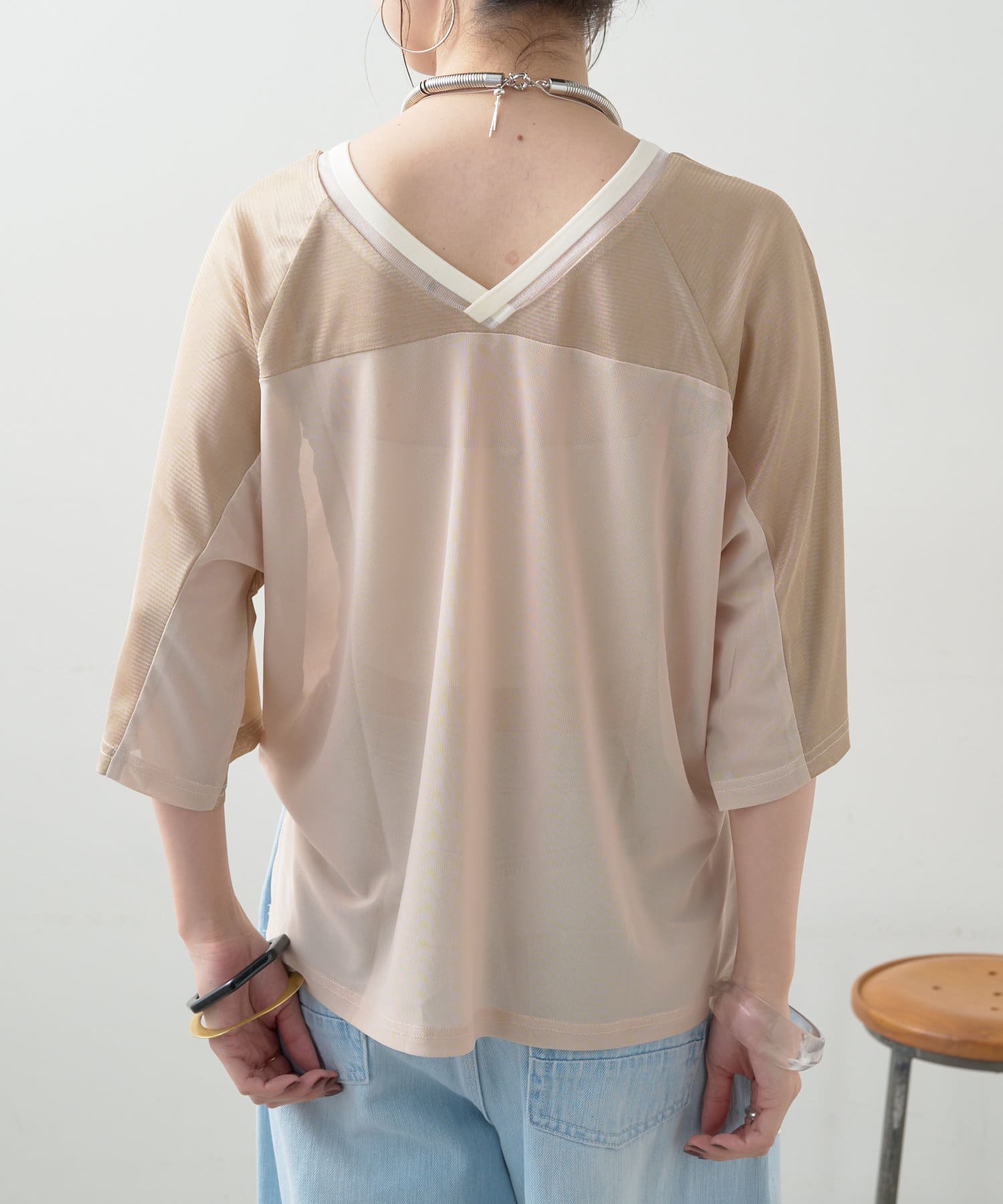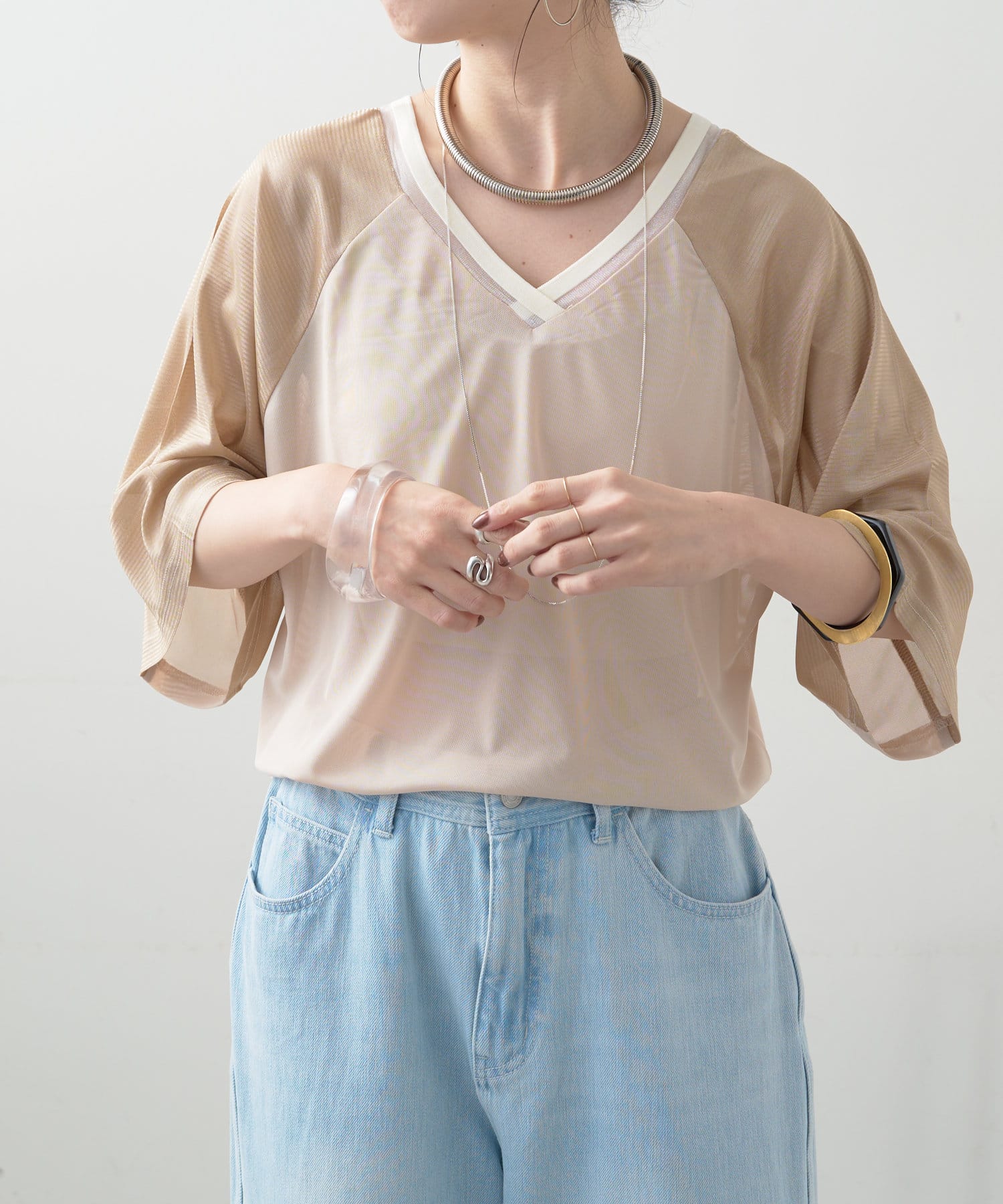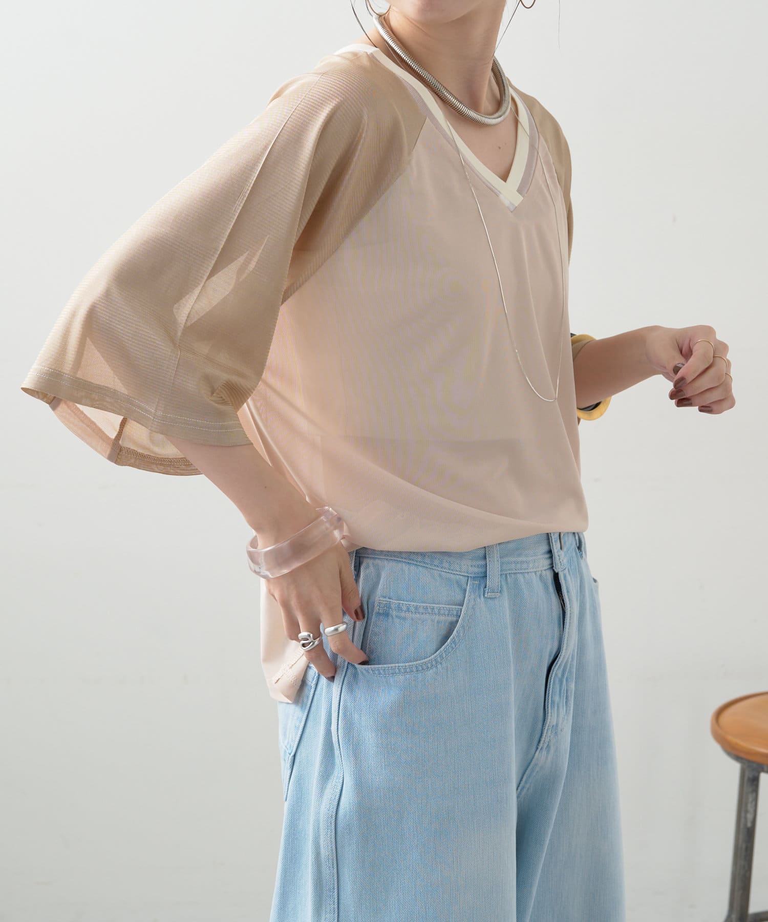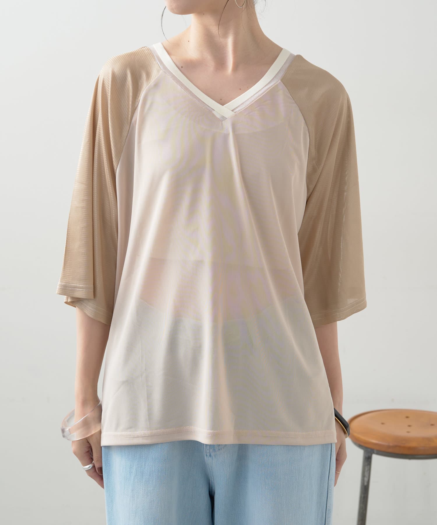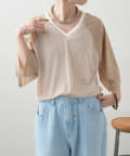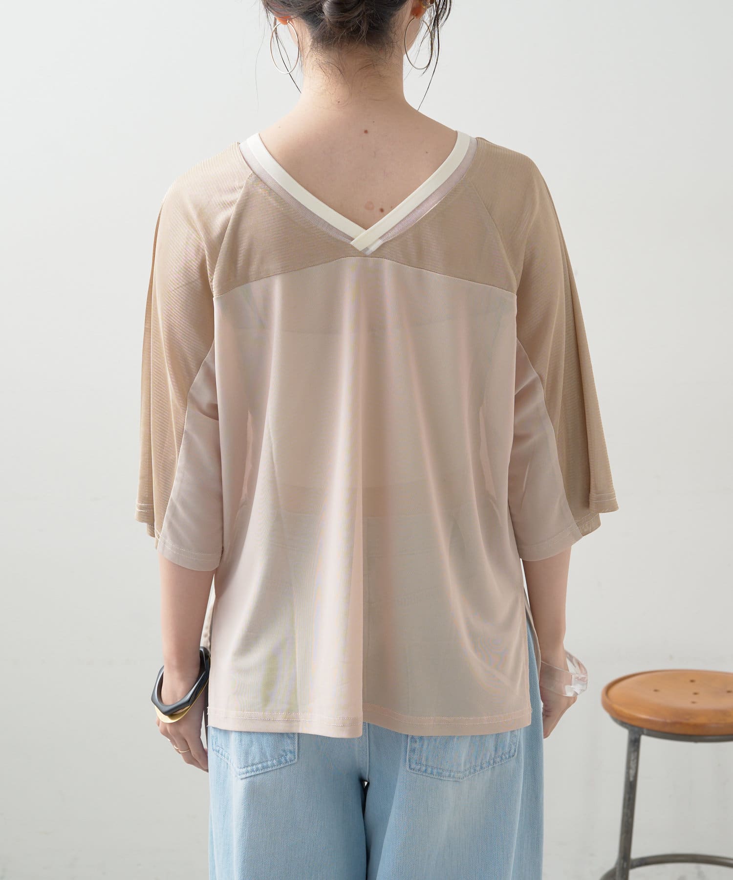 ・Vネックとシアー感が女性らしさをプラス。