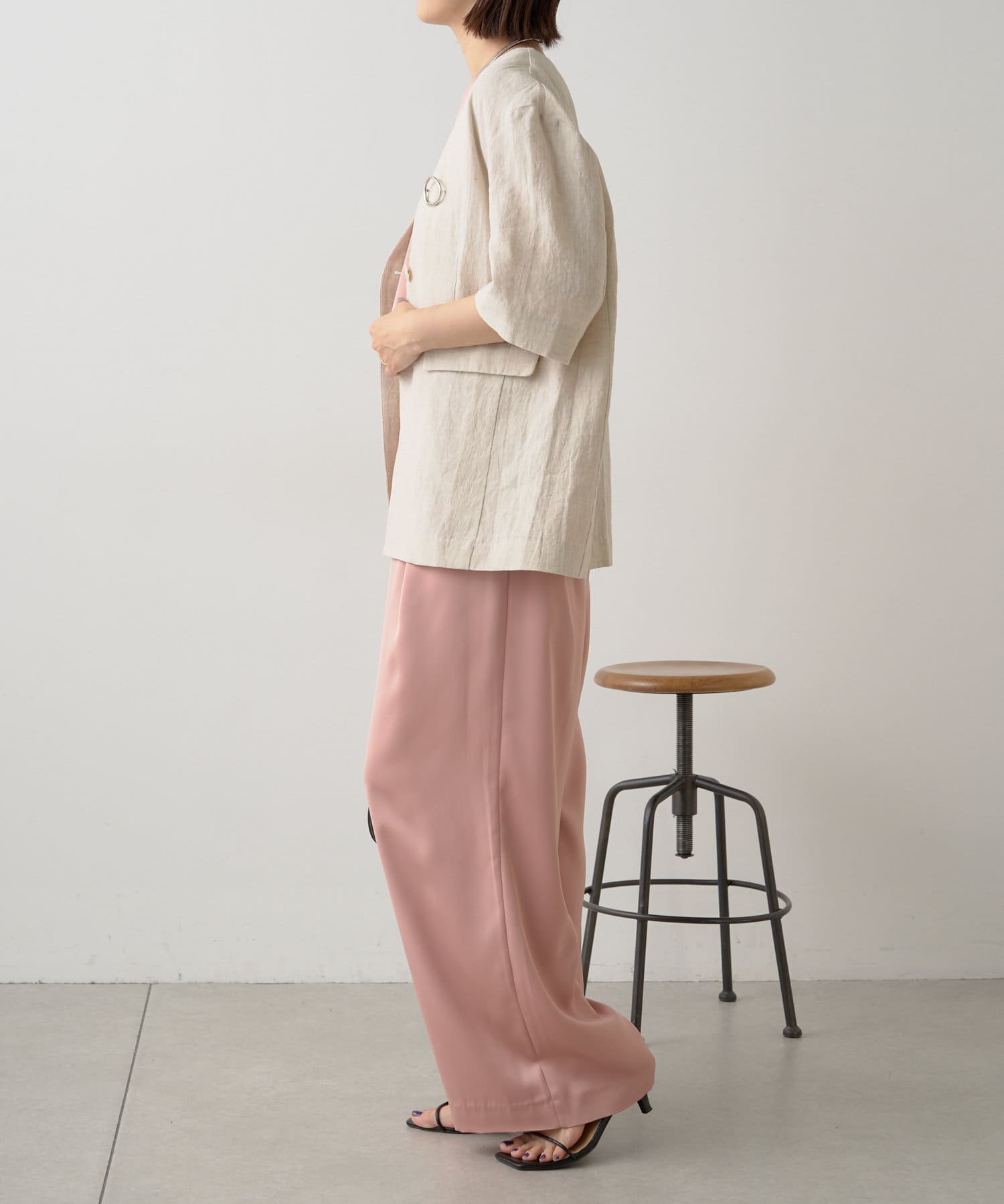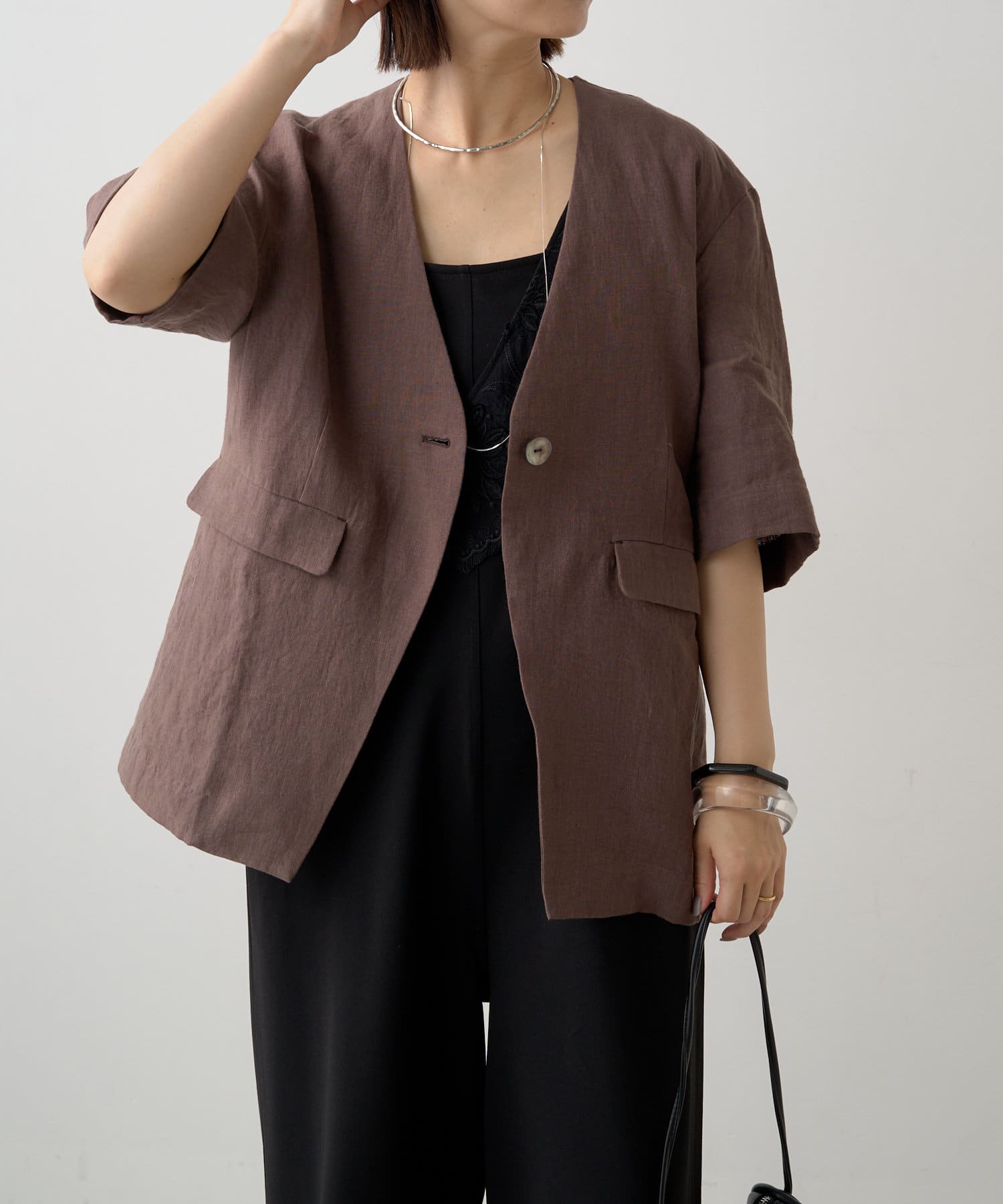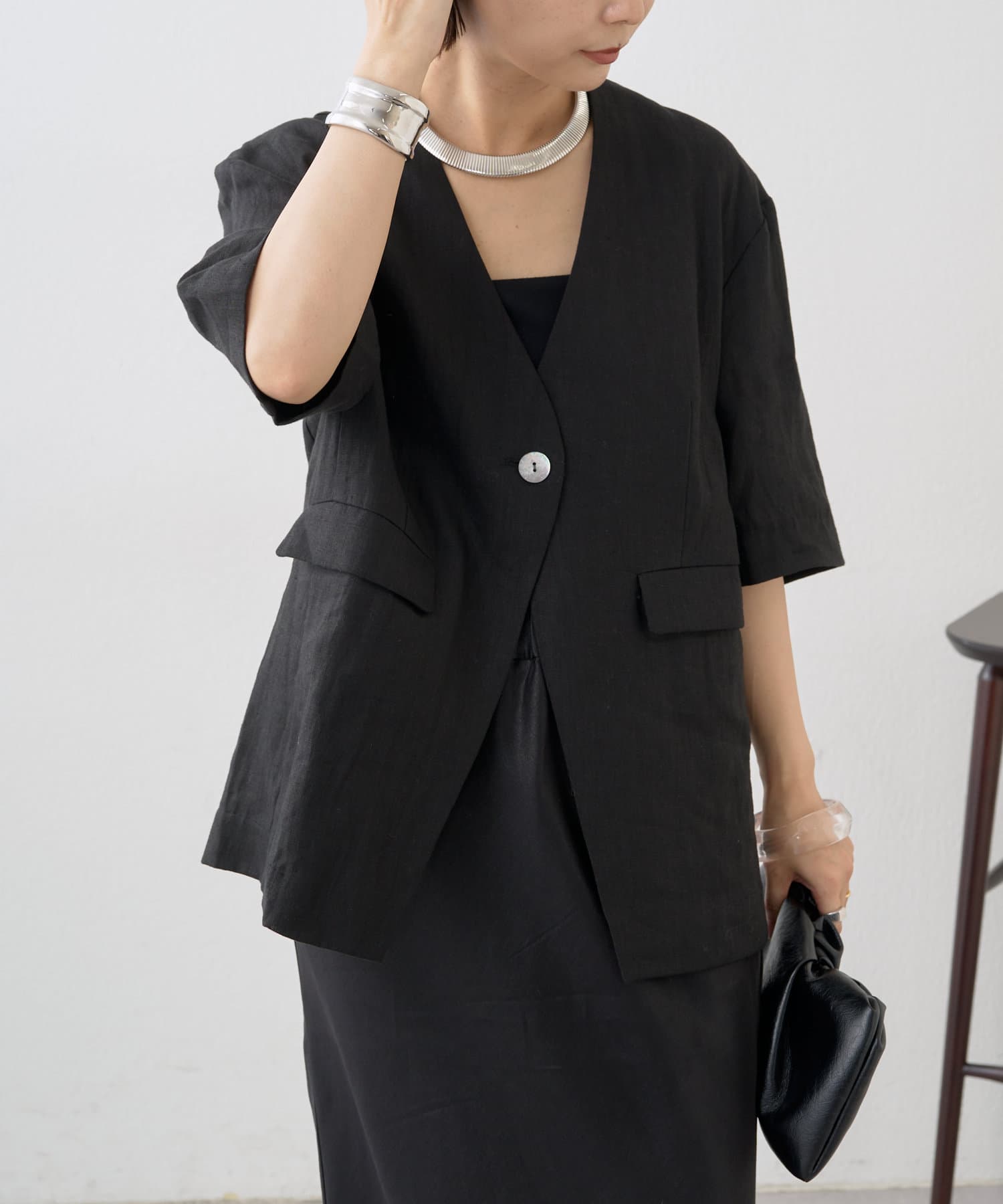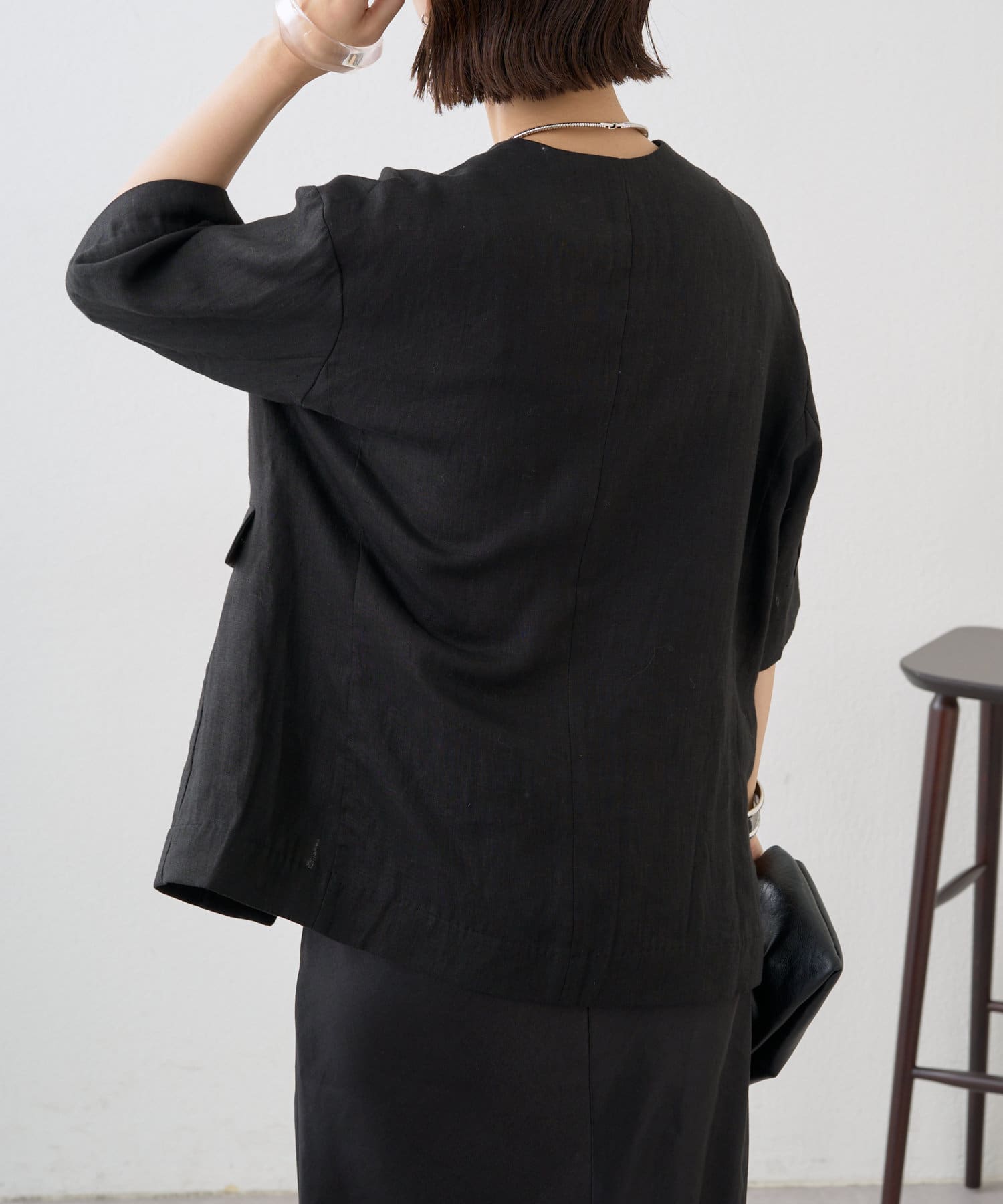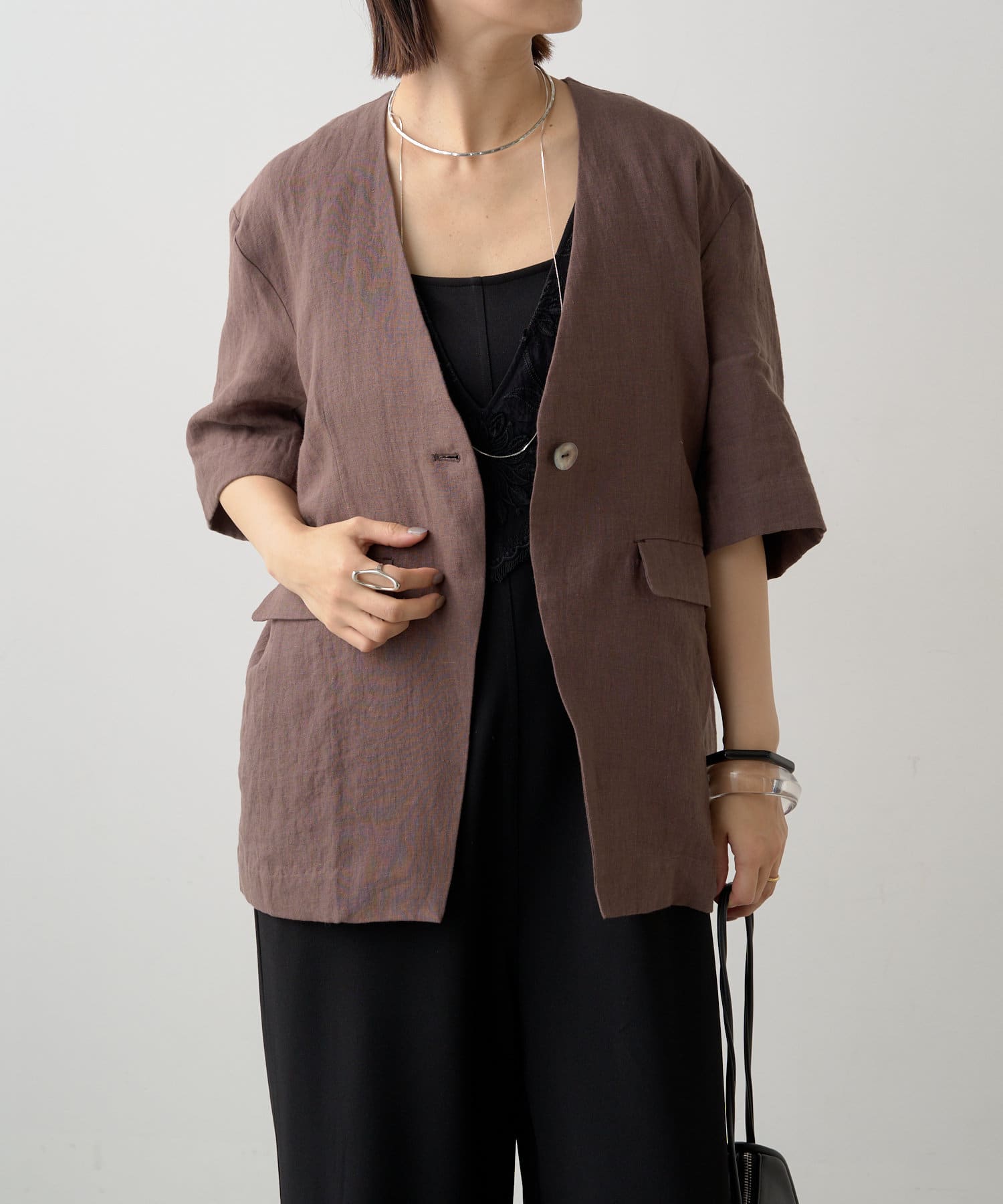 ノーカラーリネンジャケット