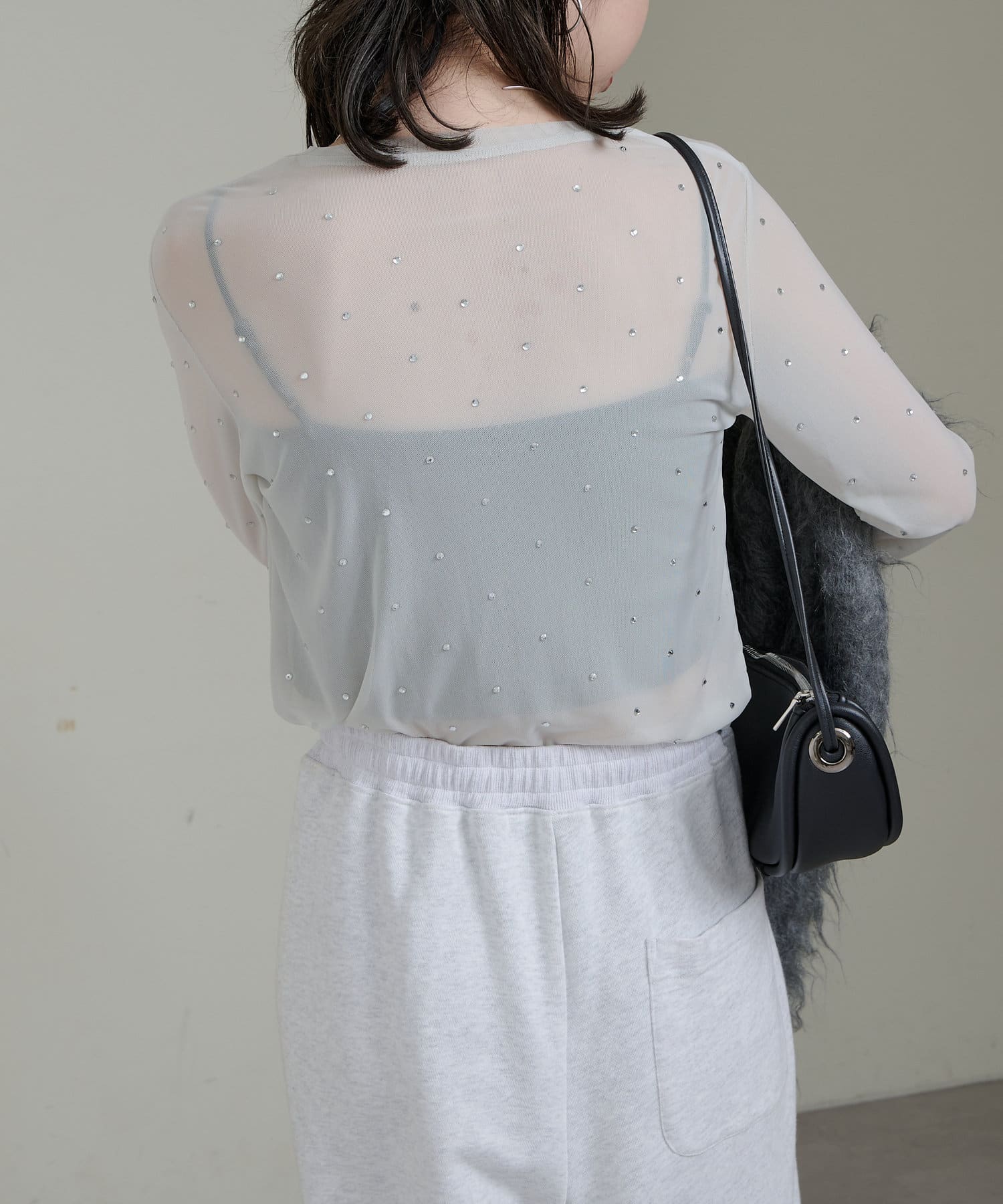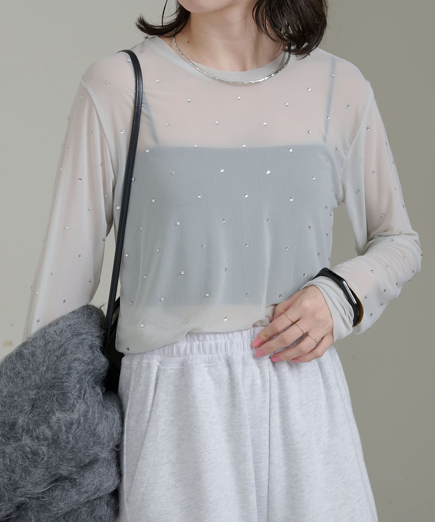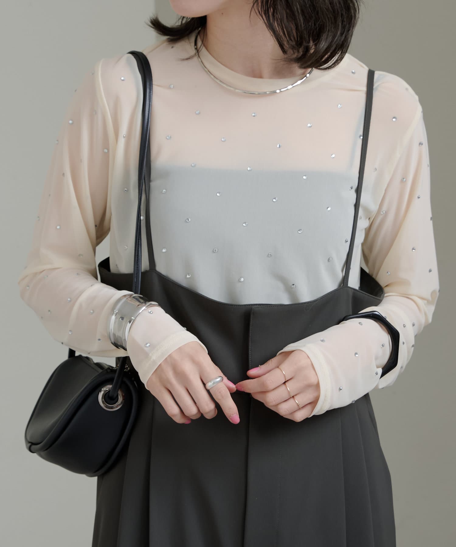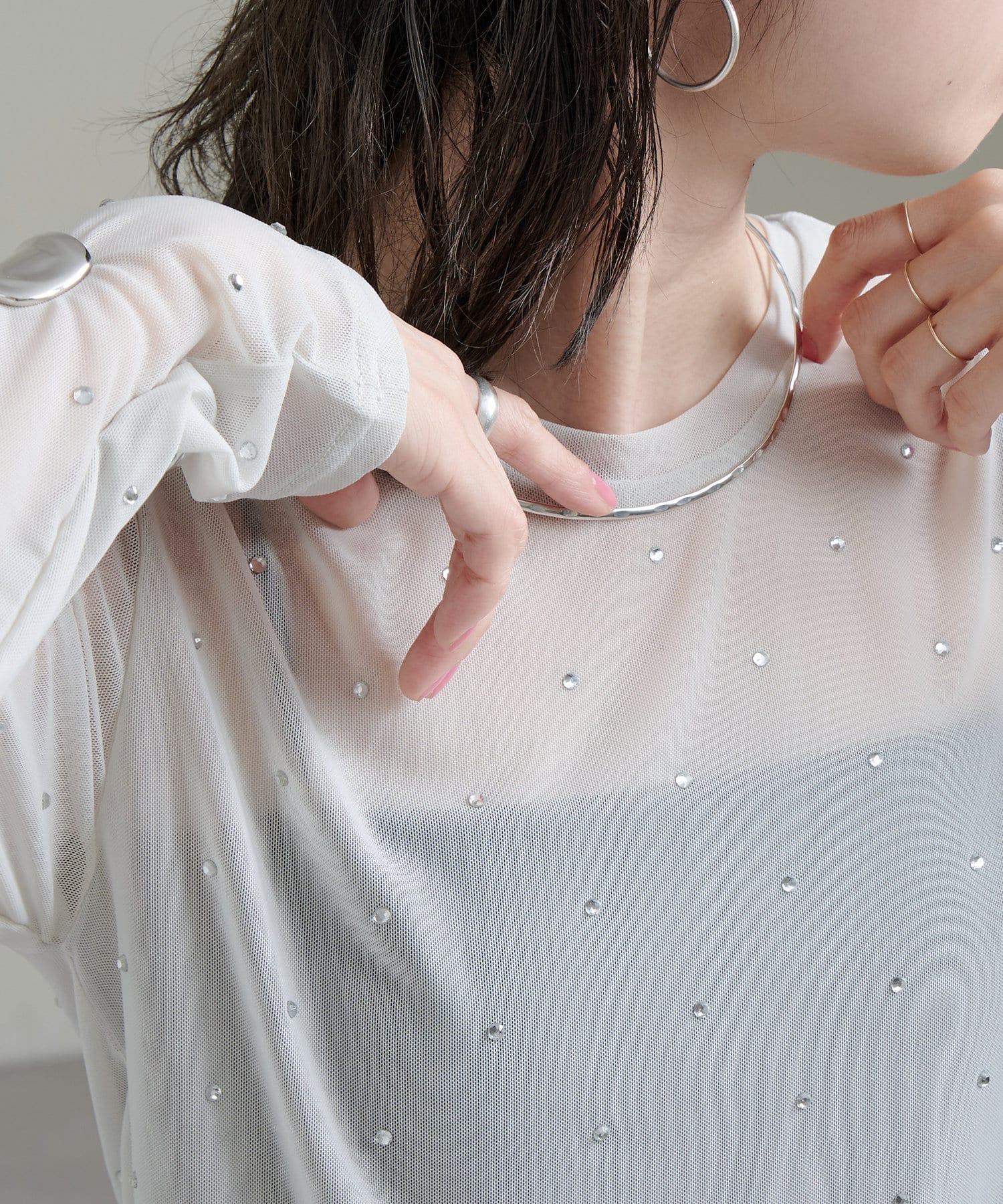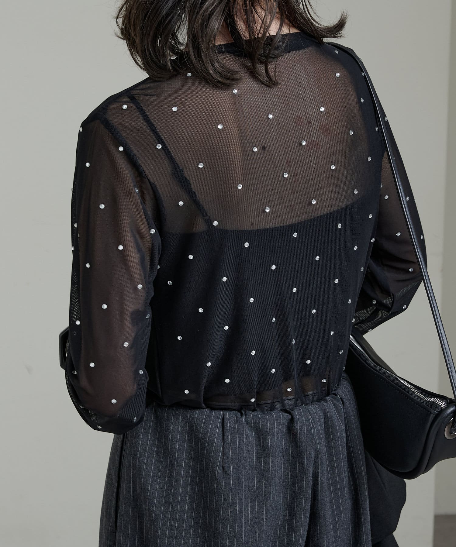 ・小さめのきらっと光るビジューがスタイリングに映える1枚。