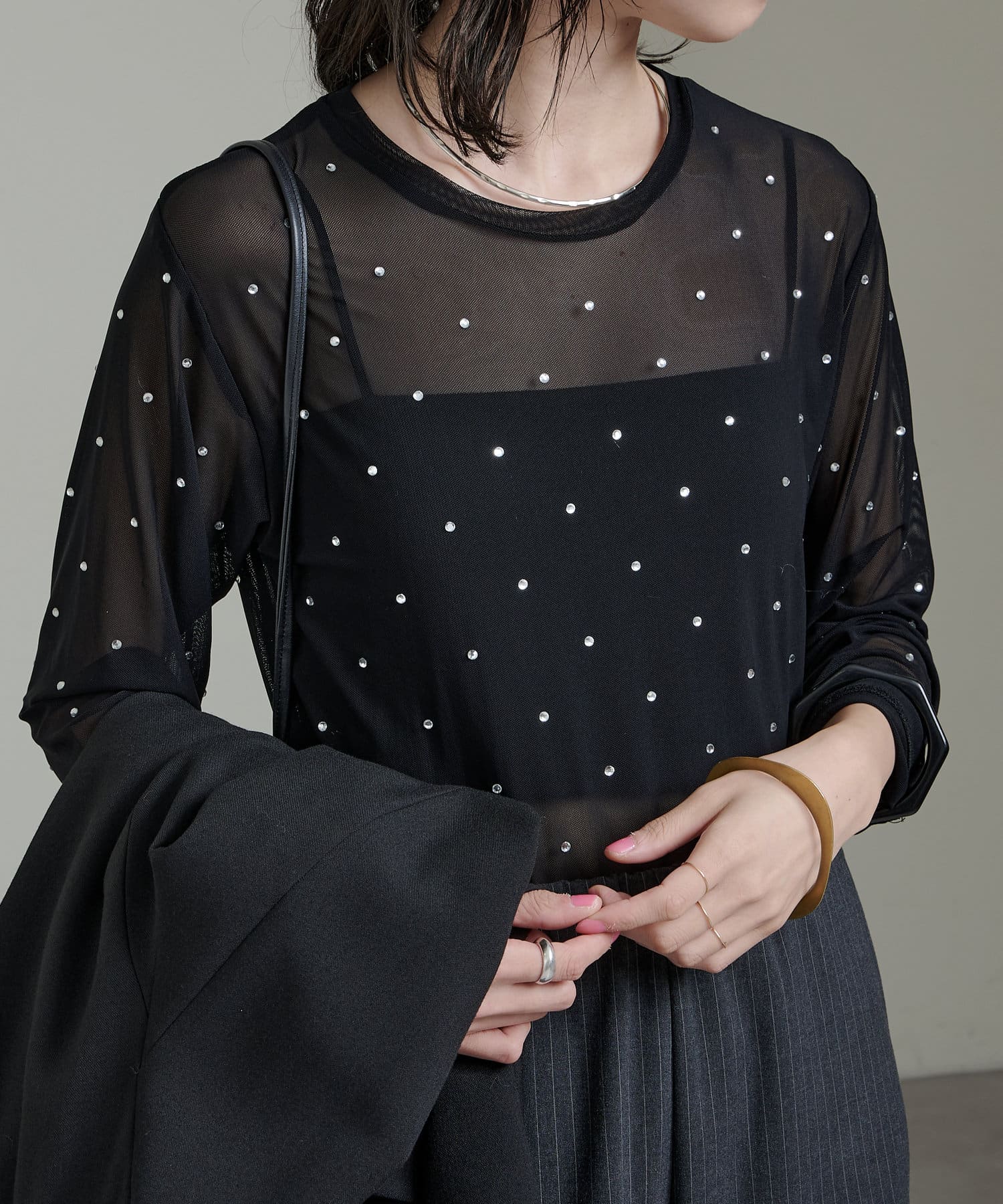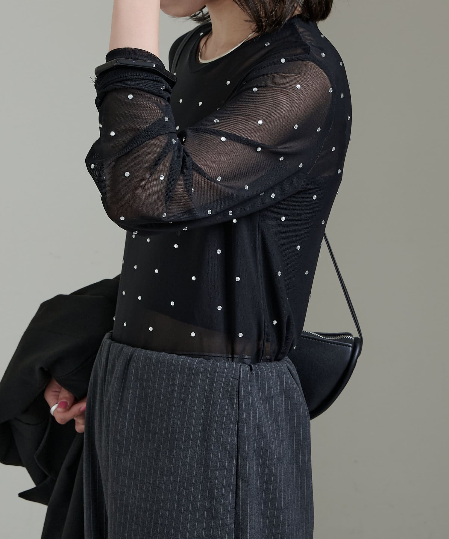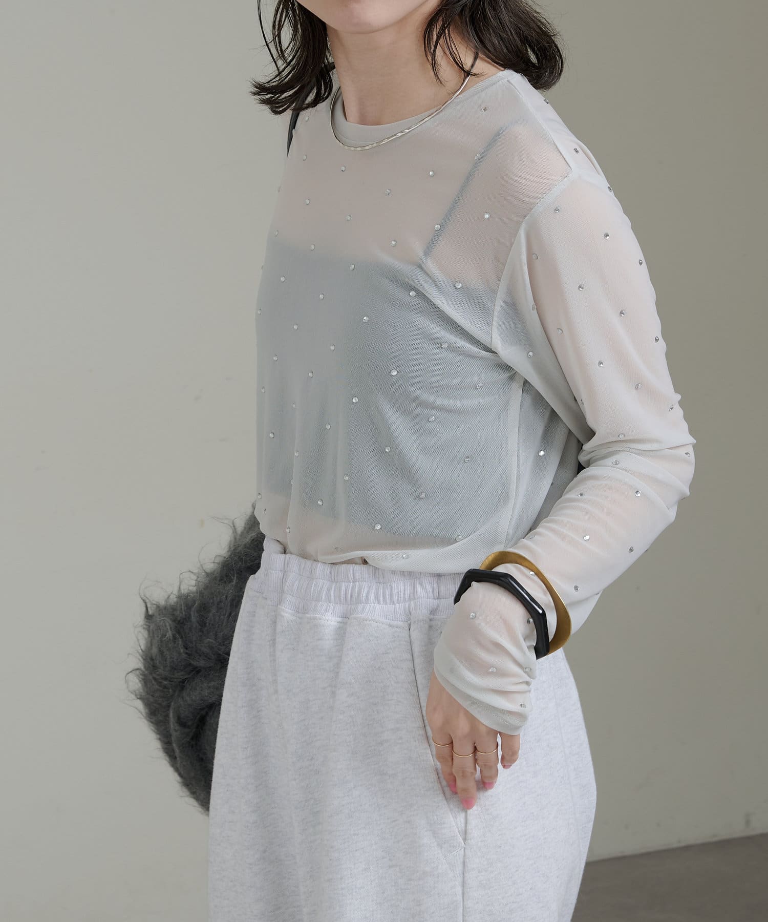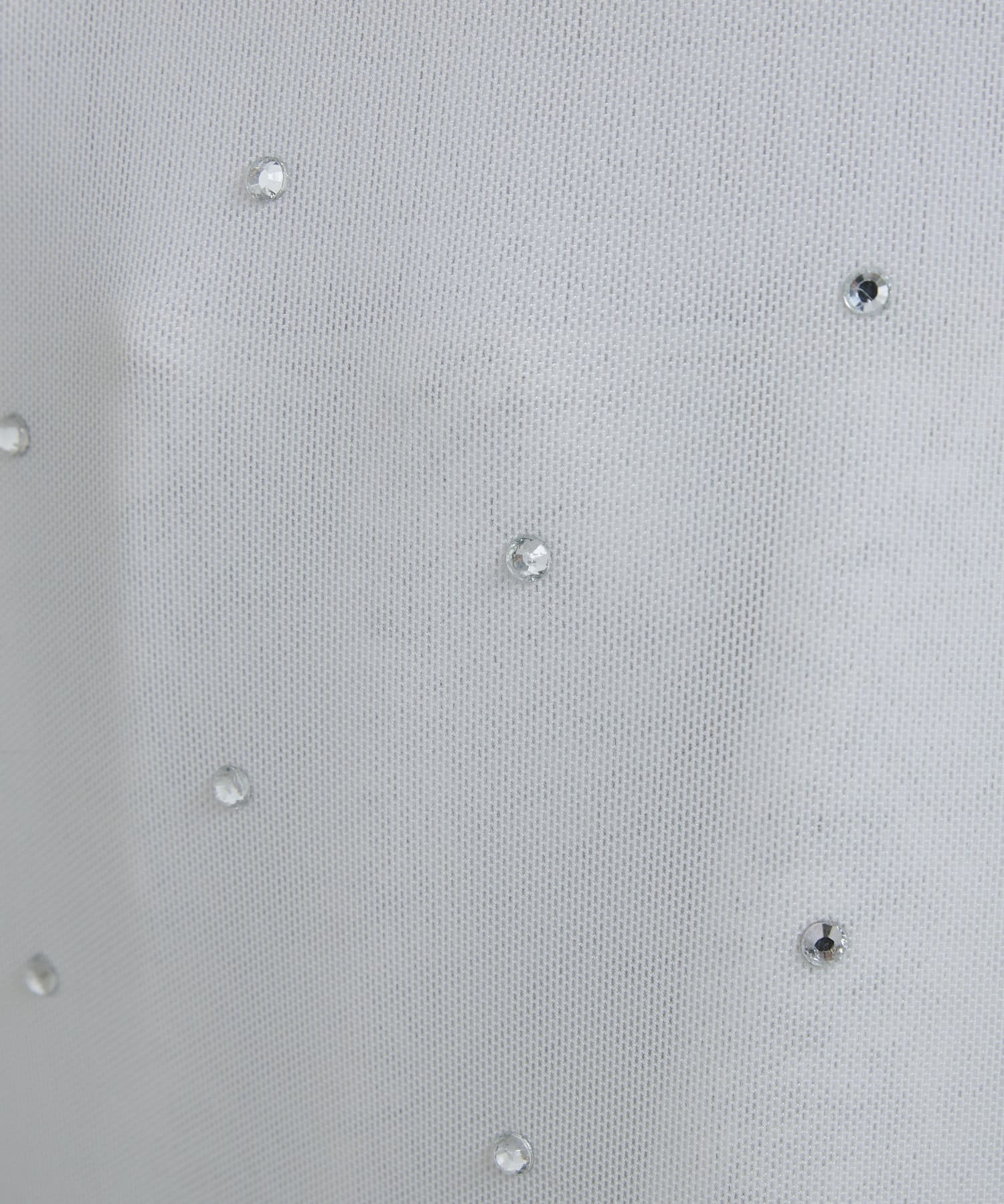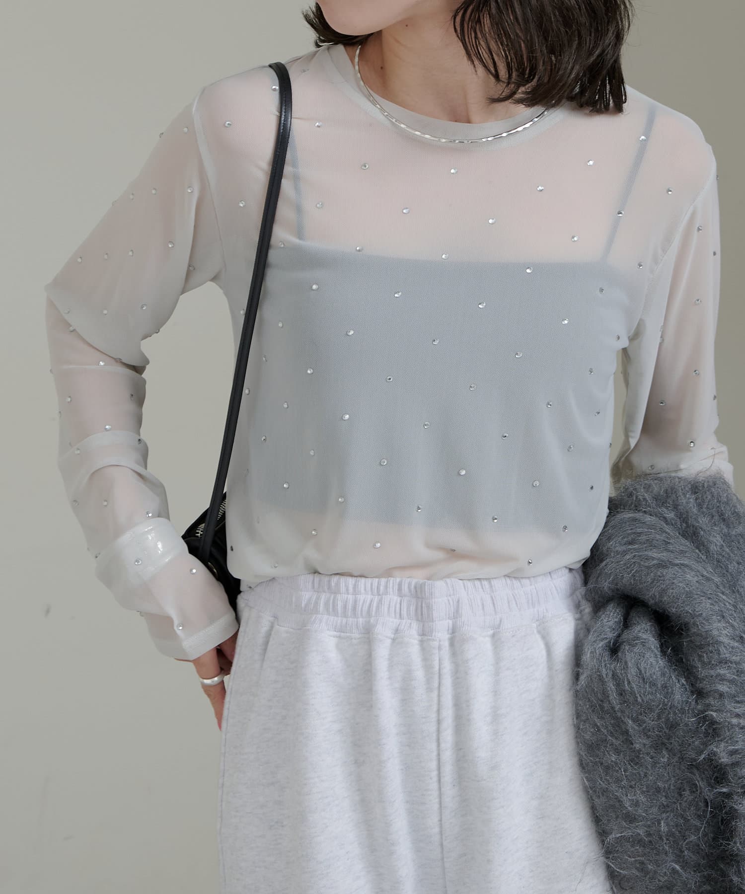 ・小さめのきらっと光るビジューがスタイリングに映える1枚。