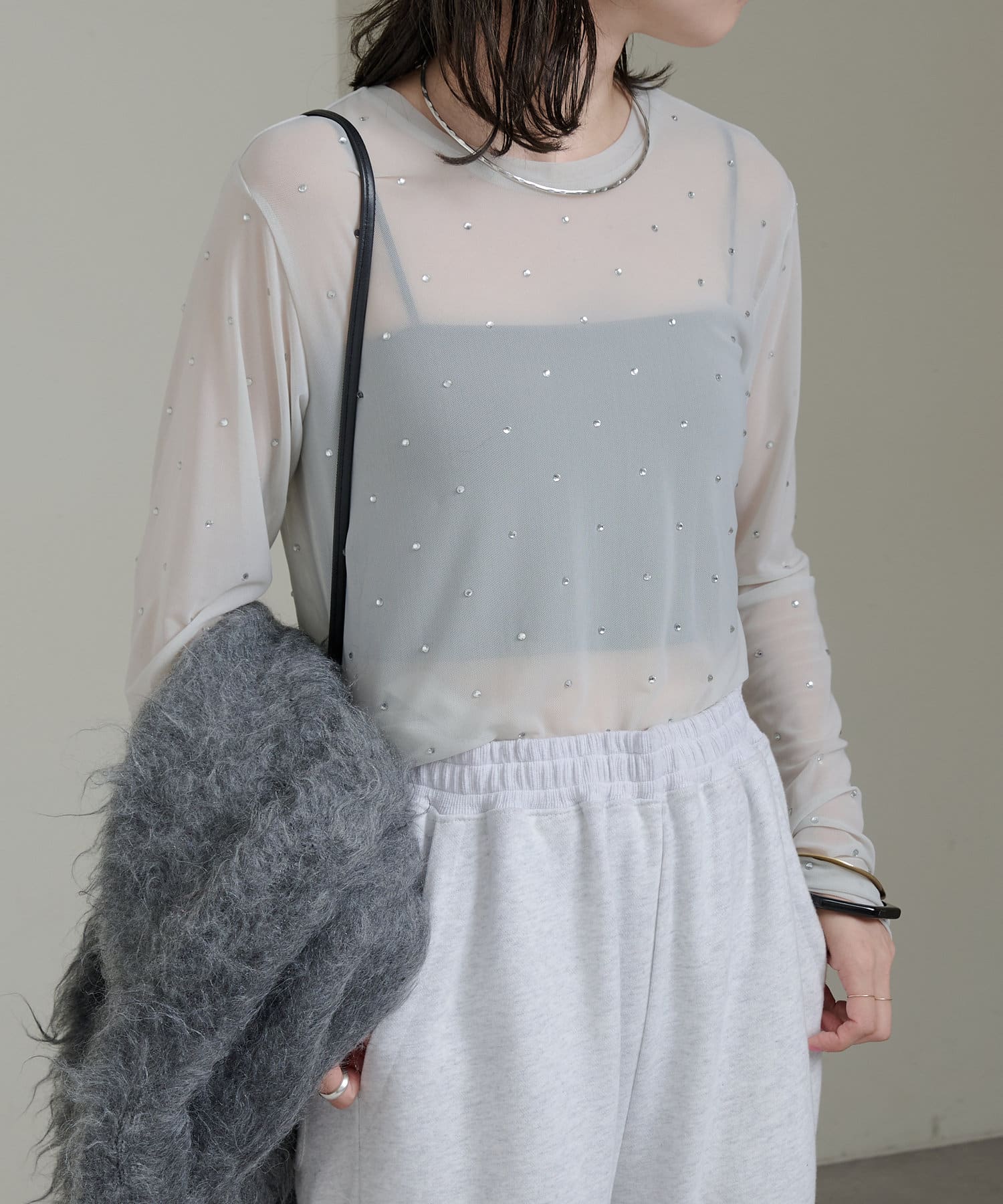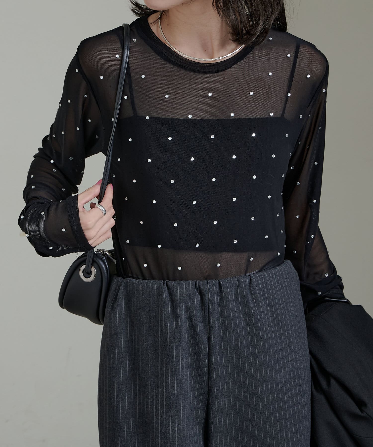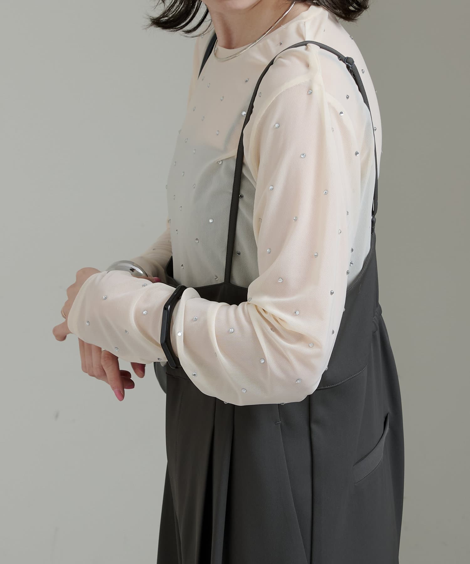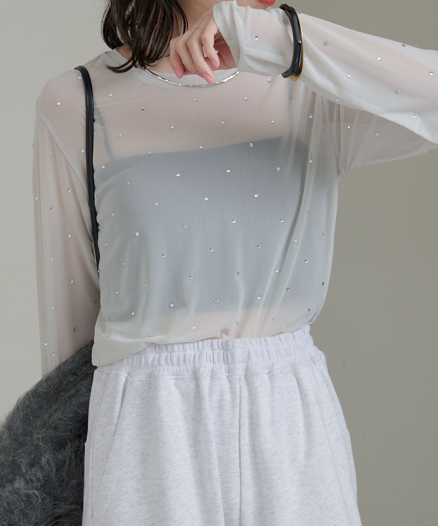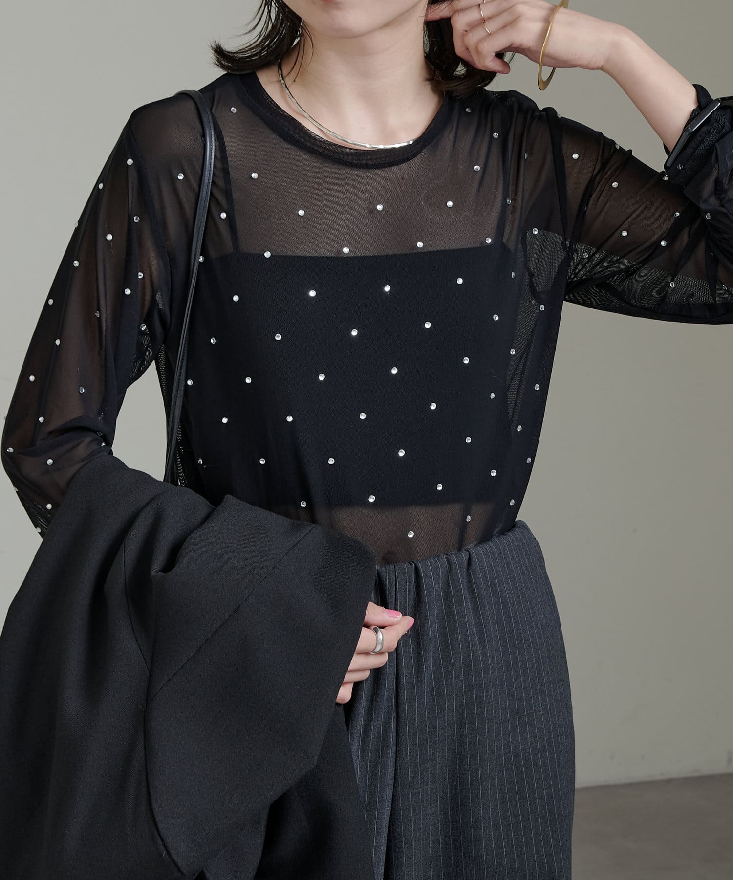 ・小さめのきらっと光るビジューがスタイリングに映える1枚。
