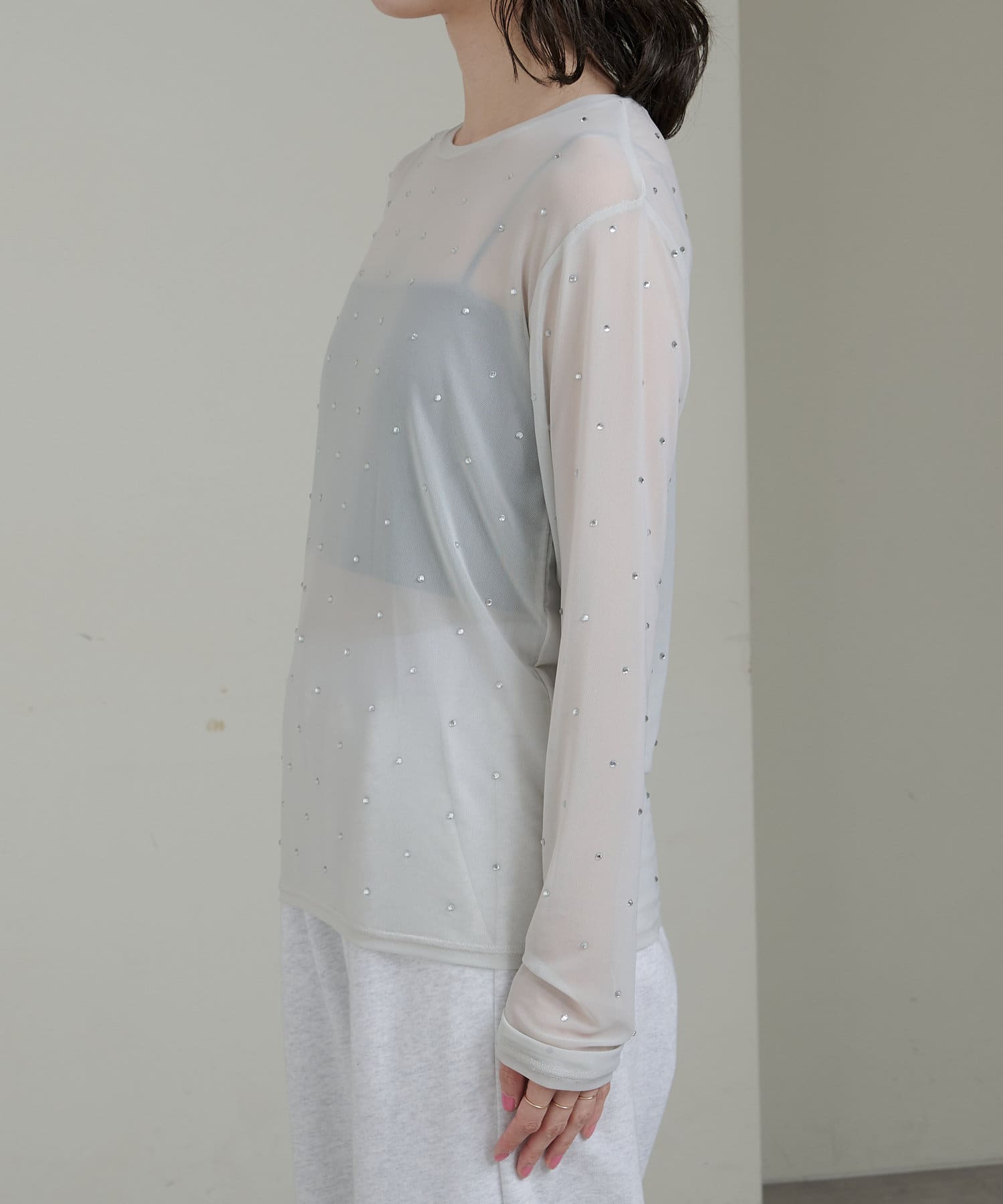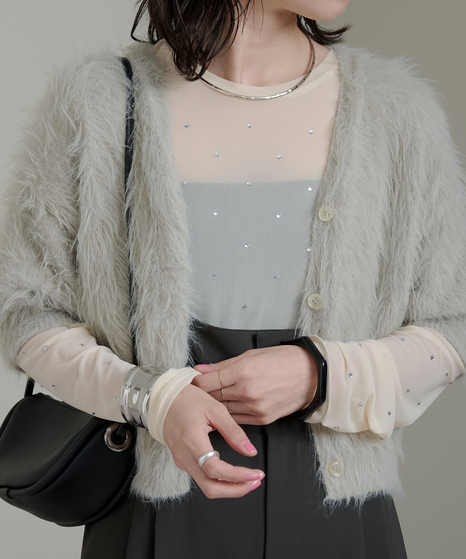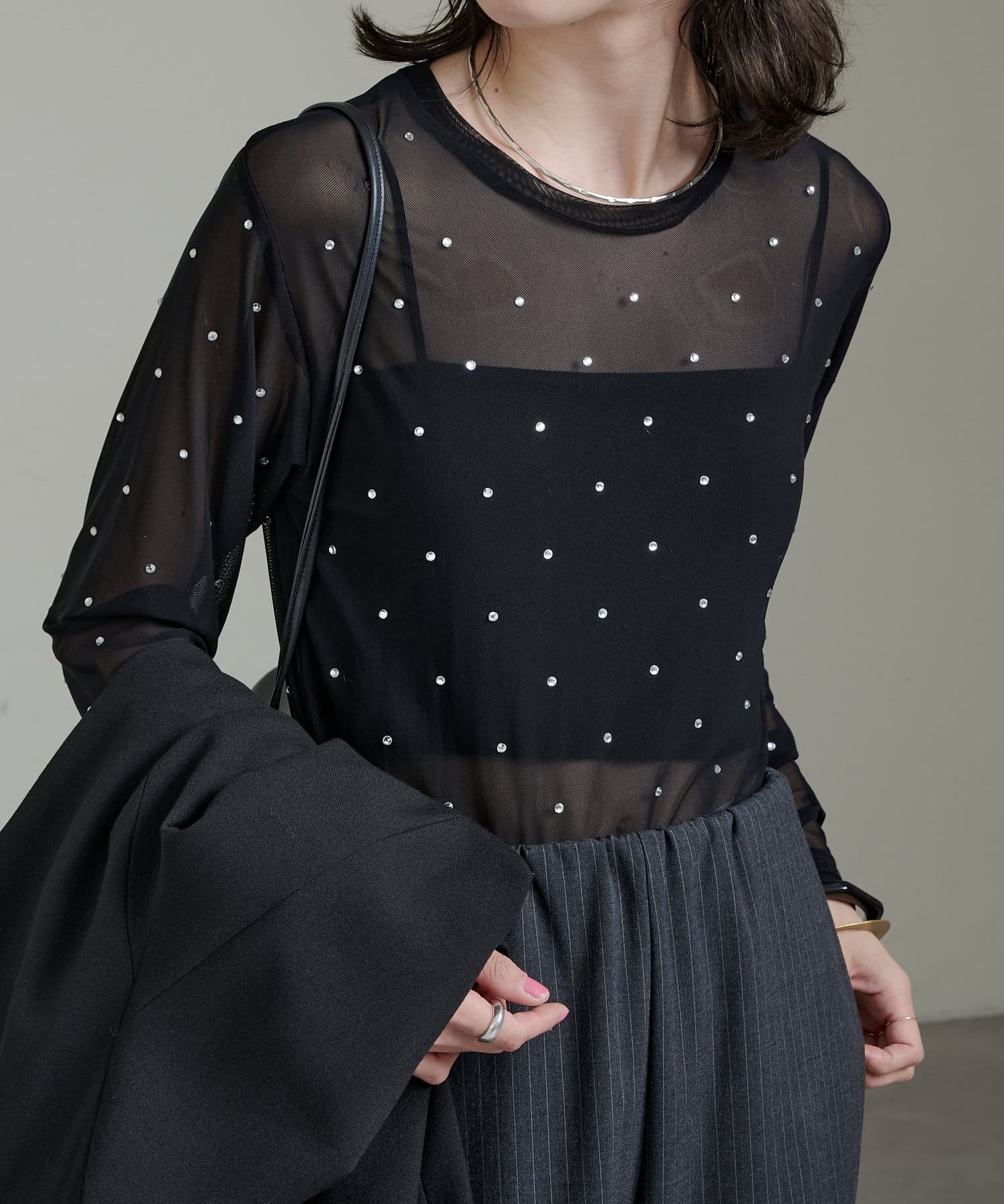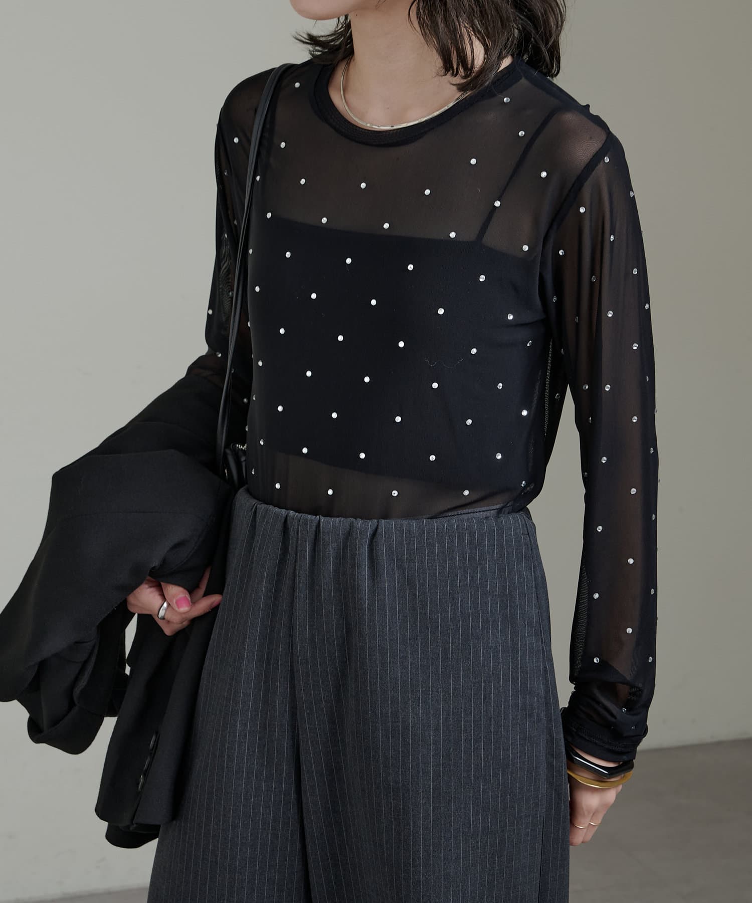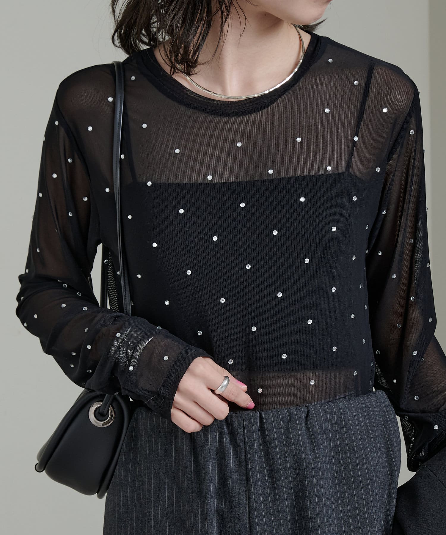 ・小さめのきらっと光るビジューがスタイリングに映える1枚。