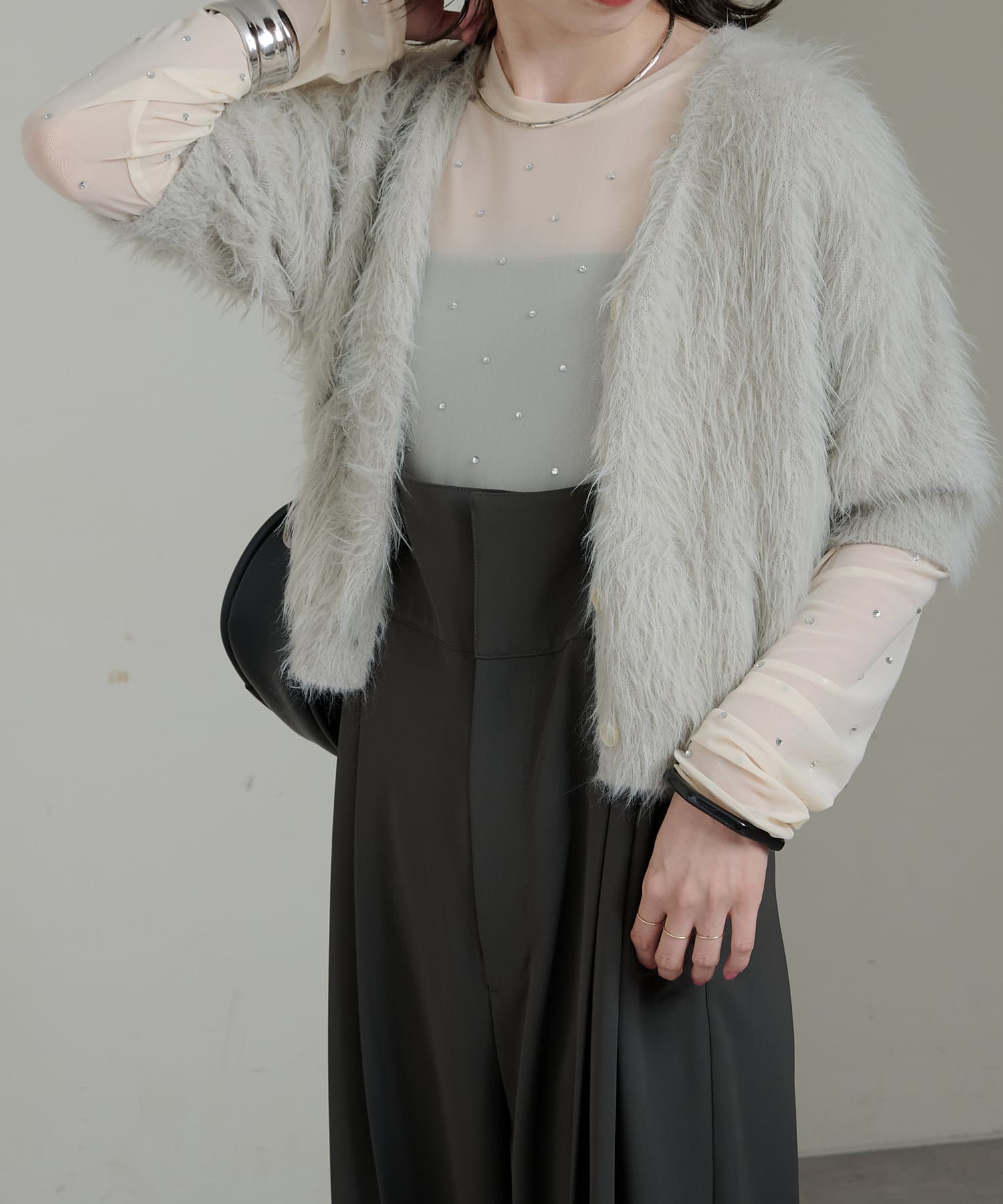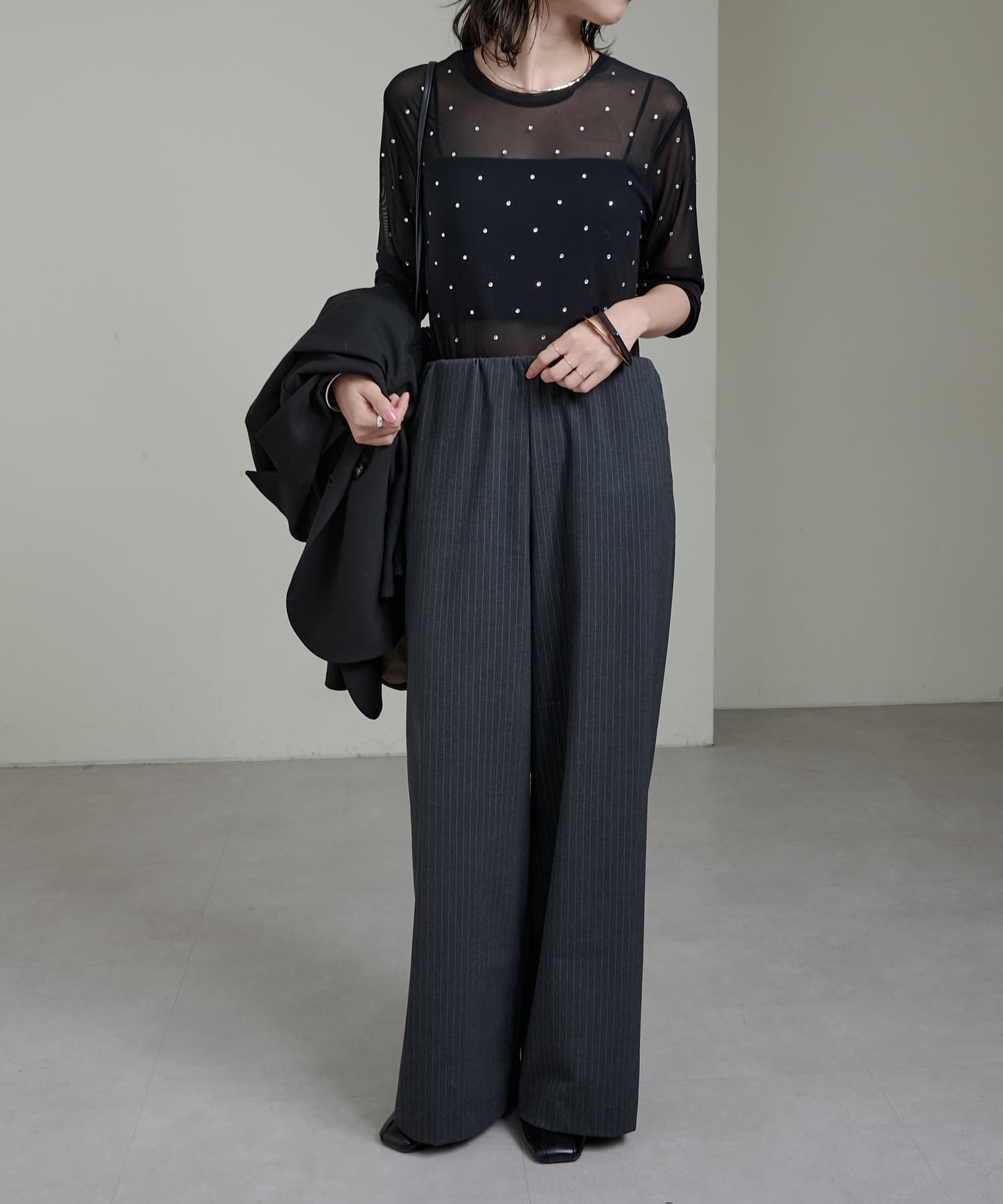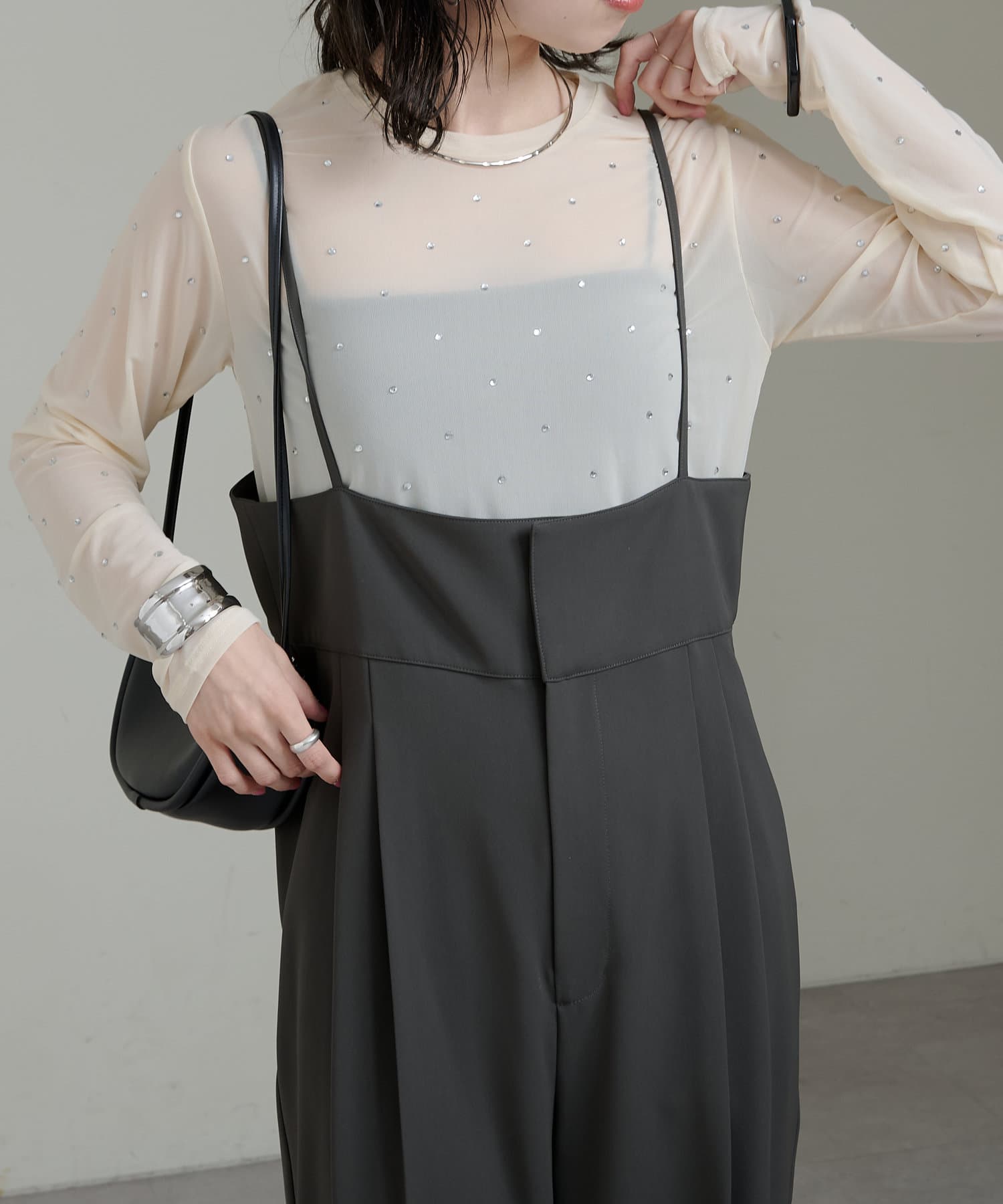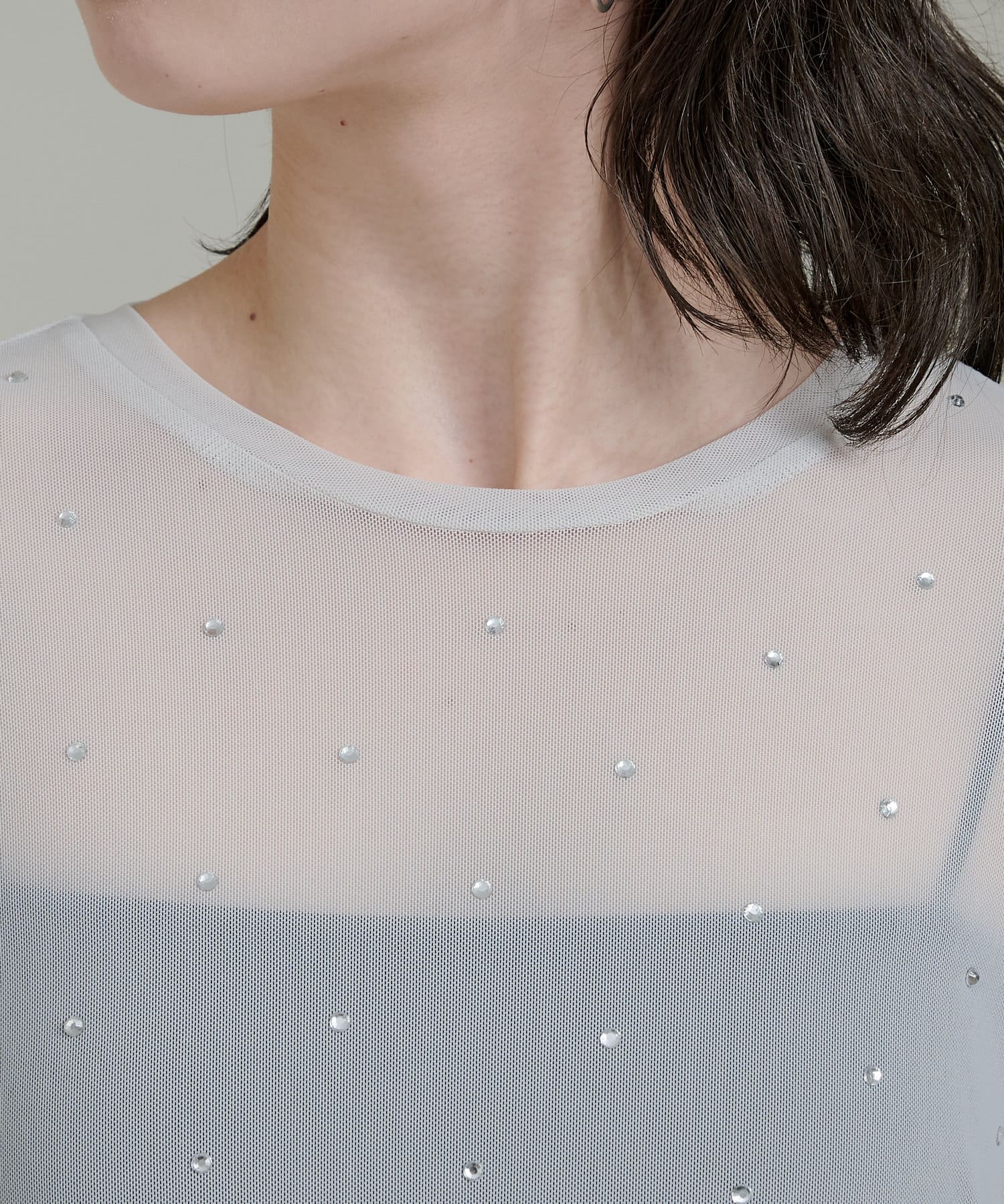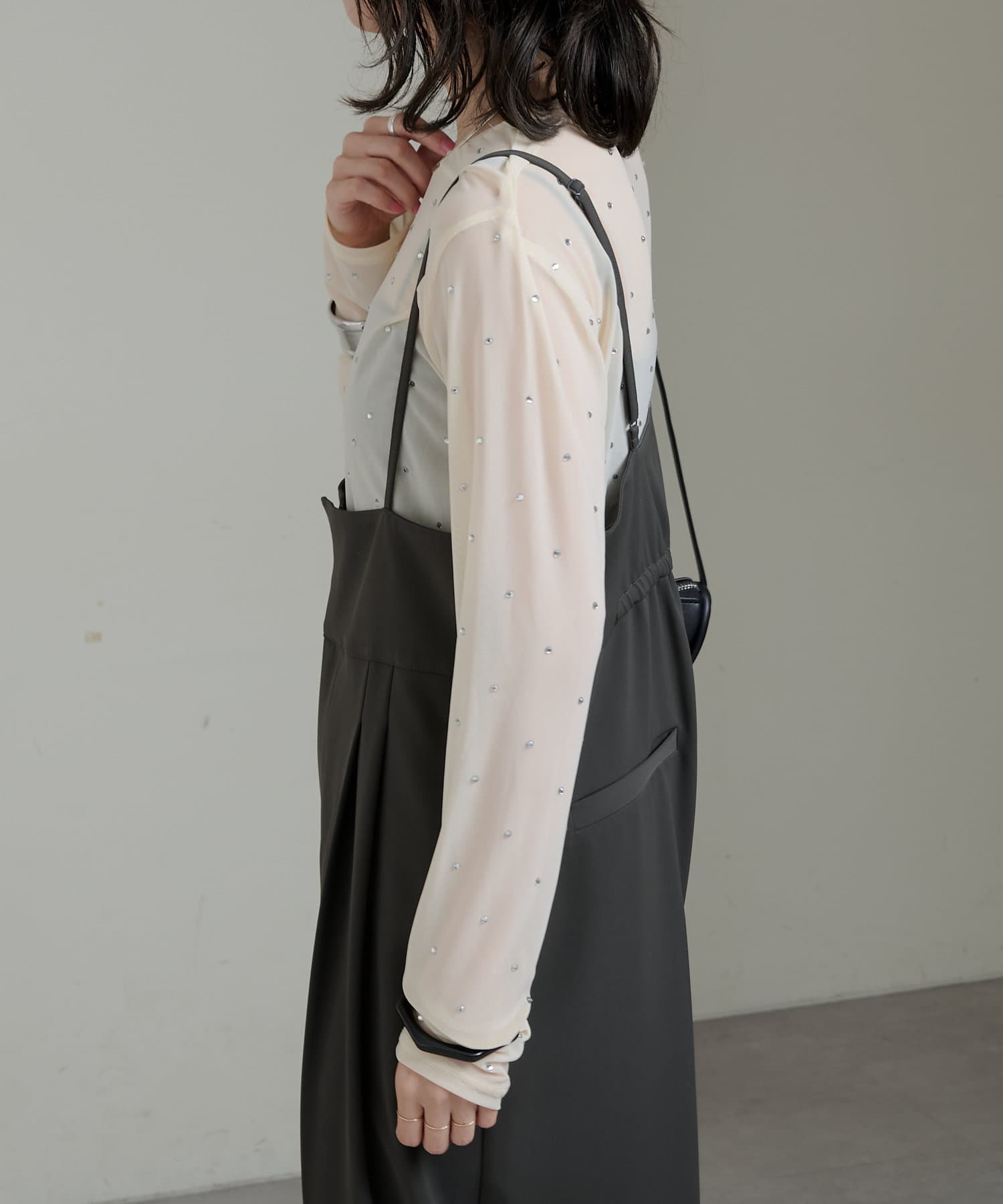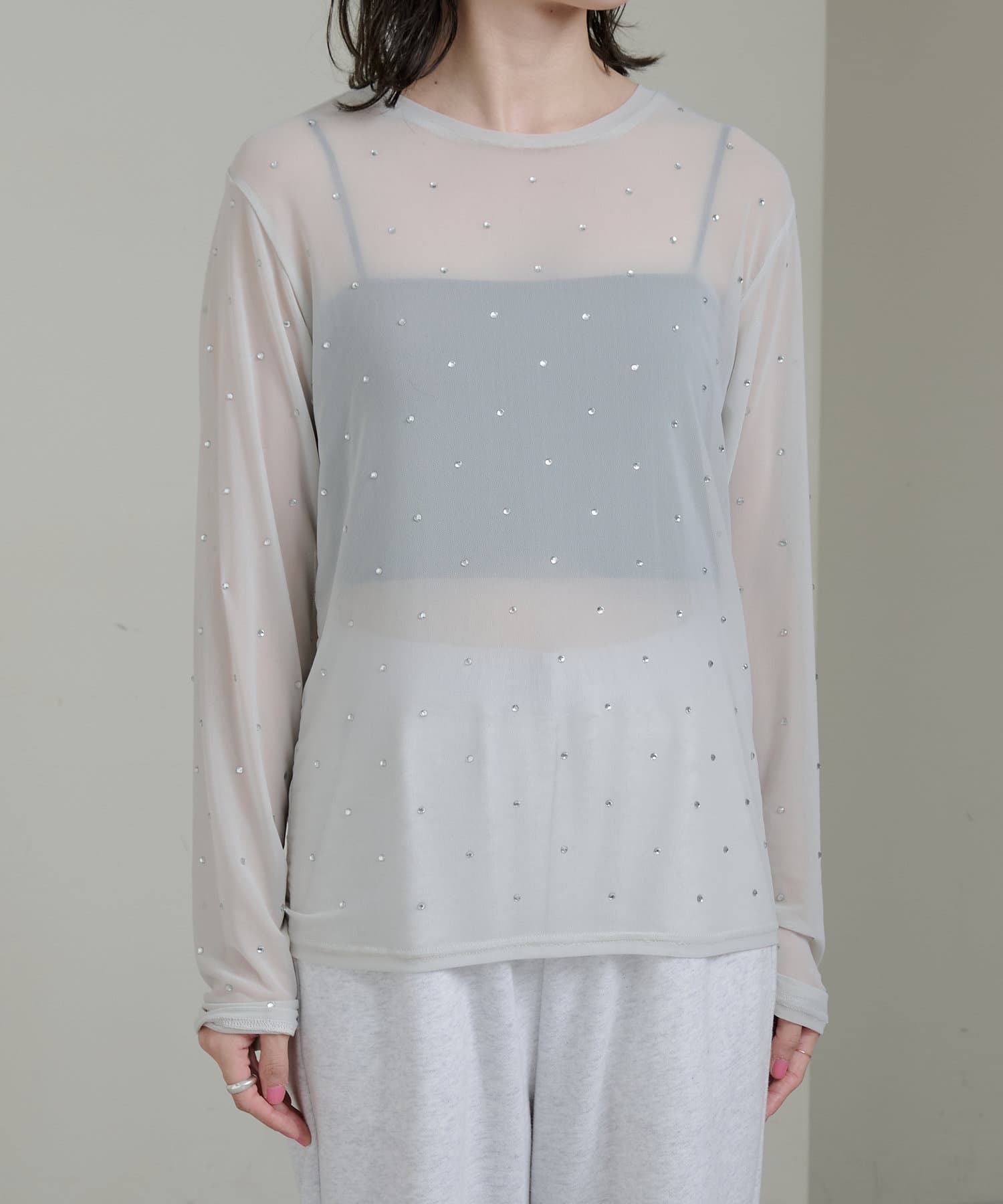 ・小さめのきらっと光るビジューがスタイリングに映える1枚。