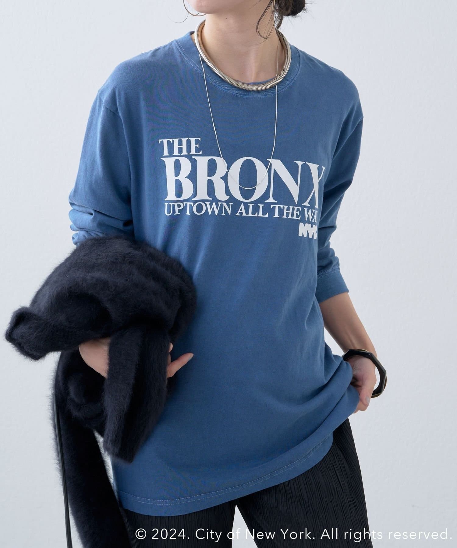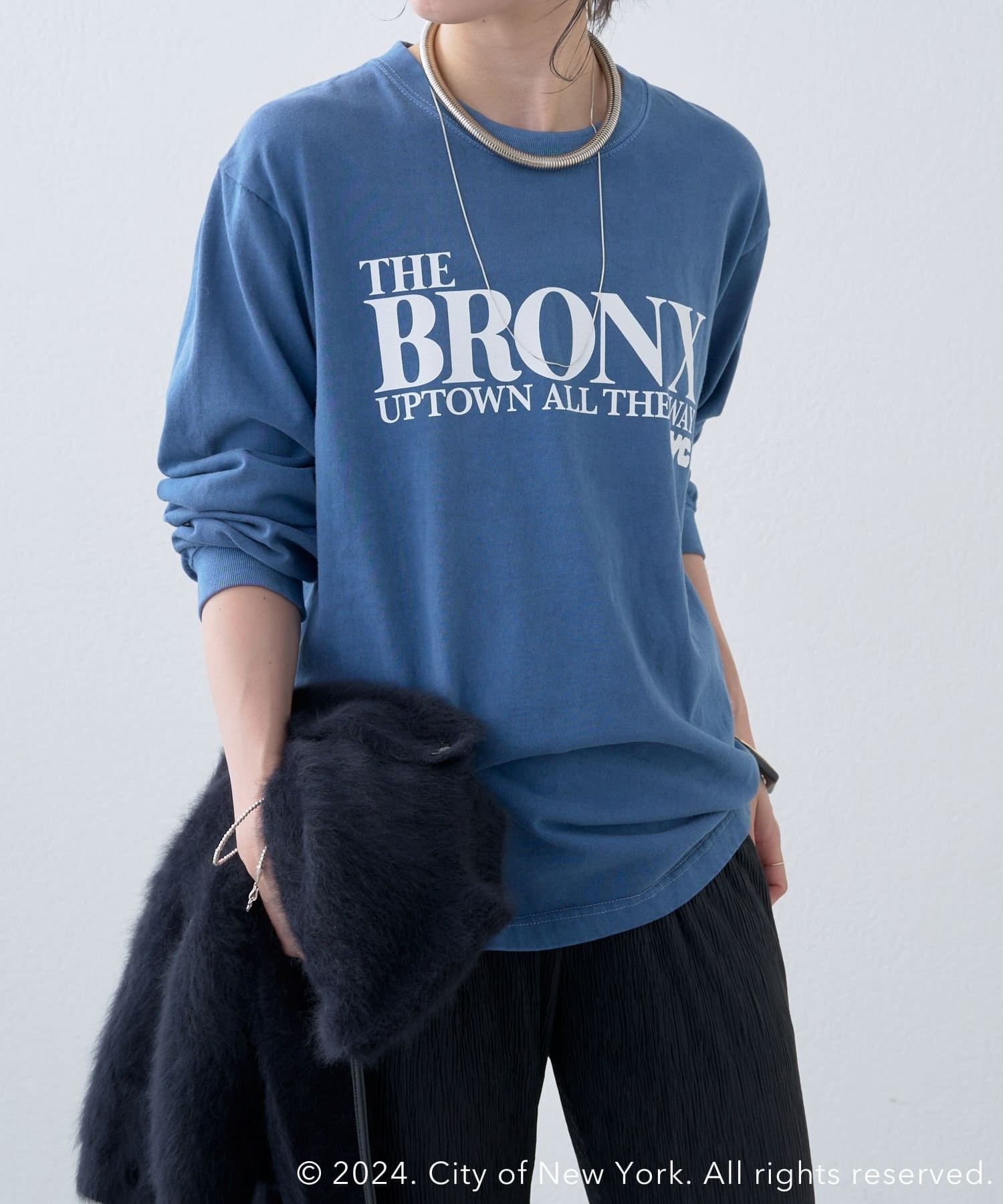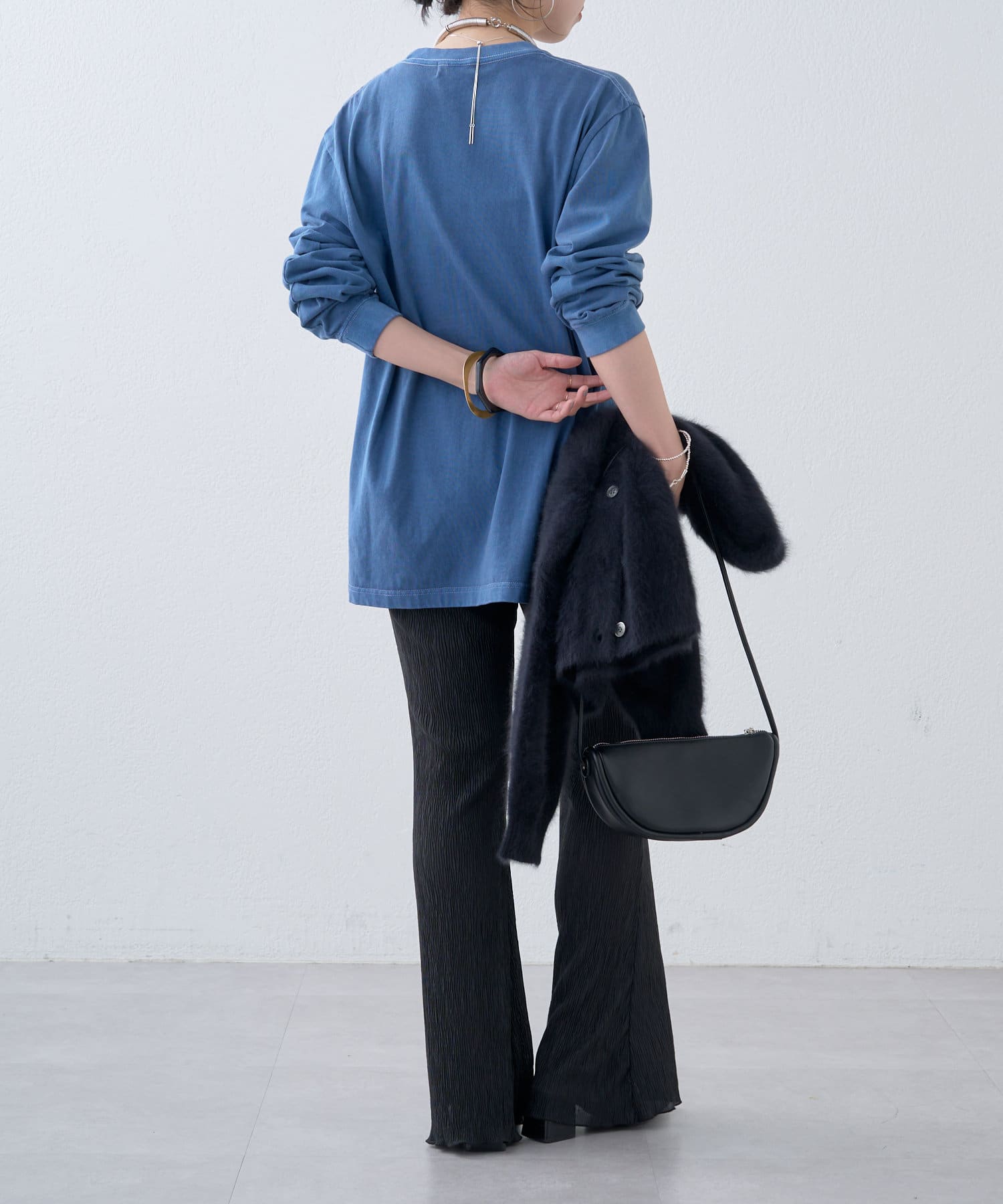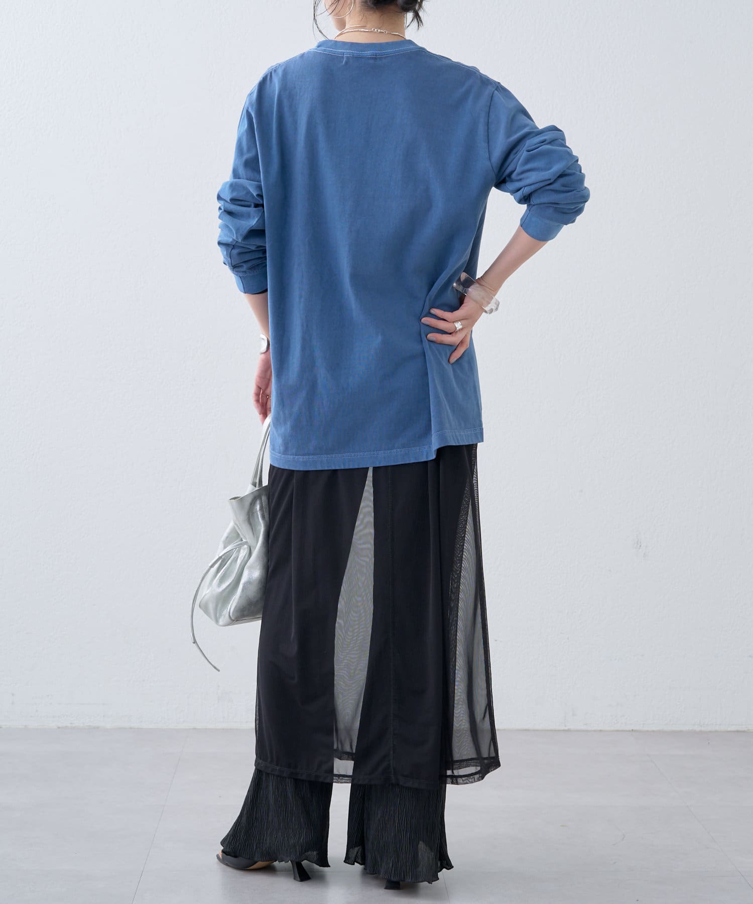 ・ブルーカラーがコーディネートのポイントになる1枚。