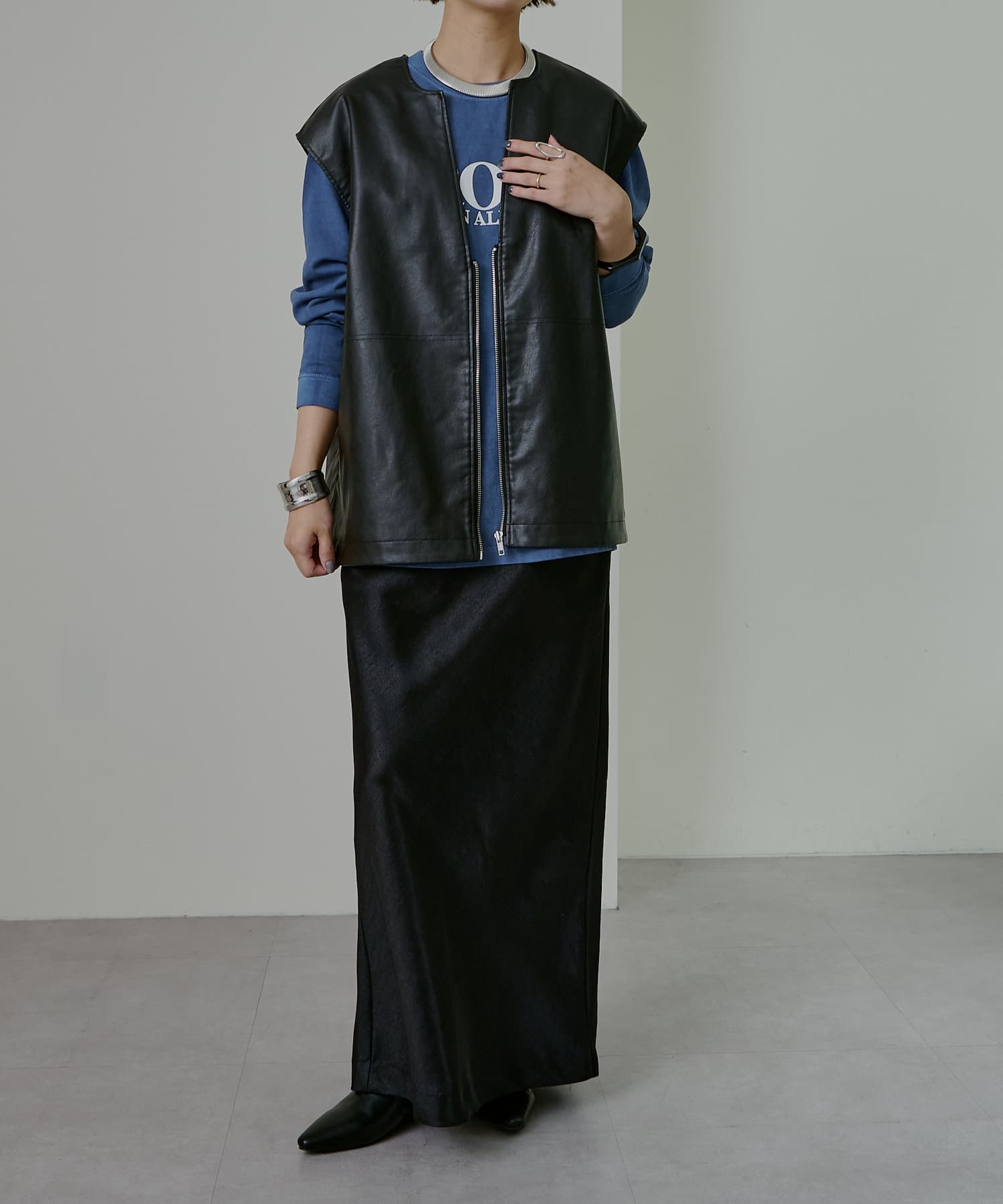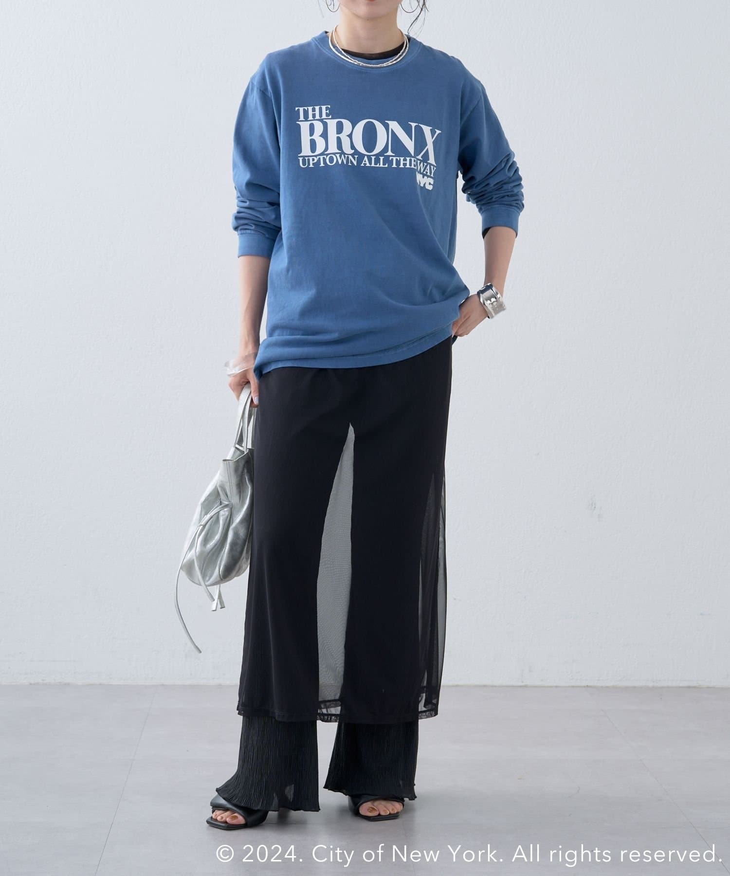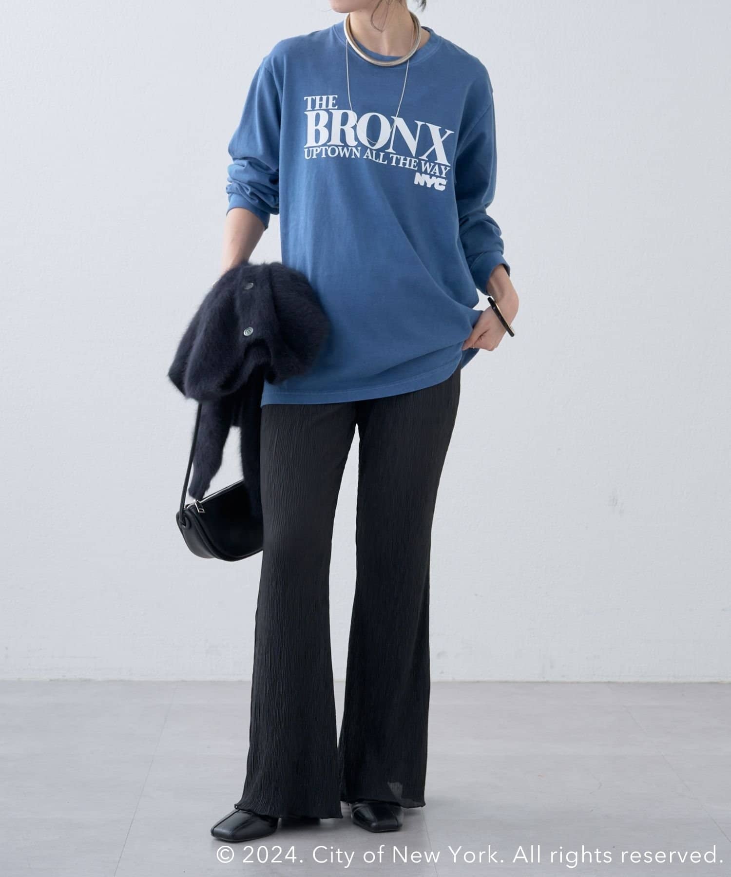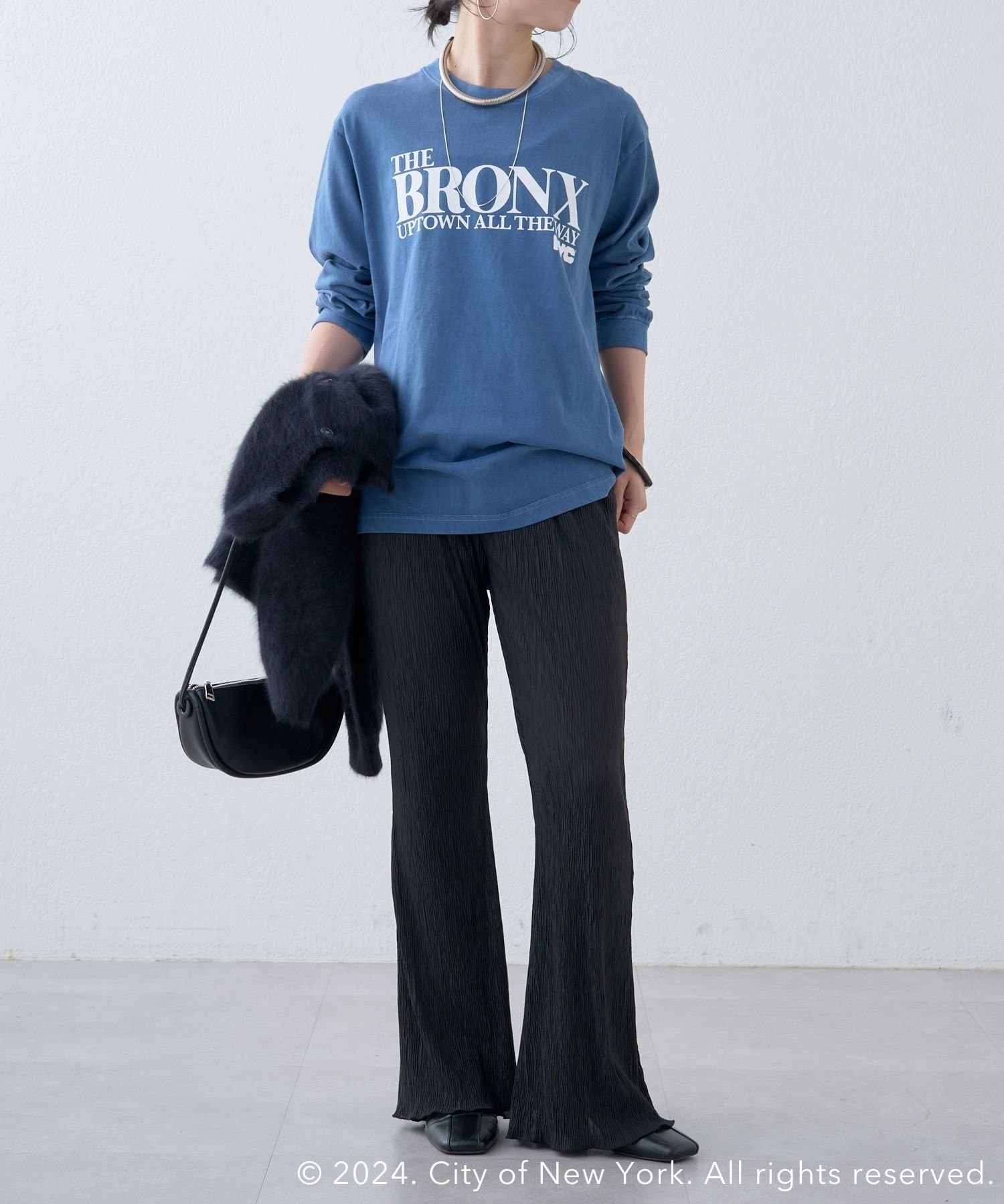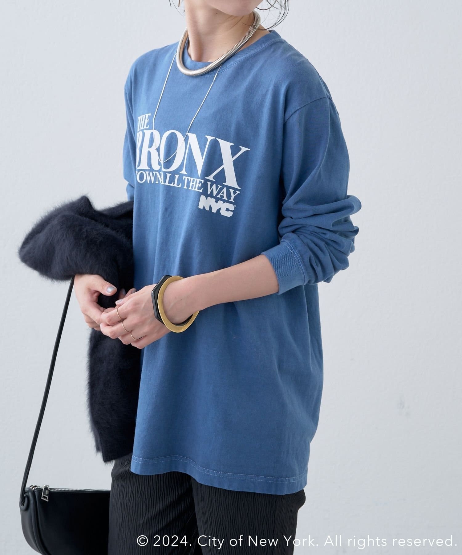 ・ブルーカラーがコーディネートのポイントになる1枚。