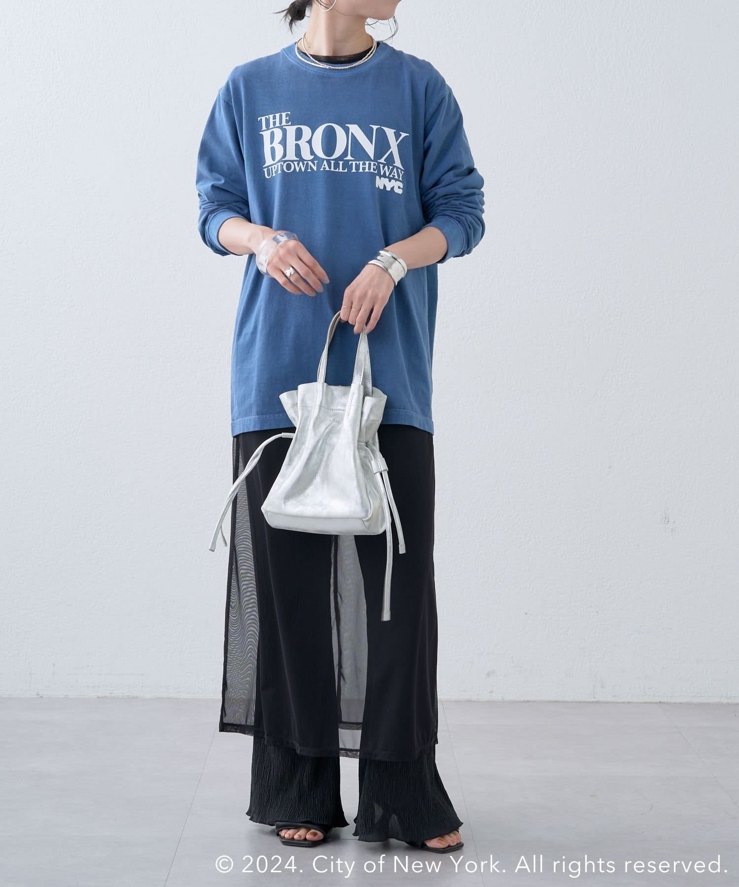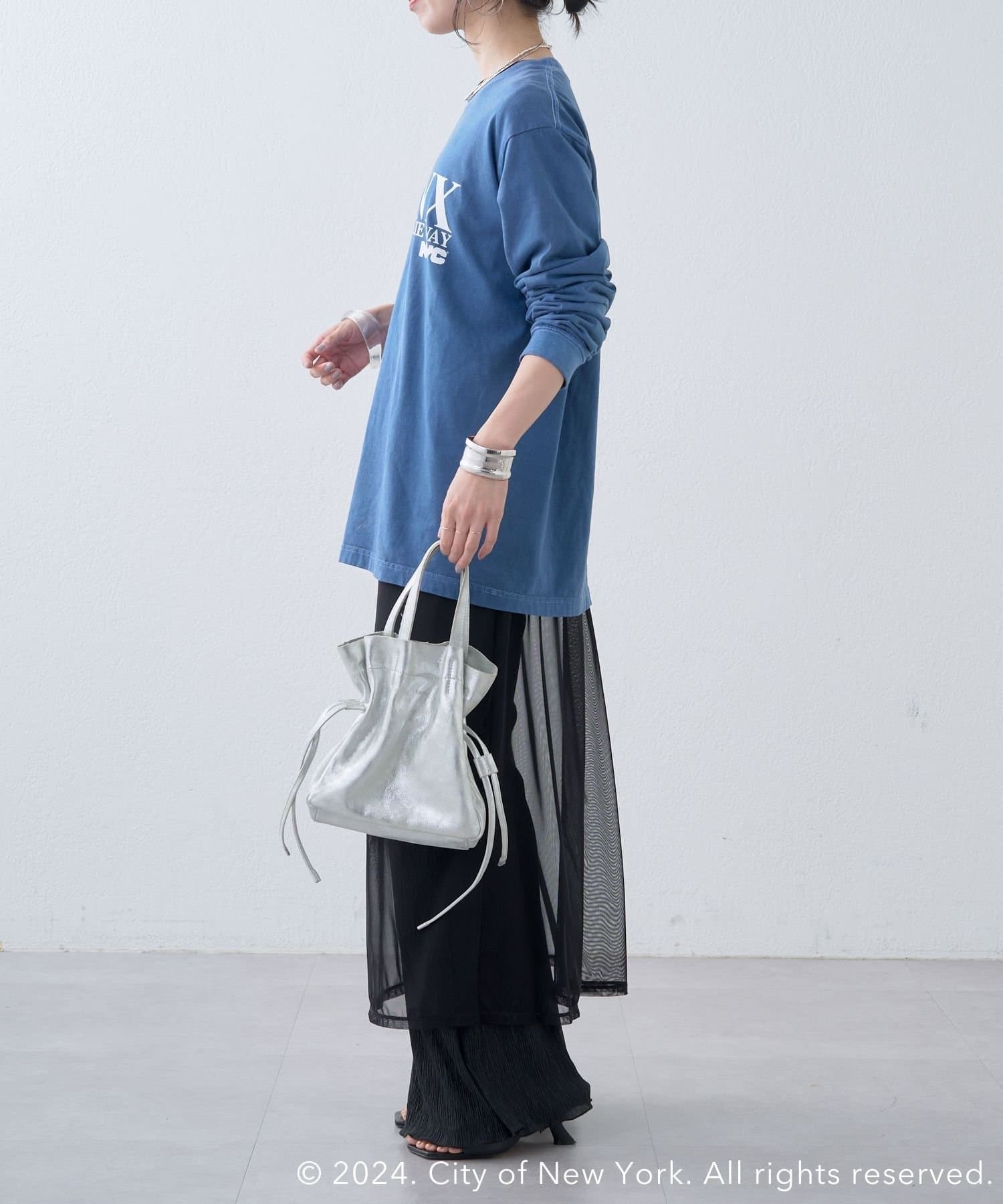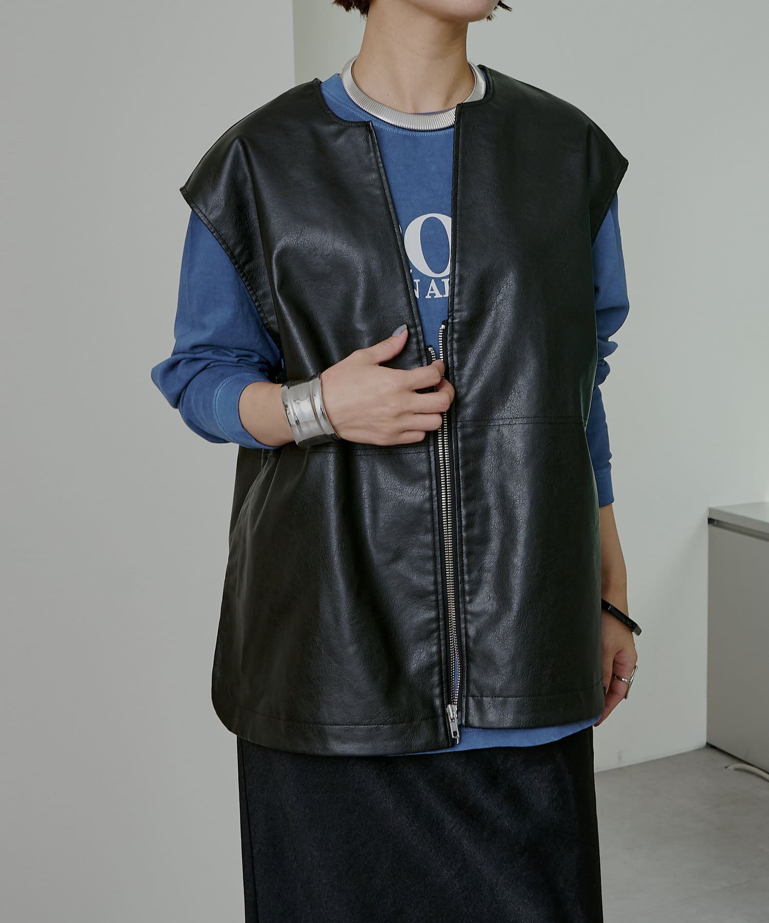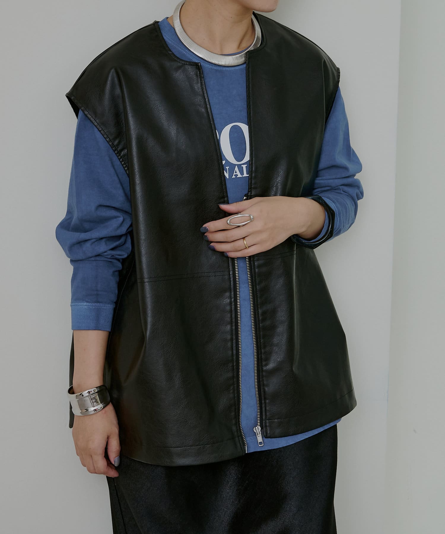 ・ブルーカラーがコーディネートのポイントになる1枚。