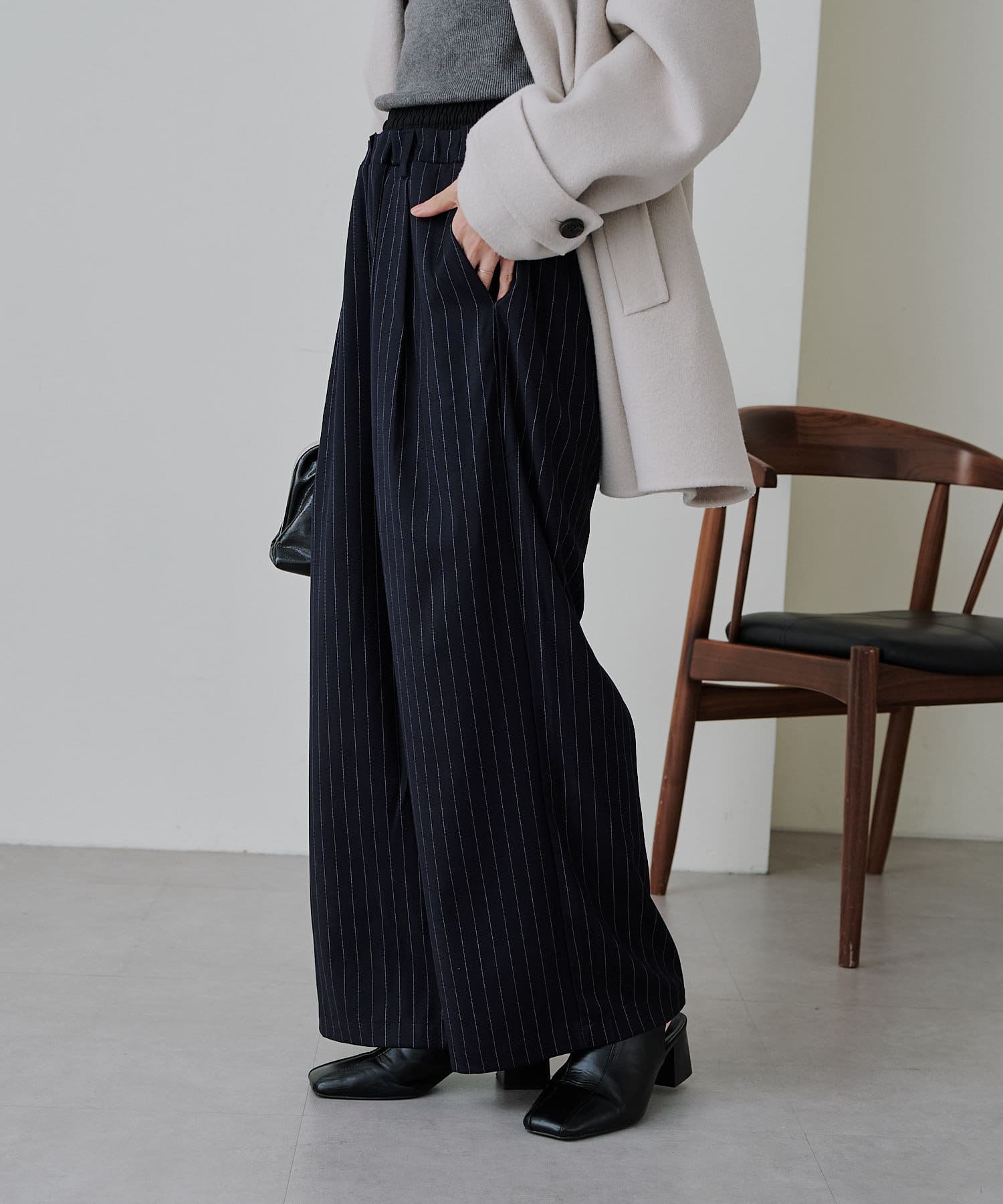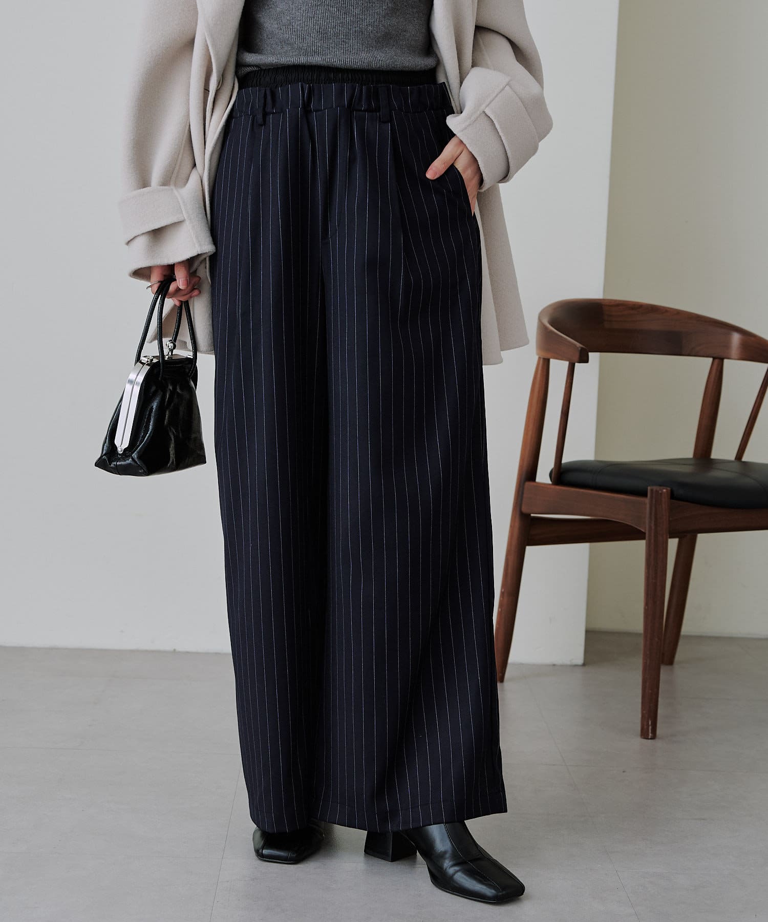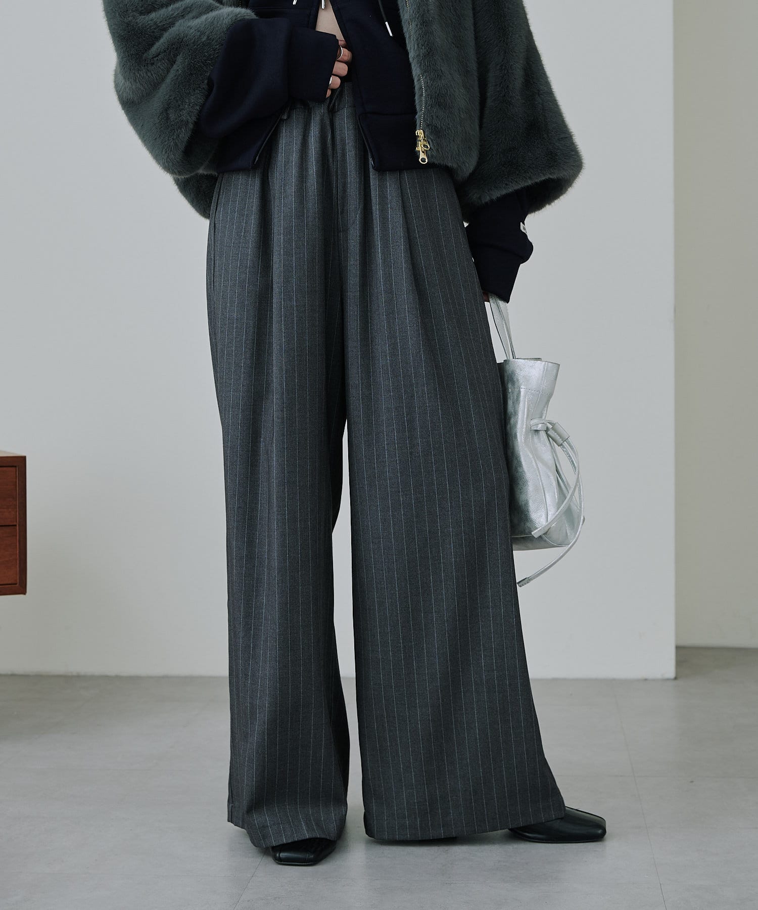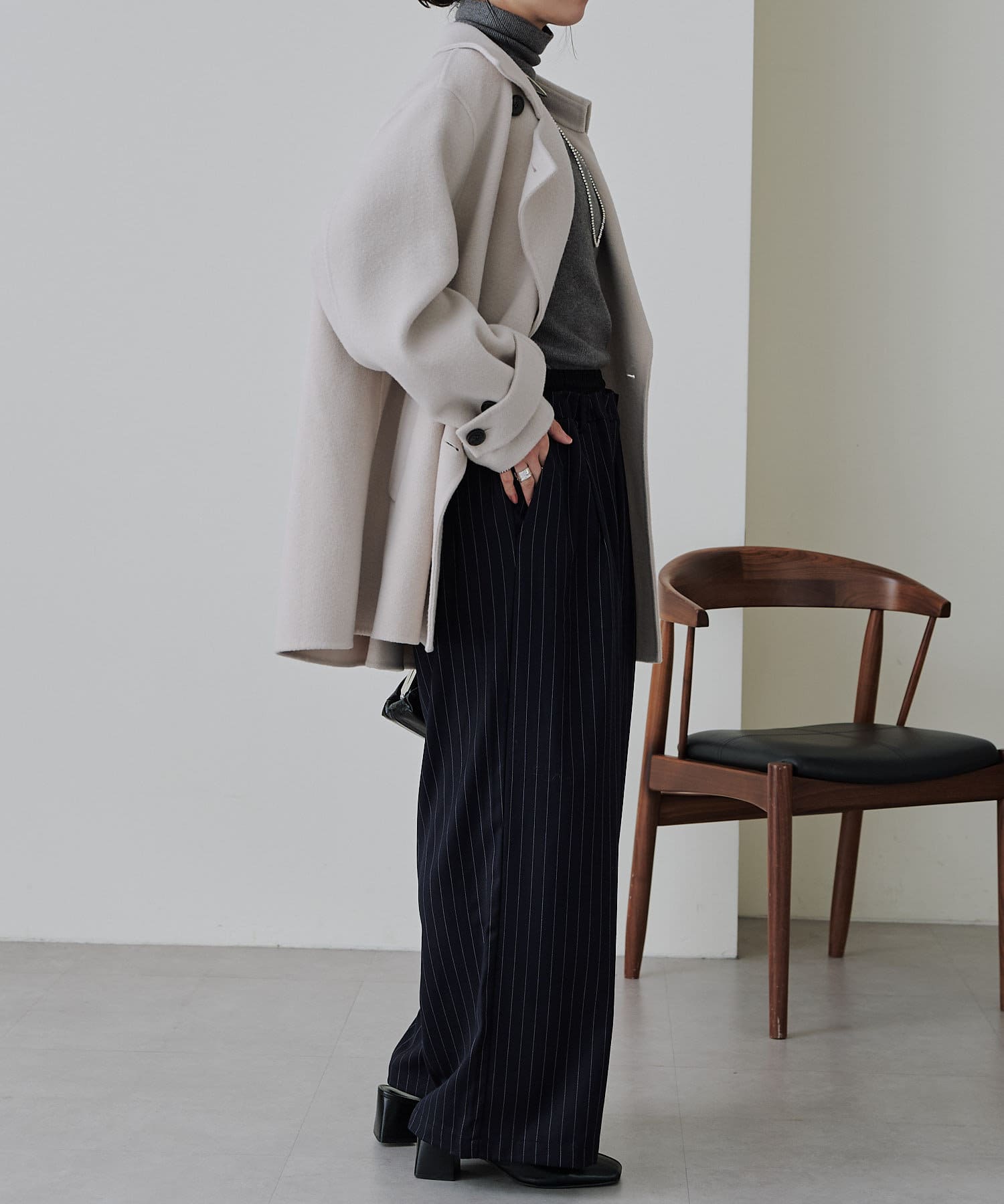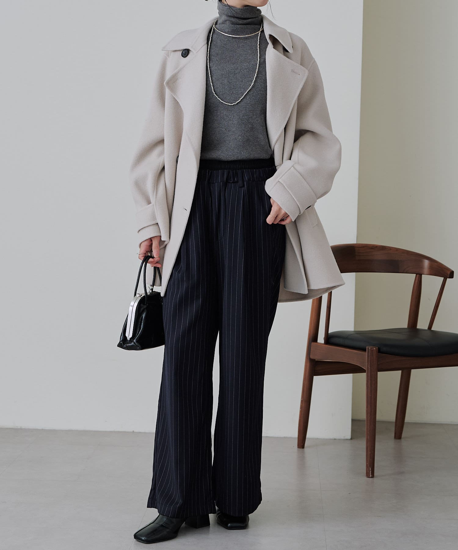 ・モードな雰囲気で着られるグレーとネイビーのピンストライプ。