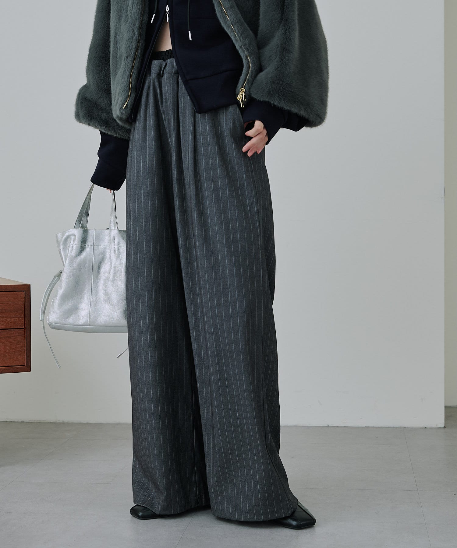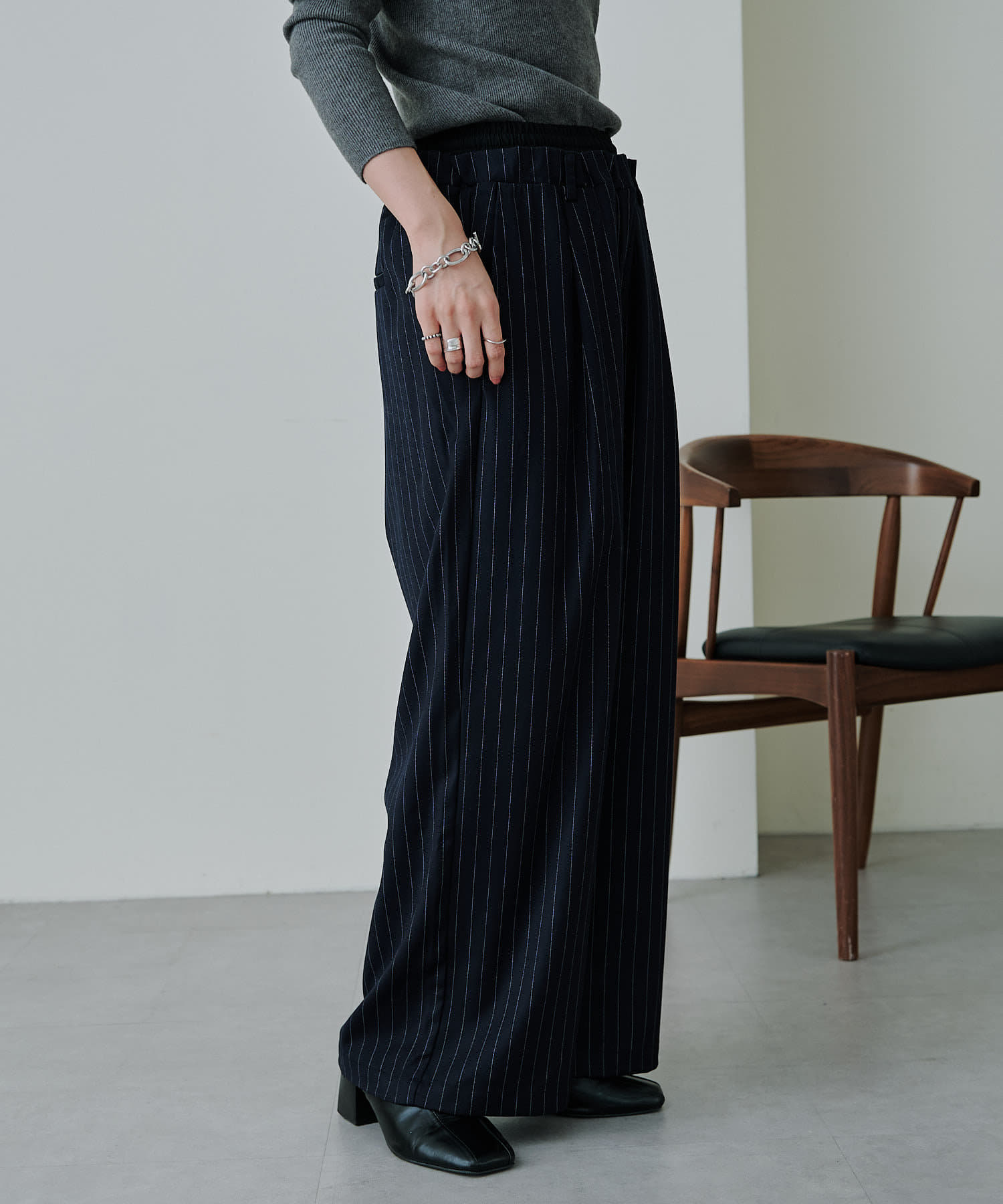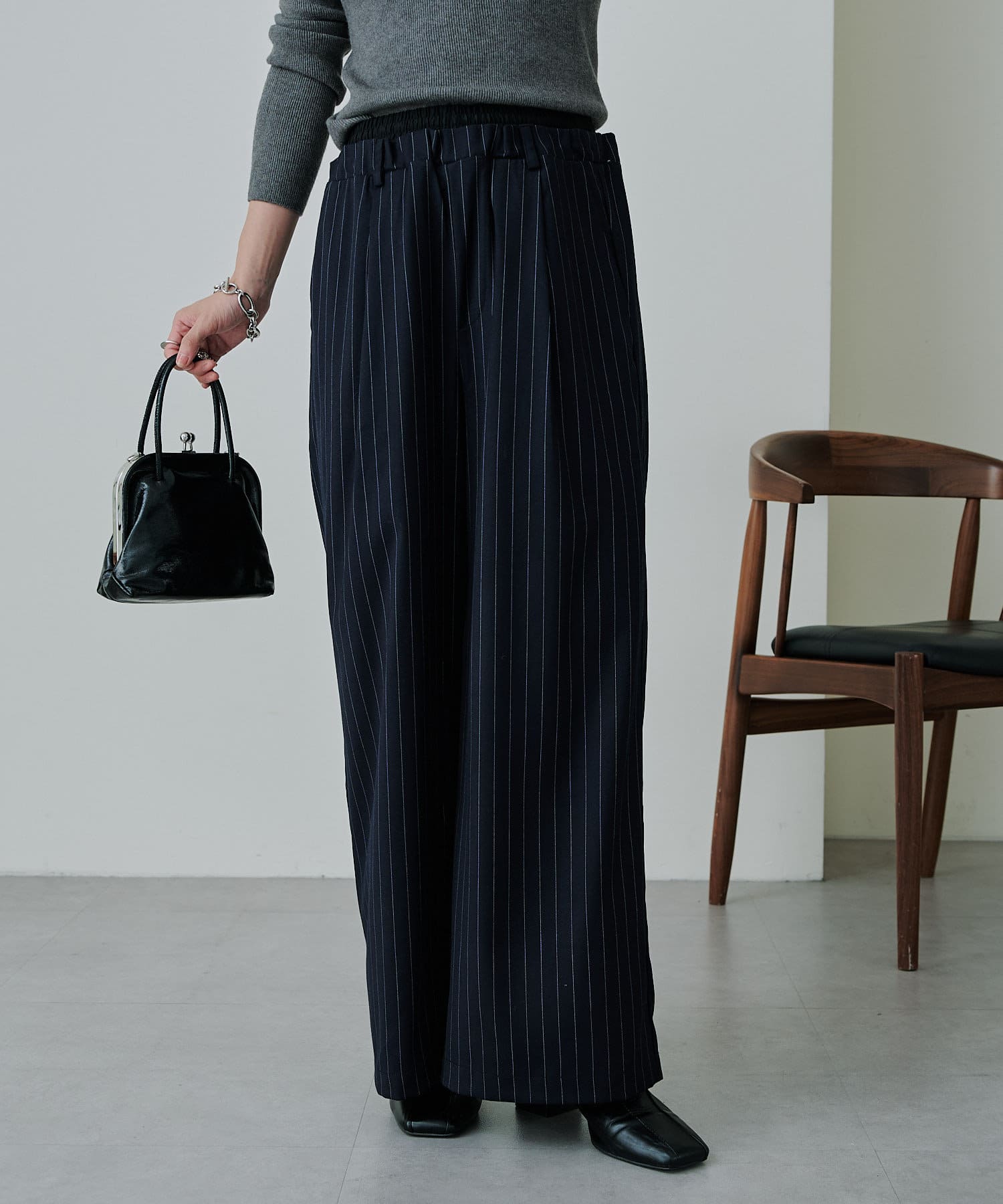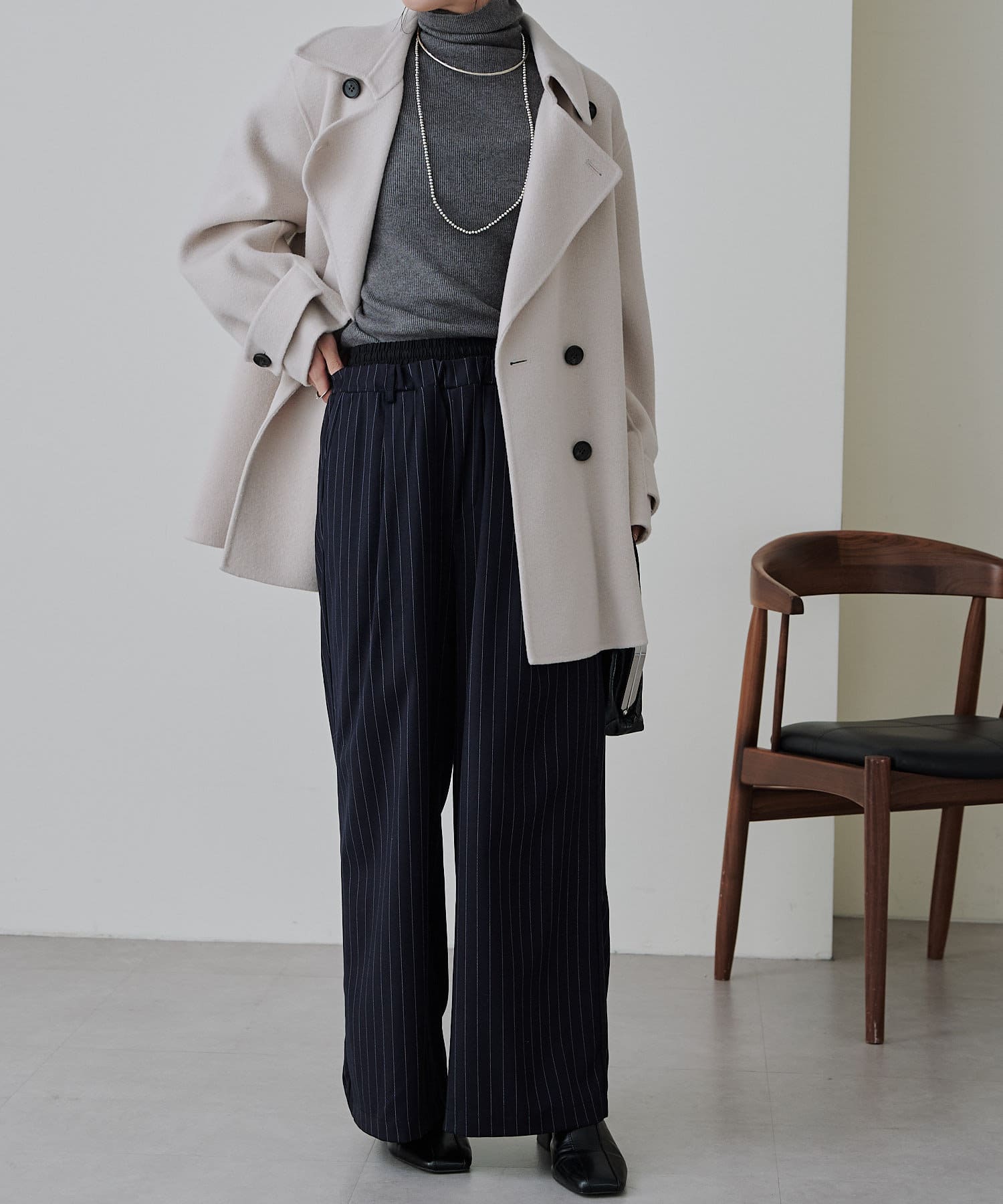 ・モードな雰囲気で着られるグレーとネイビーのピンストライプ。