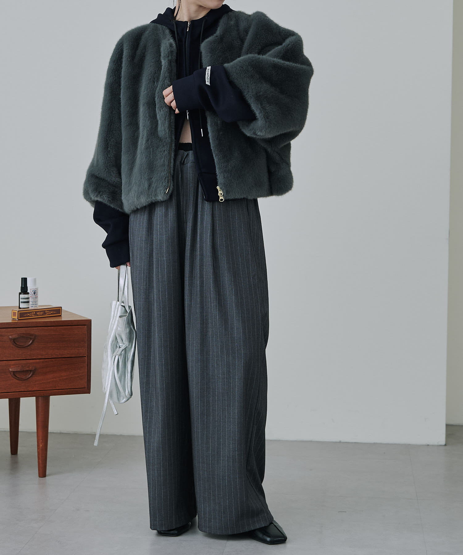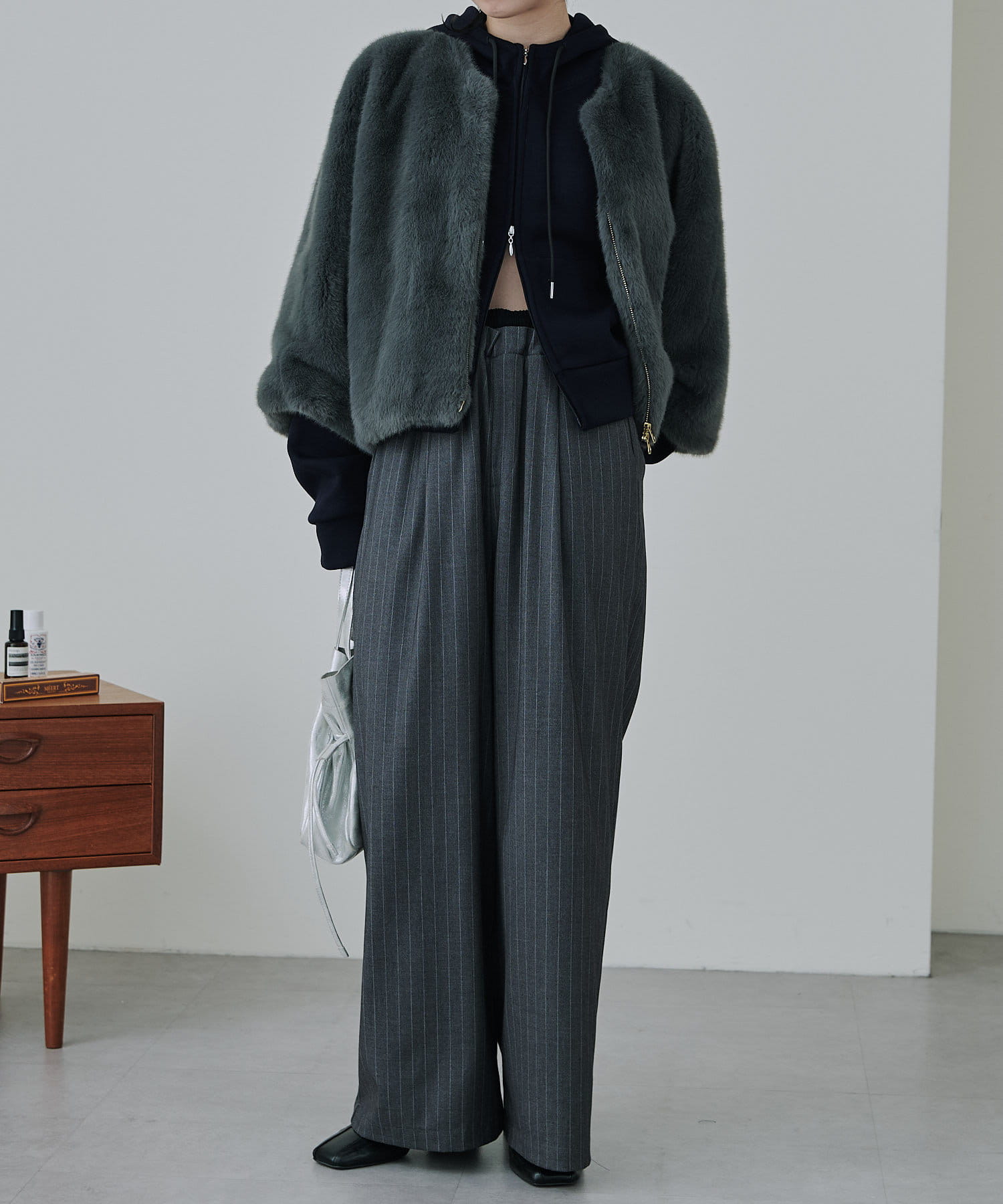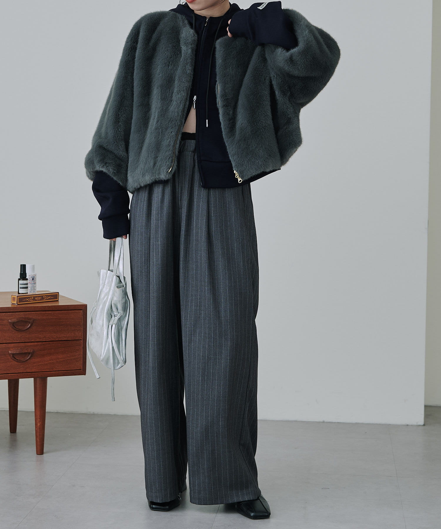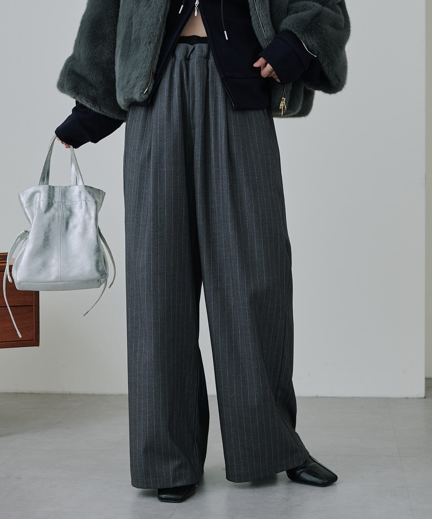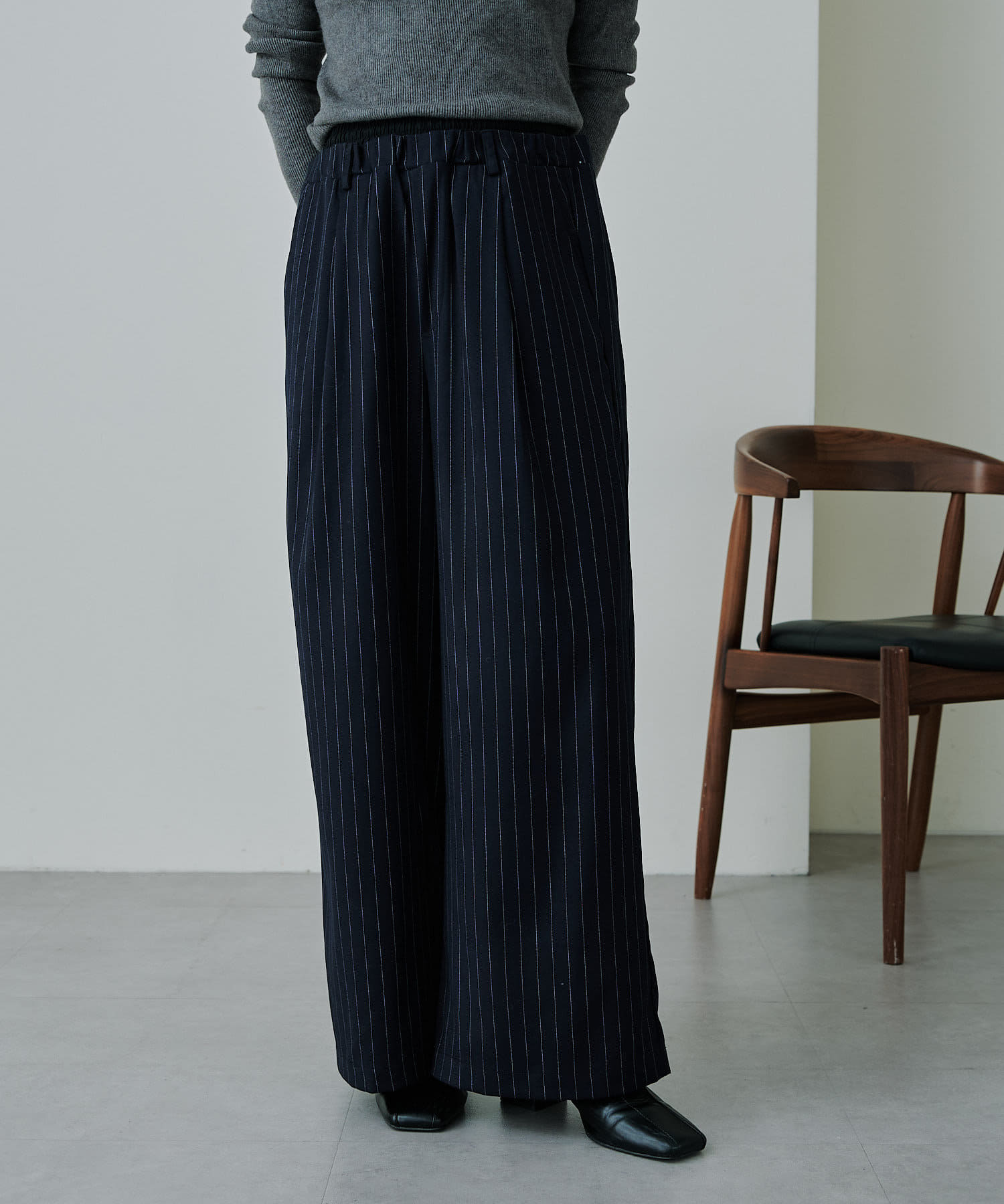 ・モードな雰囲気で着られるグレーとネイビーのピンストライプ。