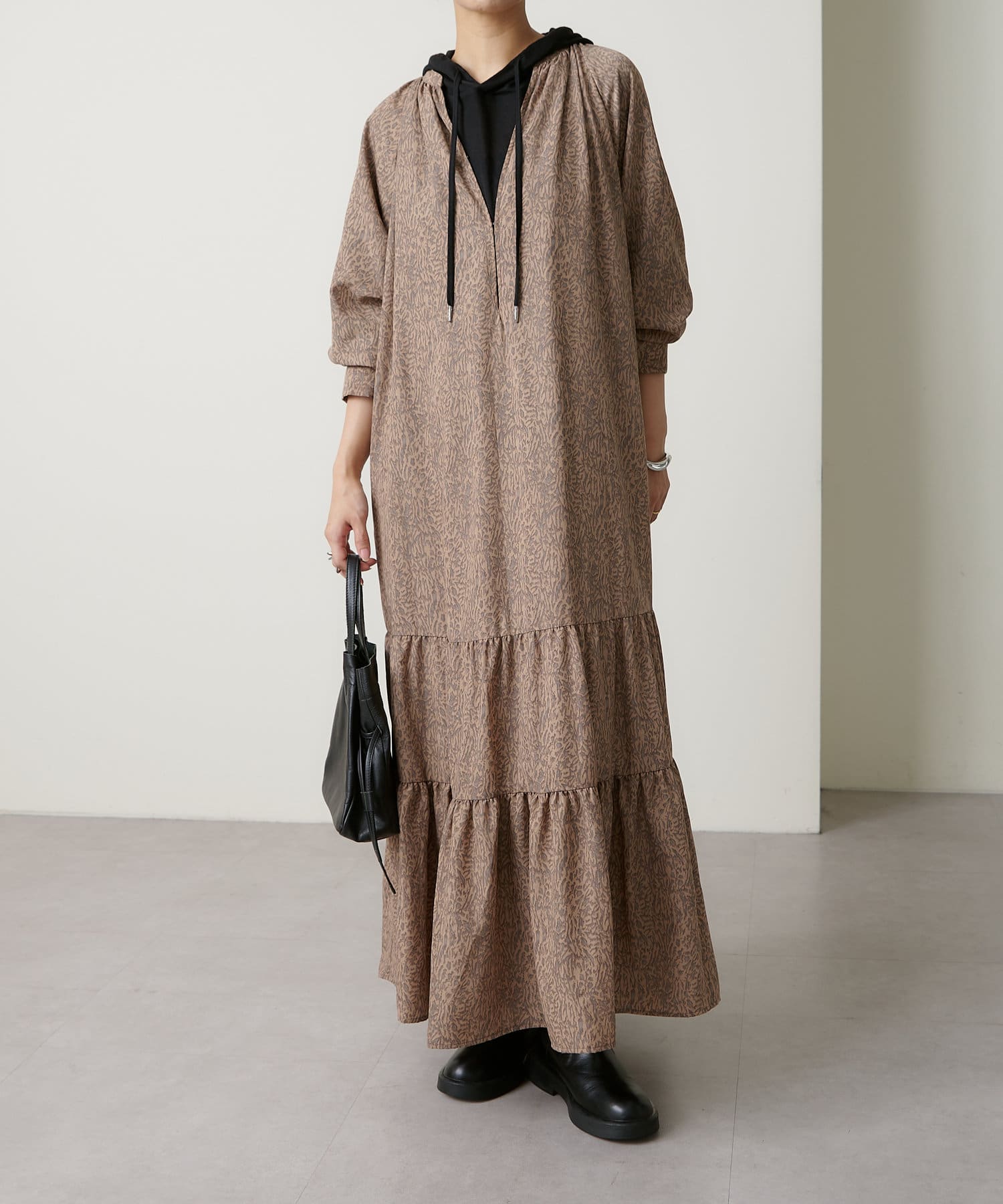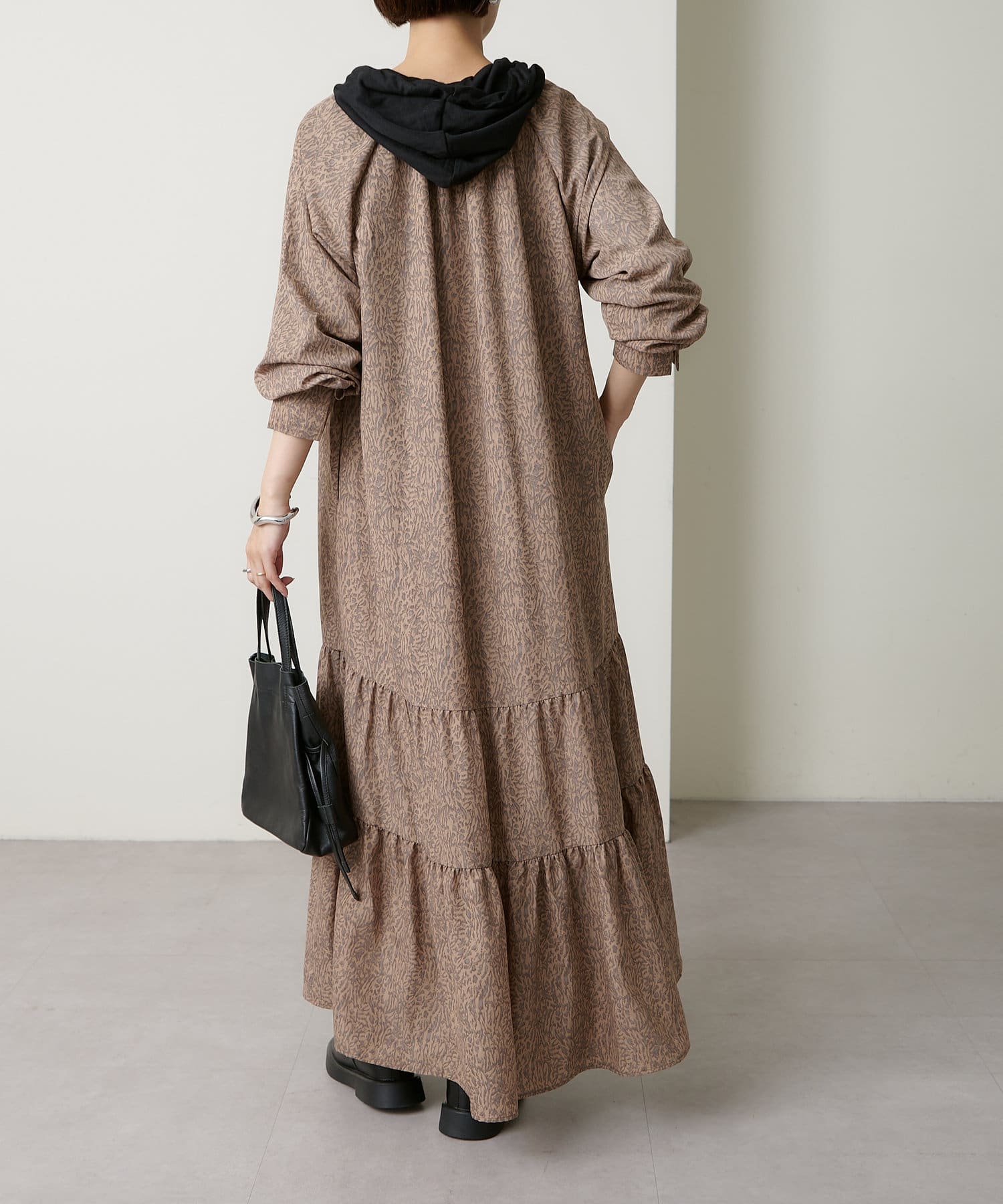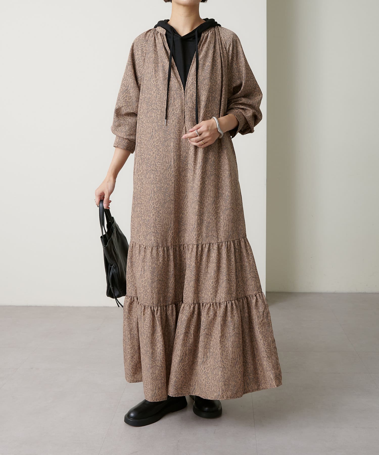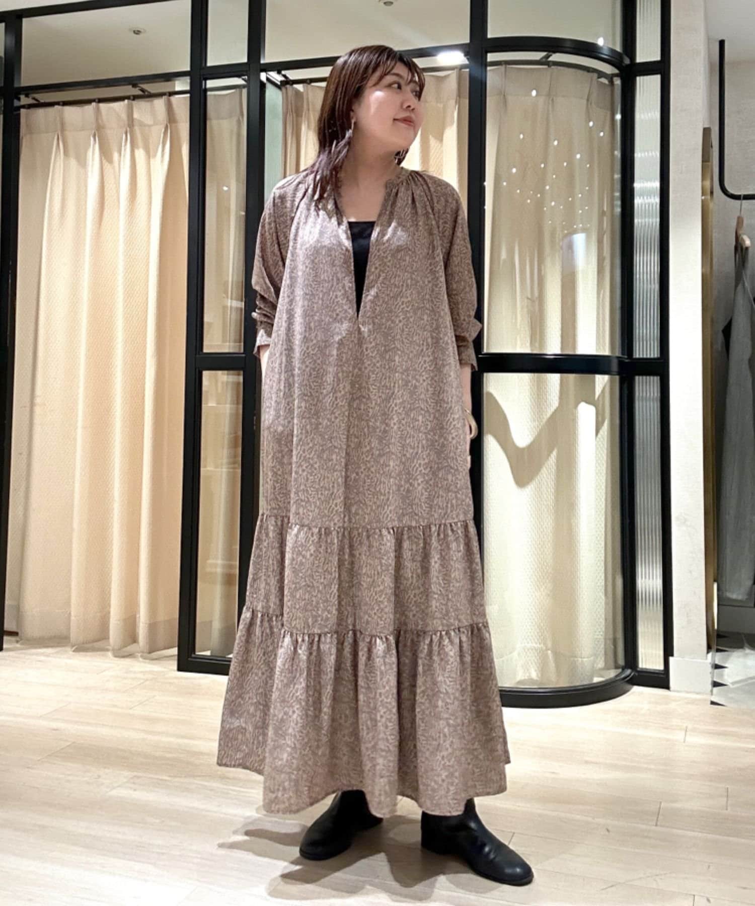 裾はティアードでふんわり可愛いいのに身ごろはスッキリしたつくりで着痩せ効果抜群のワンピースです。いつもは黒が多いですが思い切って色柄物に挑戦しました。いつもと違う雰囲気になりよかったです。