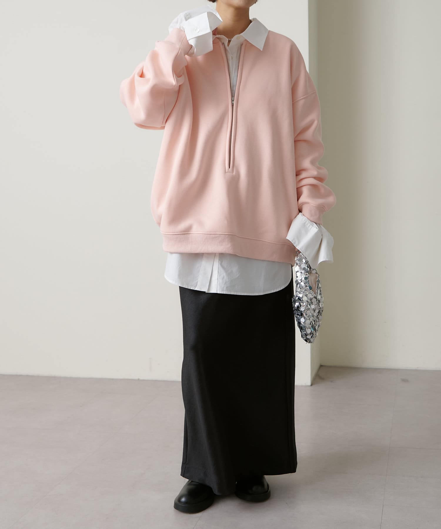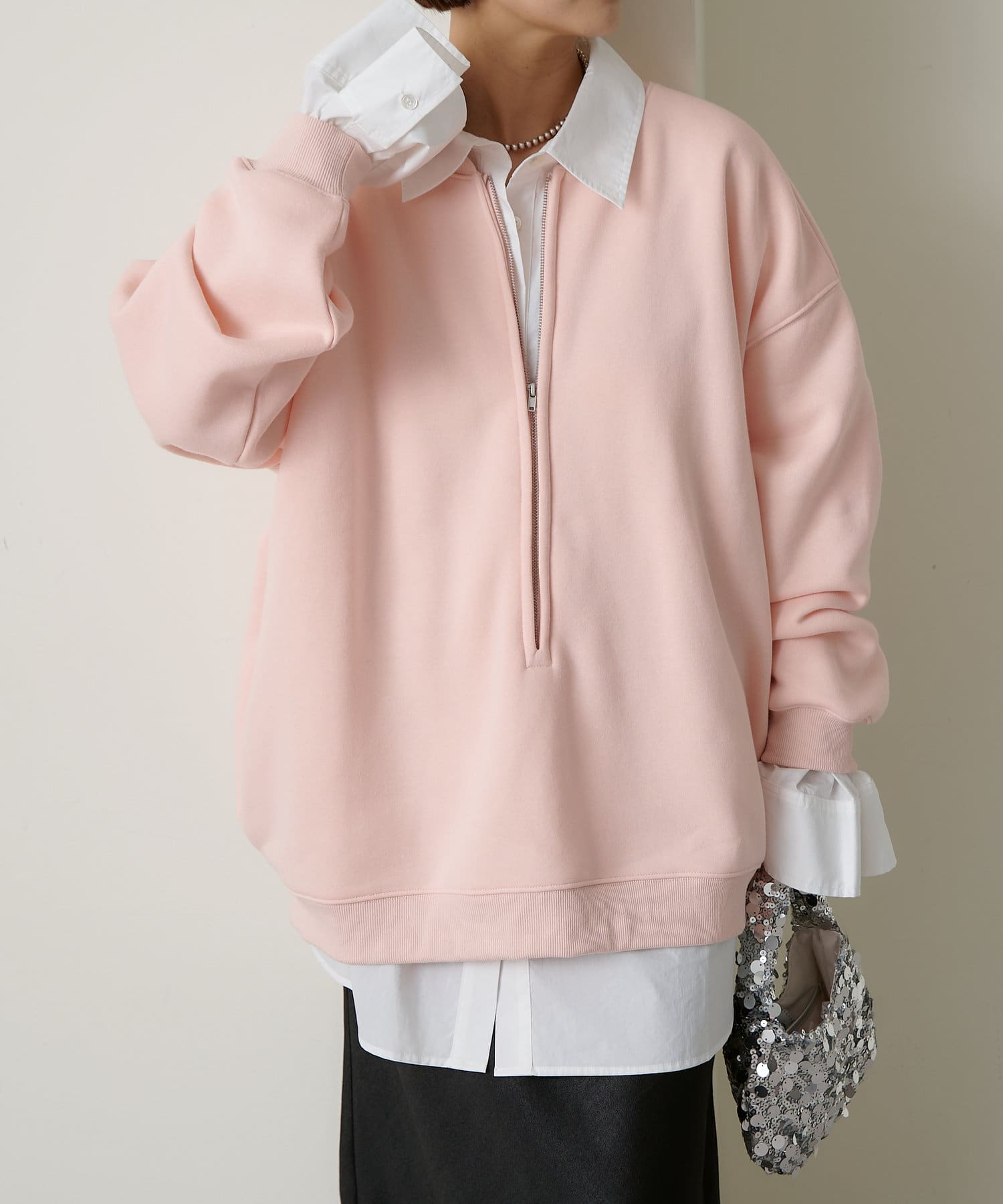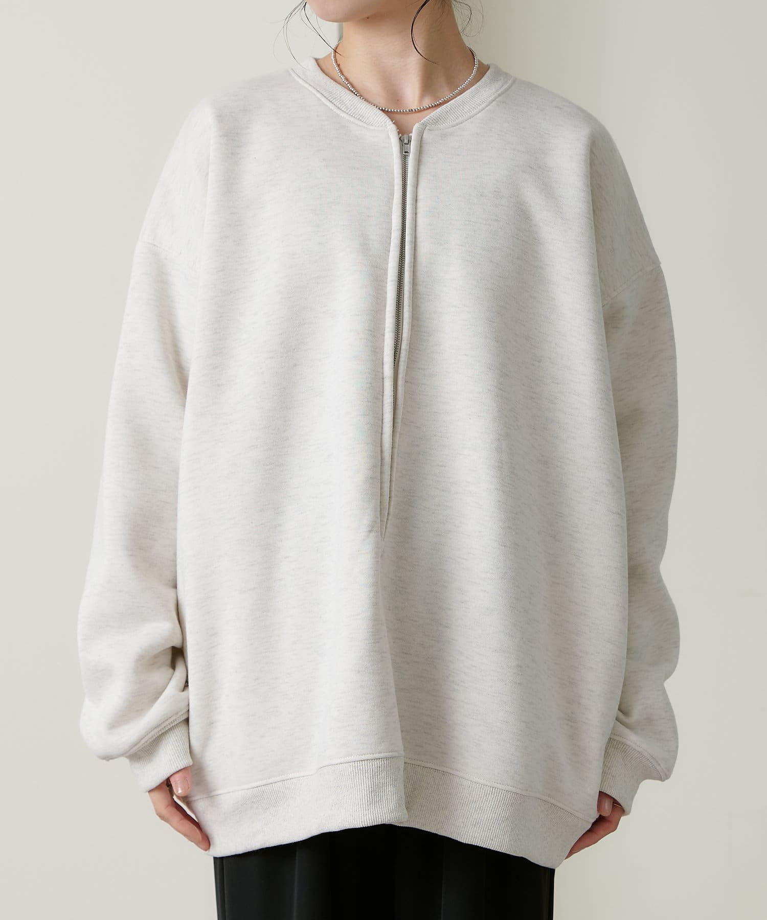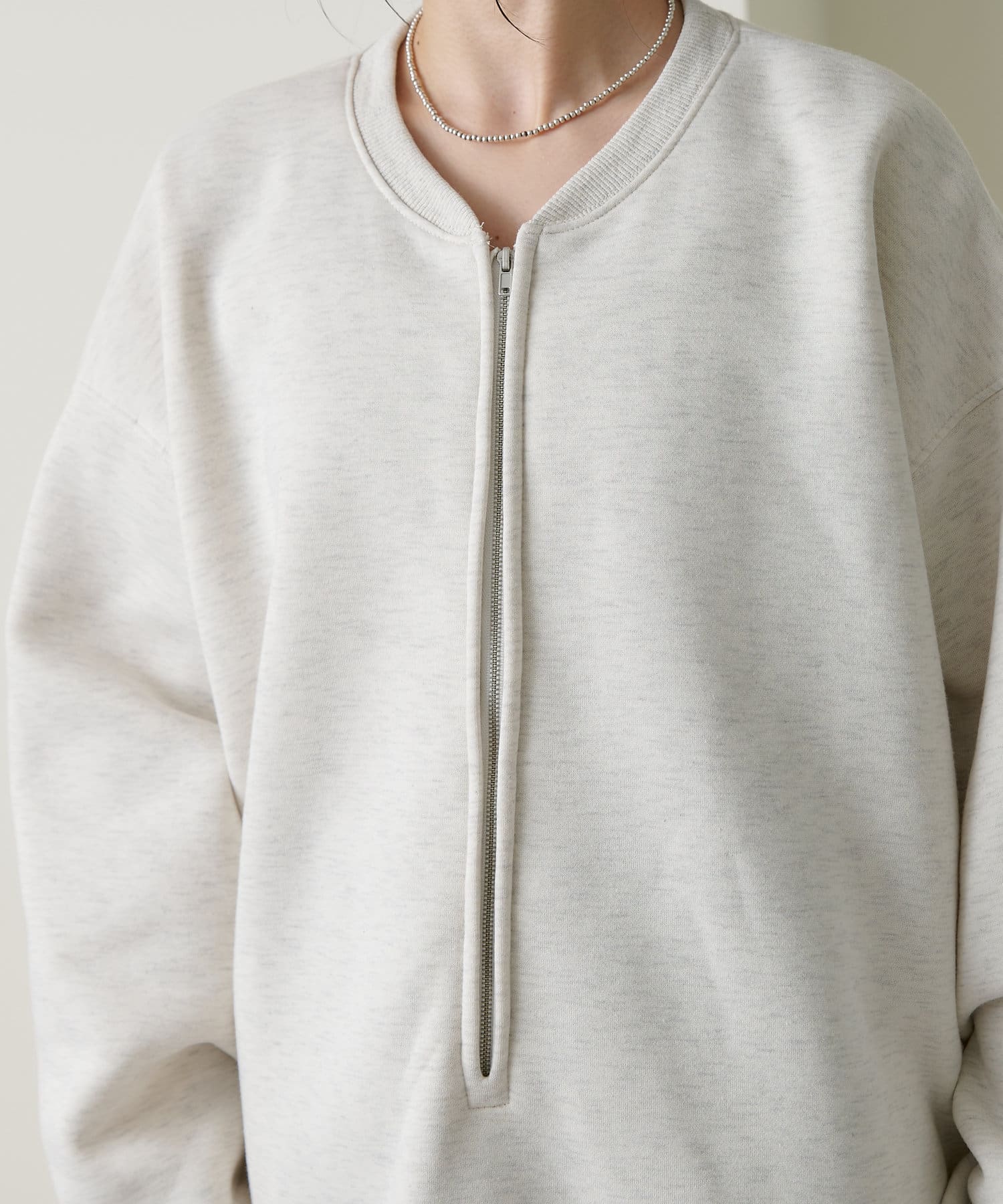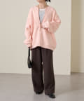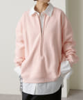 ・スウェット素材でカジュアルながらも、抜け感を演出するハーフジップデザインがラフ過ぎない印象。