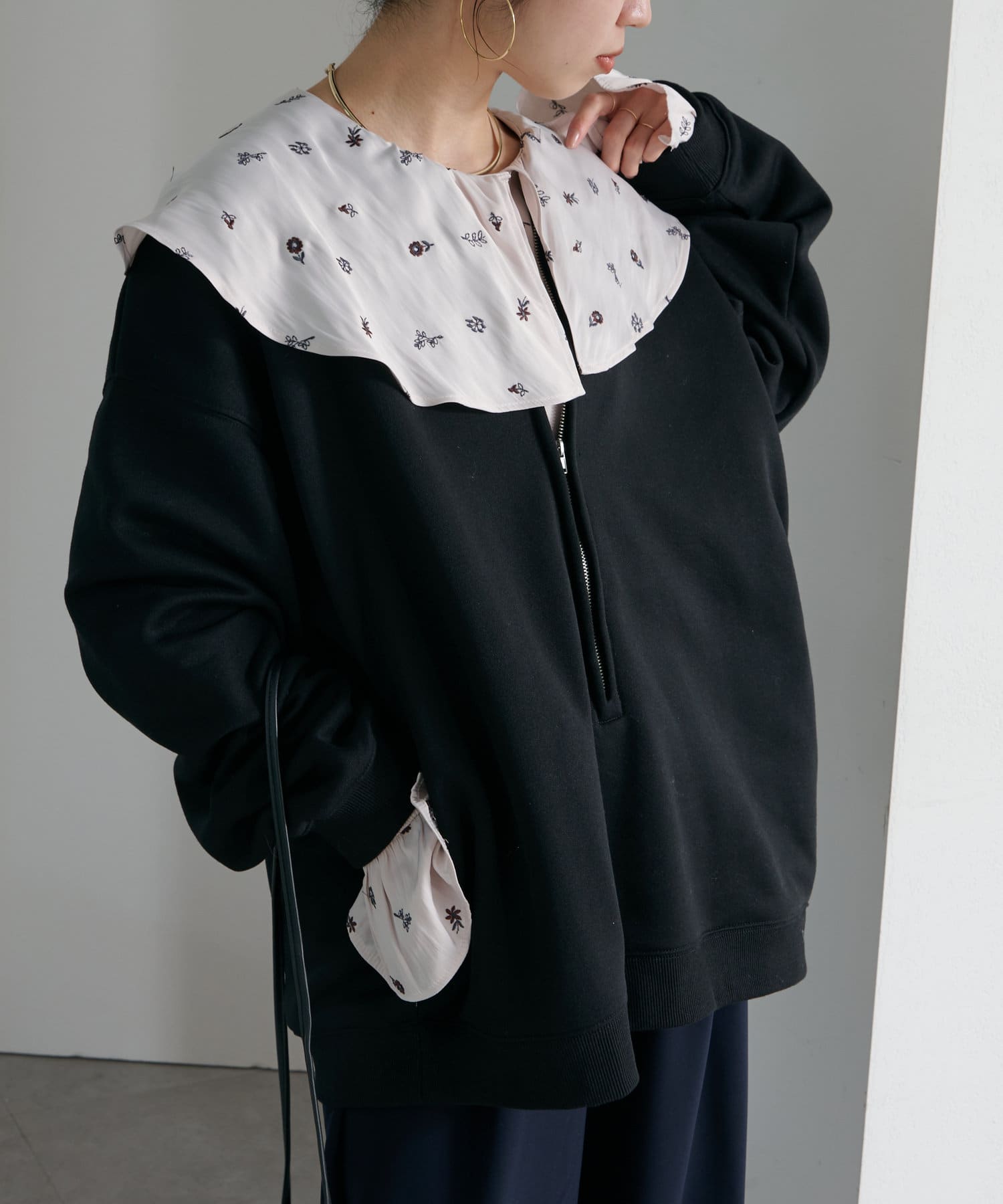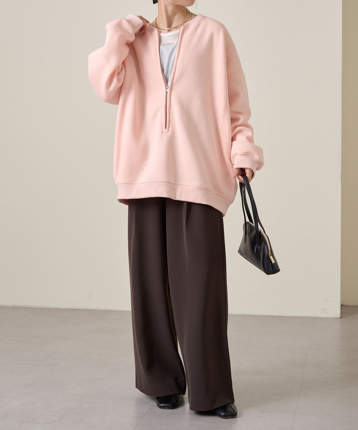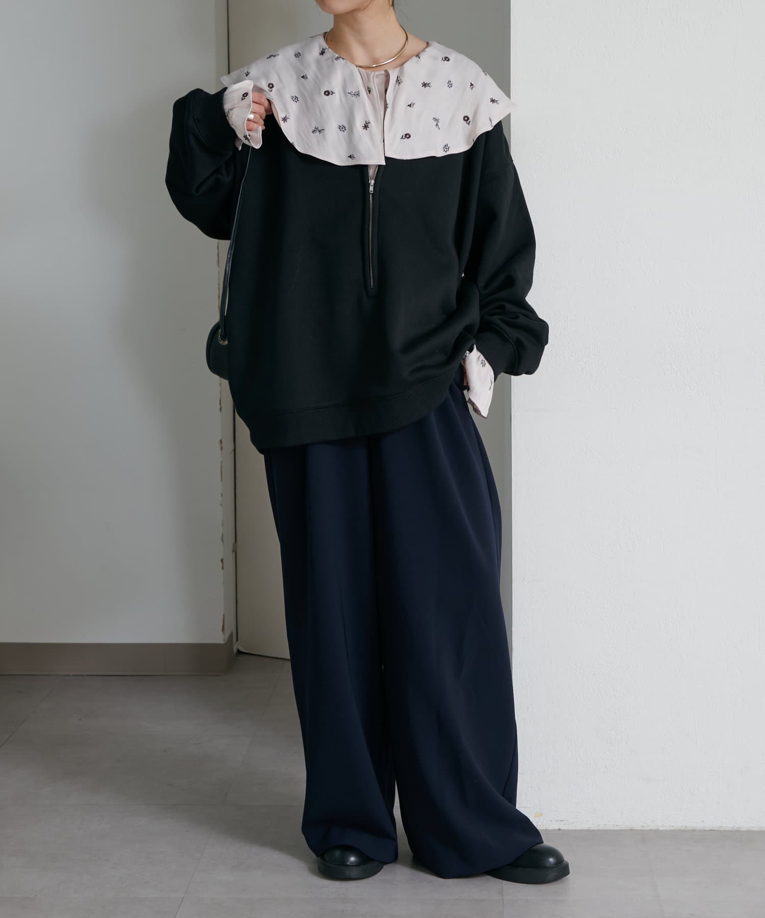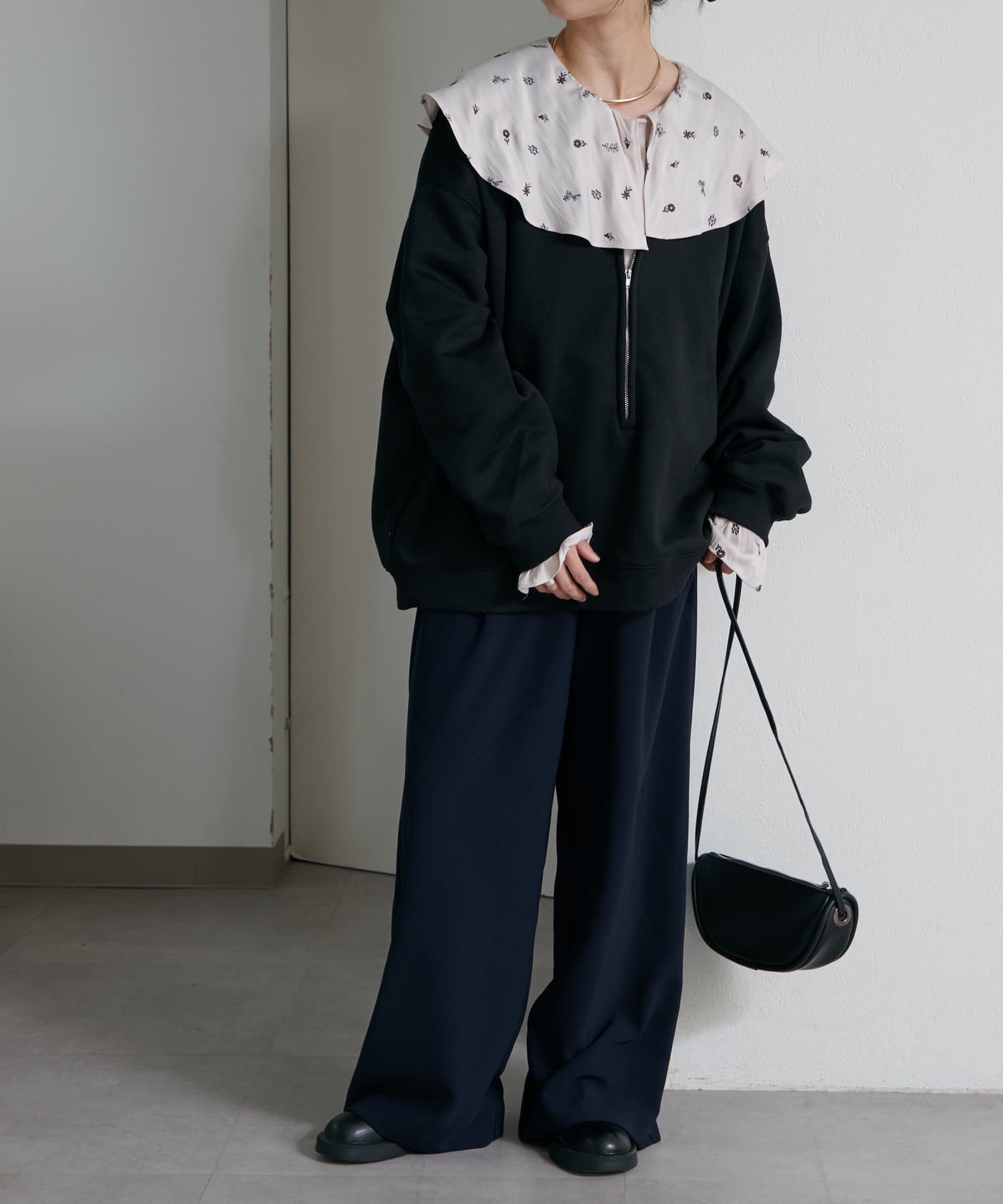 ・スウェット素材でカジュアルながらも、抜け感を演出するハーフジップデザインがラフ過ぎない印象。