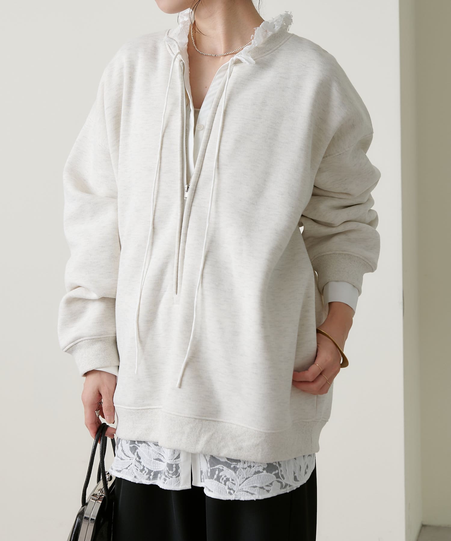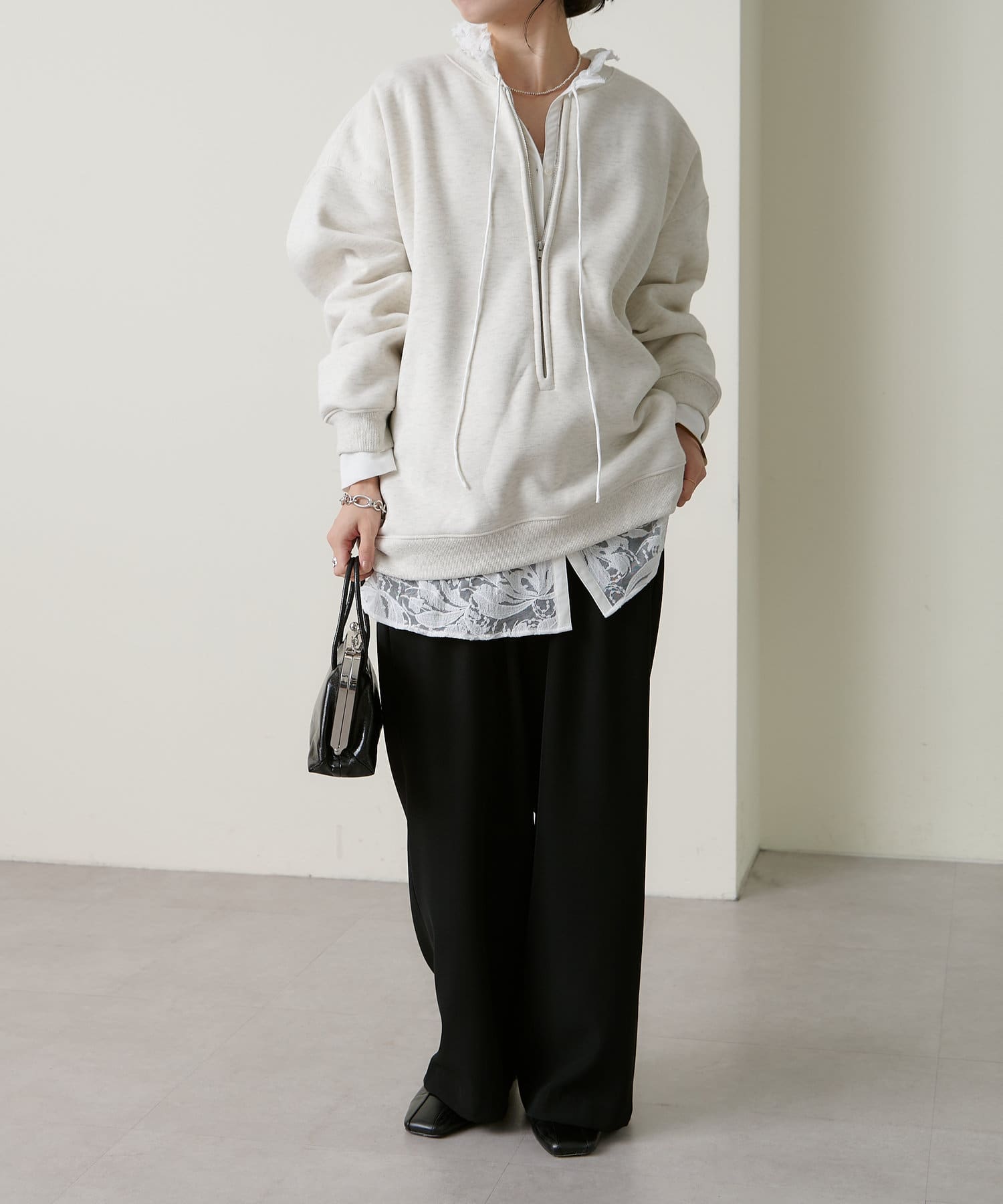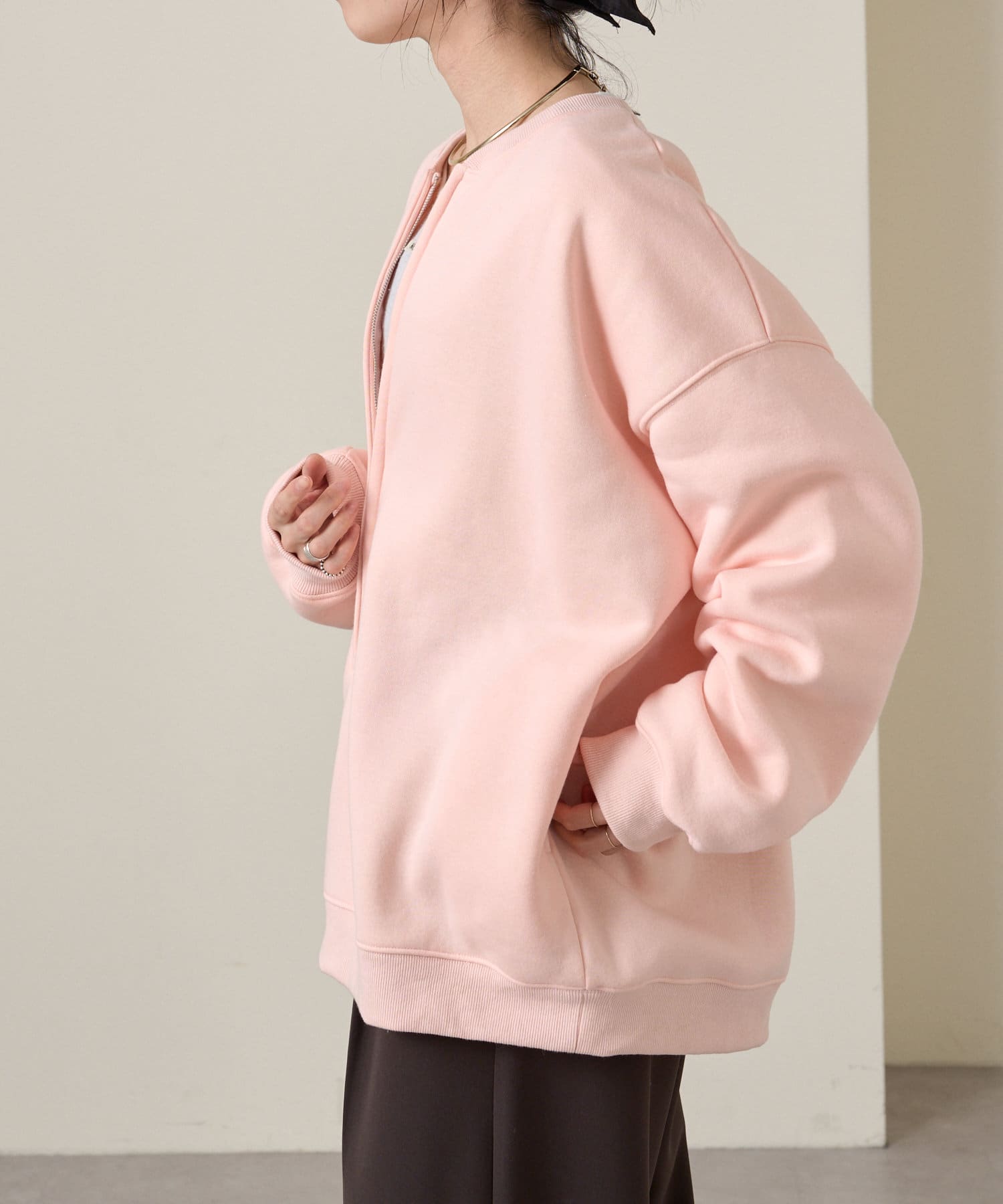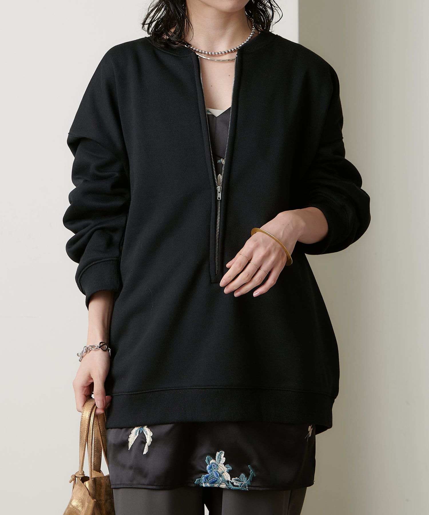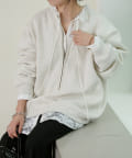 ・スウェット素材でカジュアルながらも、抜け感を演出するハーフジップデザインがラフ過ぎない印象。