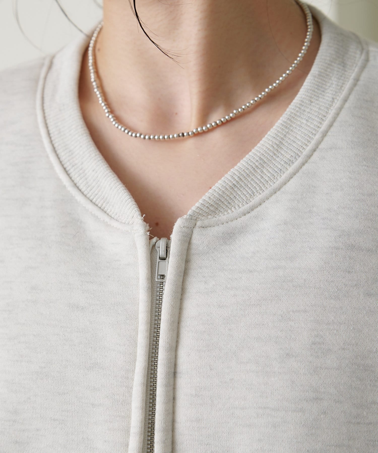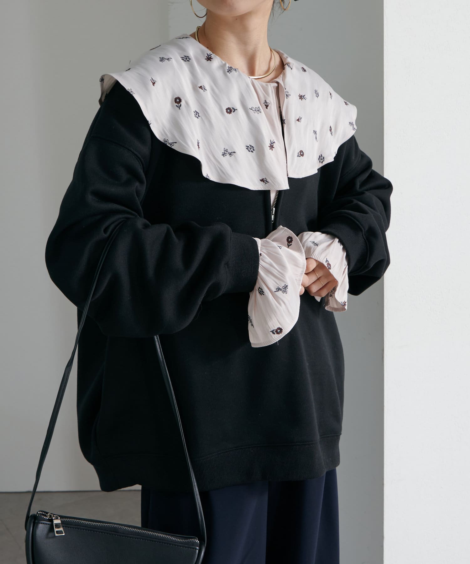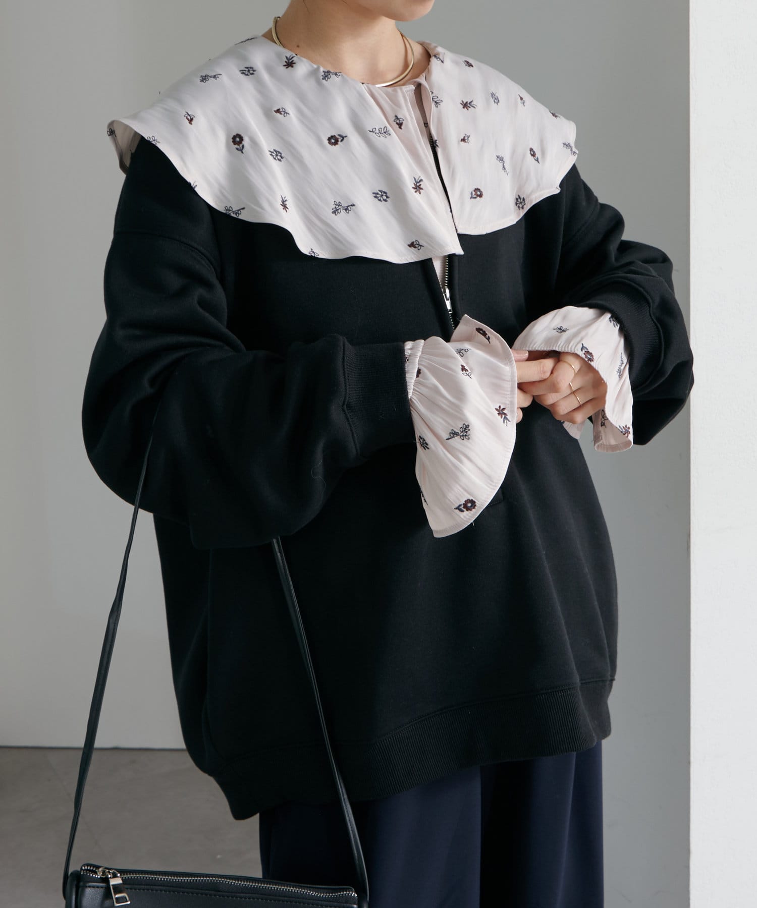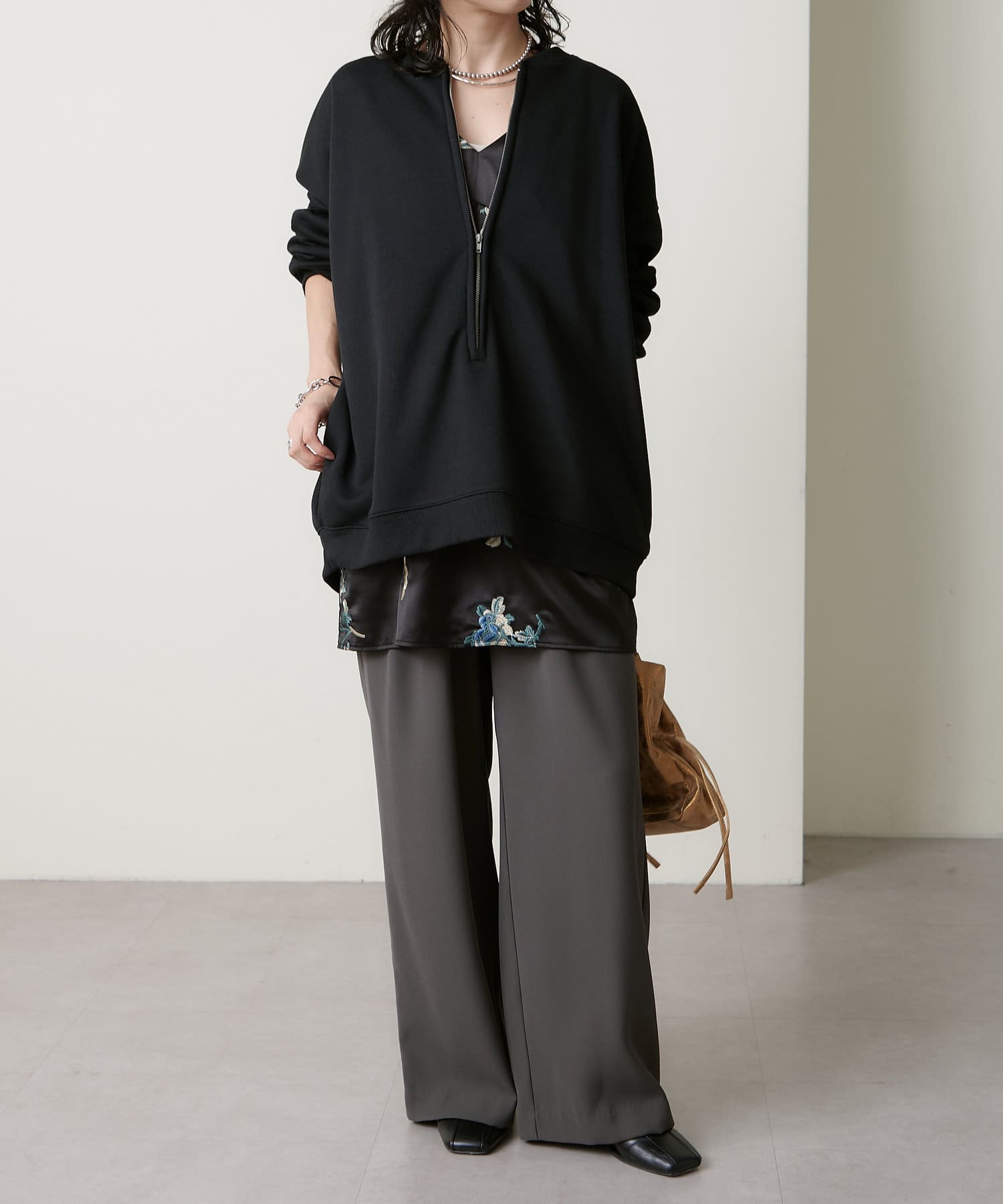 ・スウェット素材でカジュアルながらも、抜け感を演出するハーフジップデザインがラフ過ぎない印象。
