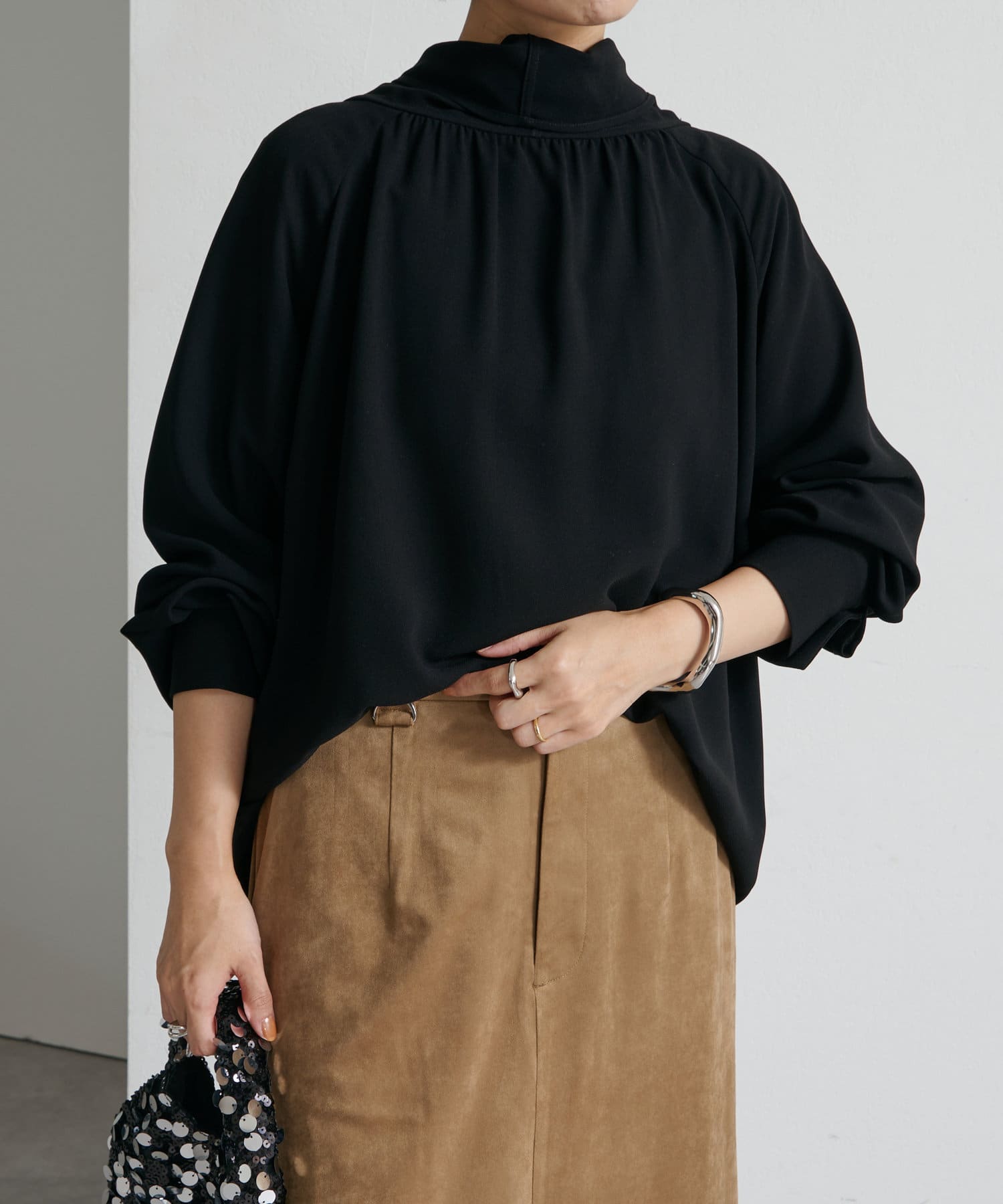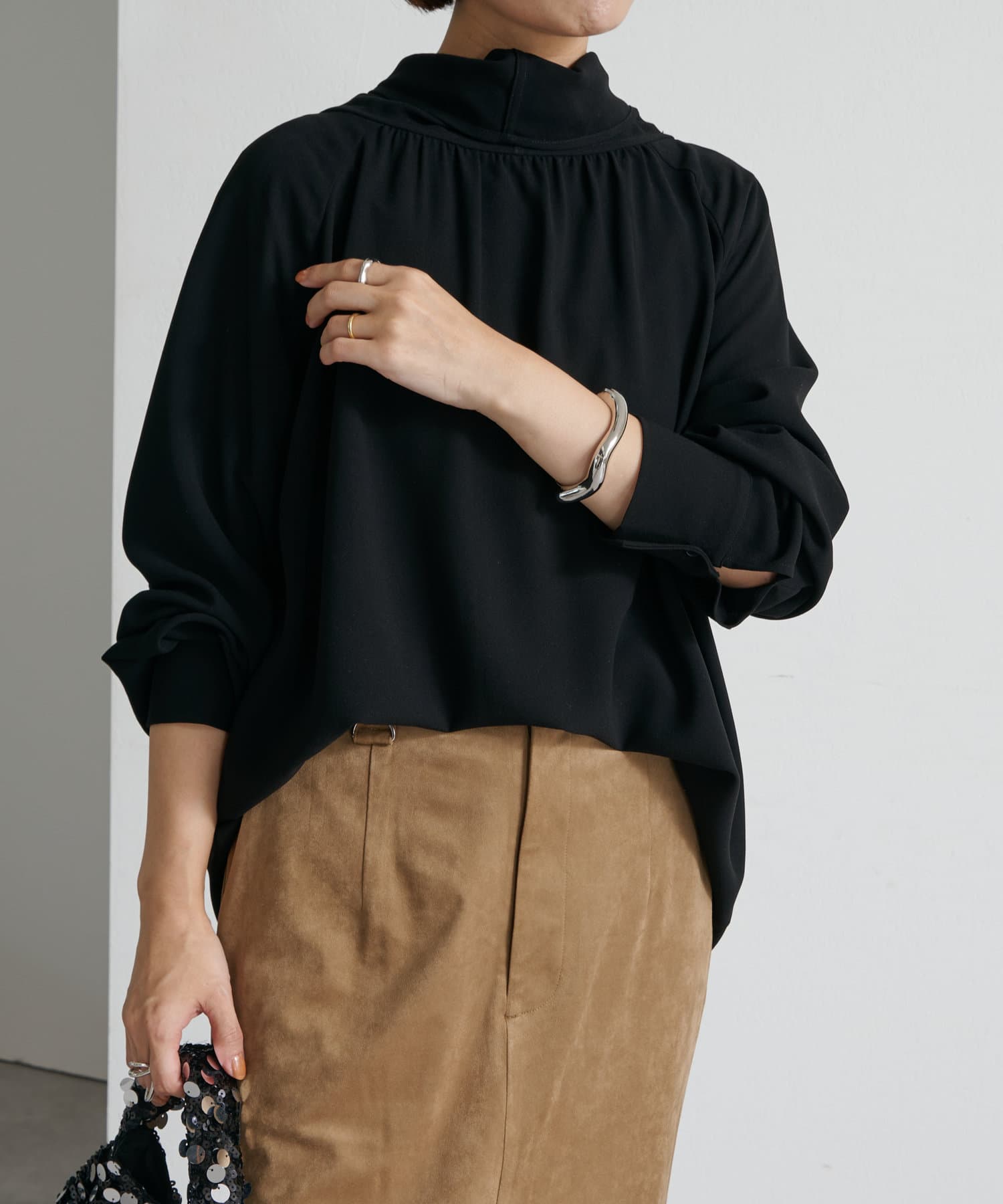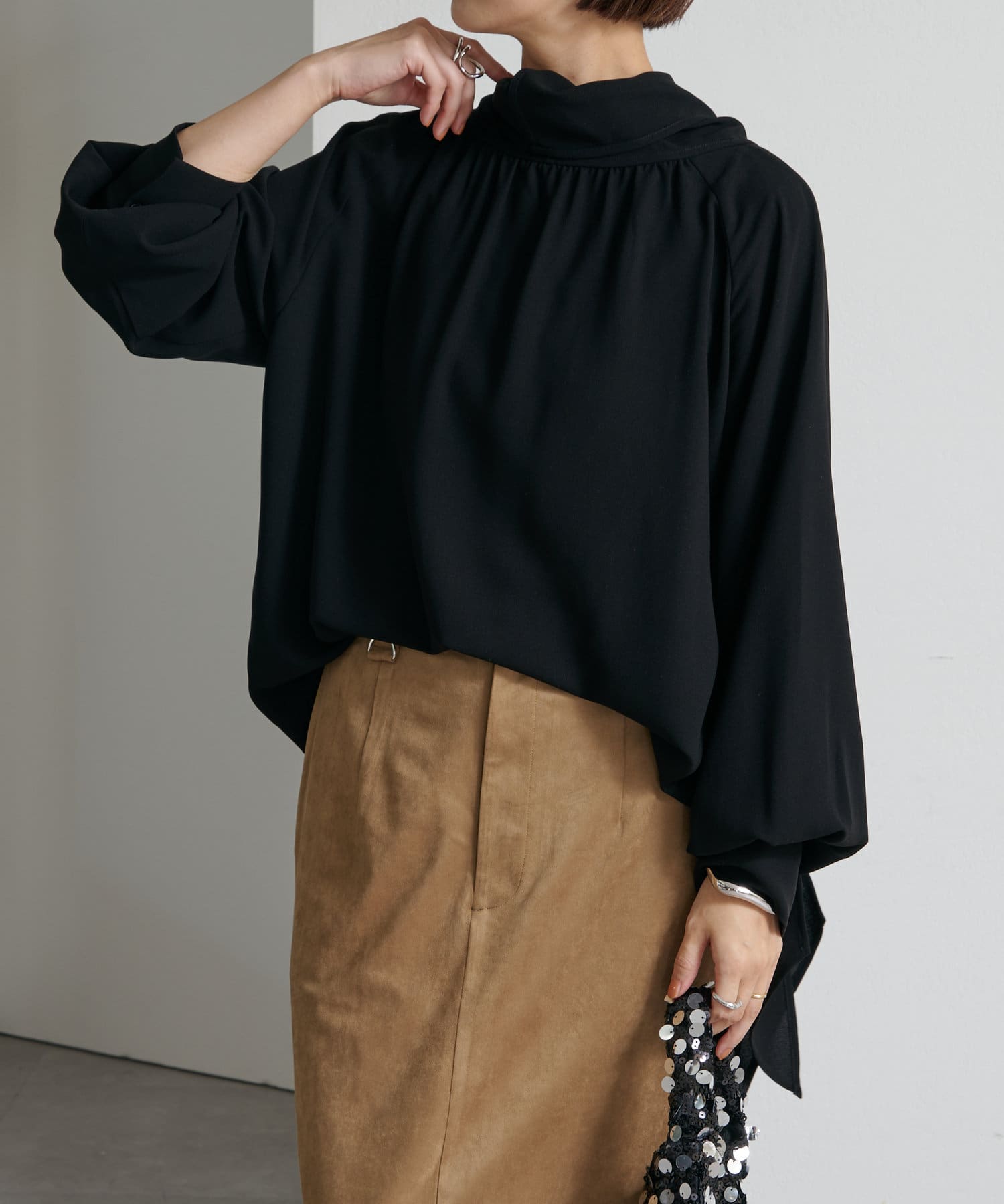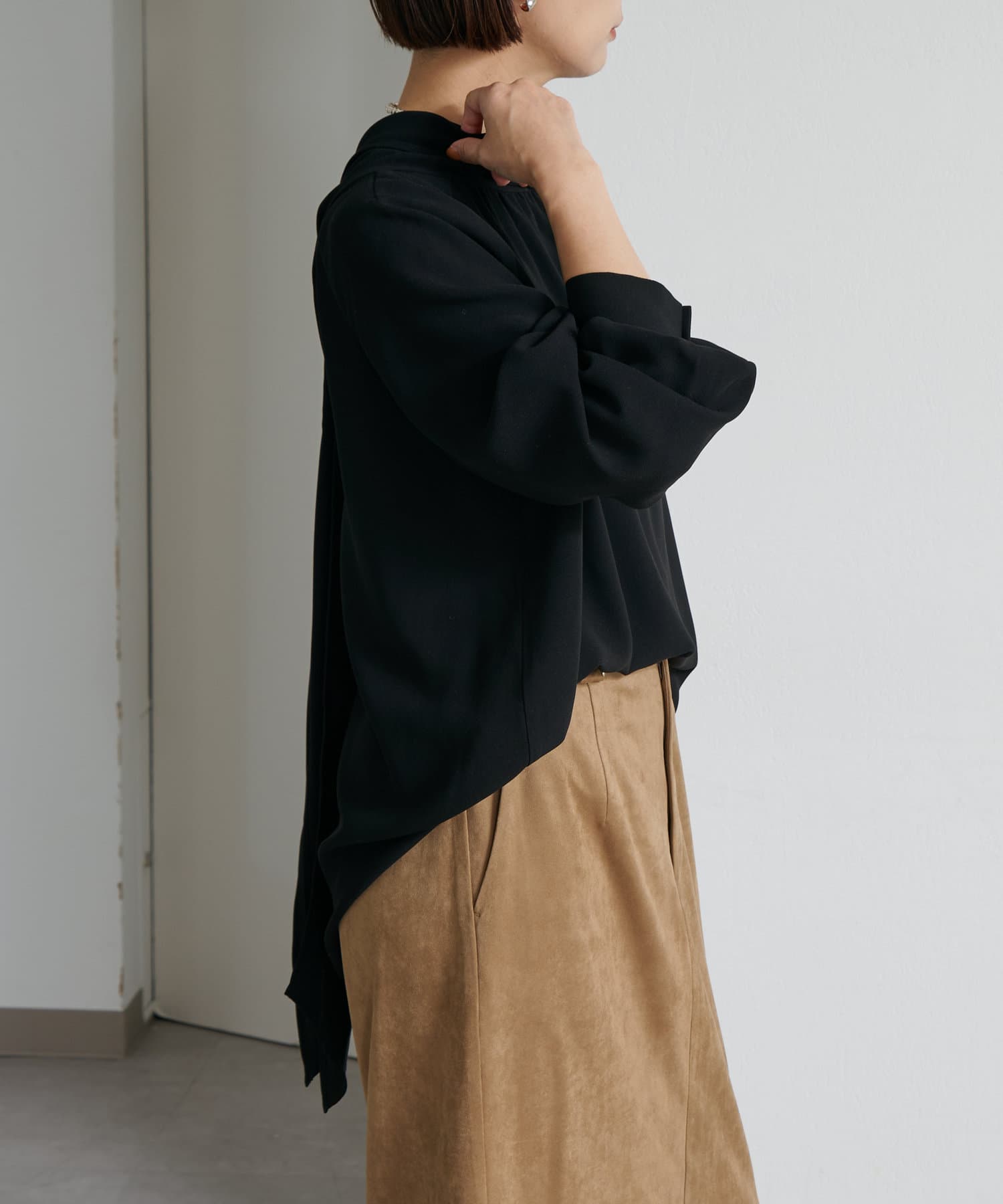 ・一枚で着用するのはもちろん、ニットやジャケットに合わせても華やかに着映える1枚。
