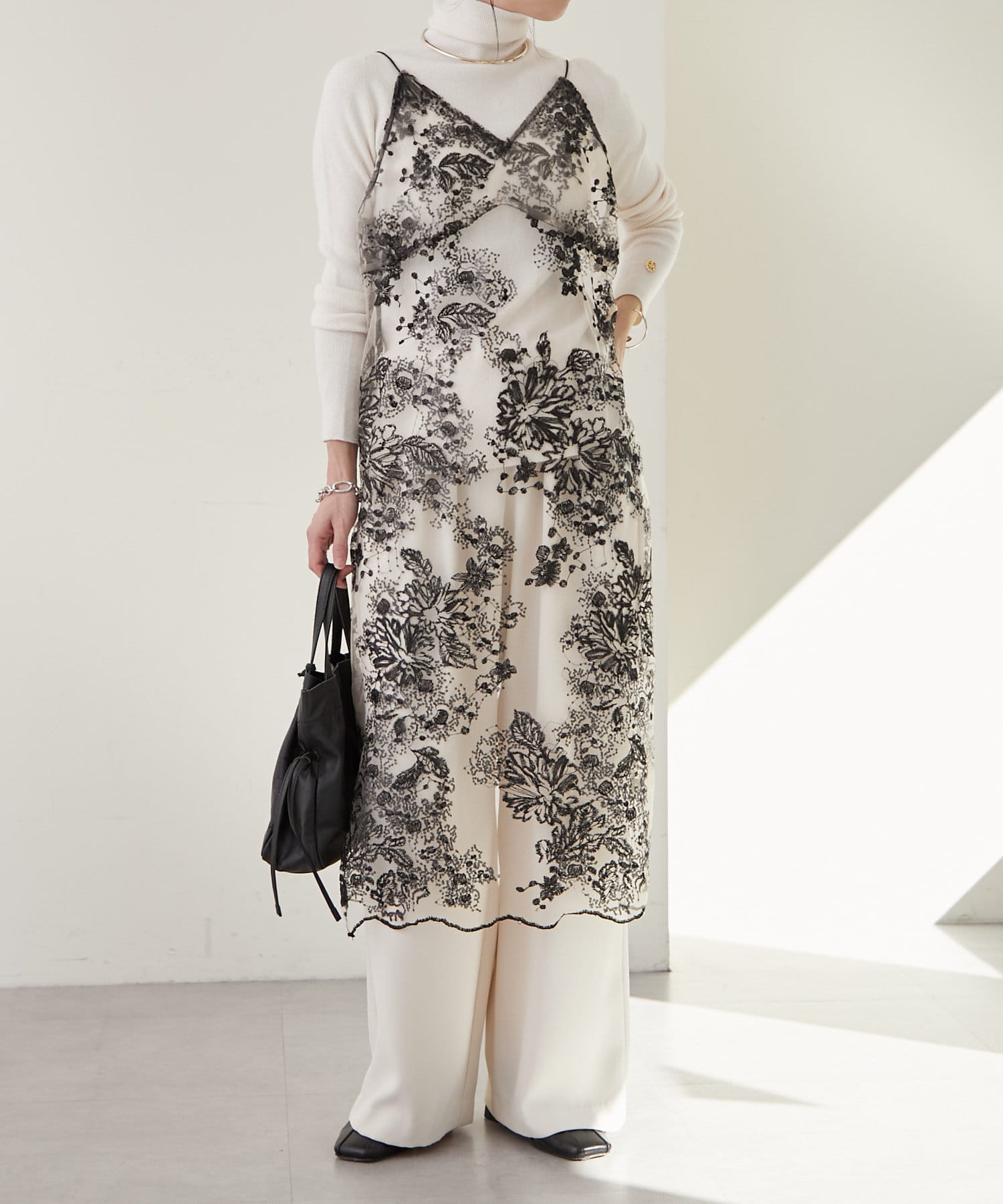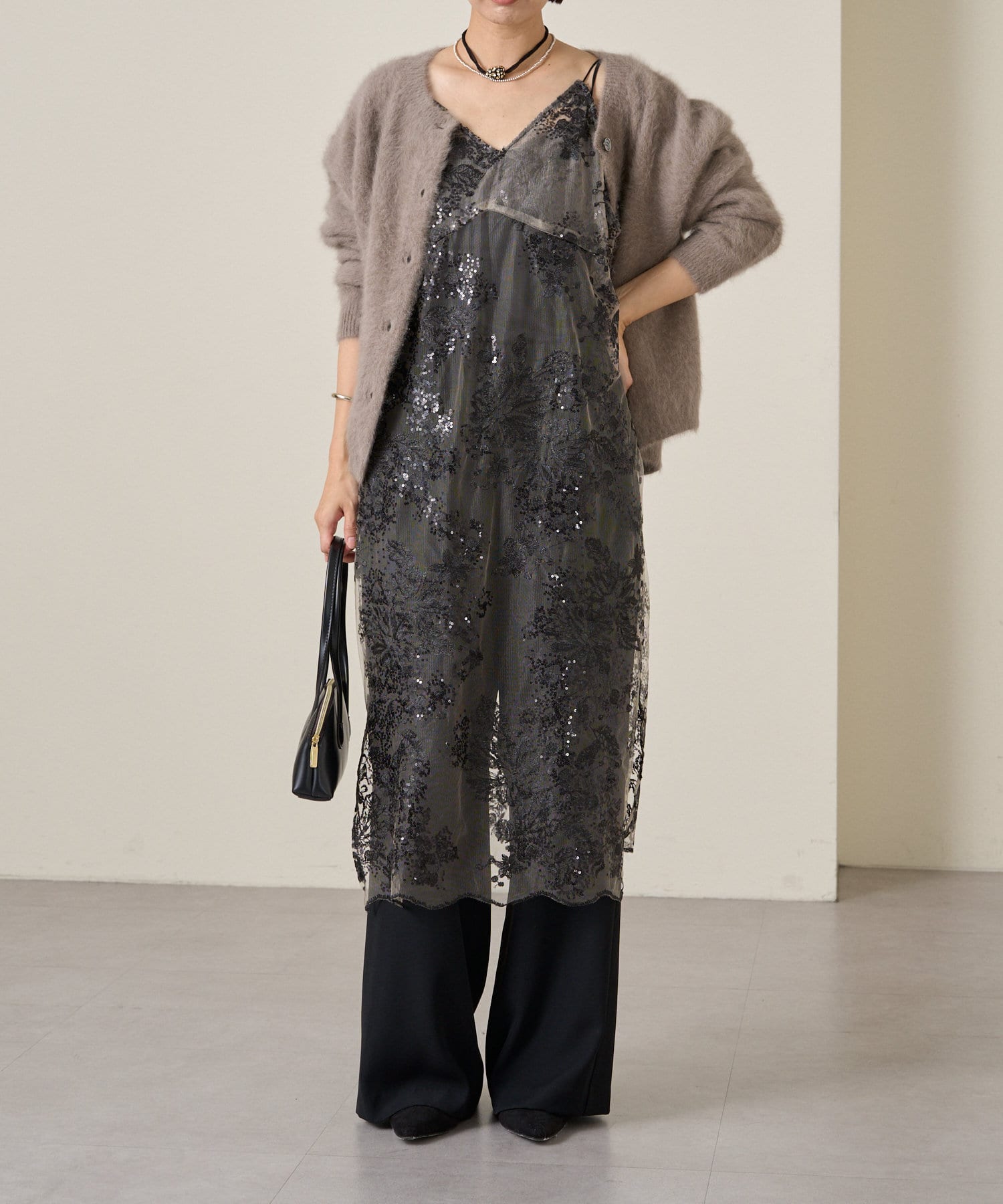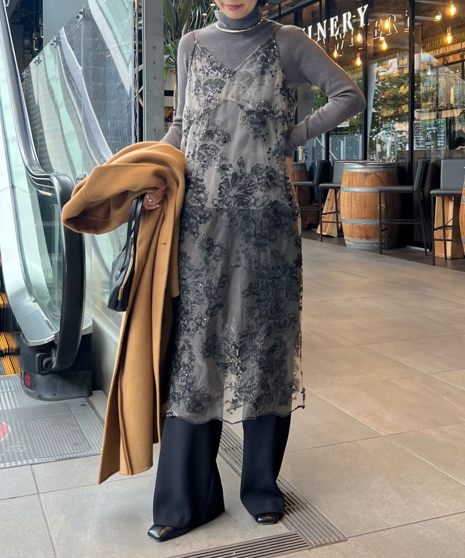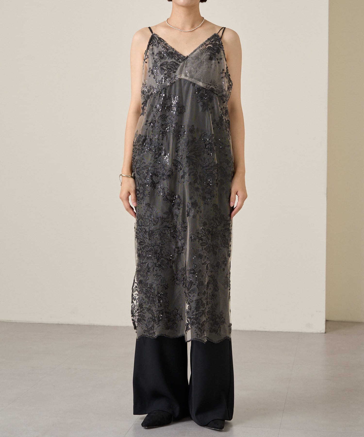 ・華奢な肩紐にシアー感が女性らしく上品なワンピース。