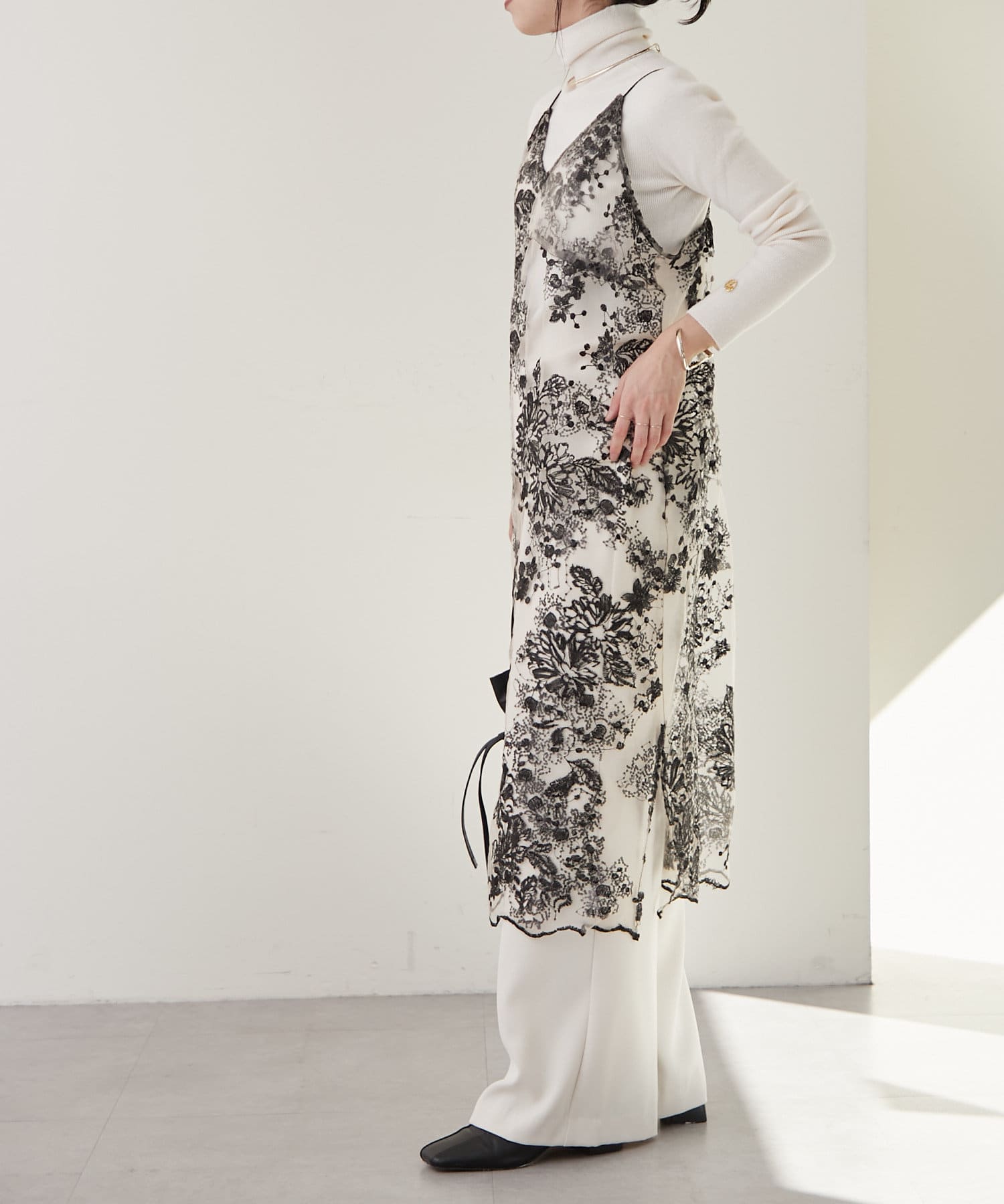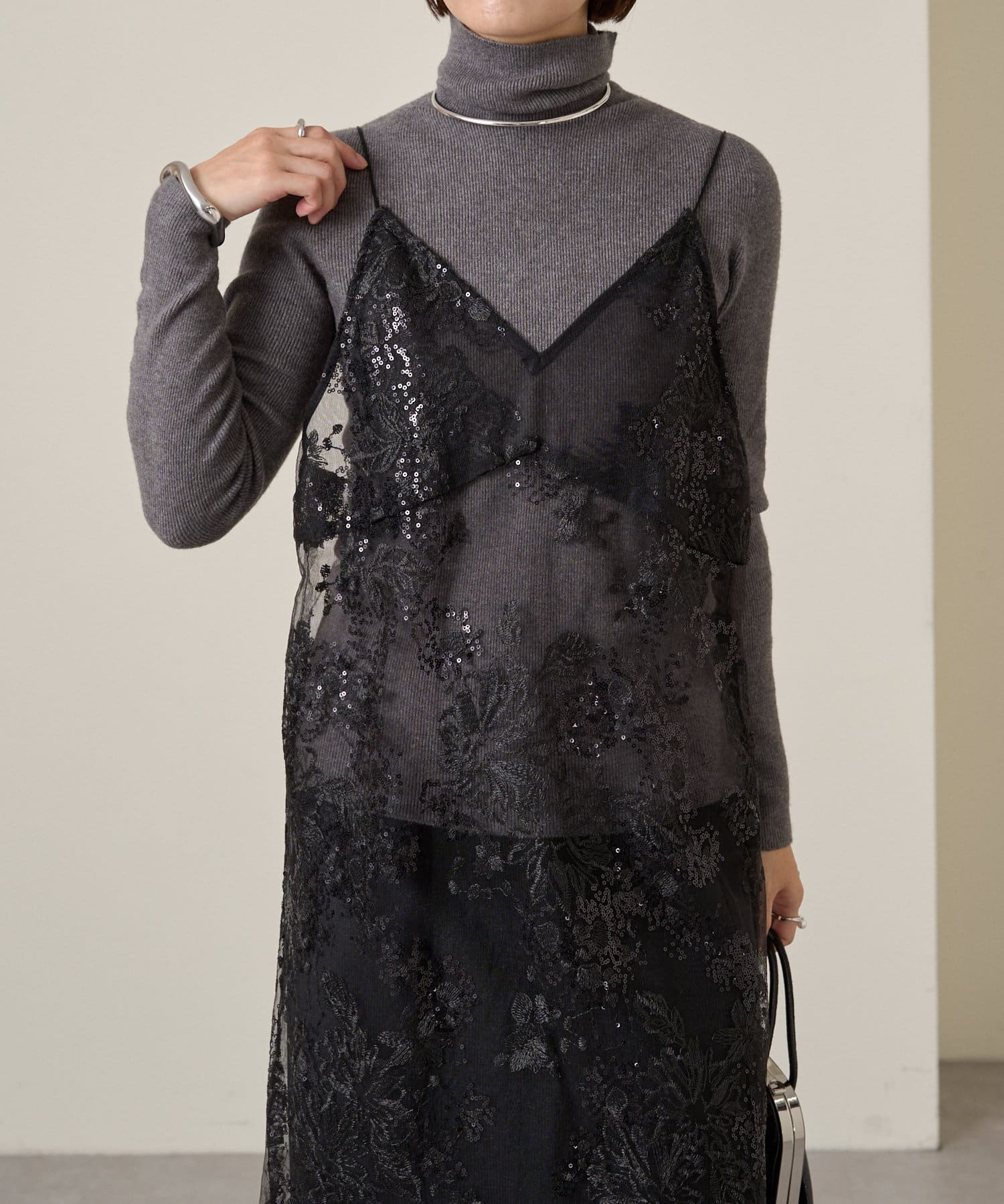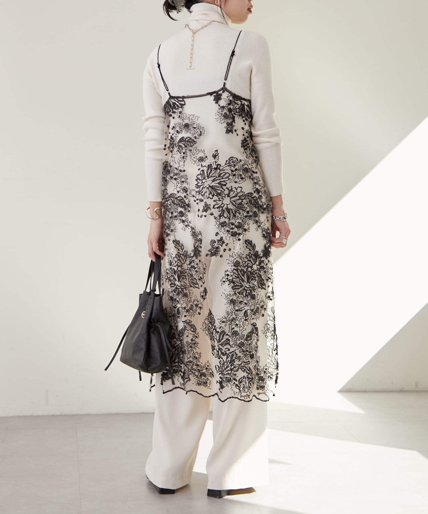 ・華奢な肩紐にシアー感が女性らしく上品なワンピース。