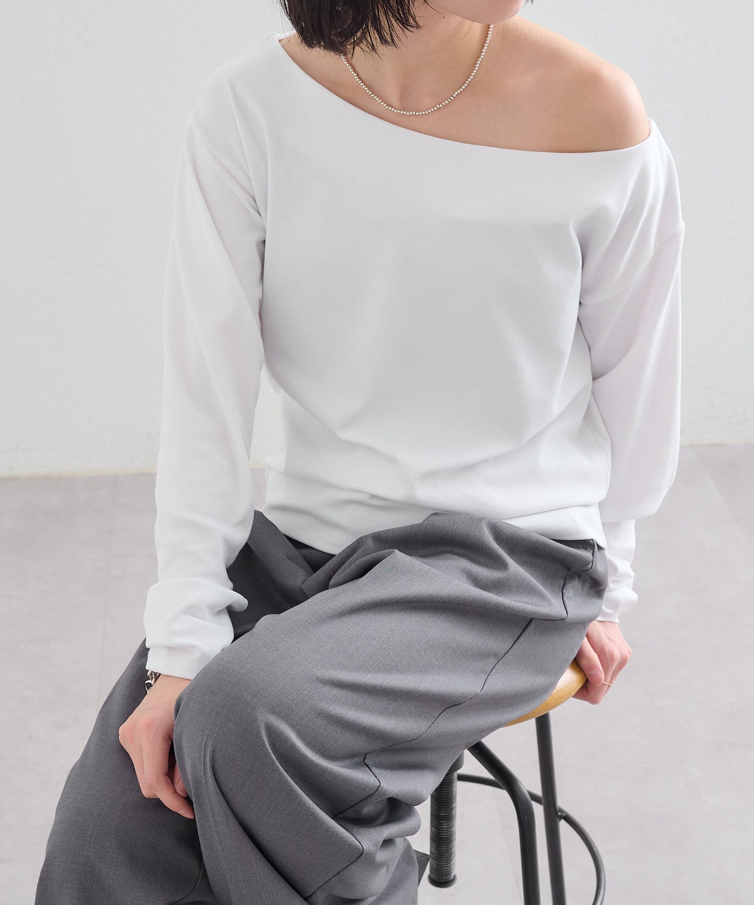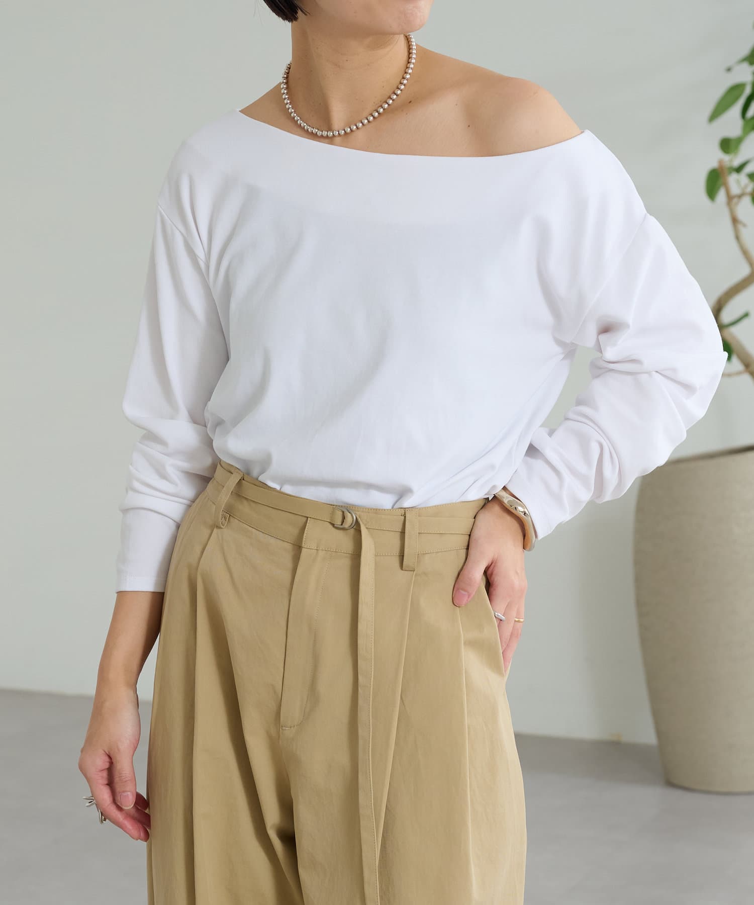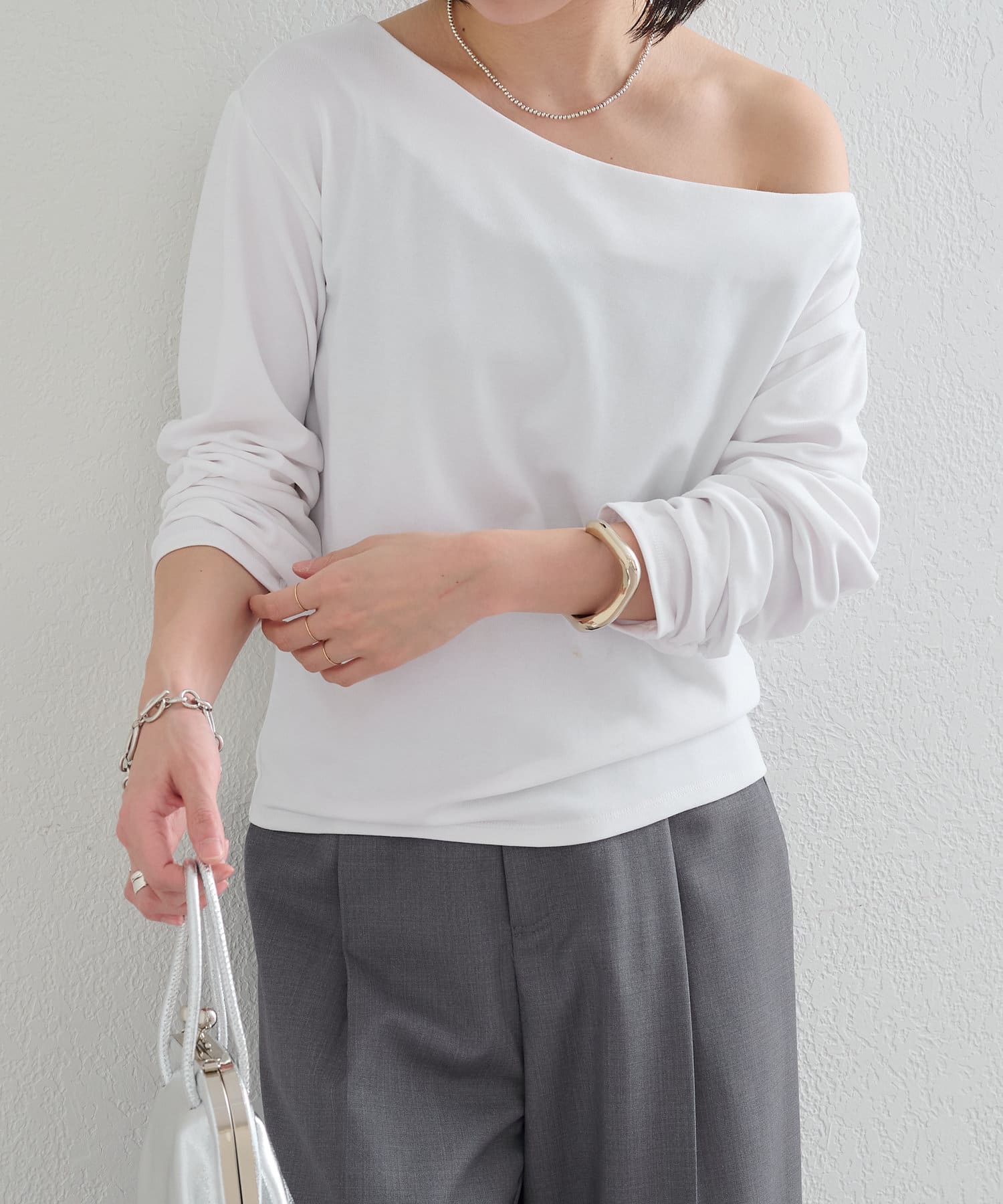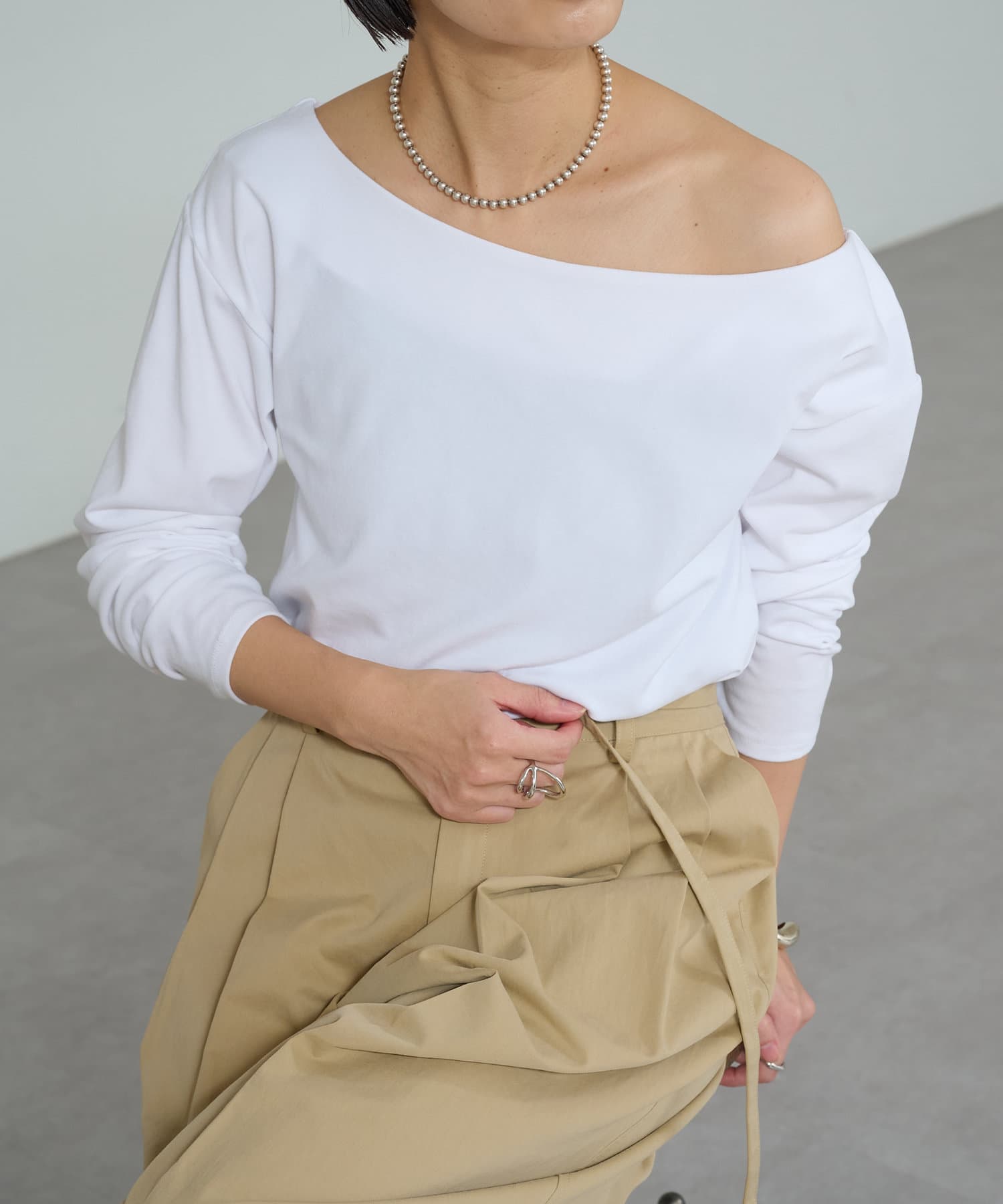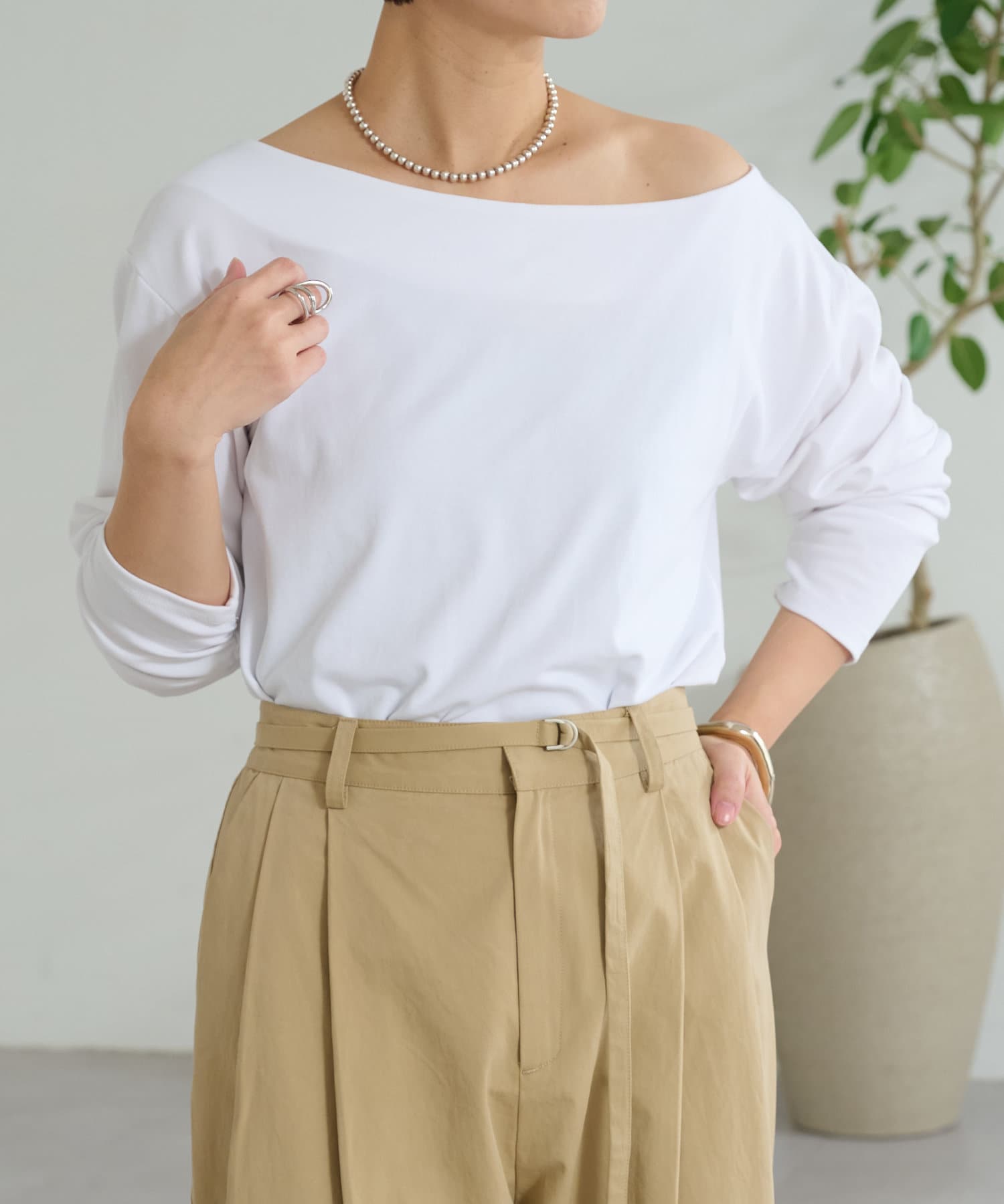 ・ネックの開きを調整することが出来るので、オフショルやボートネックなどその日の気分に合わせて着こなせます。