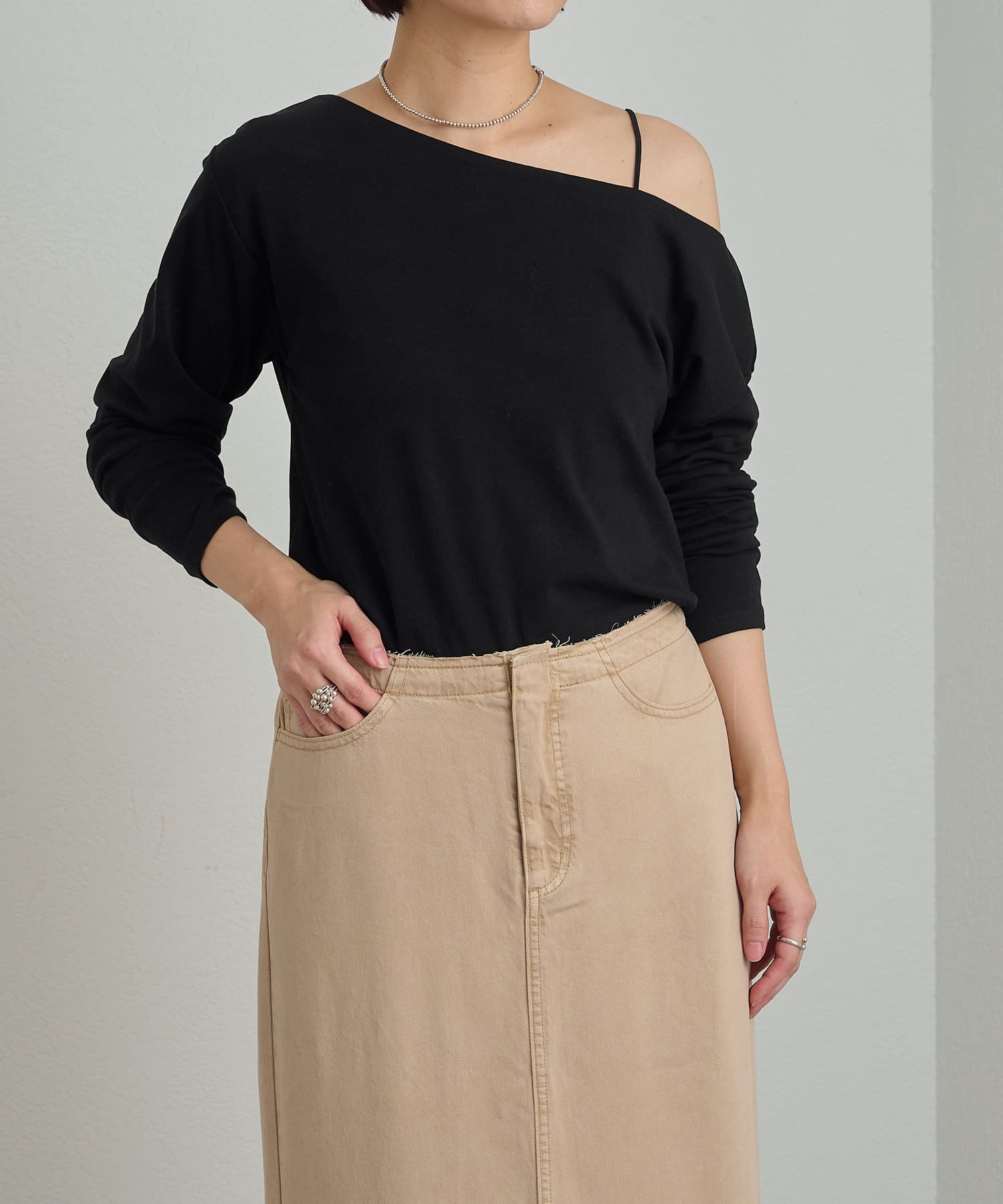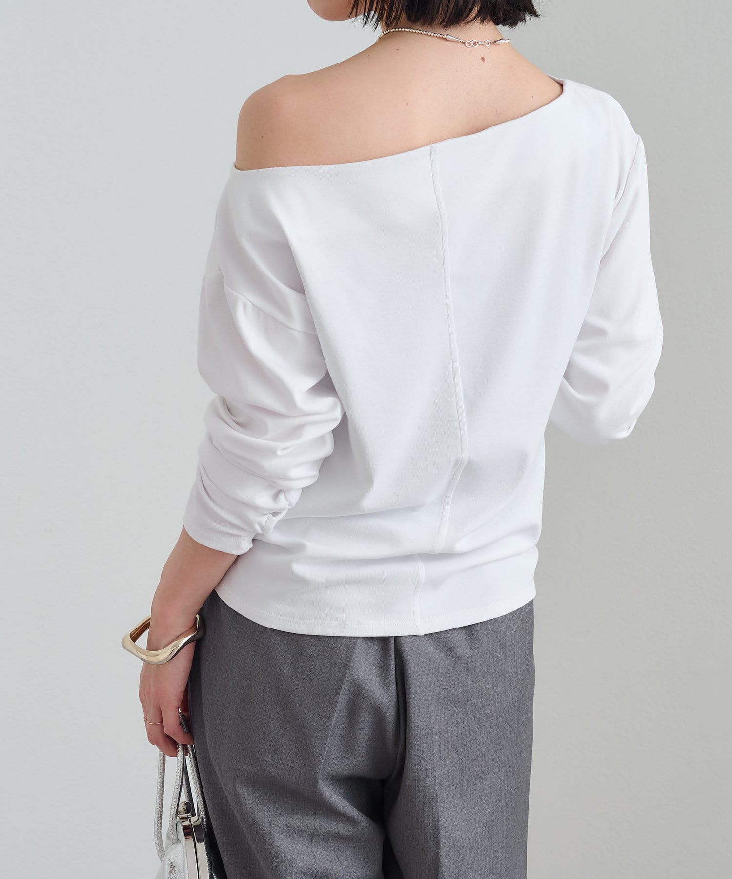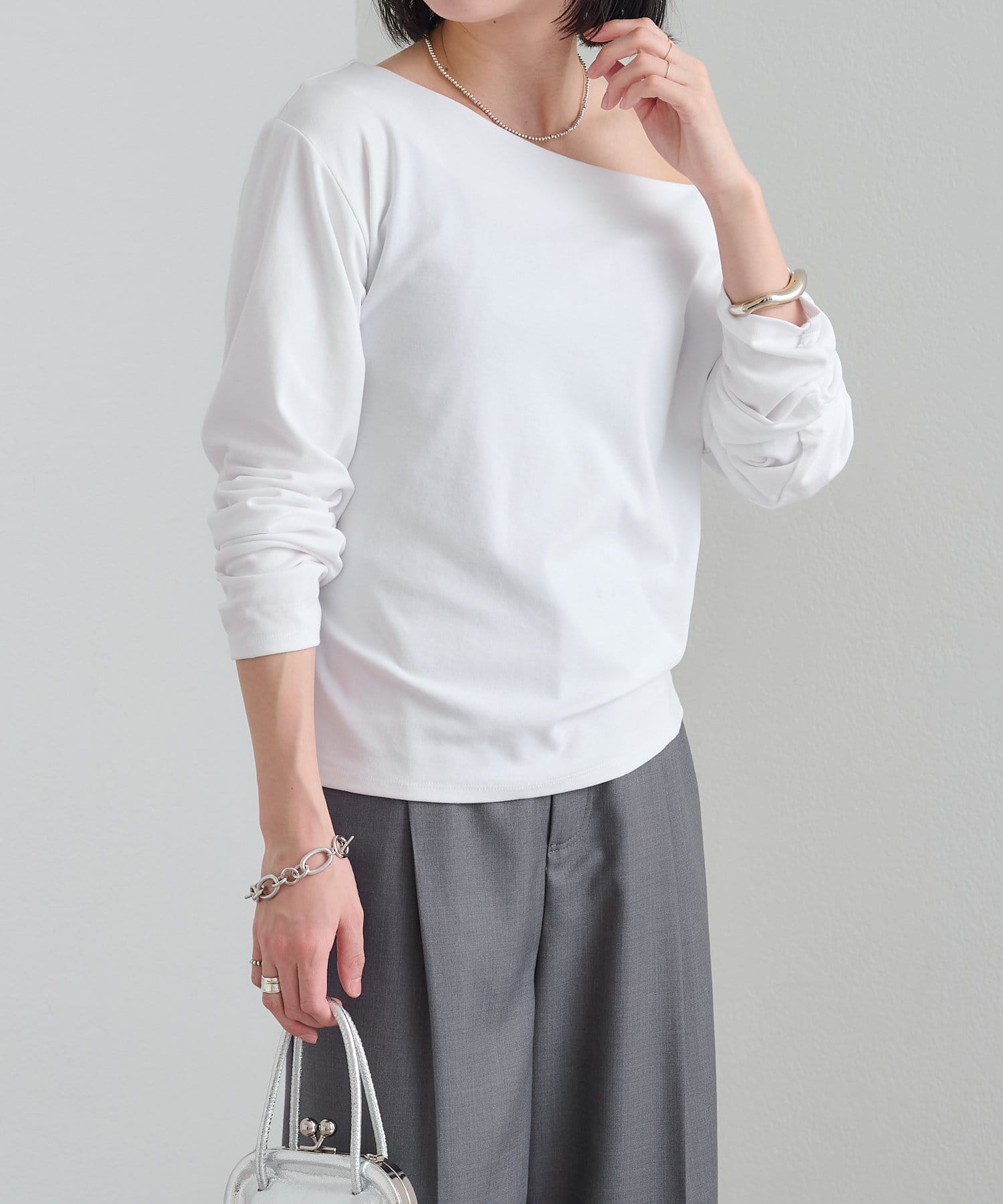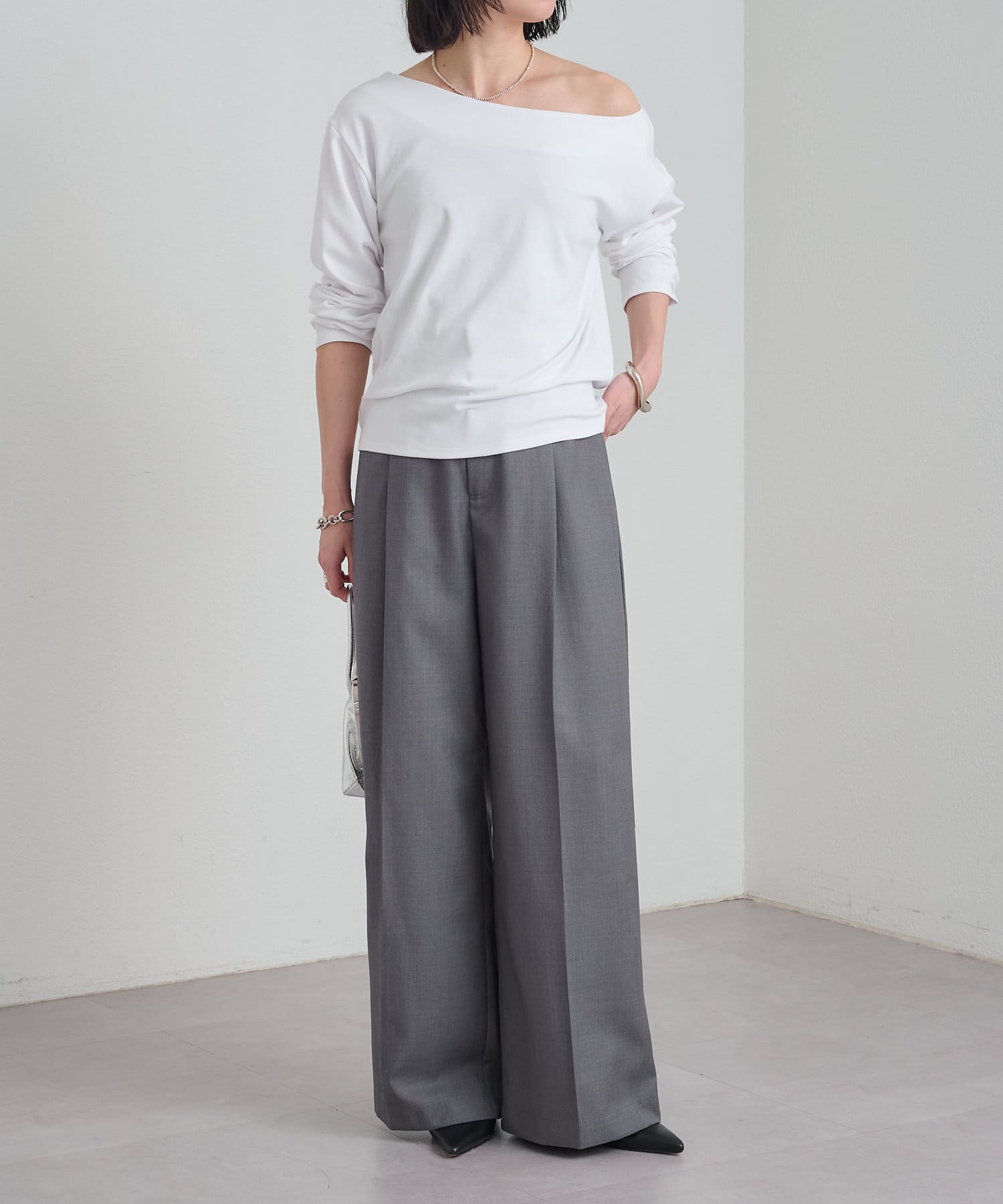 ・ネックの開きを調整することが出来るので、オフショルやボートネックなどその日の気分に合わせて着こなせます。